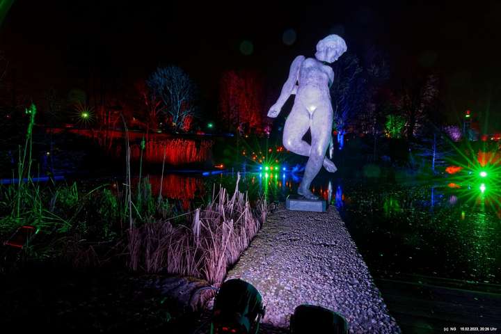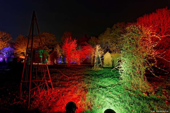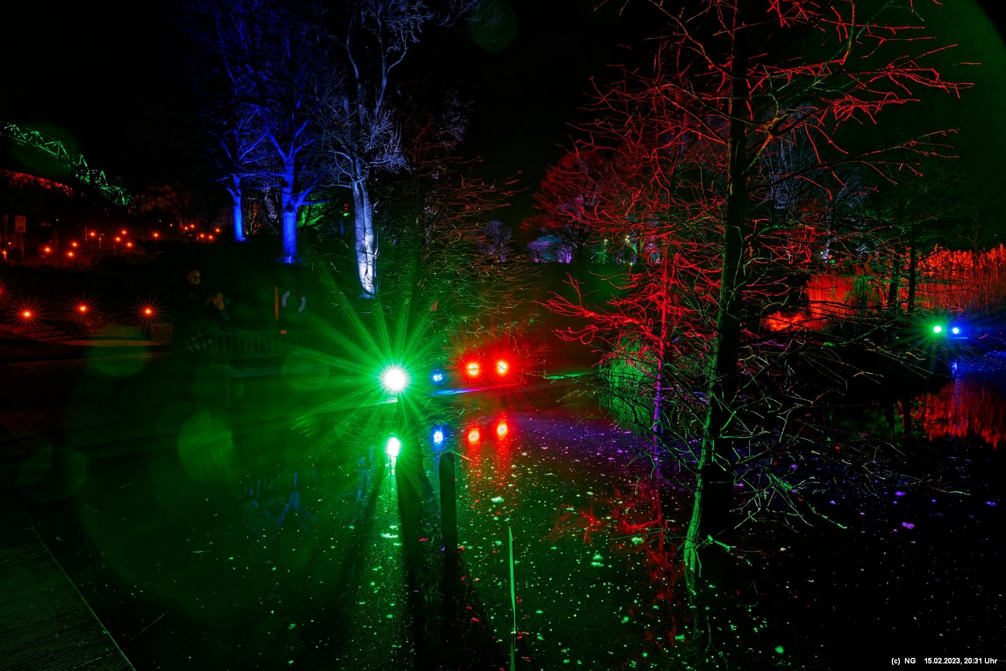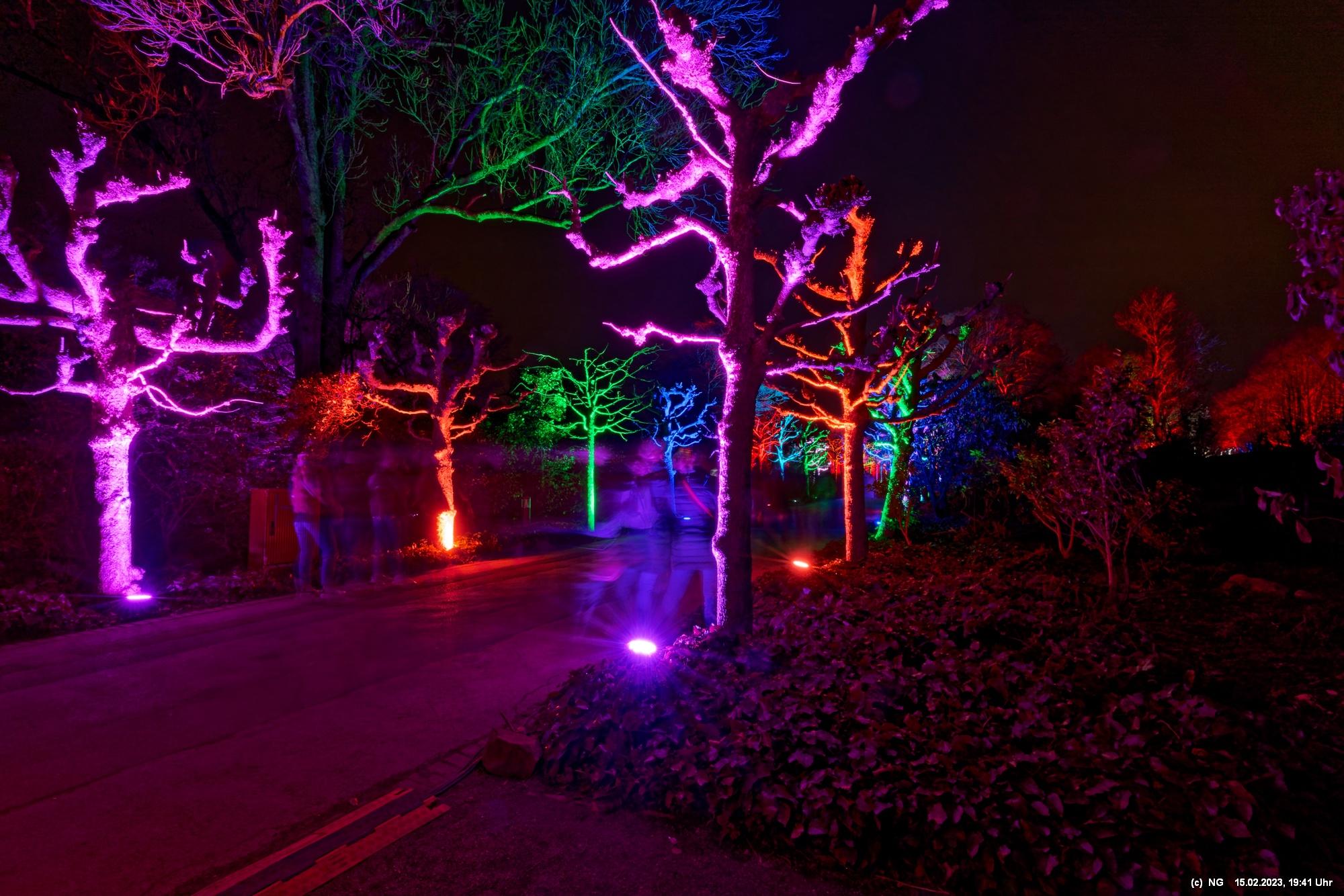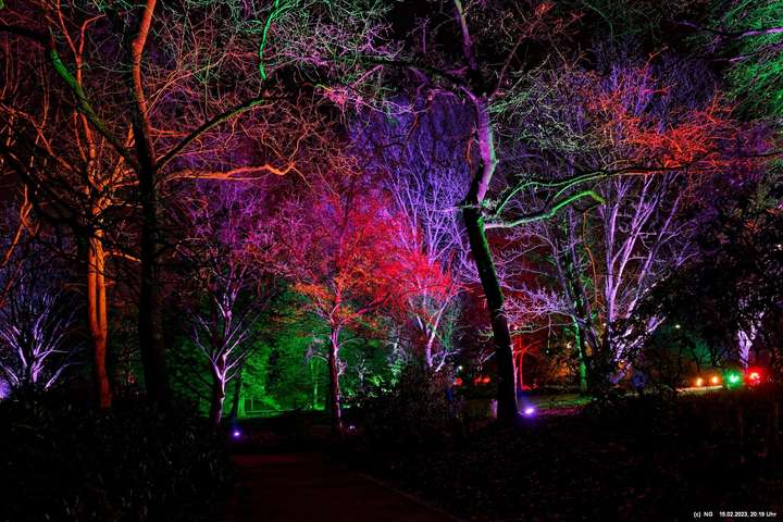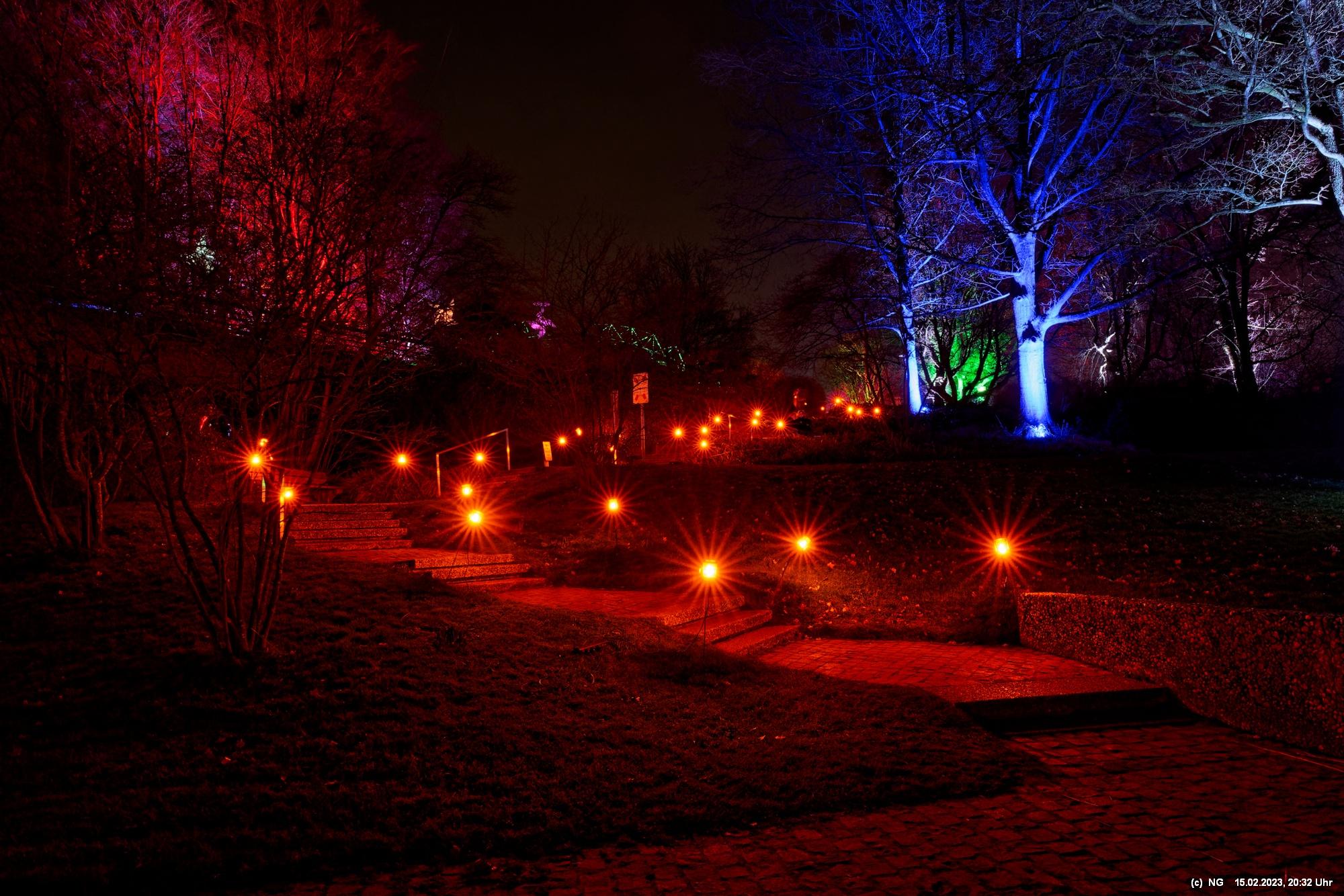 Es ging für knapp 3 Stunden dorthin. Wolfgang Flammersfeld und Reinhard Hartleif (world of lights, Unna) haben zum 13. Mal diese Lichtinstallation durchgeführt. Das Wetter spielte mit – und so haben wir uns auf den längeren Weg durch den Park gemacht. Das war nach den gesundheitlichen Problemen der letzten Monate gar nicht so leicht.