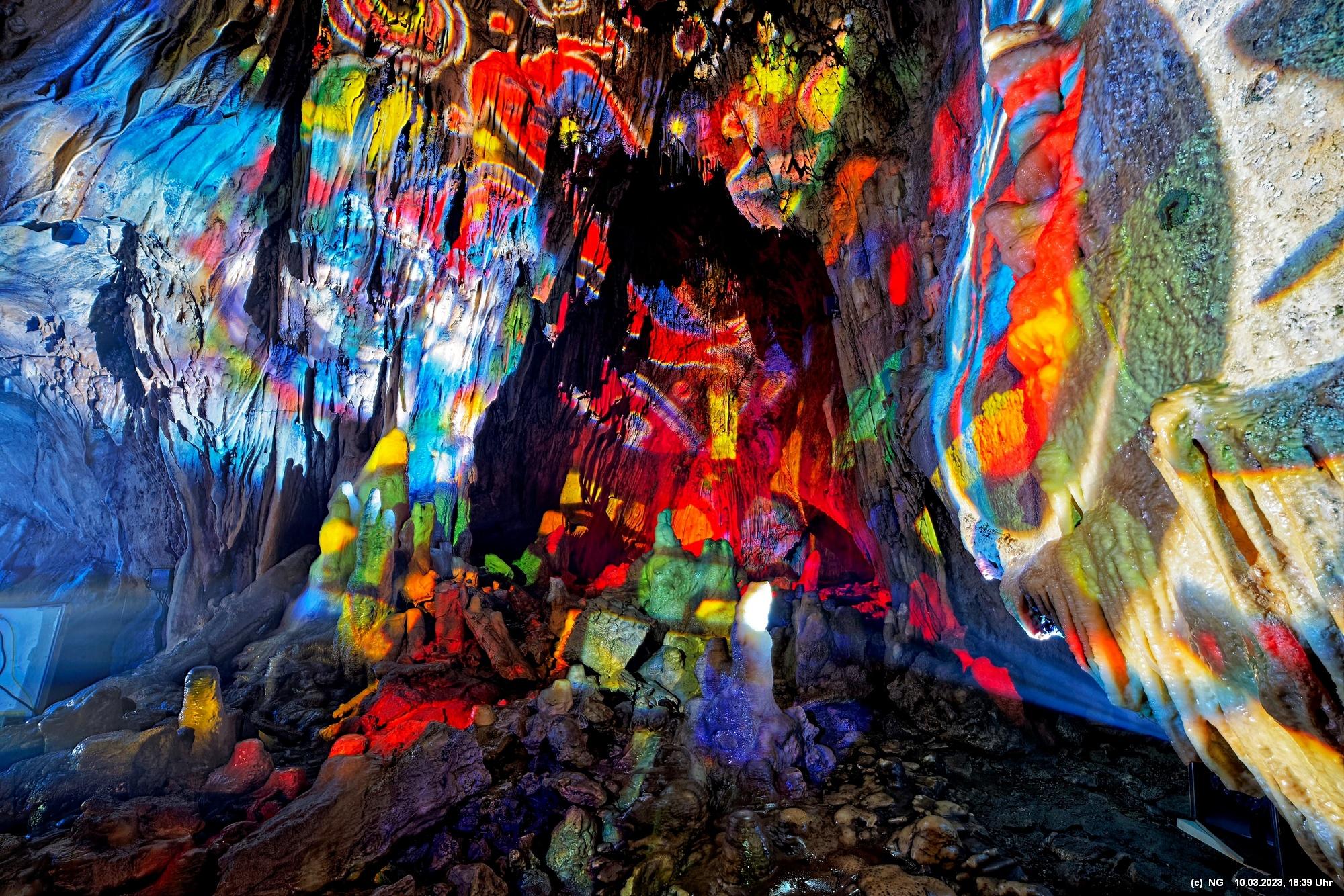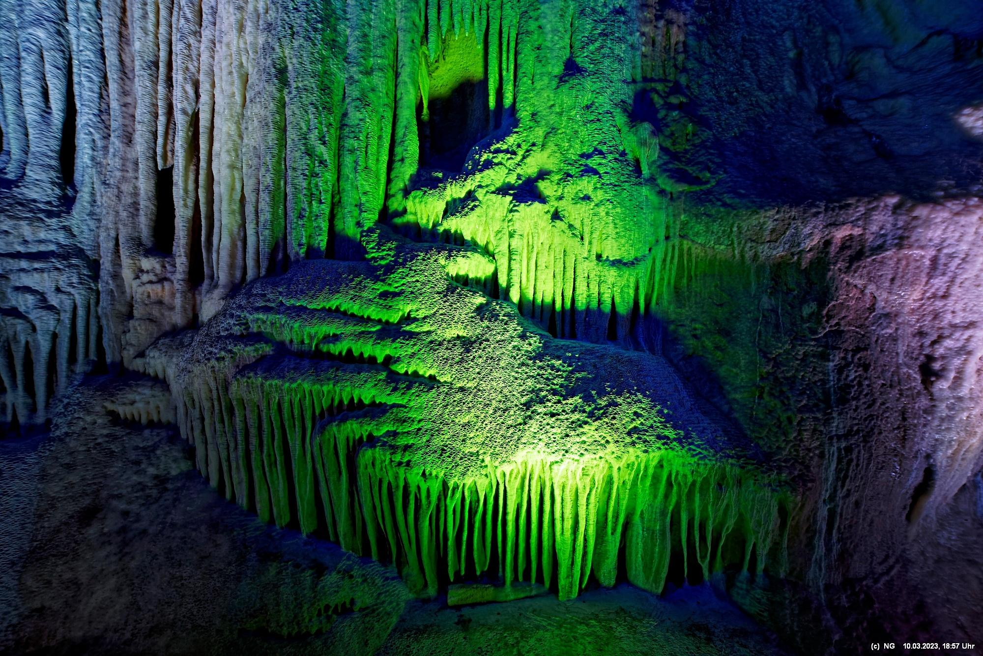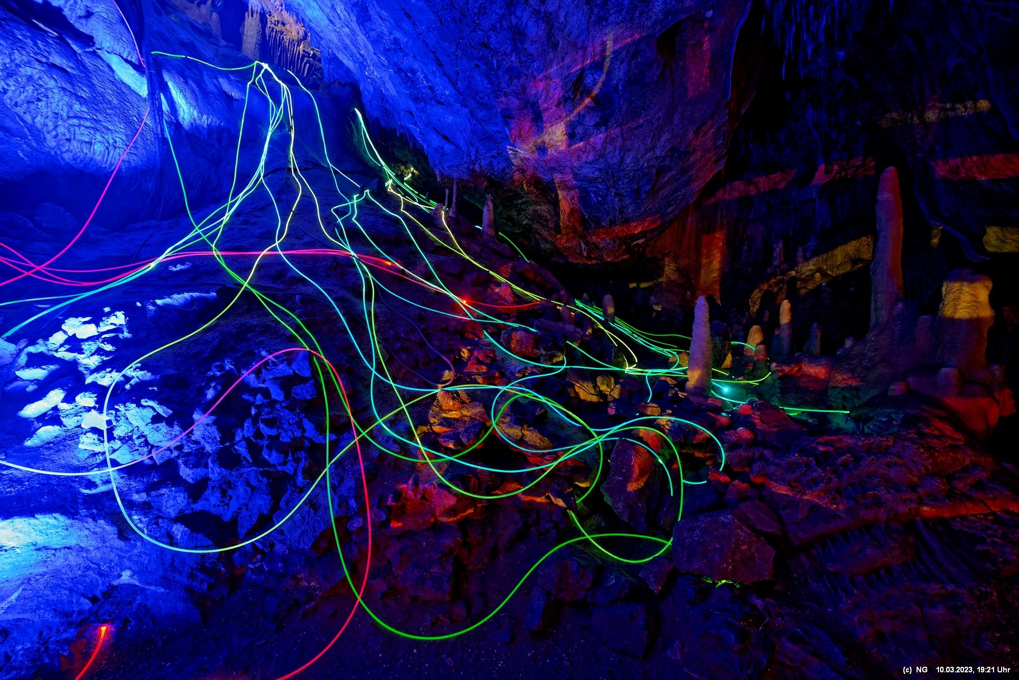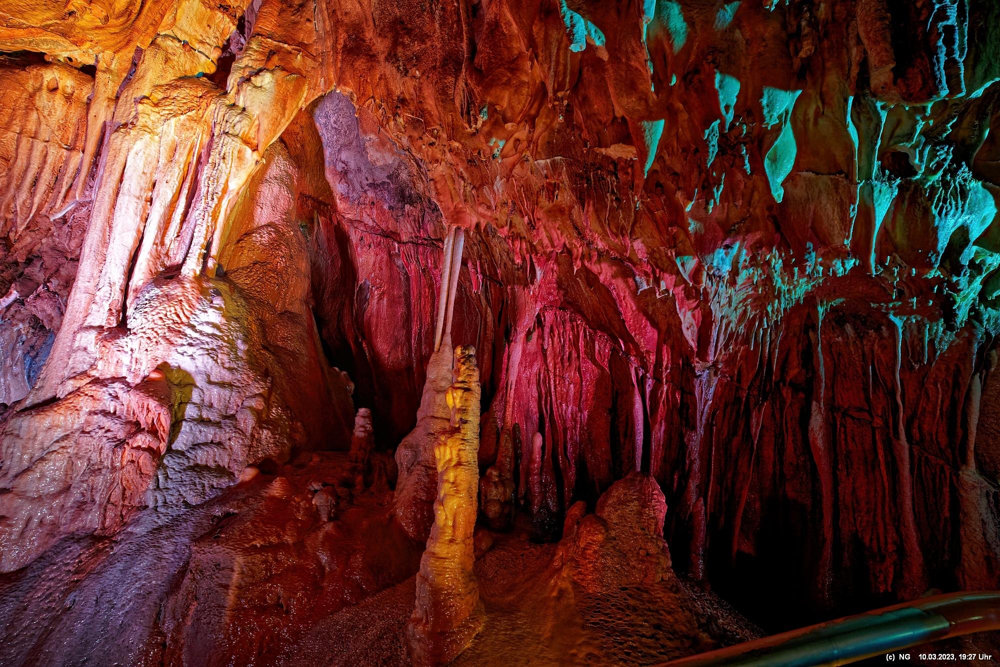 Für eine geringe Anzahl von Fotografen, darunter einige von "Revierblicke", gab es zwar eine doppelt so lange Besuchszeit (über 1 1/2 Stunden für die gut 400 m), aber trotzdem stand irgendwie immer einer im Weg. Fotografen brauchen halt Zeit und freie Sicht. Das was heute zu sehen ist, ist in vielen Millionen Jahren entstanden und dringt durch Farben tief ins Bewusstsein. Es ist schon ein Abenteuer. Ansonsten ist die Höhle nämlich eher schlicht beleuchtet, sodass man gerade noch den Weg sehen kann.