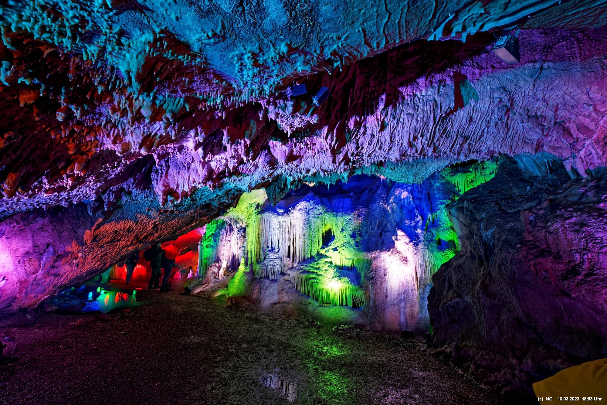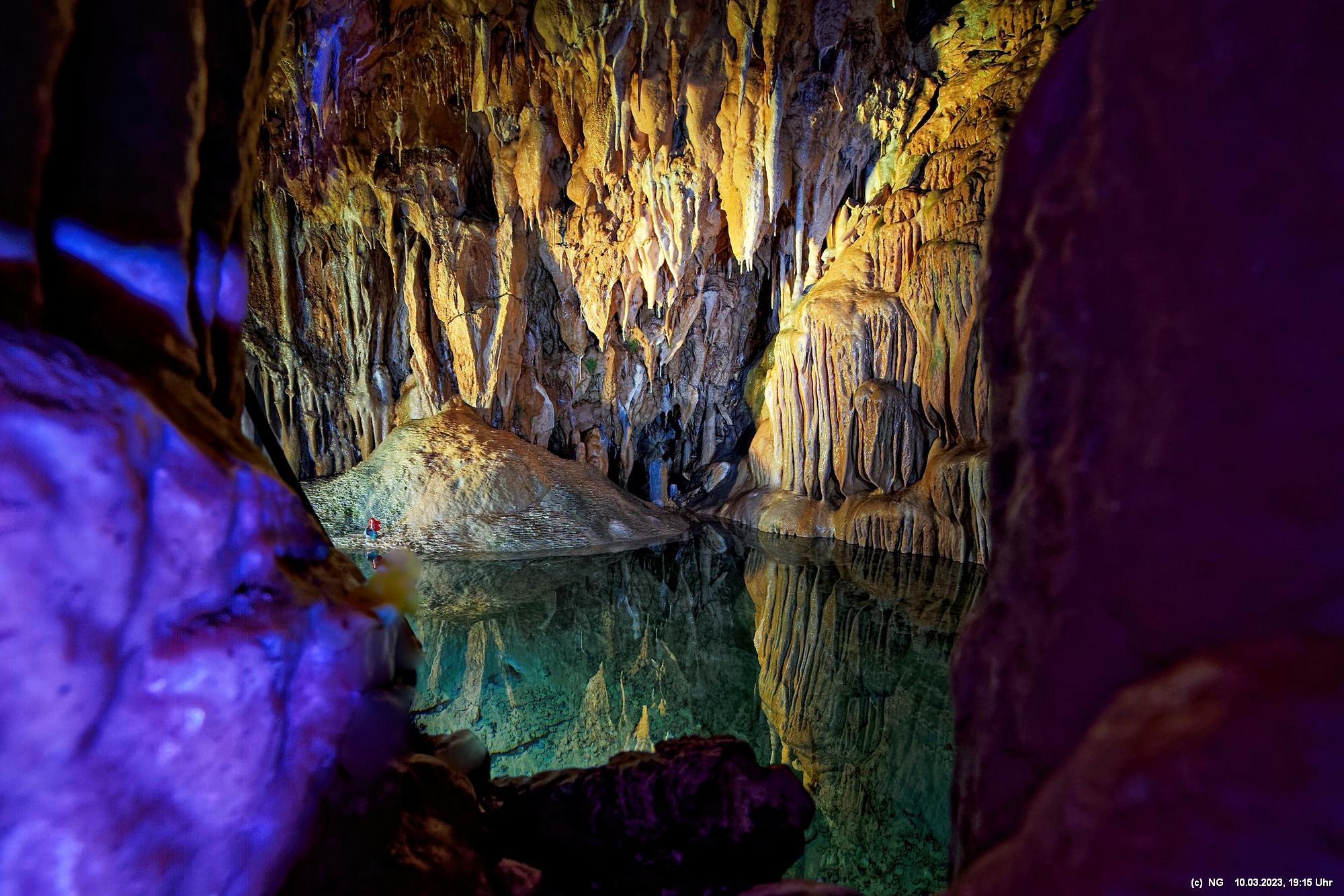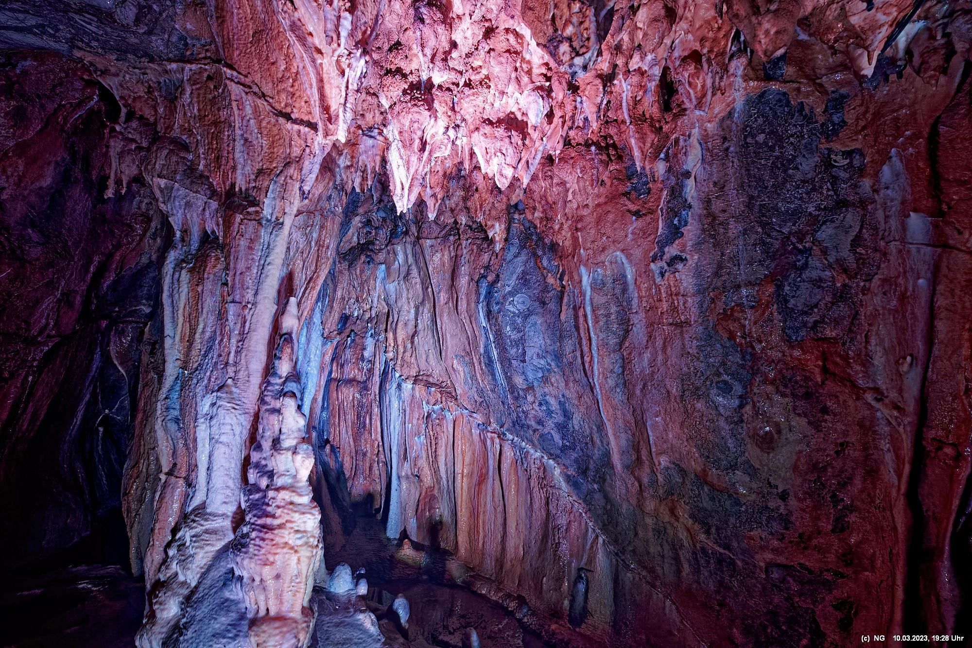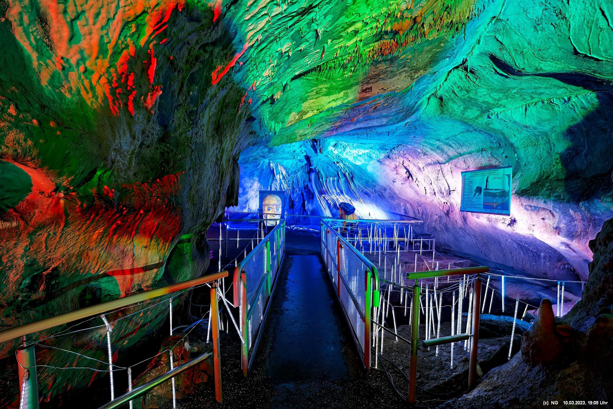 Für eine geringe Anzahl von Fotografen, darunter einige von "Revierblicke", gab es zwar eine doppelt so lange Besuchszeit (über 1 1/2 Stunden für die gut 400 m), aber trotzdem stand irgendwie immer einer im Weg. Fotografen brauchen halt Zeit und freie Sicht. Das was heute zu sehen ist, ist in vielen Millionen Jahren entstanden und dringt durch Farben tief ins Bewusstsein. Es ist schon ein Abenteuer. Ansonsten ist die Höhle nämlich eher schlicht beleuchtet, sodass man gerade noch den Weg sehen kann.