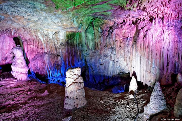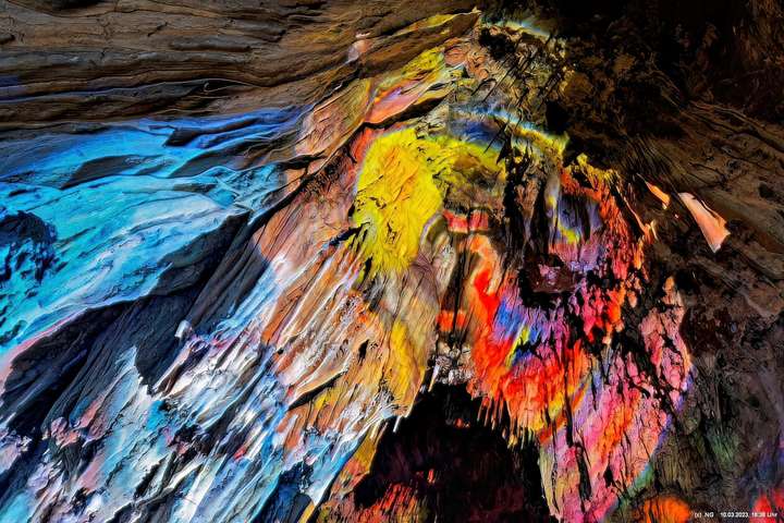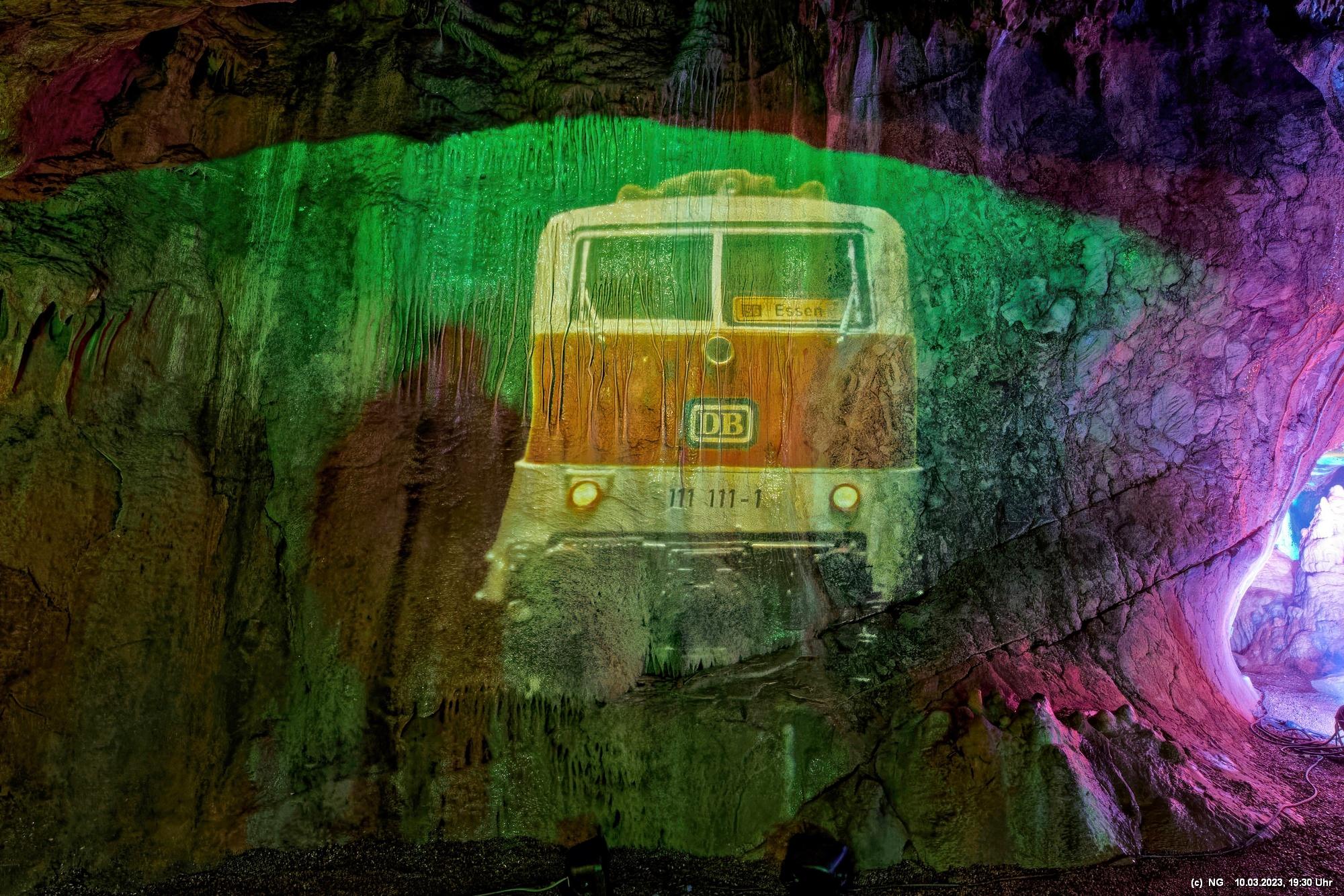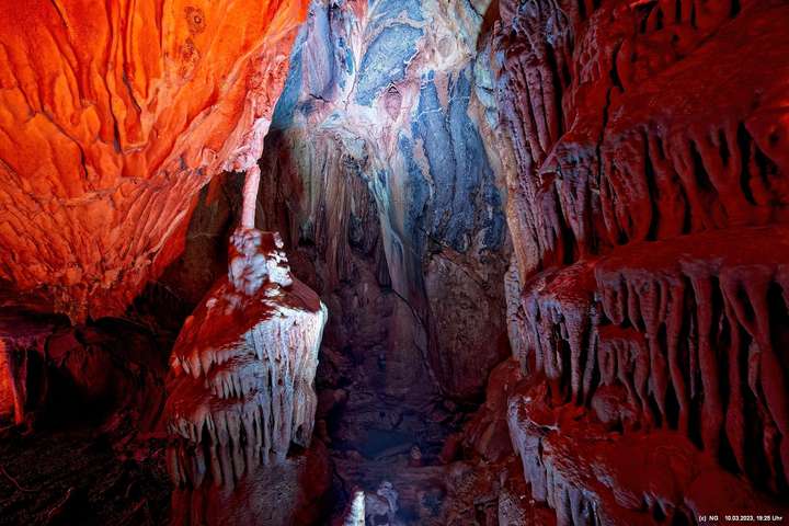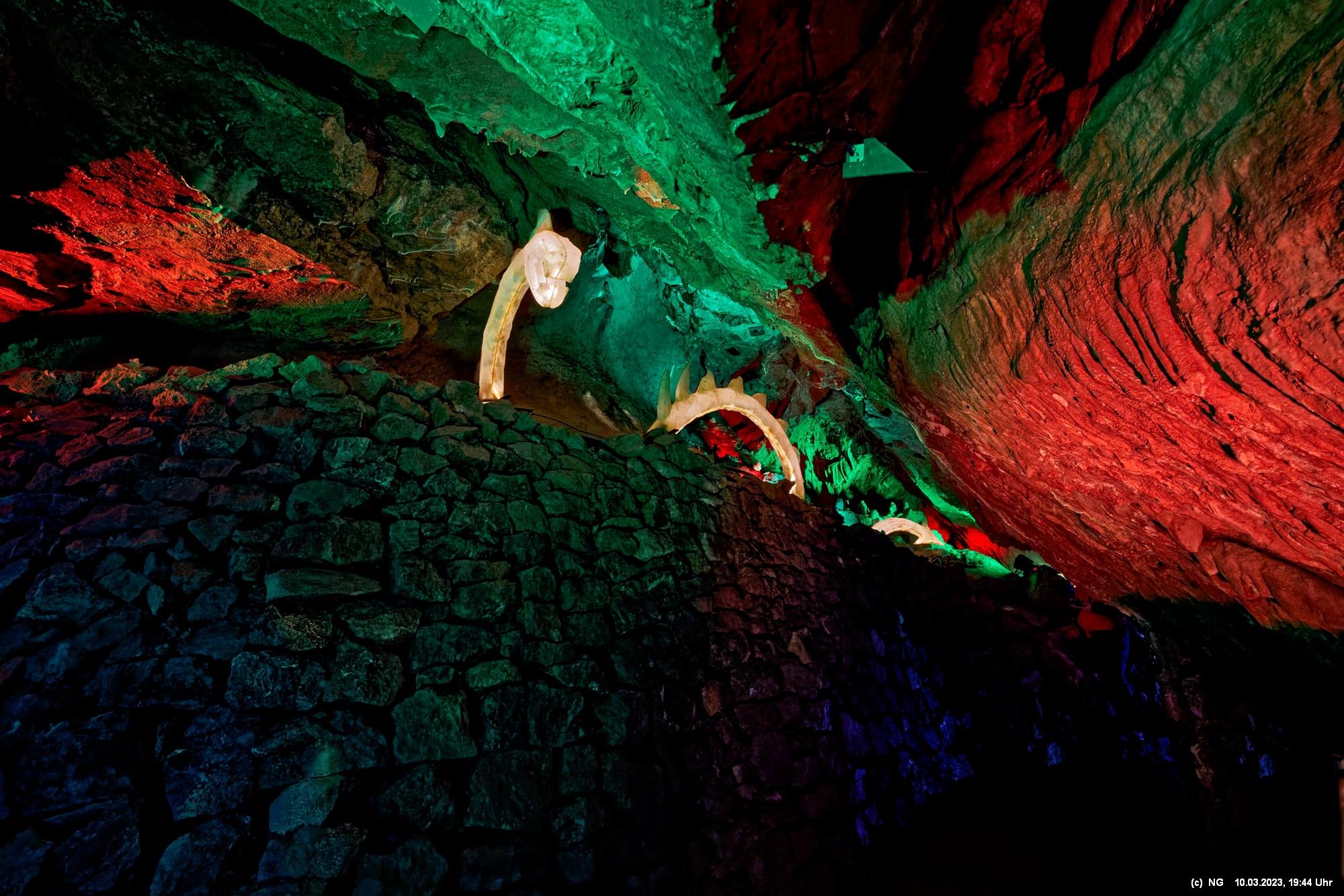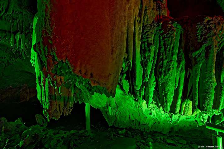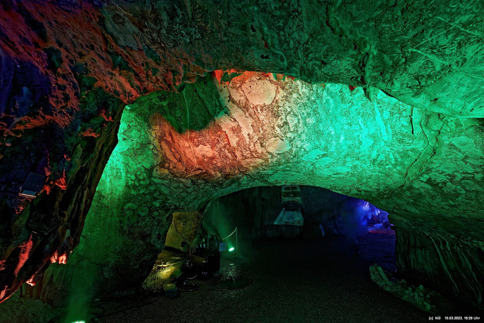 Für eine geringe Anzahl von Fotografen, darunter einige von "Revierblicke", gab es zwar eine doppelt so lange Besuchszeit (über 1 1/2 Stunden für die gut 400 m), aber trotzdem stand irgendwie immer einer im Weg. Fotografen brauchen halt Zeit und freie Sicht. Das was heute zu sehen ist, ist in vielen Millionen Jahren entstanden und dringt durch Farben tief ins Bewusstsein. Es ist schon ein Abenteuer. Ansonsten ist die Höhle nämlich eher schlicht beleuchtet, sodass man gerade noch den Weg sehen kann.