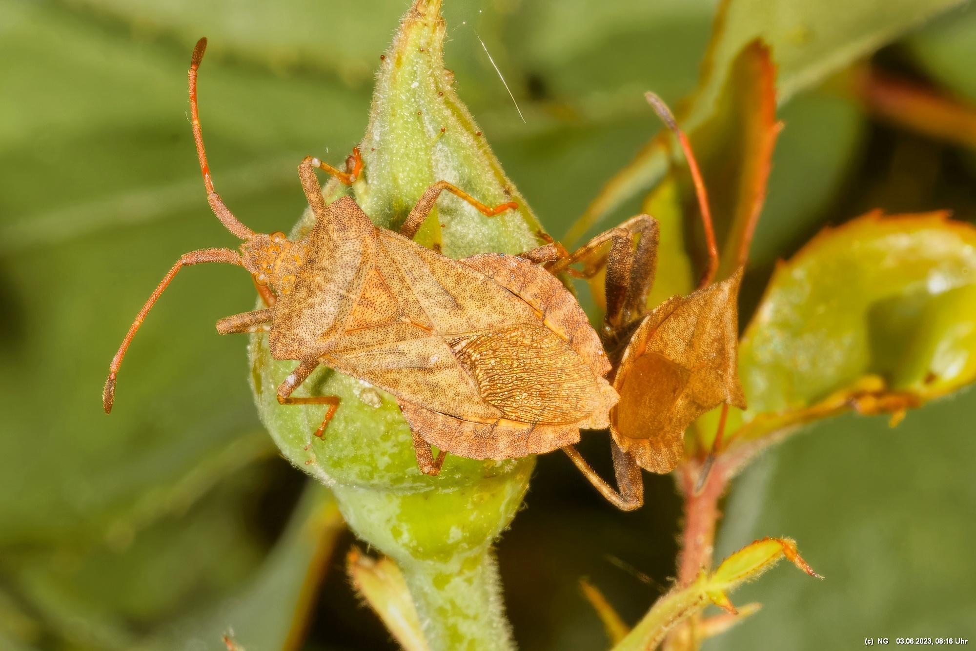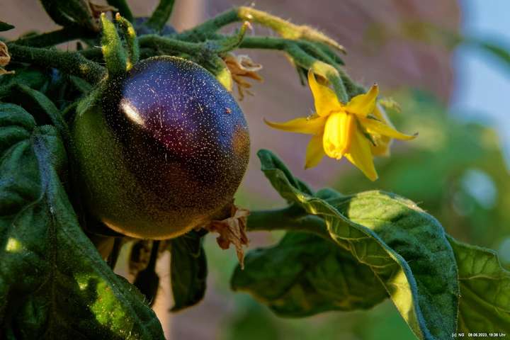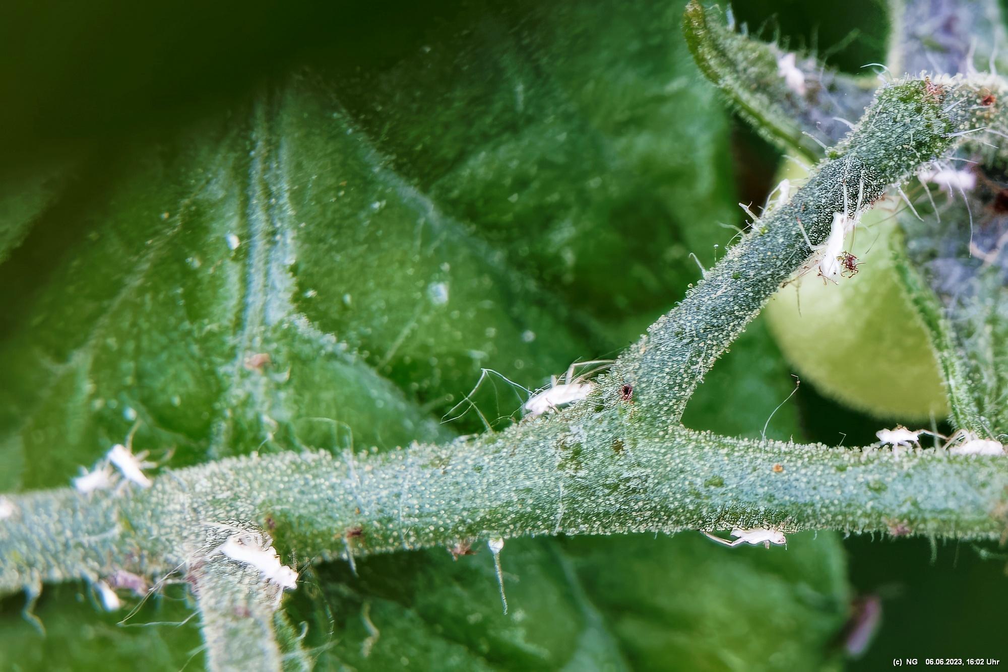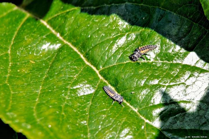 Und wenn man damit anfängt, lässt es einen plötzlich nicht mehr los. Man entwickelt regelrecht einen Blick für das Kleine und entdeckt immer wieder neues. Nach den Namen muss man recherchieren und findet dann: Feuerwanzen, Chinesische Marienkäfer und seine Larven, blauer Erlenblattkäfer, jede Menge Läuse in allen Farben, Lederwanze, Schnellkäfer, alle möglichen Fliegenarten, Schmetterlingspuppen, Rüsselkäfer, Bienen, eine kleine gelb-weiße Spinne nur knapp 2 mm groß und noch ganz viel mehr. Dazu kommt dann noch die Explosion der Pflanzen. Die Malven blühen, die Rosen fangen auch an, und viele andere, die man hier gar nicht alle aufzählen möchte. Interessant auch unsere blauen Kleintomaten, die schon erste Früchte angesetzte haben und unsere kleinen Gurken, die prächtig gedeihen. Wir freuen uns schon auf den Sommer.
