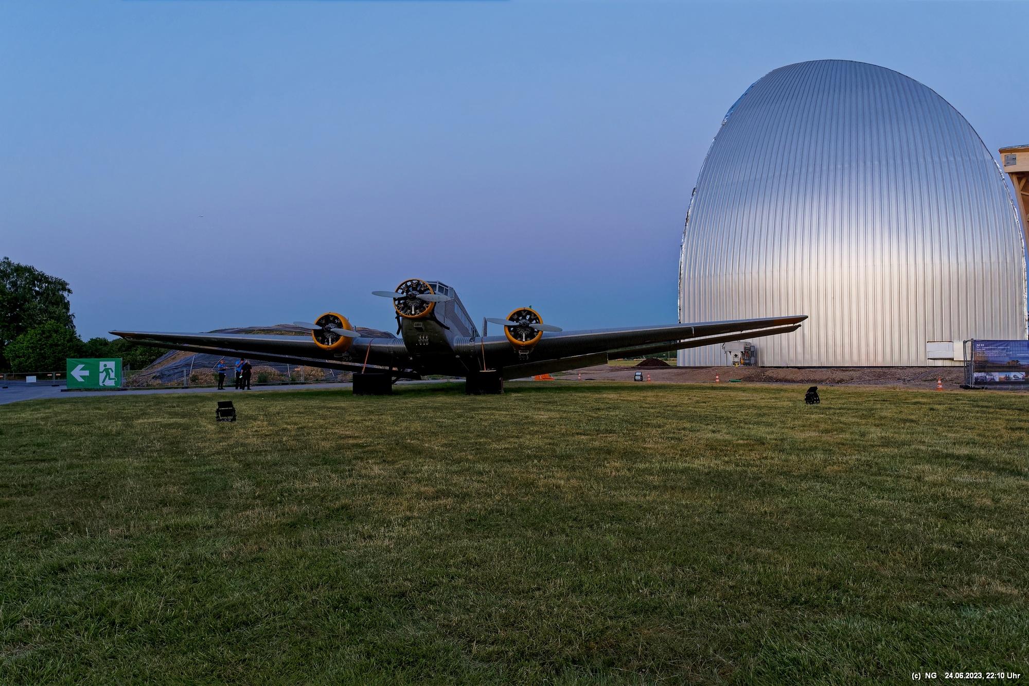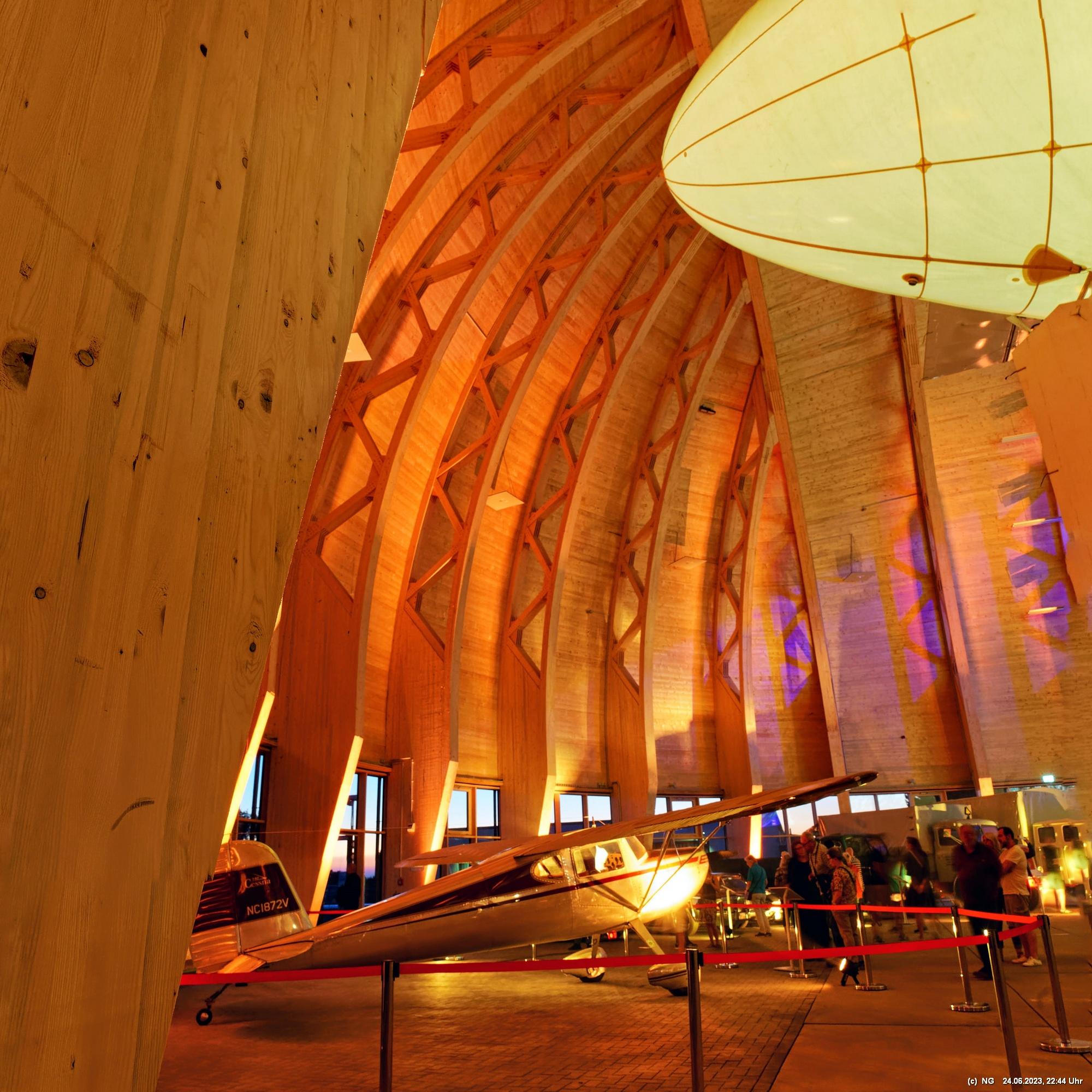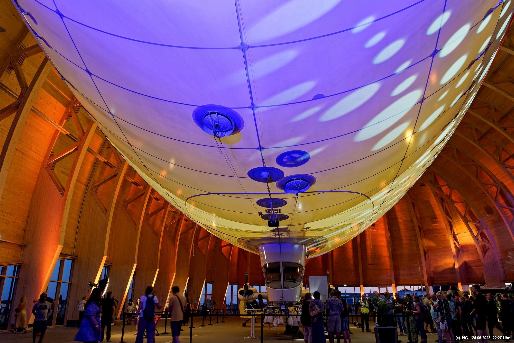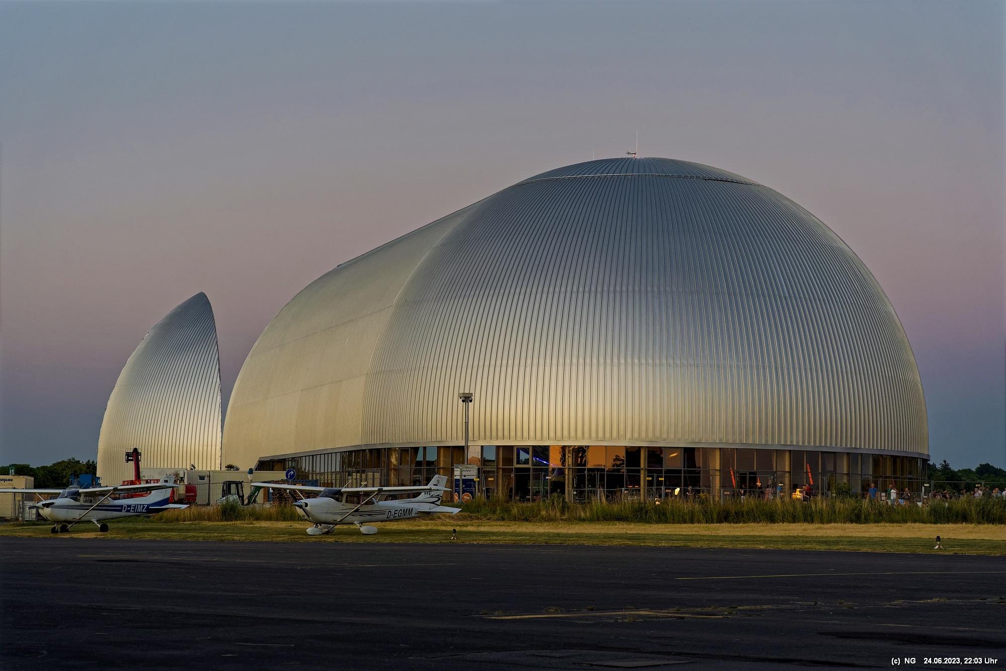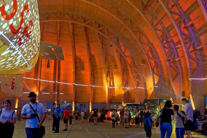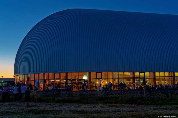 Wir sind dann spontan nach Mülheim zum neuen Luftschiffhanger gefahren und wurden eigentlich enttäuscht. Parkplätze waren sehr knapp und wir parkten relativ weit weg in einer kleinen Seitenstraße. Die Illumination war eigentlich nur Innenlicht, Kultur war nur eine kleine , 3-köpfige Musikgruppe und sonst gab es einige alte Autos mit Kennzeichen aus Bitterfeld. Es war eigentlich eine Sommerlonge mit auffallend vielen Liegestühlen.