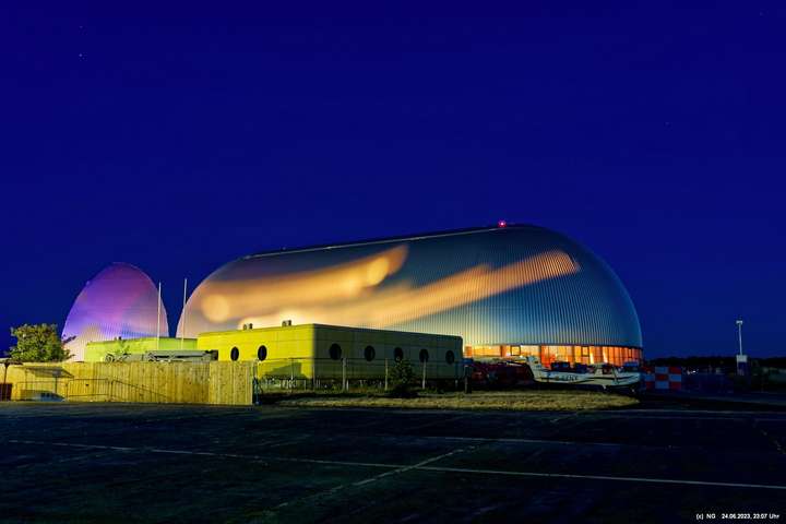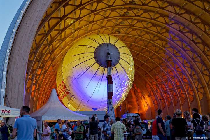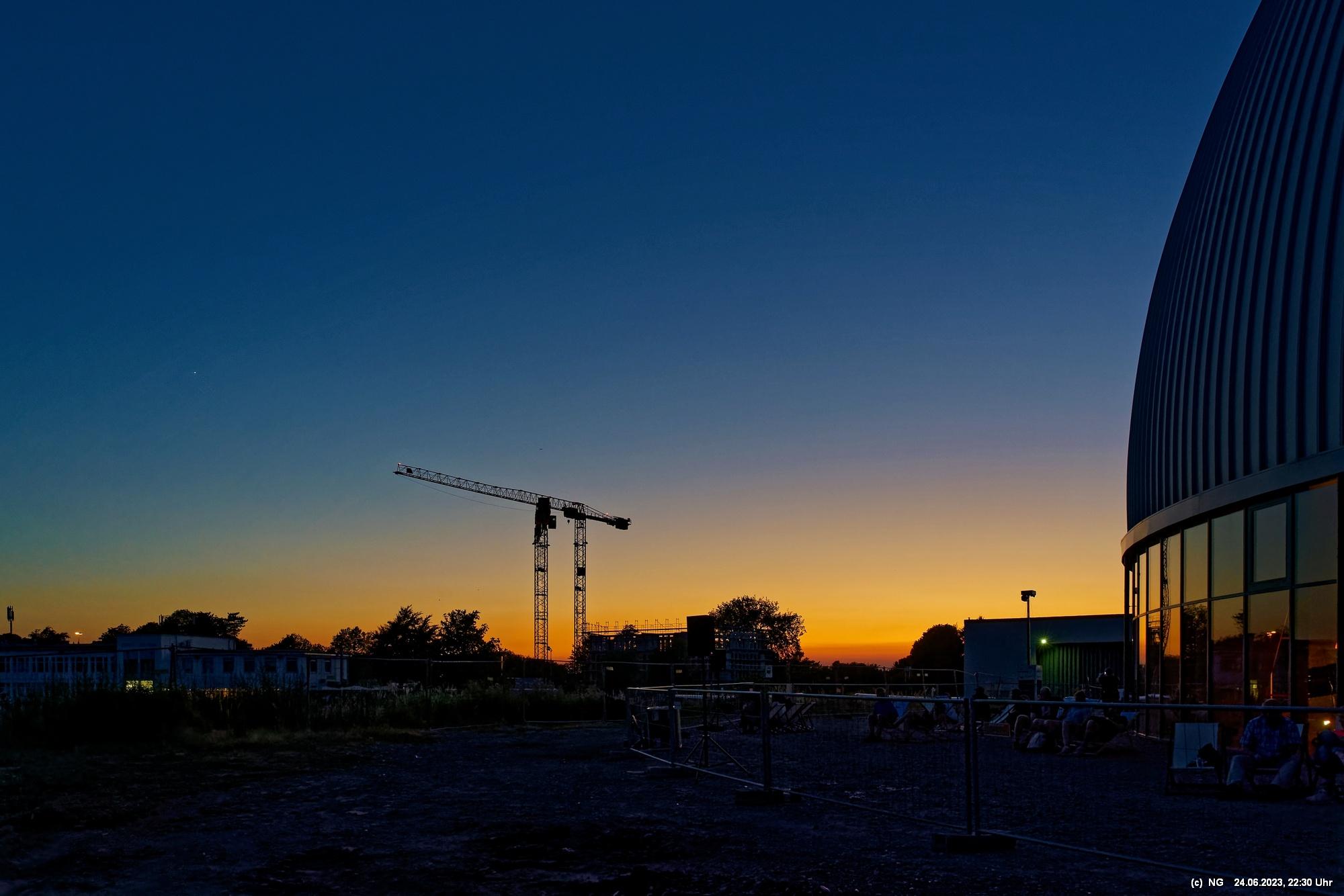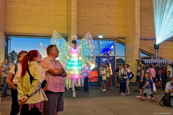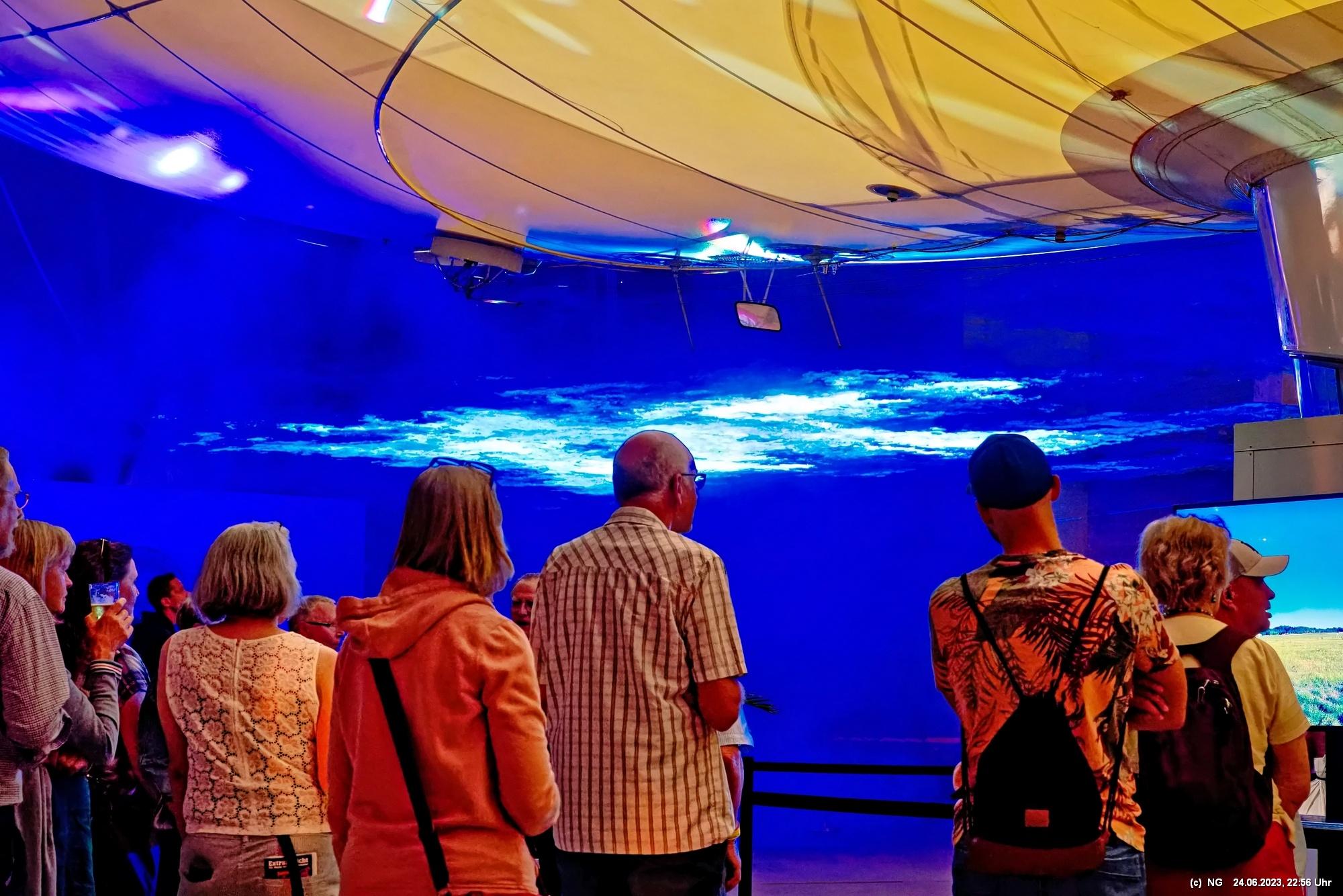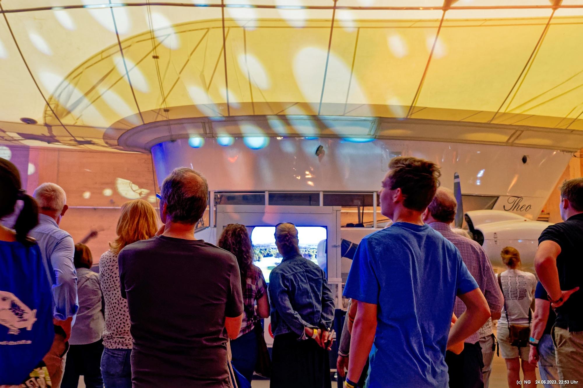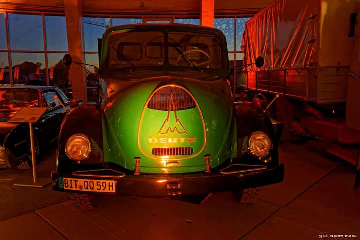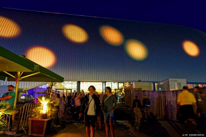 Wir sind dann spontan nach Mülheim zum neuen Luftschiffhanger gefahren und wurden eigentlich enttäuscht. Parkplätze waren sehr knapp und wir parkten relativ weit weg in einer kleinen Seitenstraße. Die Illumination war eigentlich nur Innenlicht, Kultur war nur eine kleine , 3-köpfige Musikgruppe und sonst gab es einige alte Autos mit Kennzeichen aus Bitterfeld. Es war eigentlich eine Sommerlonge mit auffallend vielen Liegestühlen.