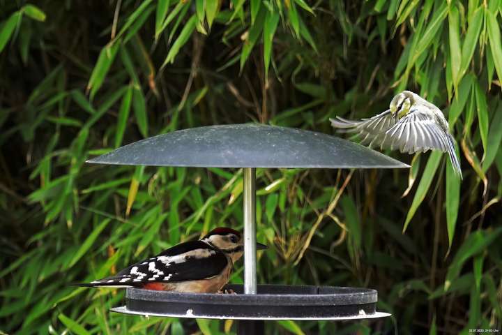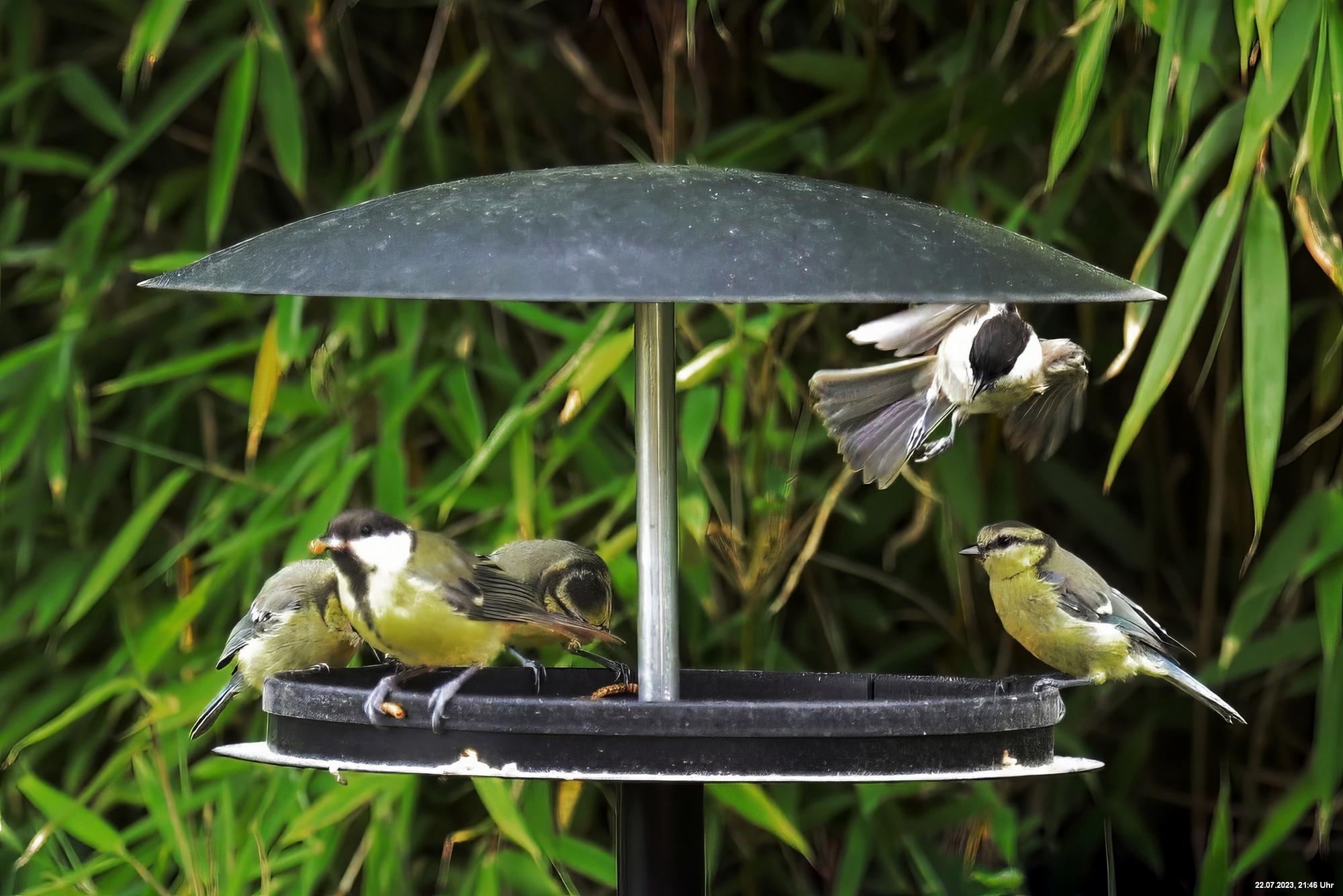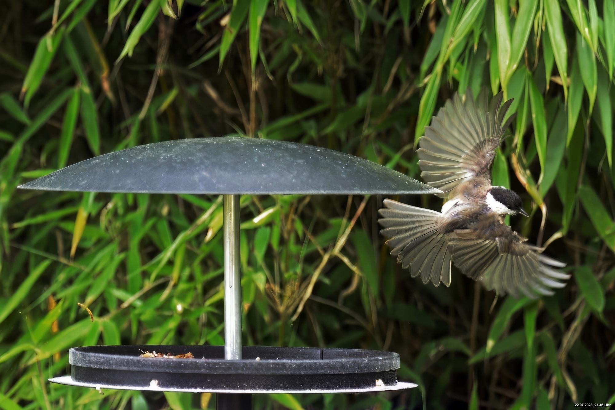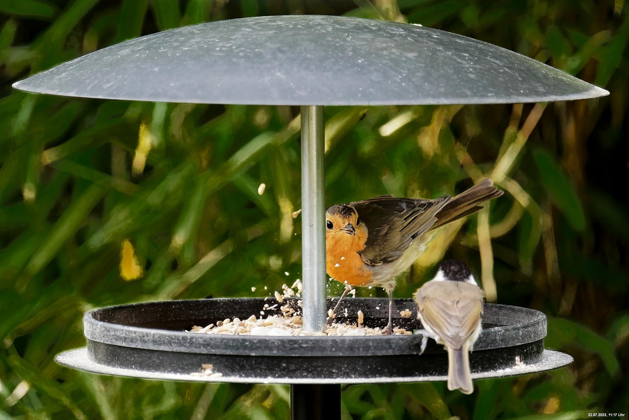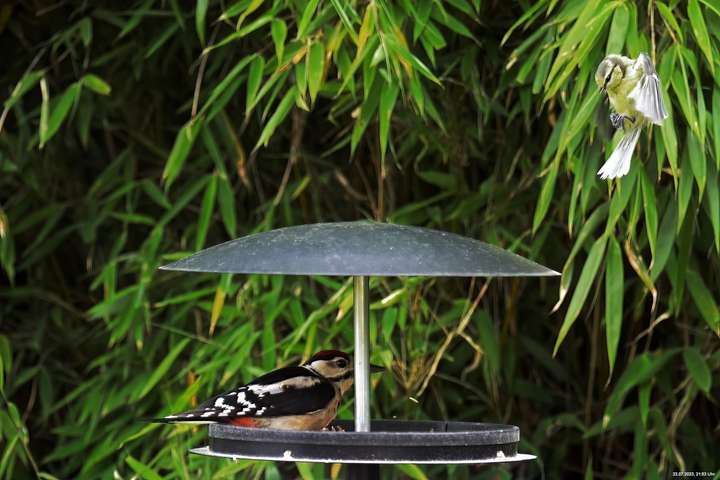 Zuerst haben sie die Futterstelle misstrauisch aus der Entfernung betrachtet. Einige haben sich dann getraut und schon mal die Kost probiert. Es gab gemischte Körner ohne Schalen. Dann haben wir nachgelegt und auch noch getrocknete Mehlwürmer angeboten. Da gab es kein Halten mehr. Sie kamen in Schaaren und stritten sich um die Plätze. Sogar der eigentlich viel zu große Buntspecht hat sich getraut und gleich für eine leichte Panik bei den anderen Vögeln gesorgt. Es ist immer viel los am Buffet durch Weidenmeisen, Kohlmeisen, Blaumeisen, Rotkehlchen, Spatzen und eben dem Buntspecht.