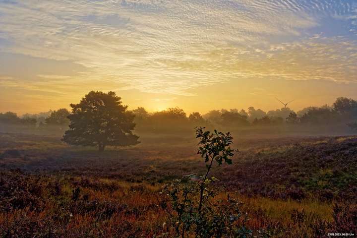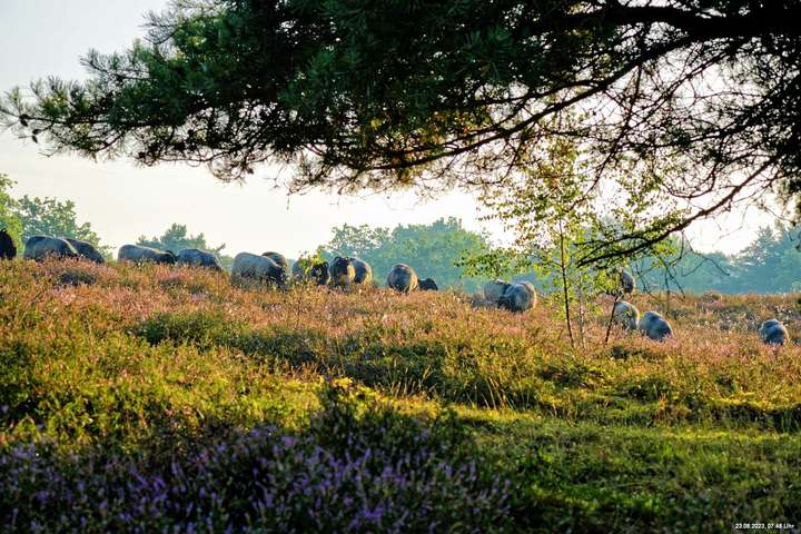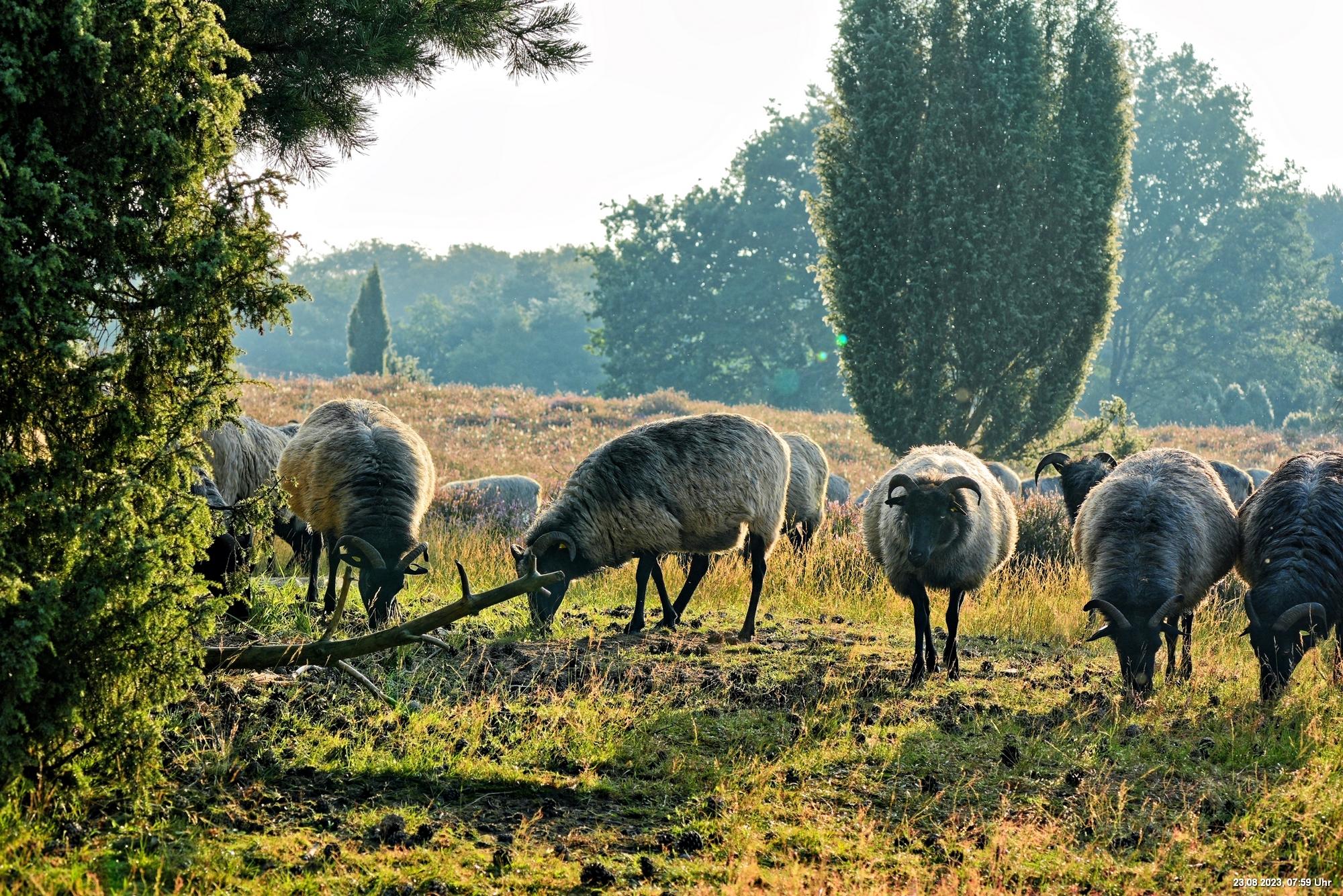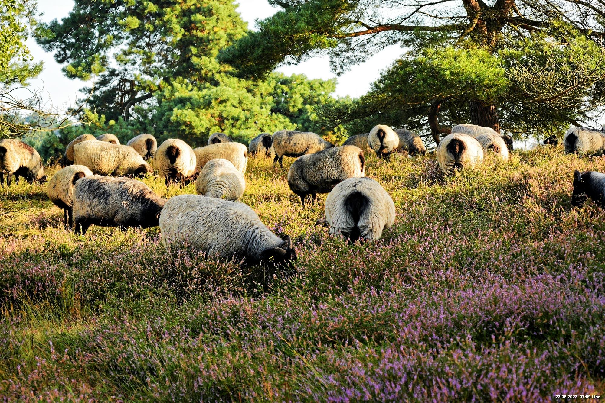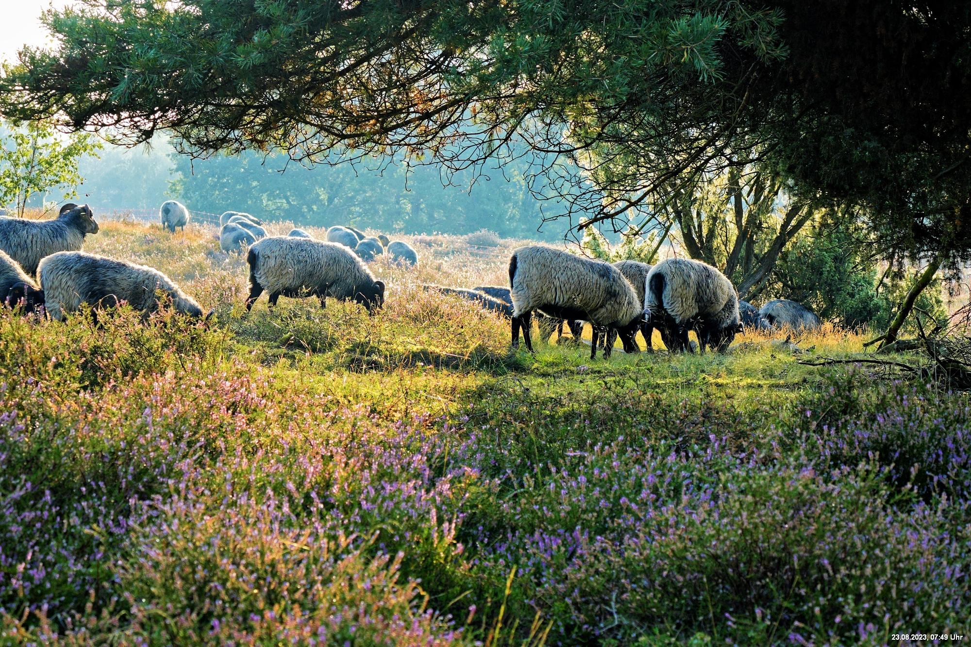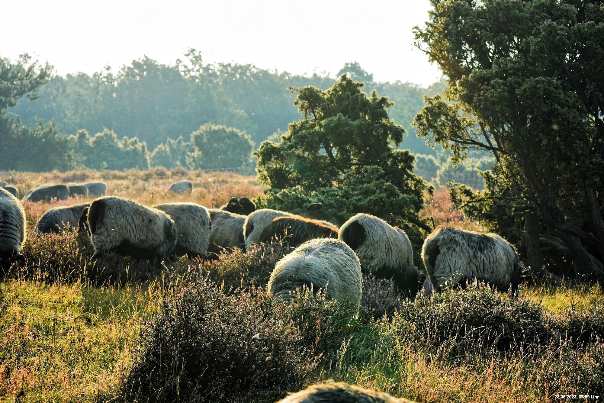 Daher ging es noch einmal bei gutem Wetter früh morgens zum Sonnenaufgang dorthin. Leichter Bodennebel hatte sich in den Tälern gebildet und am Himmel gab es leichte Wolkenstreifen. Beste Bedingungen also für einen Foto Walk. Es gab heute 3 interessante Themen: Sonnenaufgang, Spinnweben im Morgentau und die Säuberungsaktion der Heideschafe ganz nah am Weg. Es ist einfach schön dort!