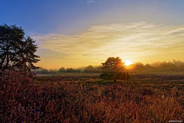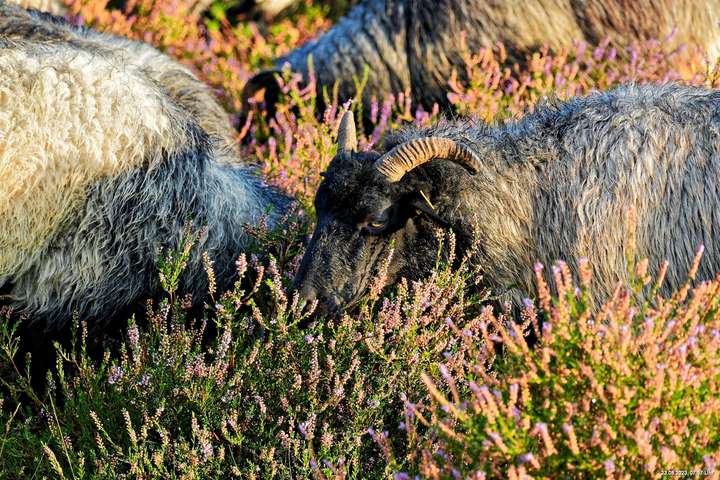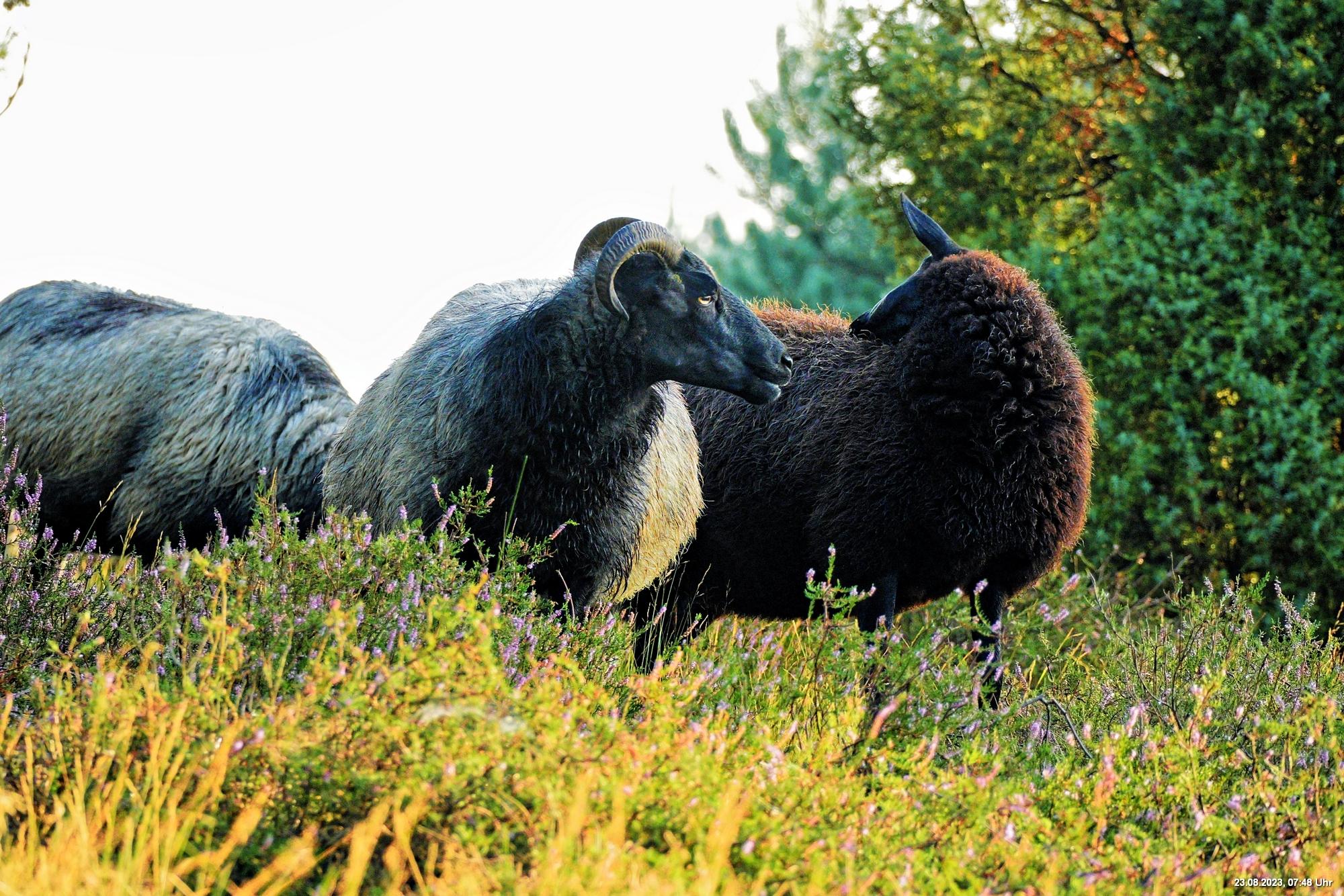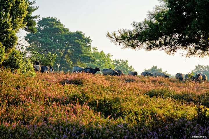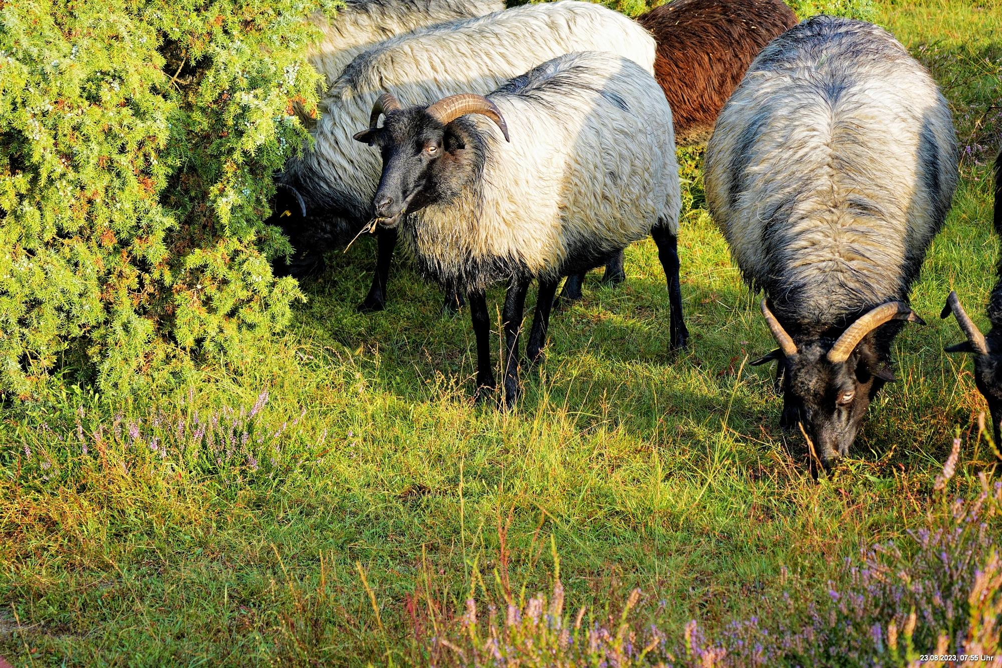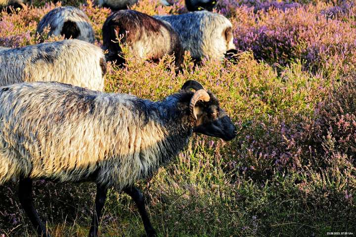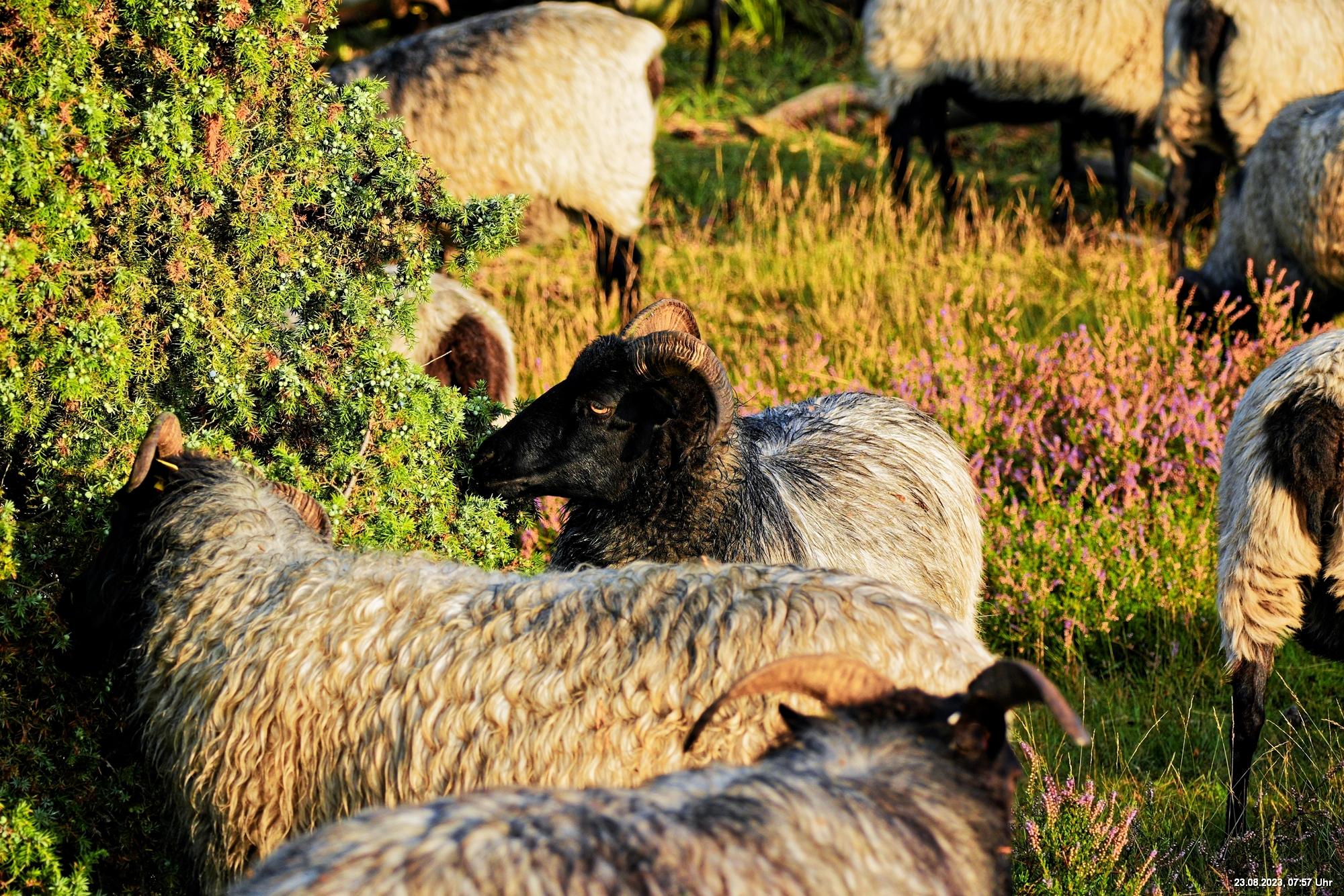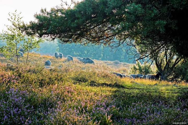 Daher ging es noch einmal bei gutem Wetter früh morgens zum Sonnenaufgang dorthin. Leichter Bodennebel hatte sich in den Tälern gebildet und am Himmel gab es leichte Wolkenstreifen. Beste Bedingungen also für einen Foto Walk. Es gab heute 3 interessante Themen: Sonnenaufgang, Spinnweben im Morgentau und die Säuberungsaktion der Heideschafe ganz nah am Weg. Es ist einfach schön dort!