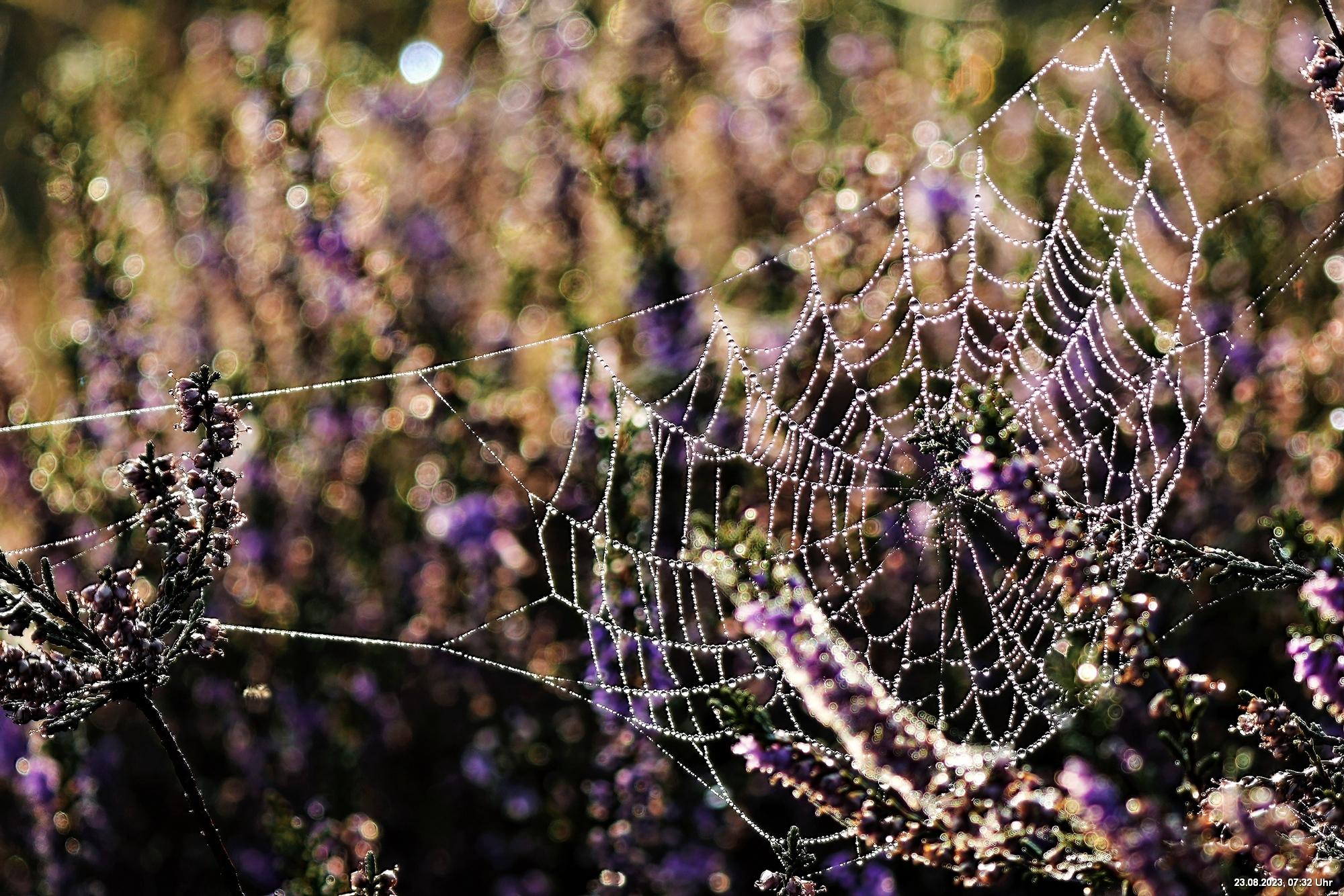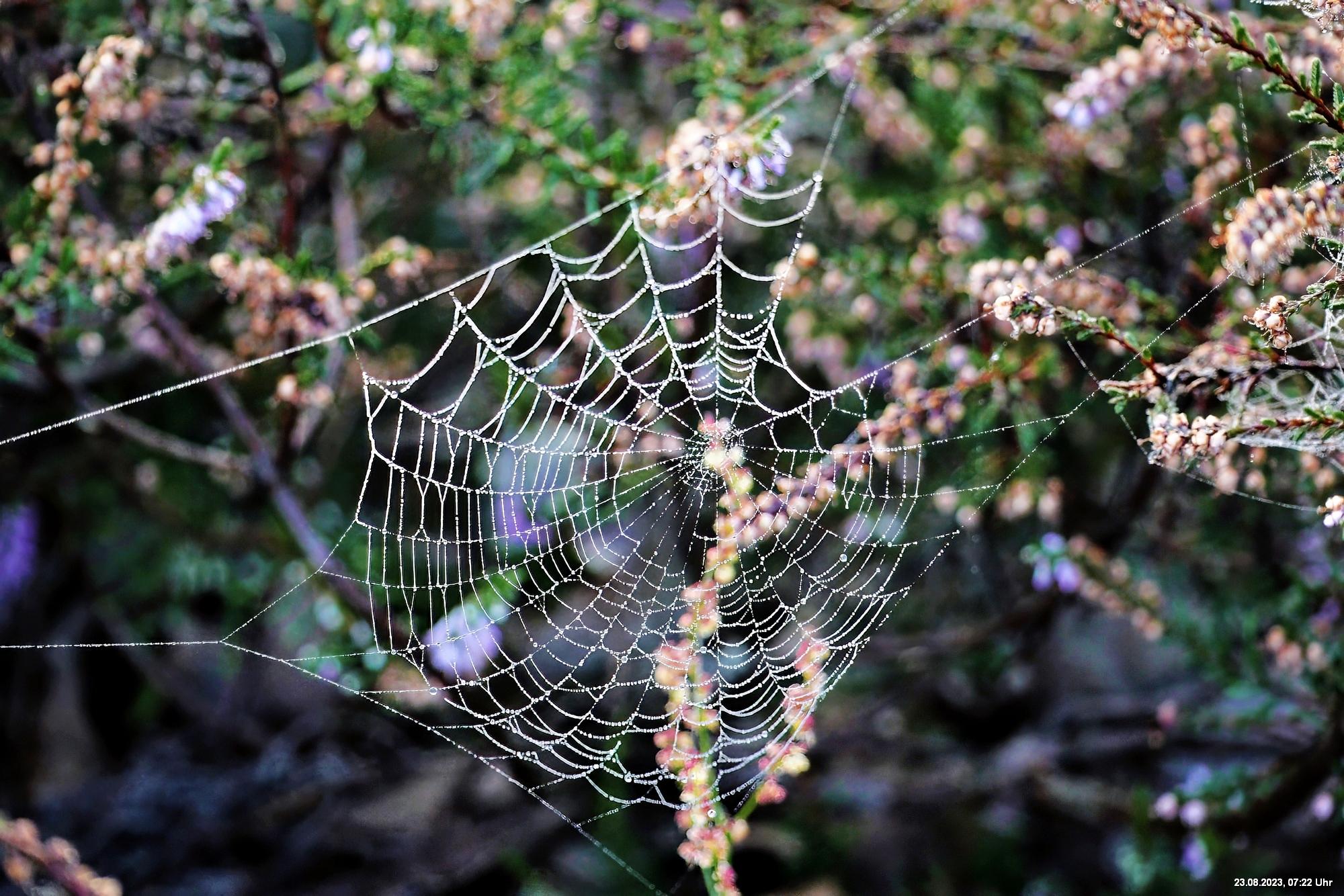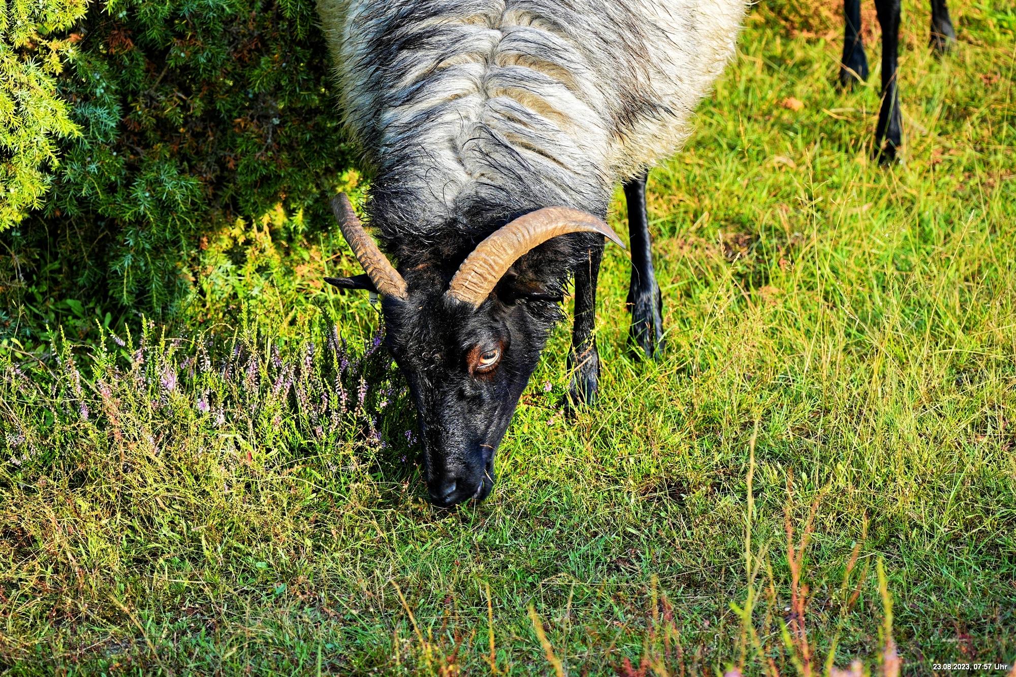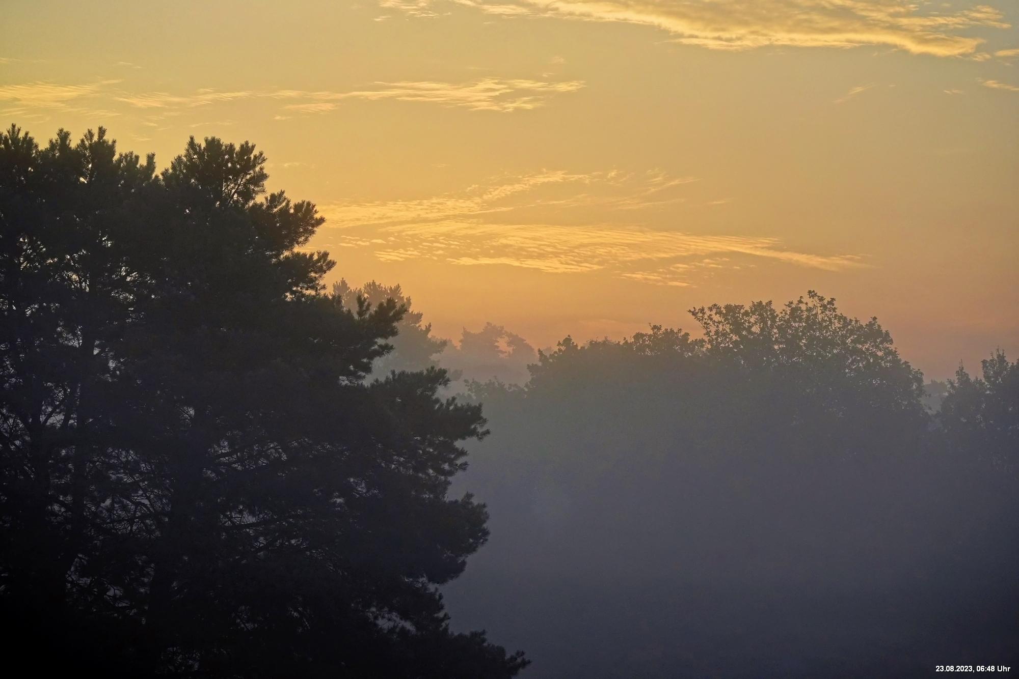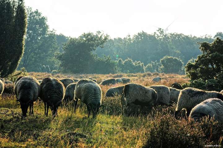 Daher ging es noch einmal bei gutem Wetter früh morgens zum Sonnenaufgang dorthin. Leichter Bodennebel hatte sich in den Tälern gebildet und am Himmel gab es leichte Wolkenstreifen. Beste Bedingungen also für einen Foto Walk. Es gab heute 3 interessante Themen: Sonnenaufgang, Spinnweben im Morgentau und die Säuberungsaktion der Heideschafe ganz nah am Weg. Es ist einfach schön dort!