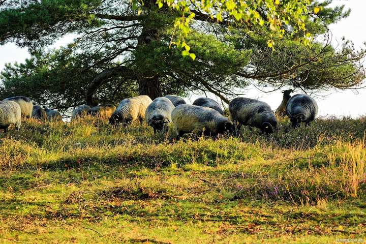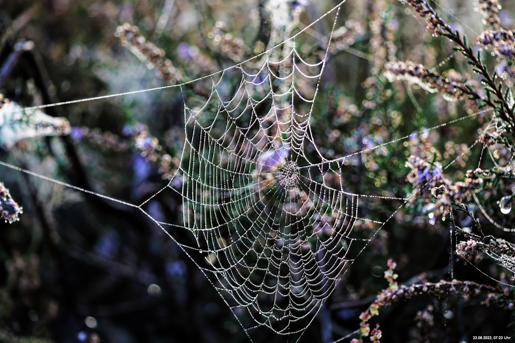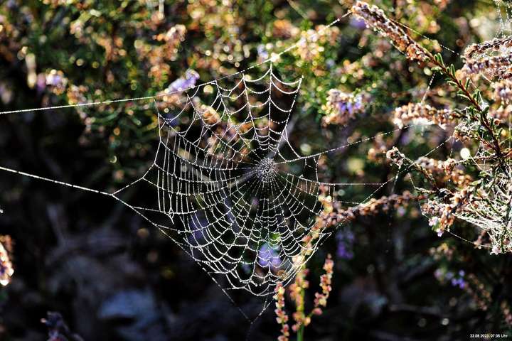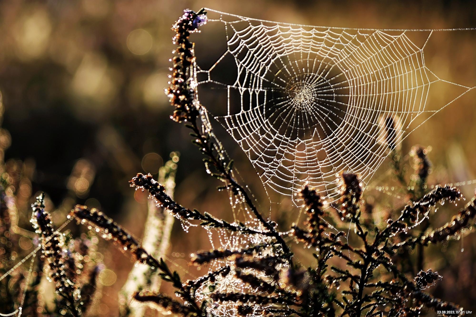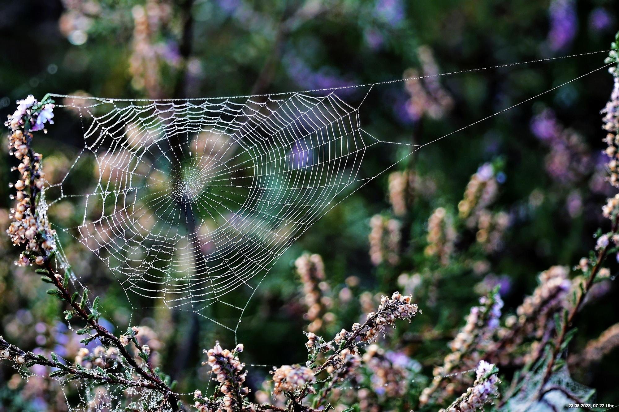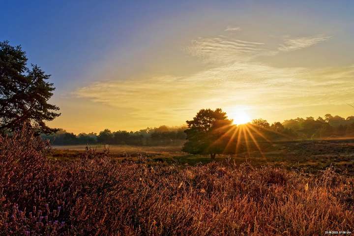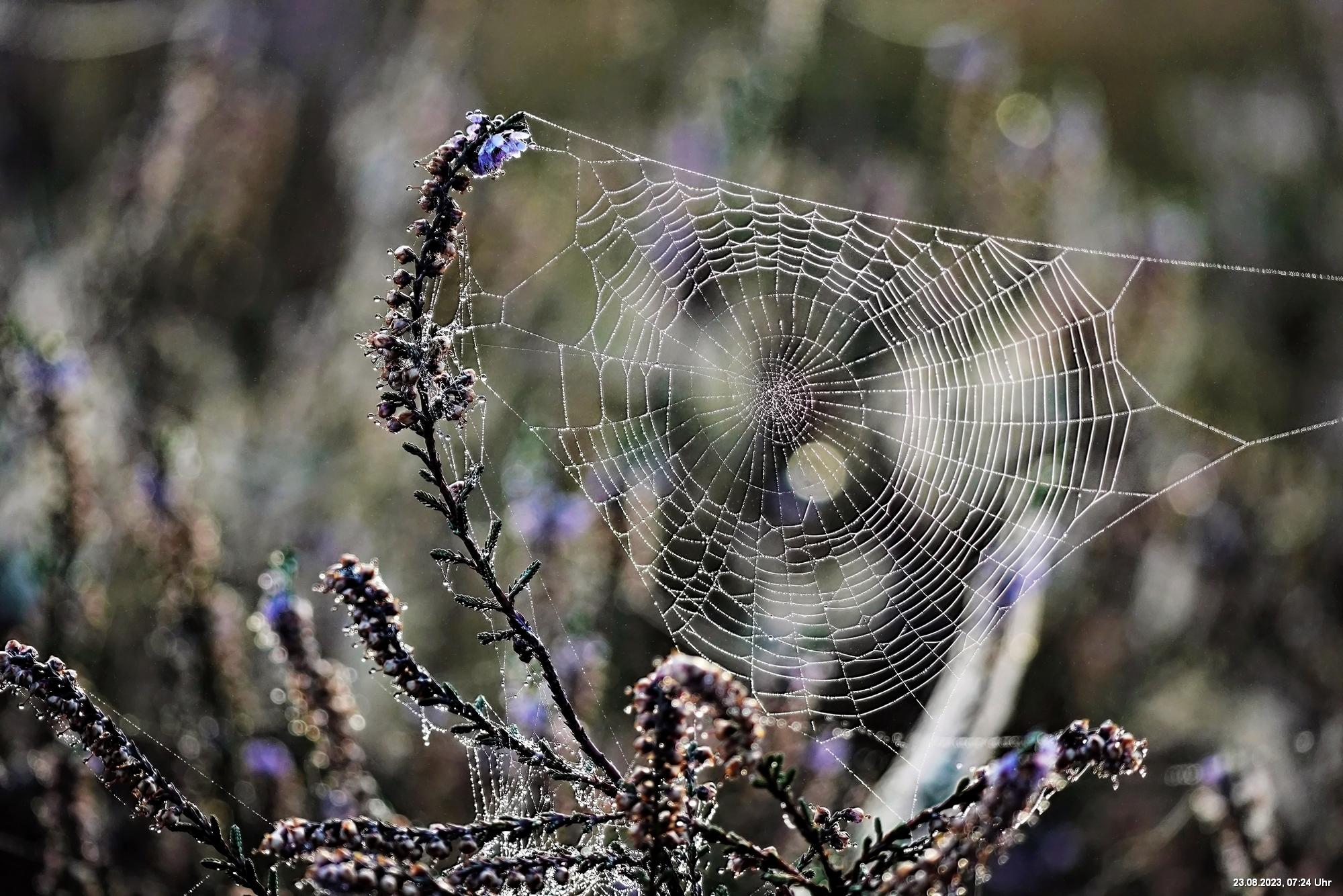 Daher ging es noch einmal bei gutem Wetter früh morgens zum Sonnenaufgang dorthin. Leichter Bodennebel hatte sich in den Tälern gebildet und am Himmel gab es leichte Wolkenstreifen. Beste Bedingungen also für einen Foto Walk. Es gab heute 3 interessante Themen: Sonnenaufgang, Spinnweben im Morgentau und die Säuberungsaktion der Heideschafe ganz nah am Weg. Es ist einfach schön dort!