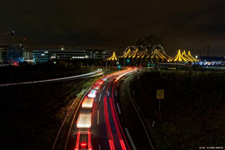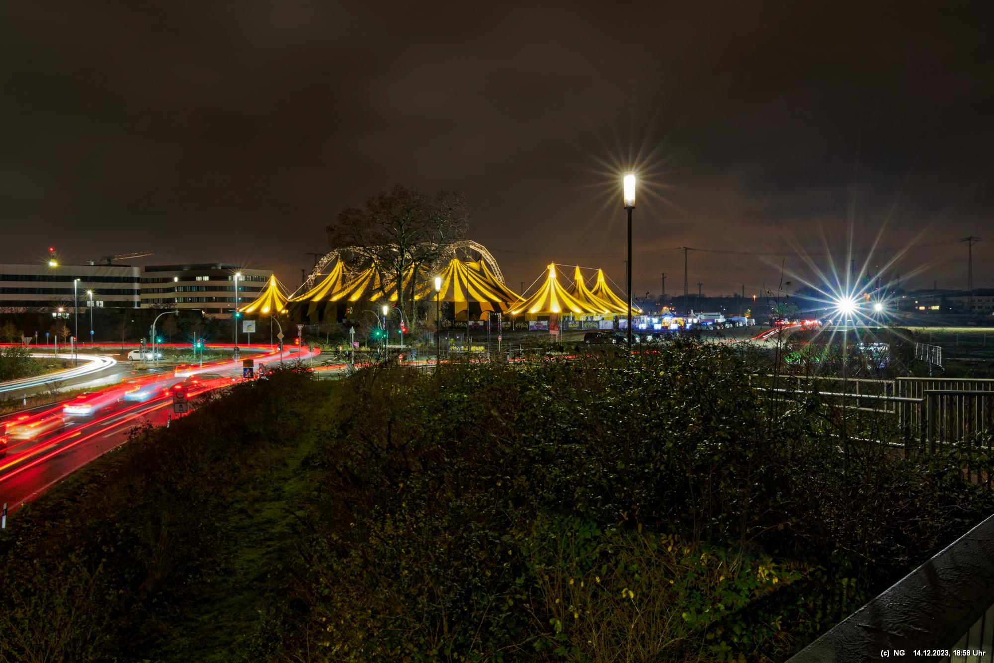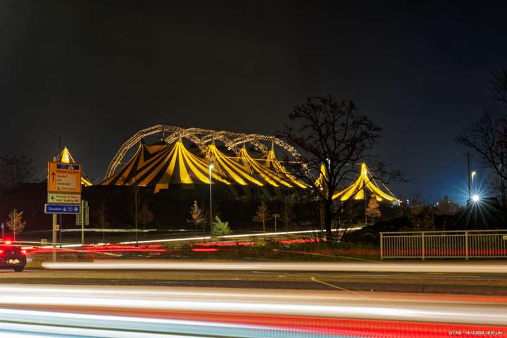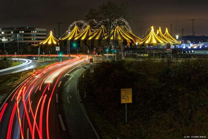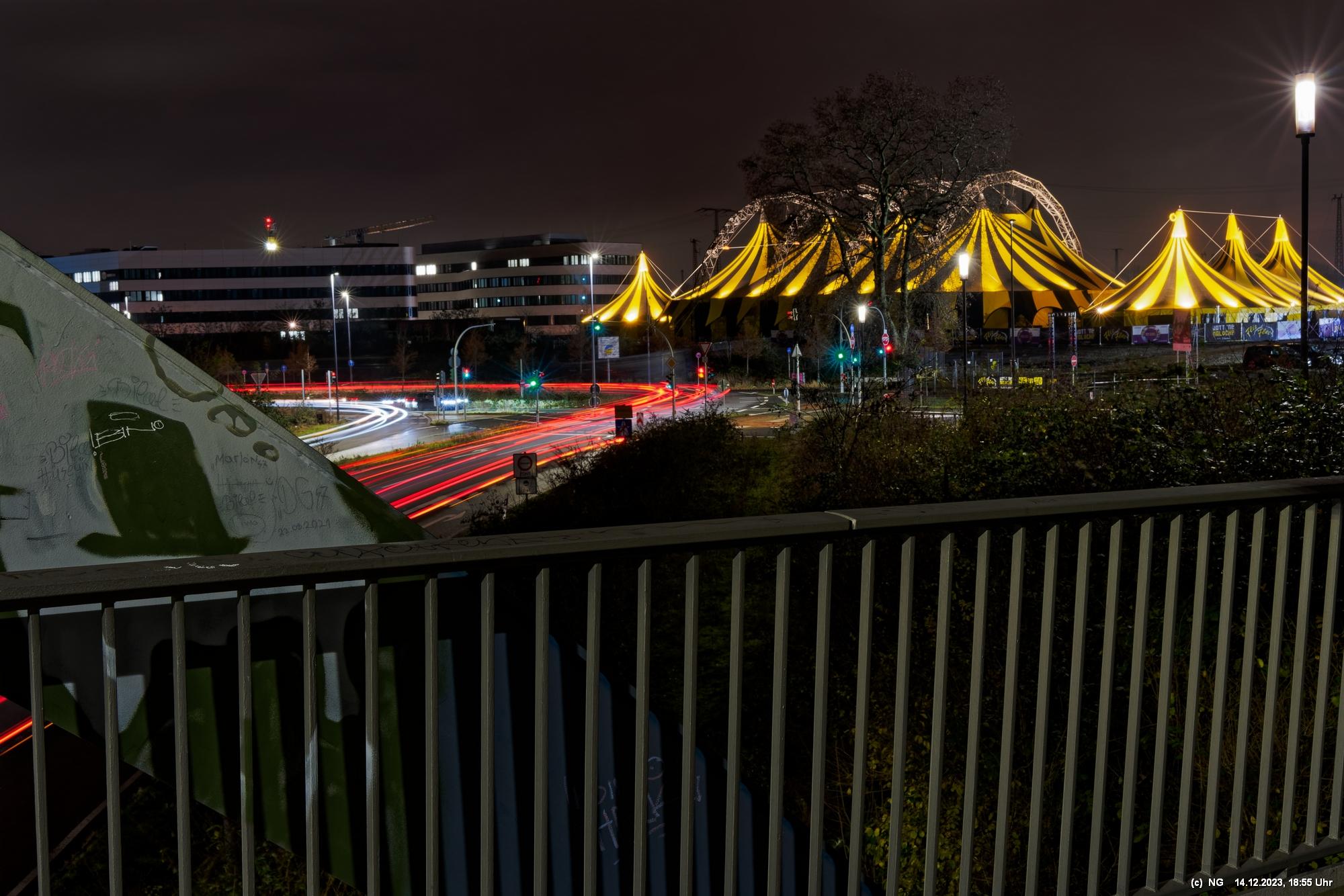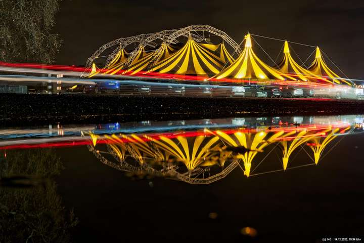 Der Nieselregen auf dem Hinweg hatte sich schnell gelegt. Von Weitem schon sah man die markant beleuchtete Zeltstadt. Der tolle Anblick war Grund genug für einen Foto ausgiebigen Walk.