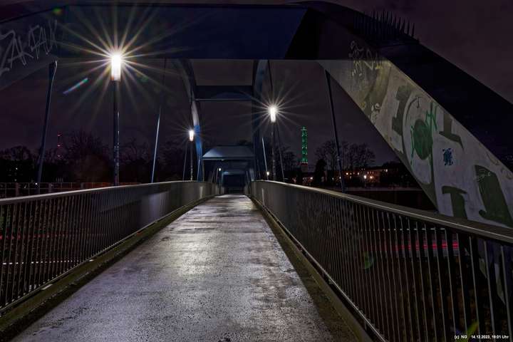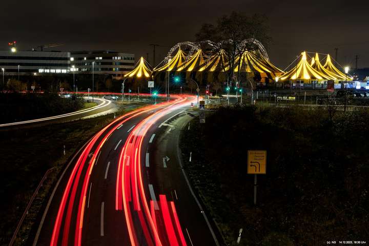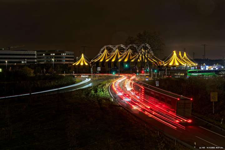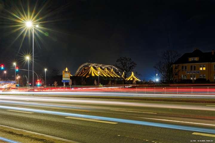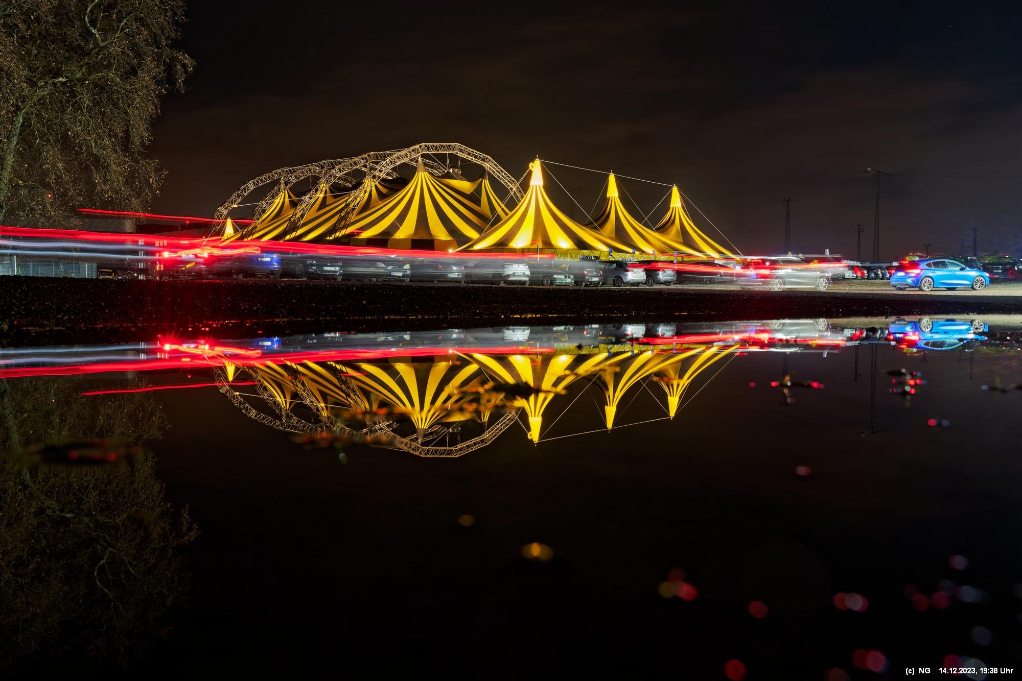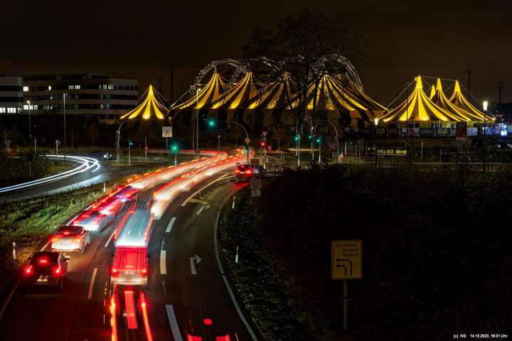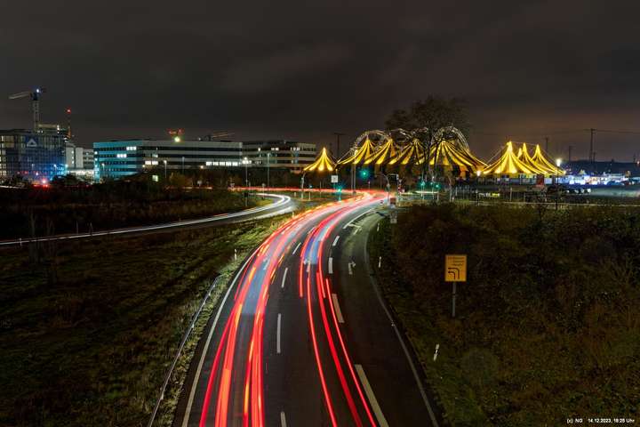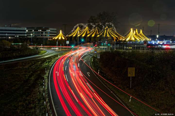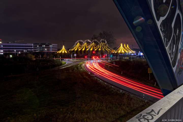 Der Nieselregen auf dem Hinweg hatte sich schnell gelegt. Von Weitem schon sah man die markant beleuchtete Zeltstadt. Der tolle Anblick war Grund genug für einen Foto ausgiebigen Walk.