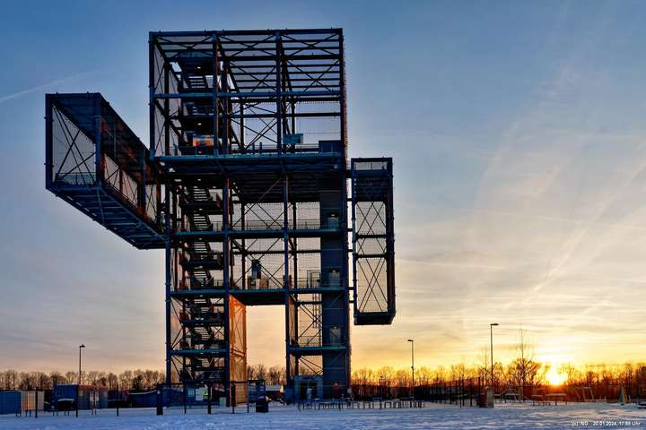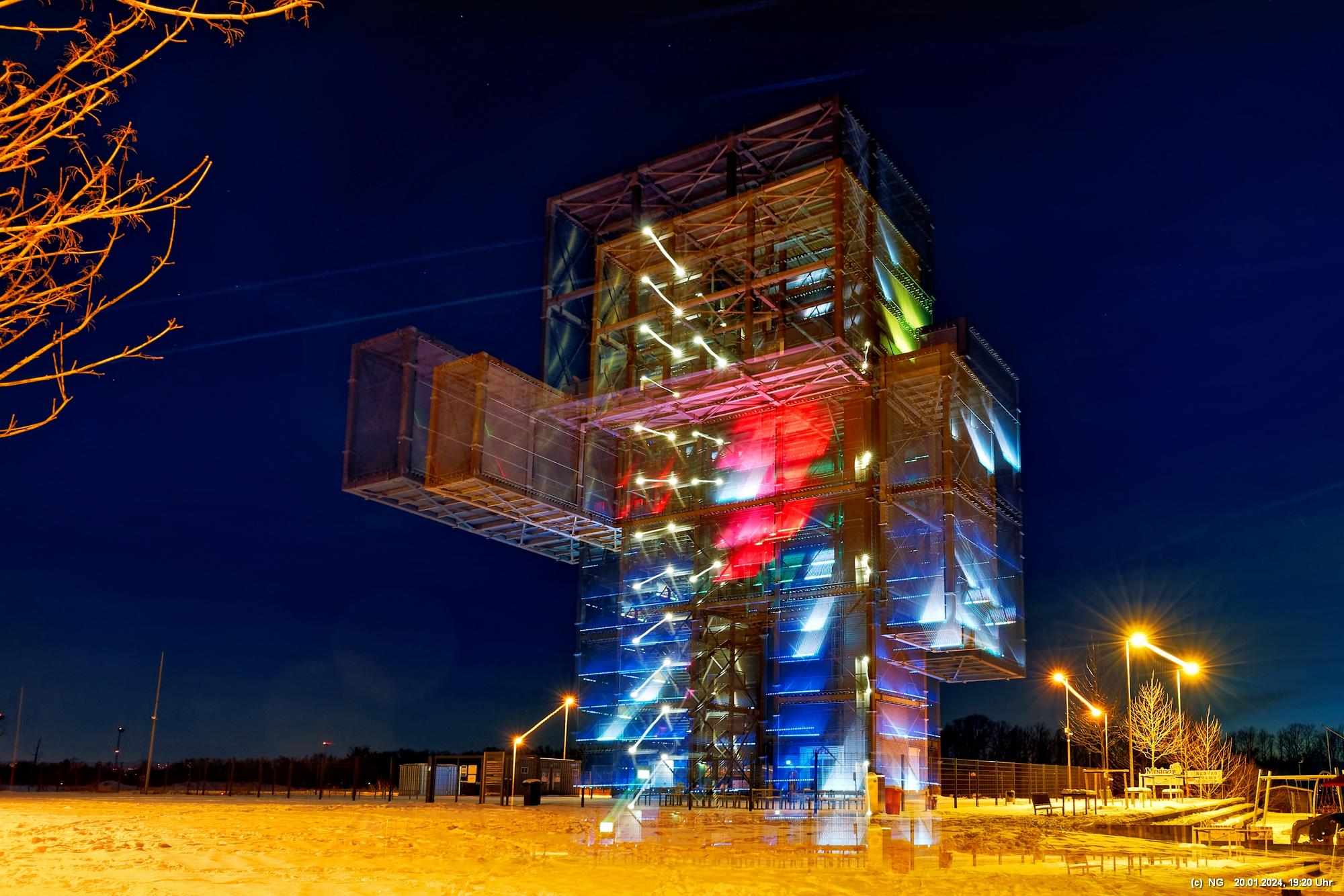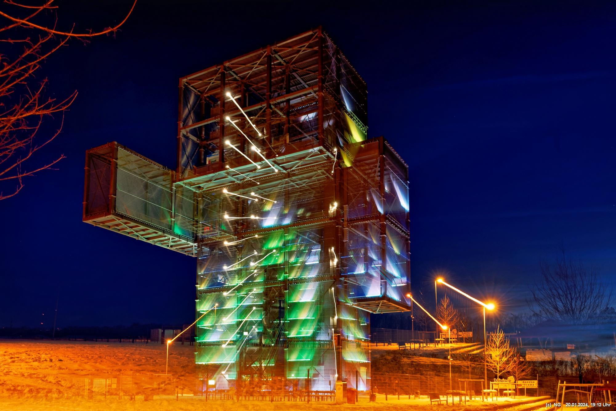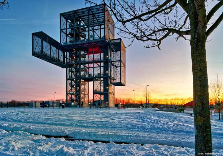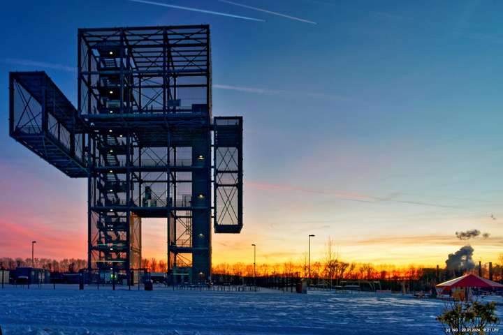 Der Indemann ist das 36 m hohe architektonische Wahrzeichen des Indelandes. Er ist durch seine Größe und seinen Standort, hoch auf einer Kuppe, ein weithin sichtbares Symbol. Man könnte glauben, sein Arm zeigt mahnend in Richtung des Tagebaus (die Richtung stimmt auch). Seine moderne Architektur steht für die technische Zukunft der Region. Die Konstruktion beeindruckt und wird nachts durch 40.000 LED’s illuminiert. Anschließend noch ein kleiner Abstecher zum Tagebau Inden und dort schon gegen 19 Uhr die gefrorenen Finger erlebt.
