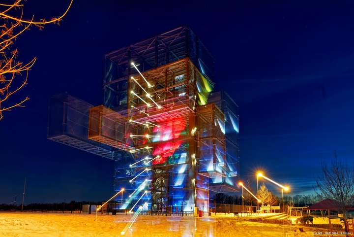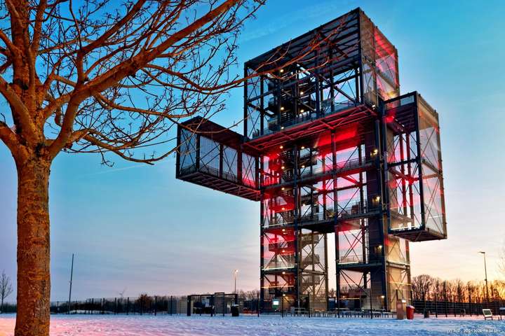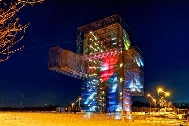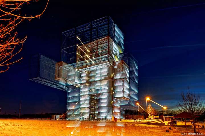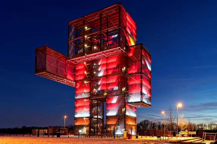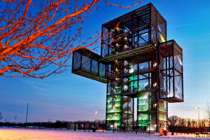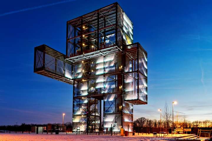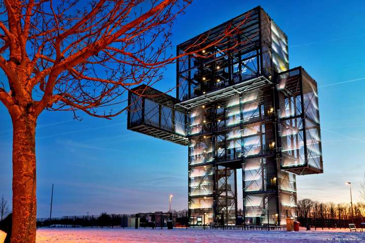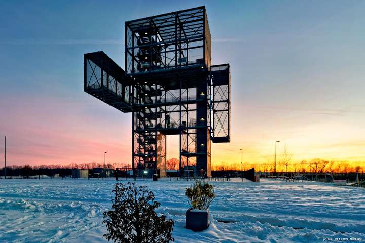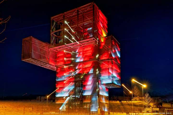 Der Indemann ist das 36 m hohe architektonische Wahrzeichen des Indelandes. Er ist durch seine Größe und seinen Standort, hoch auf einer Kuppe, ein weithin sichtbares Symbol. Man könnte glauben, sein Arm zeigt mahnend in Richtung des Tagebaus (die Richtung stimmt auch). Seine moderne Architektur steht für die technische Zukunft der Region. Die Konstruktion beeindruckt und wird nachts durch 40.000 LED’s illuminiert. Anschließend noch ein kleiner Abstecher zum Tagebau Inden und dort schon gegen 19 Uhr die gefrorenen Finger erlebt.