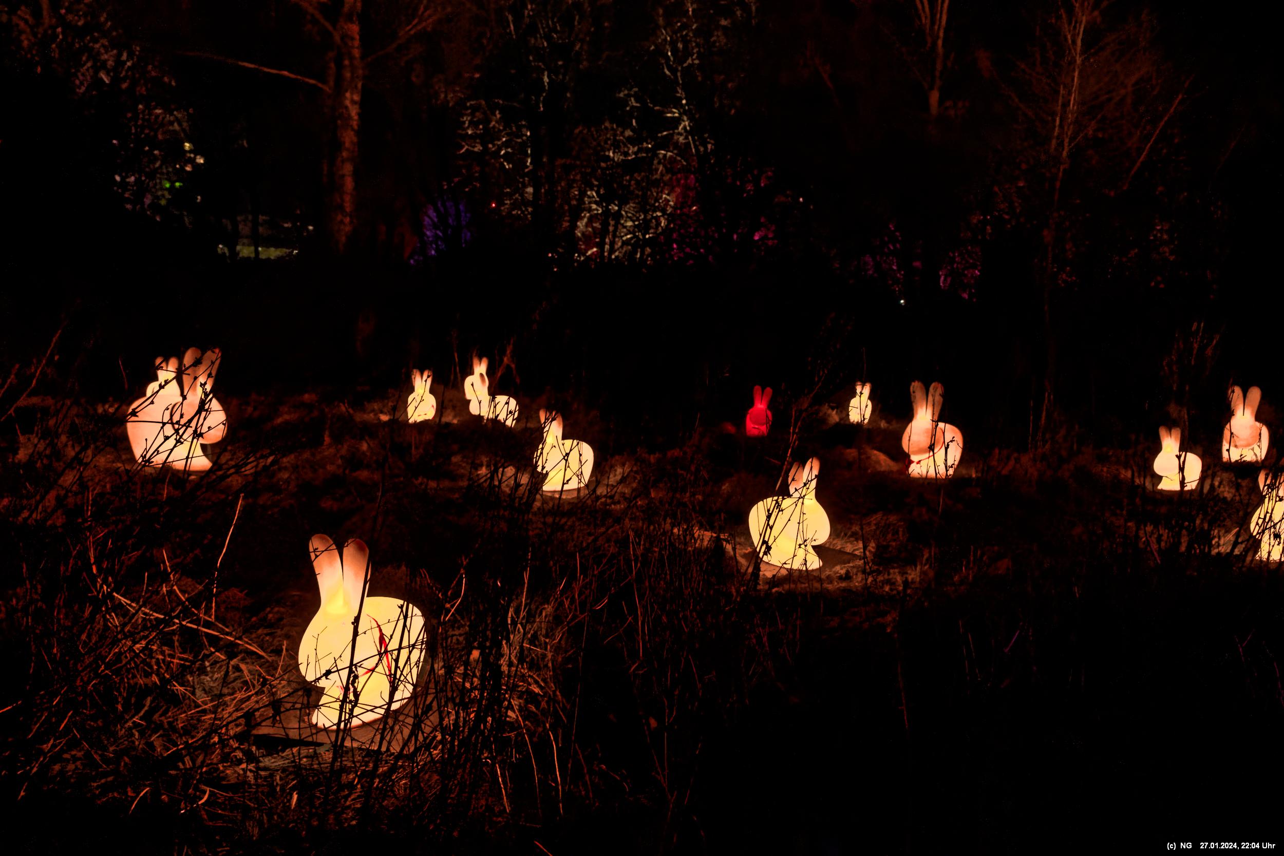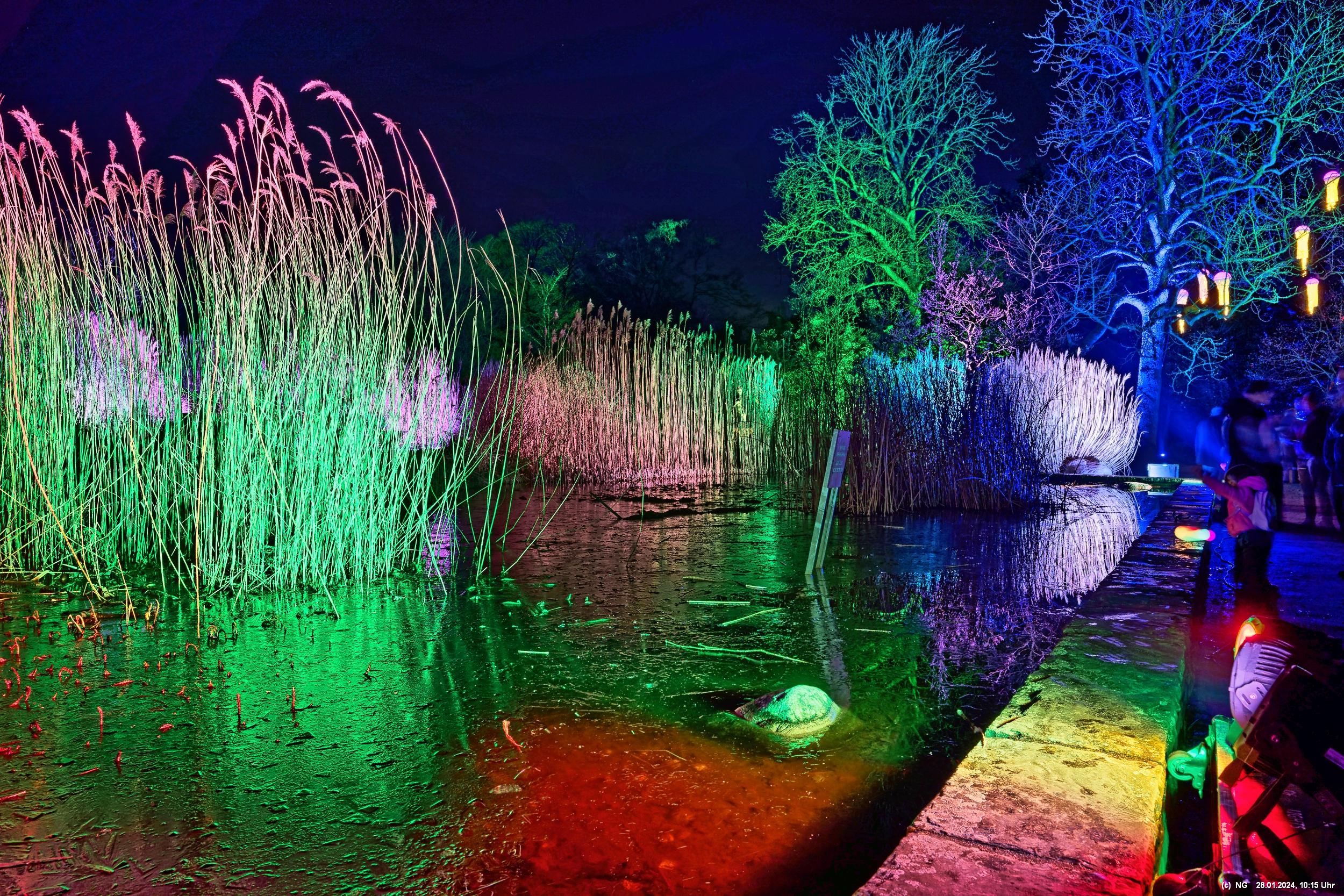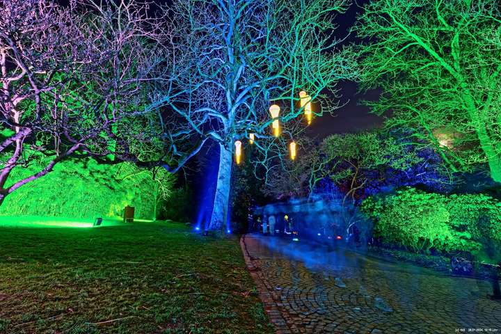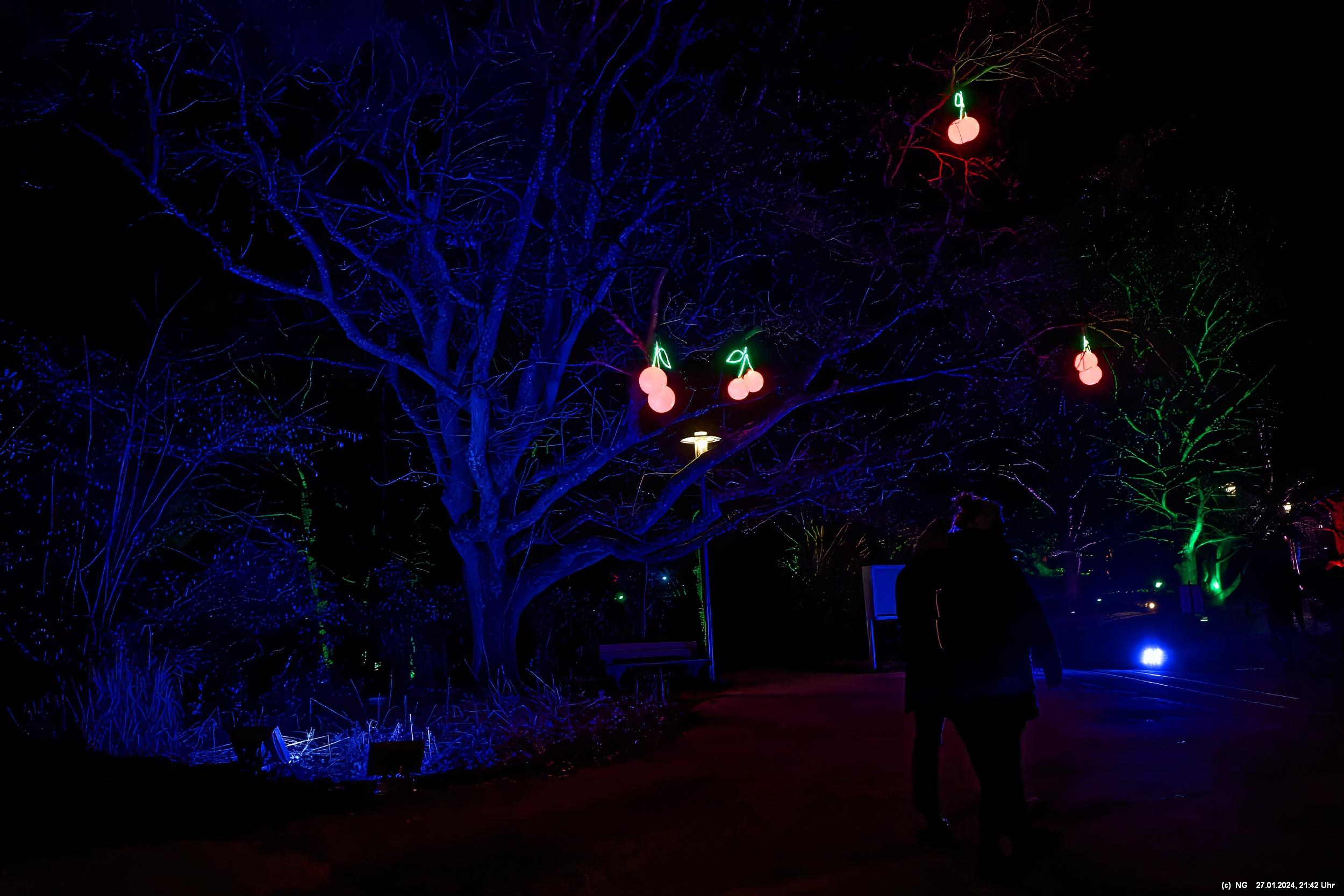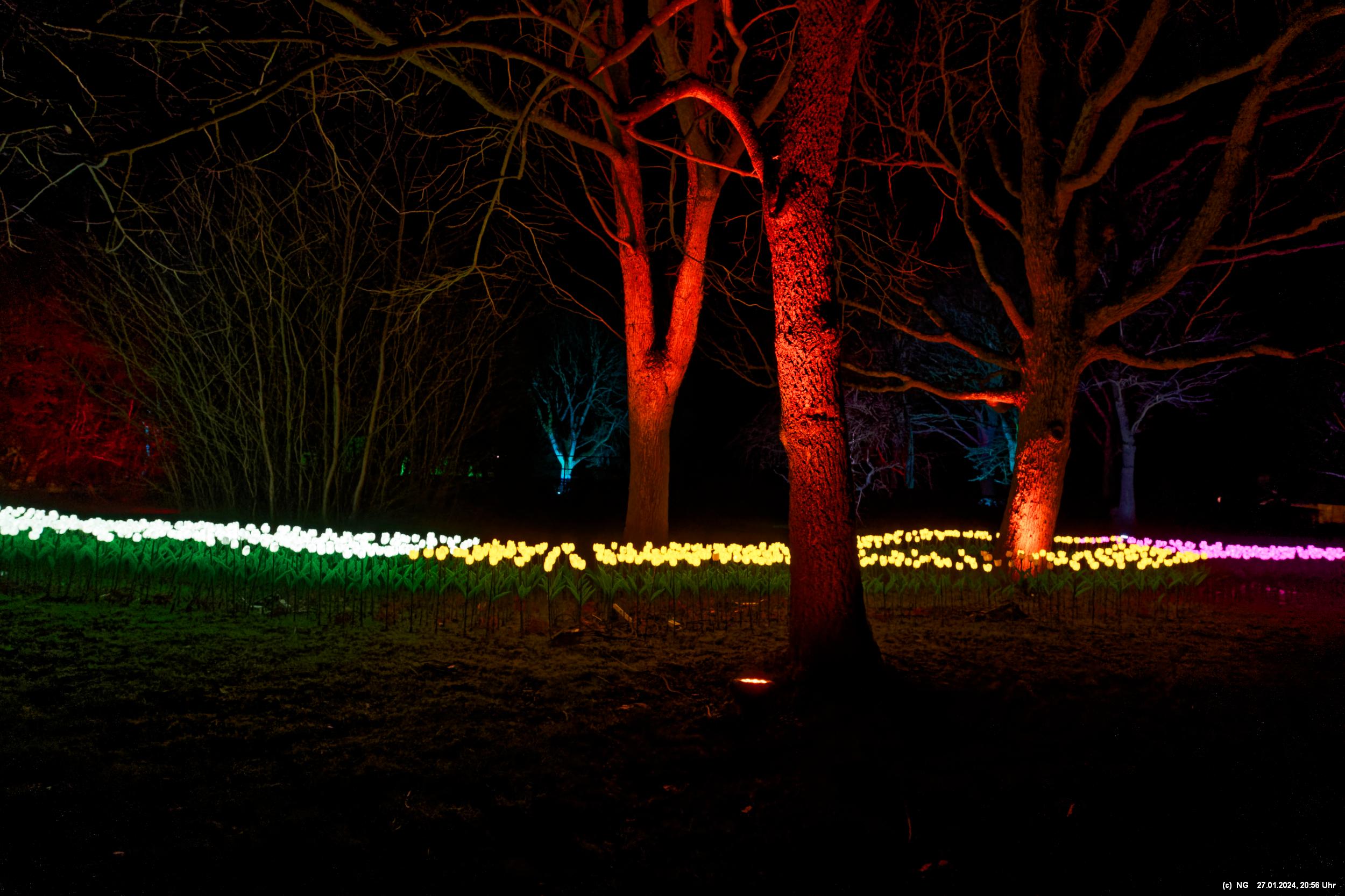 Es ging für gut 3 Stunden und 4,5 km lang dorthin. Wolfgang Flammersfeld und Reinhard Hartleif (world of lights, Unna) haben zum 14. Mal diese Lichtinstallation durchgeführt. Das Wetter spielte mit – und so haben wir uns auf den längeren Weg durch den Park gemacht. Vorher mussten wir noch einen weiten Weg vom vom sehr entfernten und teuren Parkplatz laufen - es war rappelvoll und besonders viele Kinder war dort. In diesem Jahr schien uns, als hätten die Leute um Wolfgang Flammersfeld wieder mal keine besondere Lust (oder Können?) zur Lichtgestaltung gehabt. Es gab kaum Highlights, sondern viele Wiederholungen und oftmals nur aufgestellte Lampen - das hat mit Kunst nicht wirklich etwas zu tun. Es ist trotzdem immer wieder schön und romantisch, durch den beleuchteten Park zu schlendern und die Lichter und Figuren auf sich einwirken zu lassen.