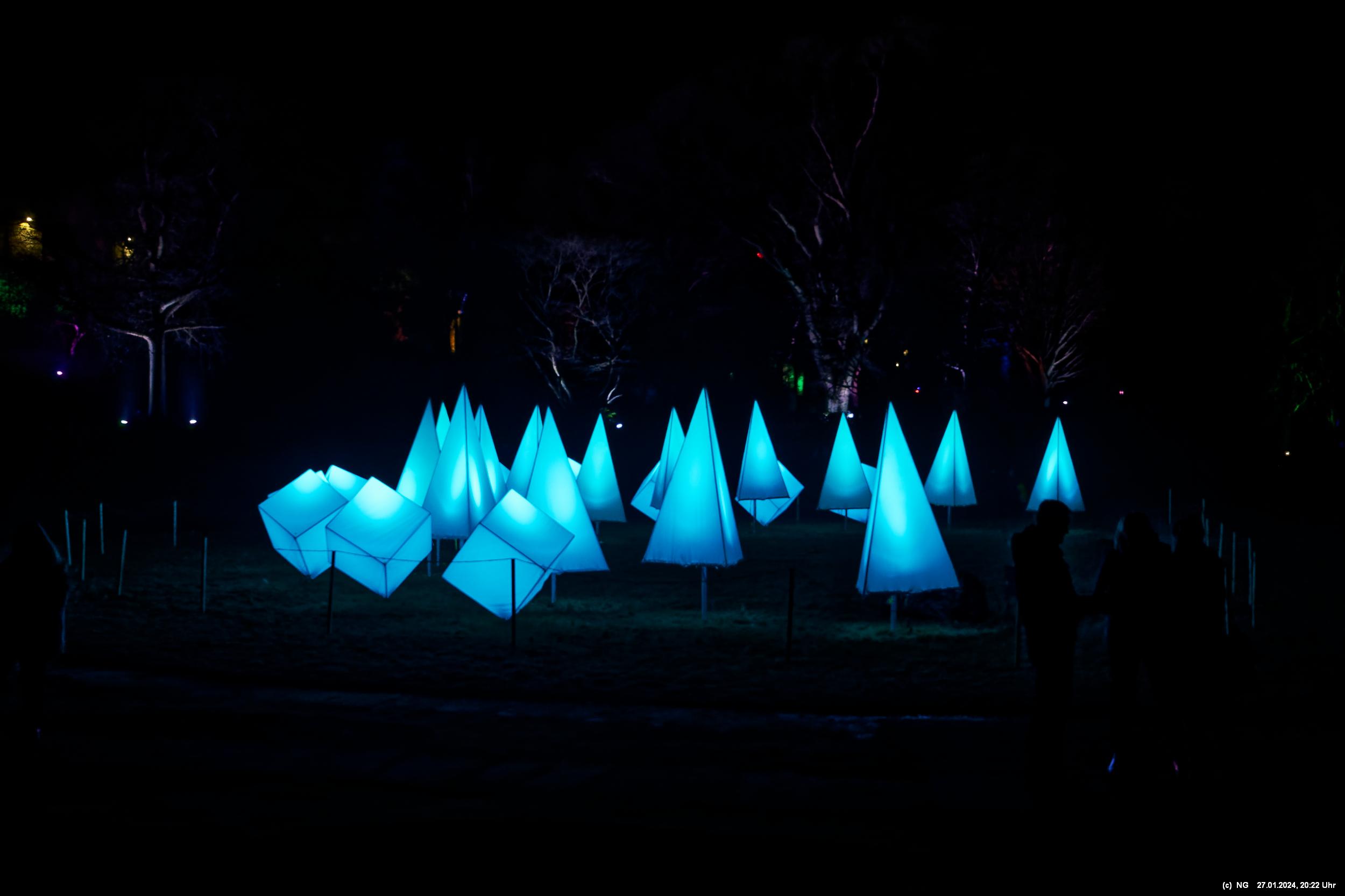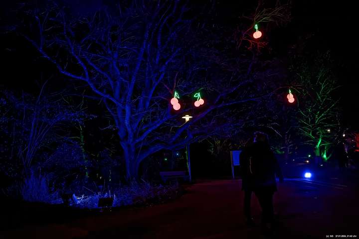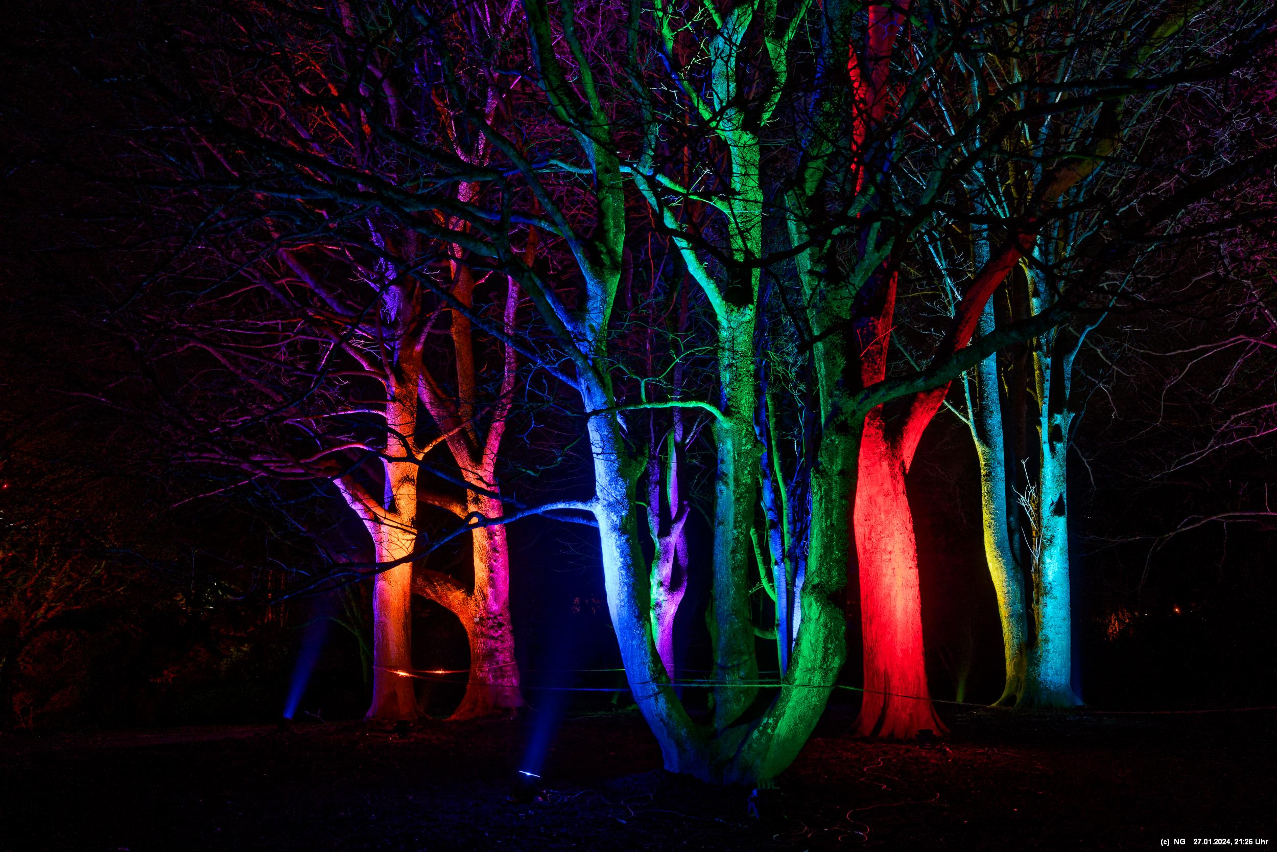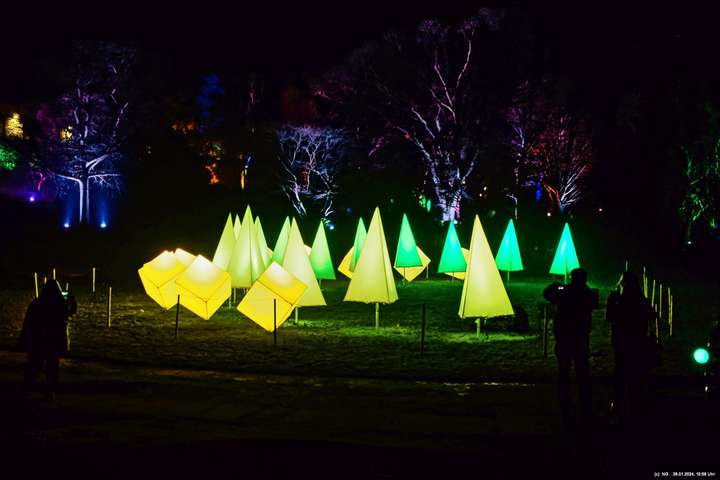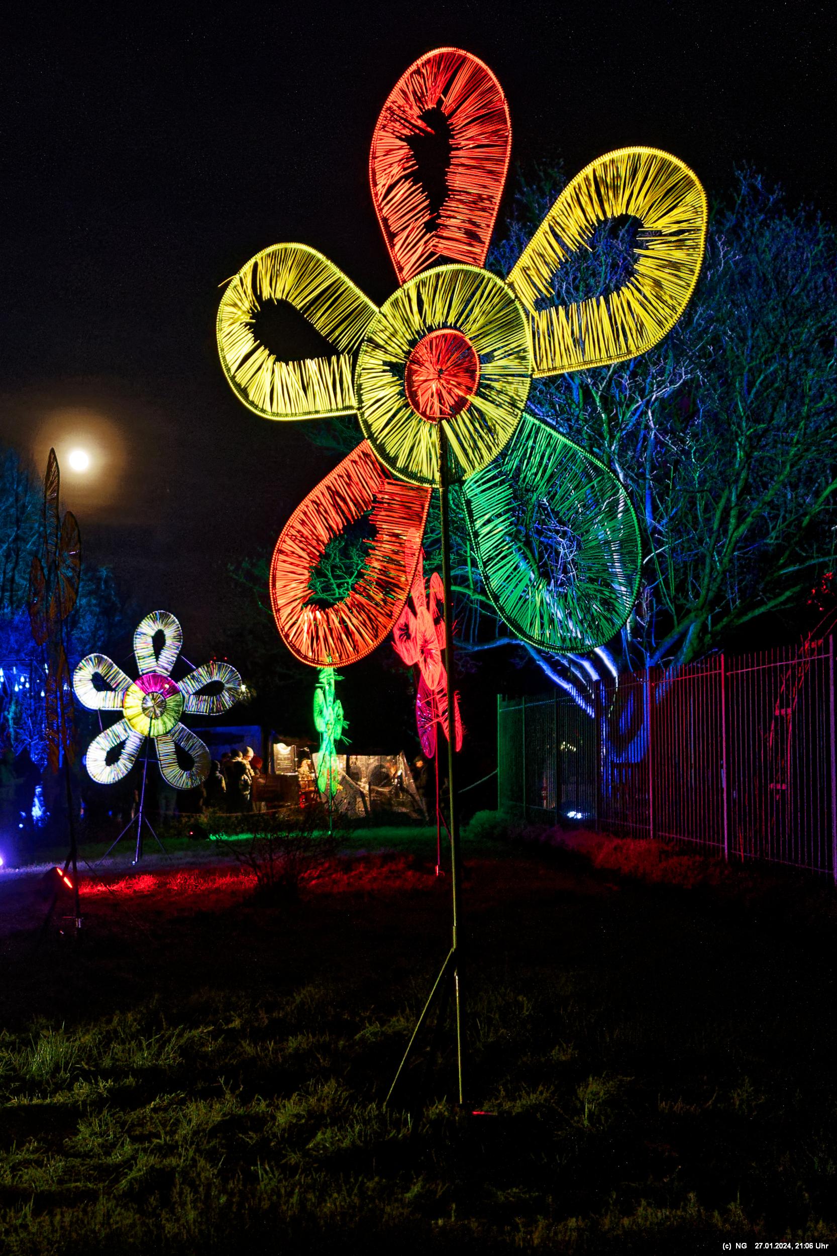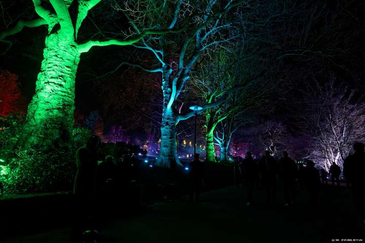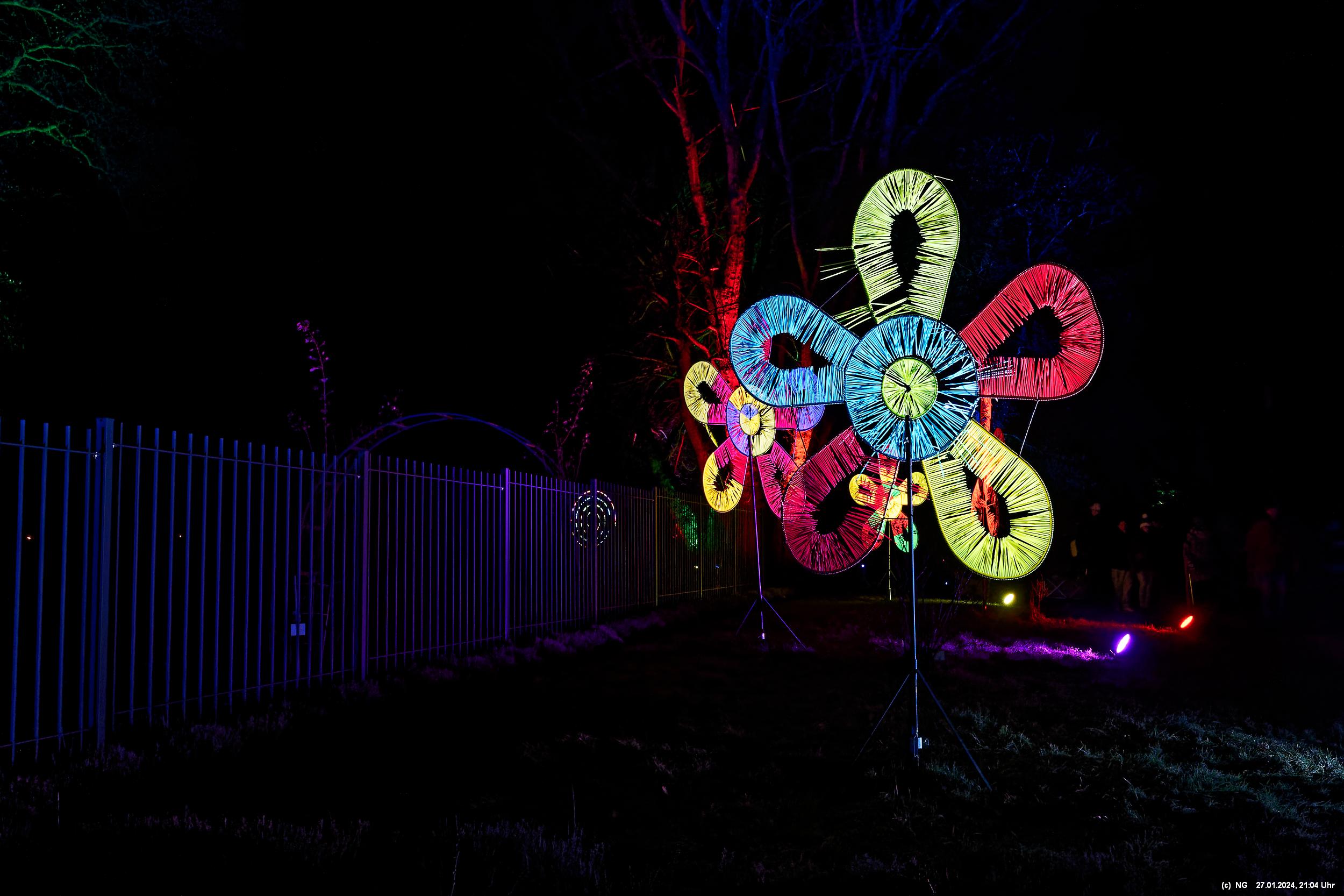 Es ging für gut 3 Stunden und 4,5 km lang dorthin. Wolfgang Flammersfeld und Reinhard Hartleif (world of lights, Unna) haben zum 14. Mal diese Lichtinstallation durchgeführt. Das Wetter spielte mit – und so haben wir uns auf den längeren Weg durch den Park gemacht. Vorher mussten wir noch einen weiten Weg vom vom sehr entfernten und teuren Parkplatz laufen - es war rappelvoll und besonders viele Kinder war dort. In diesem Jahr schien uns, als hätten die Leute um Wolfgang Flammersfeld wieder mal keine besondere Lust (oder Können?) zur Lichtgestaltung gehabt. Es gab kaum Highlights, sondern viele Wiederholungen und oftmals nur aufgestellte Lampen - das hat mit Kunst nicht wirklich etwas zu tun. Es ist trotzdem immer wieder schön und romantisch, durch den beleuchteten Park zu schlendern und die Lichter und Figuren auf sich einwirken zu lassen.