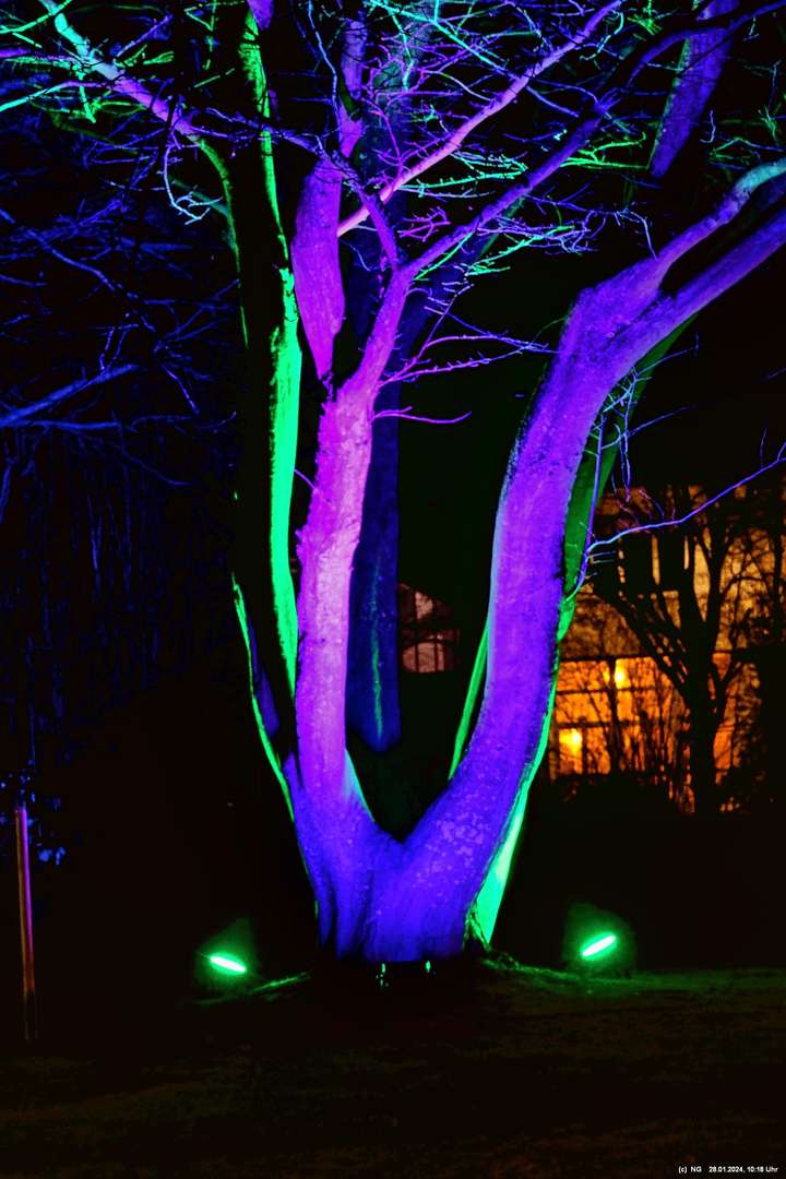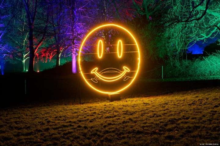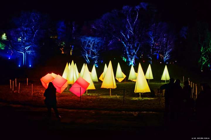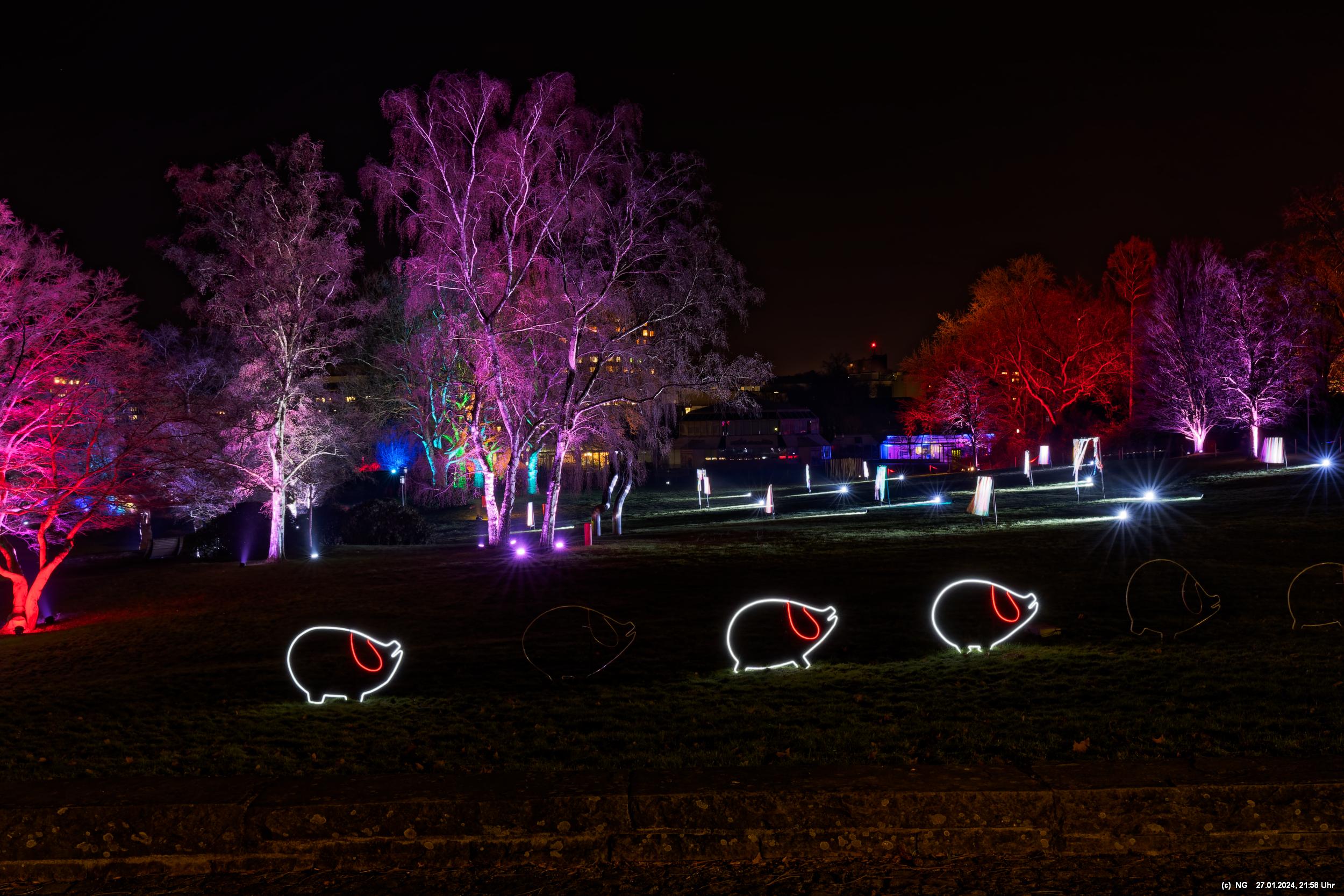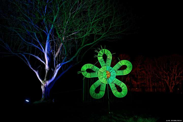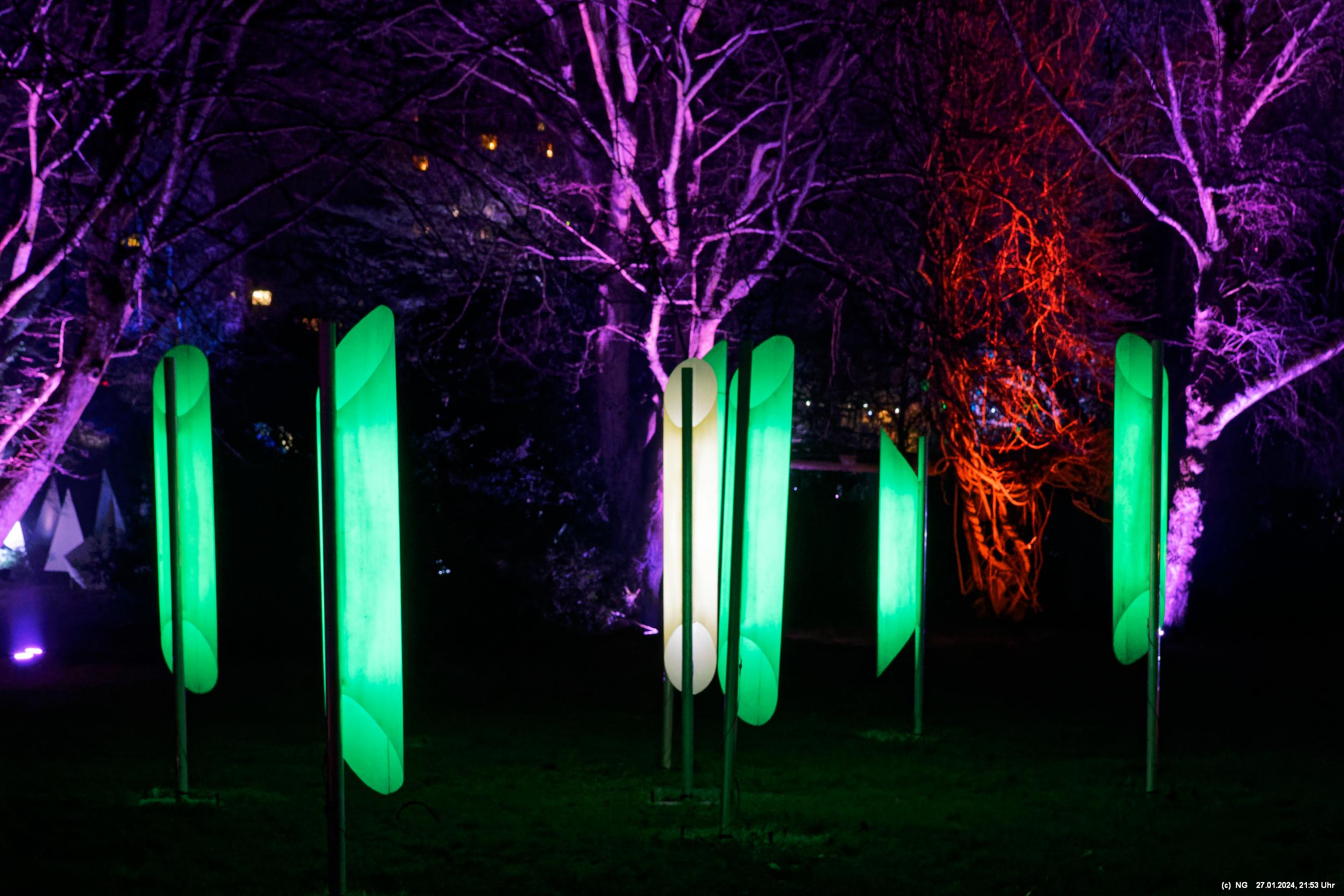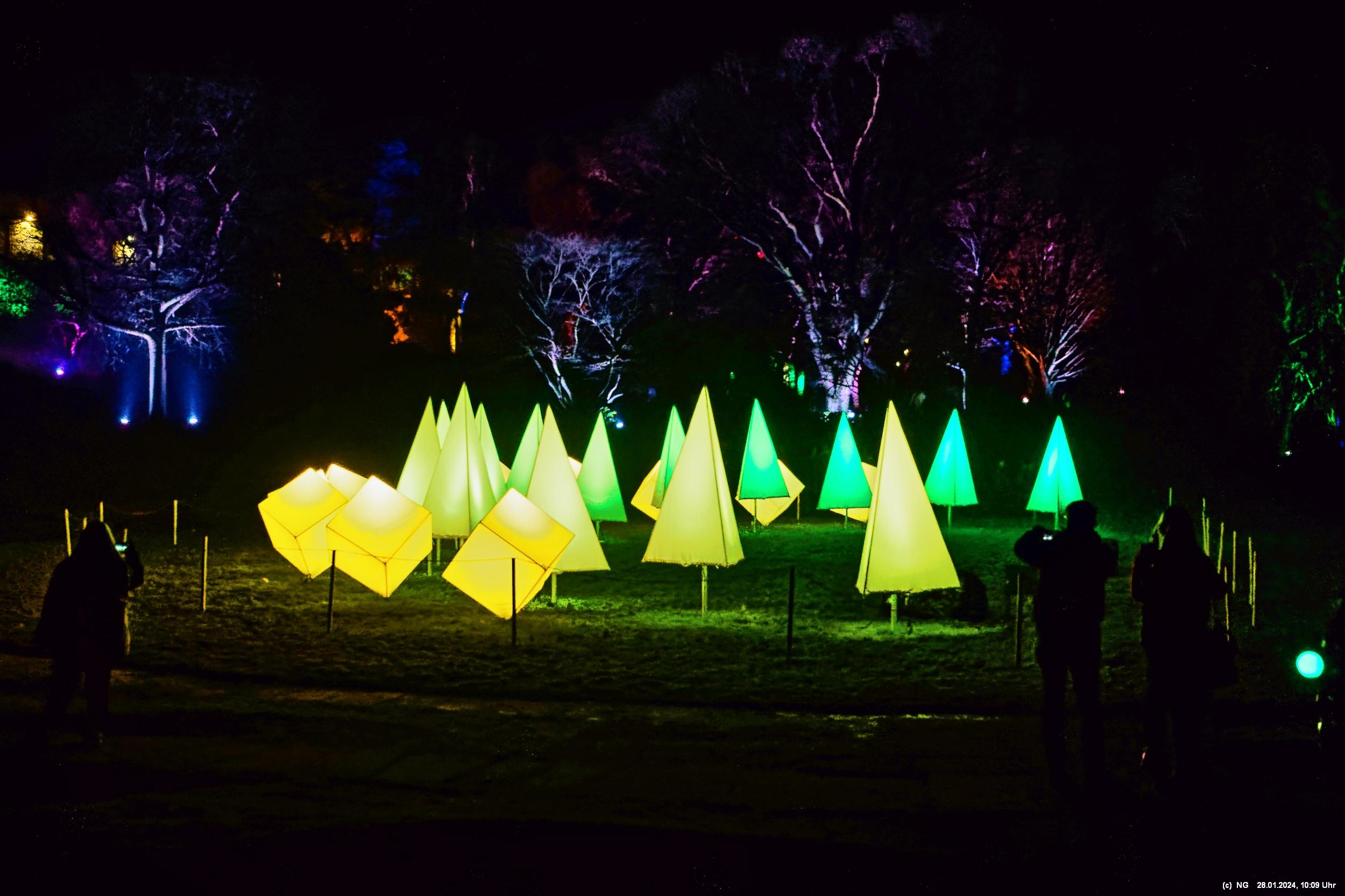 Es ging für gut 3 Stunden und 4,5 km lang dorthin. Wolfgang Flammersfeld und Reinhard Hartleif (world of lights, Unna) haben zum 14. Mal diese Lichtinstallation durchgeführt. Das Wetter spielte mit – und so haben wir uns auf den längeren Weg durch den Park gemacht. Vorher mussten wir noch einen weiten Weg vom vom sehr entfernten und teuren Parkplatz laufen - es war rappelvoll und besonders viele Kinder war dort. In diesem Jahr schien uns, als hätten die Leute um Wolfgang Flammersfeld wieder mal keine besondere Lust (oder Können?) zur Lichtgestaltung gehabt. Es gab kaum Highlights, sondern viele Wiederholungen und oftmals nur aufgestellte Lampen - das hat mit Kunst nicht wirklich etwas zu tun. Es ist trotzdem immer wieder schön und romantisch, durch den beleuchteten Park zu schlendern und die Lichter und Figuren auf sich einwirken zu lassen.