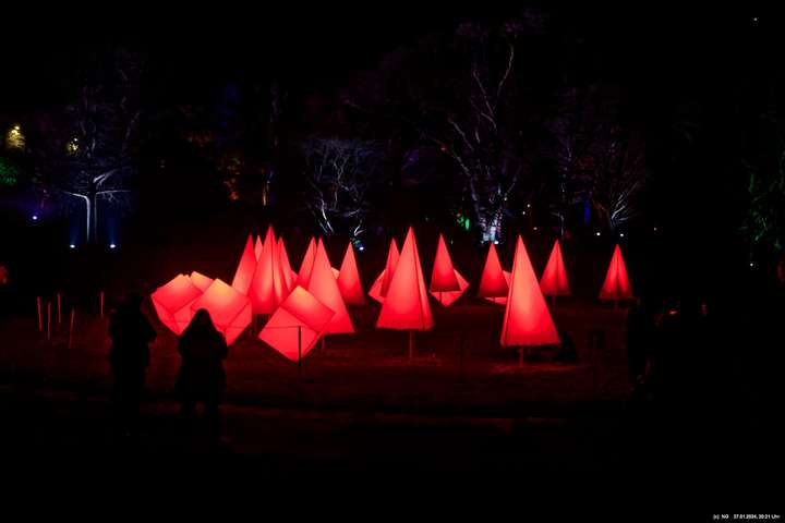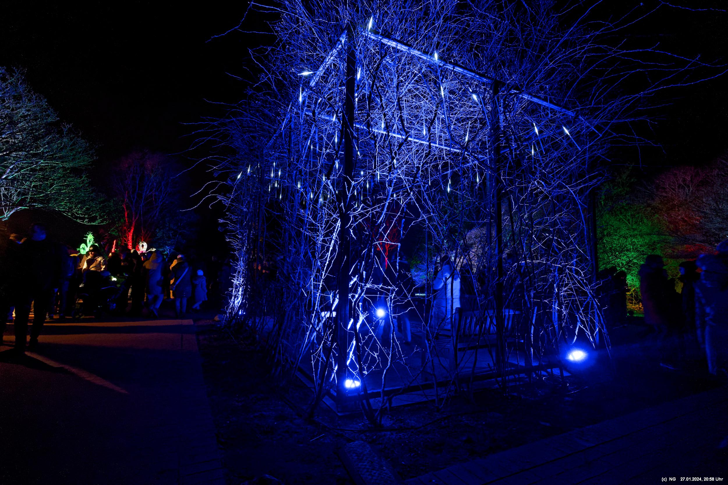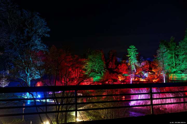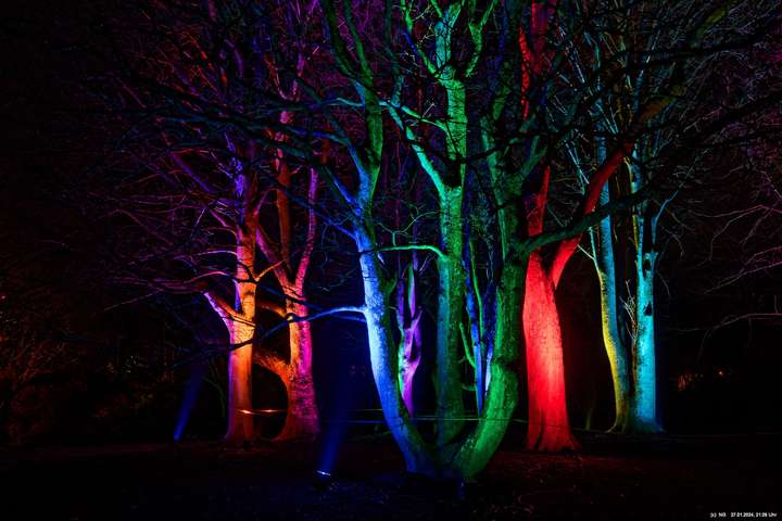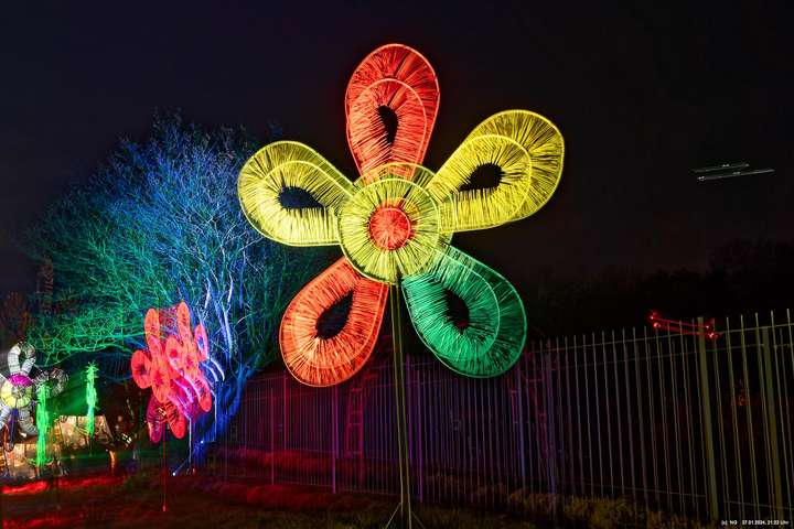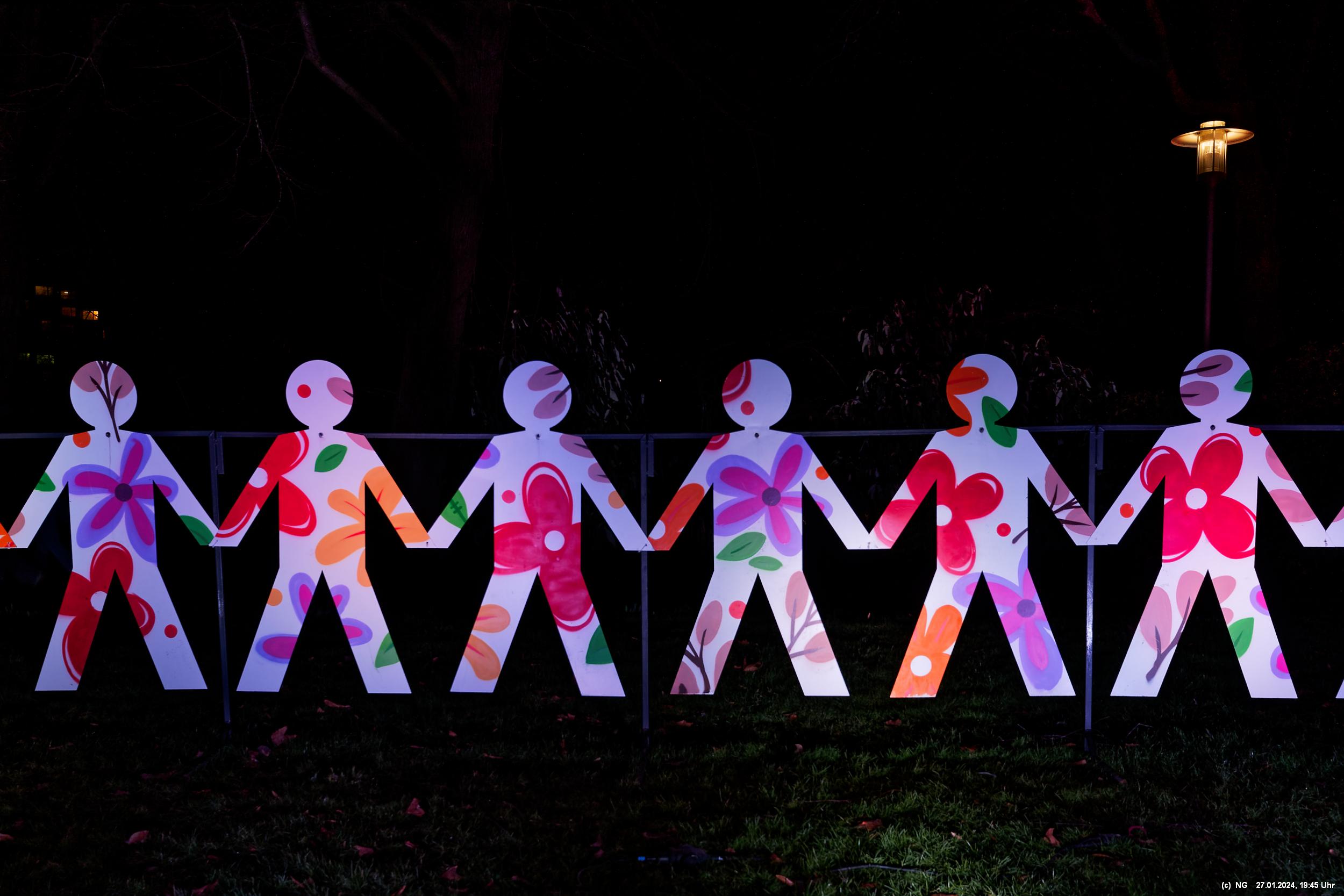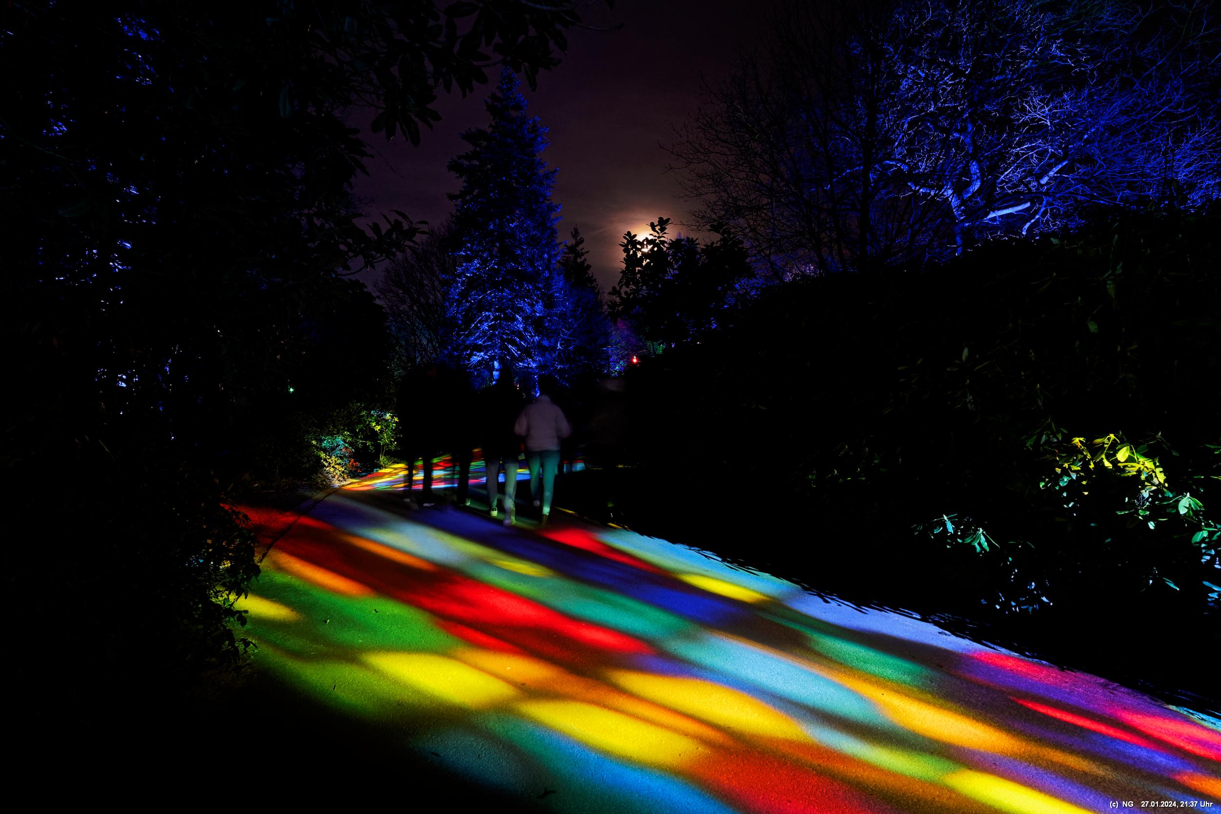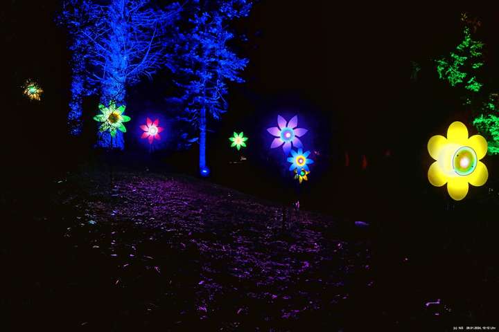 Es ging für gut 3 Stunden und 4,5 km lang dorthin. Wolfgang Flammersfeld und Reinhard Hartleif (world of lights, Unna) haben zum 14. Mal diese Lichtinstallation durchgeführt. Das Wetter spielte mit – und so haben wir uns auf den längeren Weg durch den Park gemacht. Vorher mussten wir noch einen weiten Weg vom vom sehr entfernten und teuren Parkplatz laufen - es war rappelvoll und besonders viele Kinder war dort. In diesem Jahr schien uns, als hätten die Leute um Wolfgang Flammersfeld wieder mal keine besondere Lust (oder Können?) zur Lichtgestaltung gehabt. Es gab kaum Highlights, sondern viele Wiederholungen und oftmals nur aufgestellte Lampen - das hat mit Kunst nicht wirklich etwas zu tun. Es ist trotzdem immer wieder schön und romantisch, durch den beleuchteten Park zu schlendern und die Lichter und Figuren auf sich einwirken zu lassen.