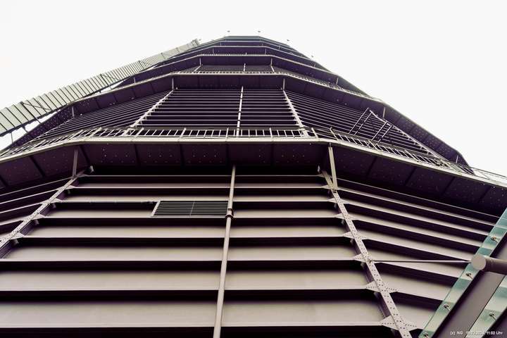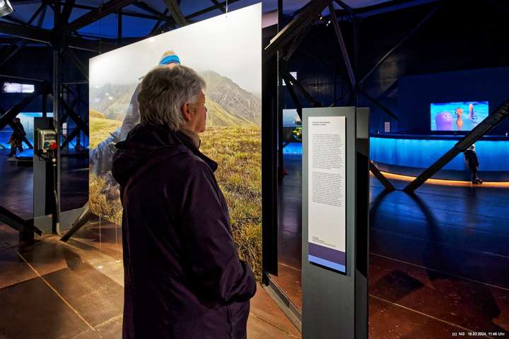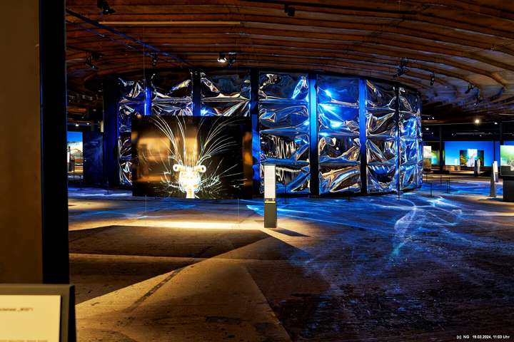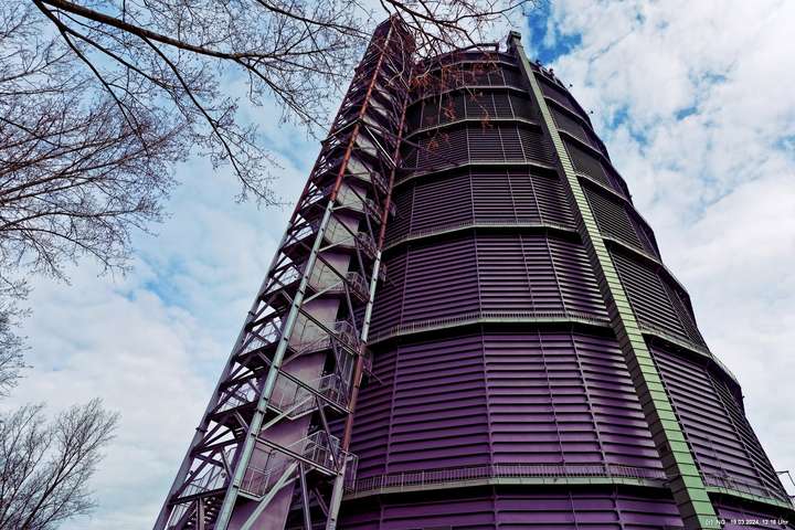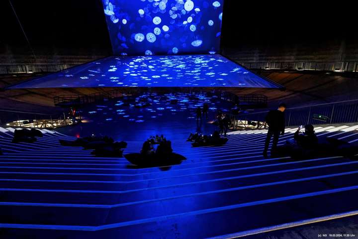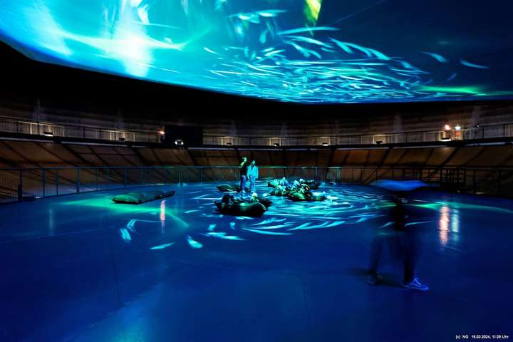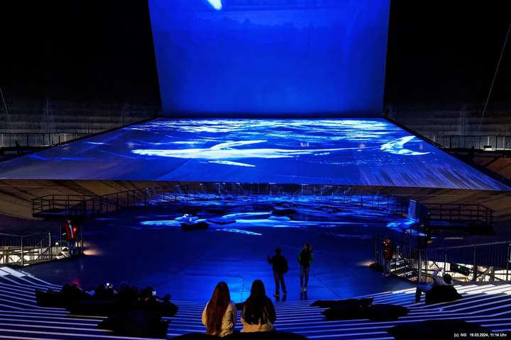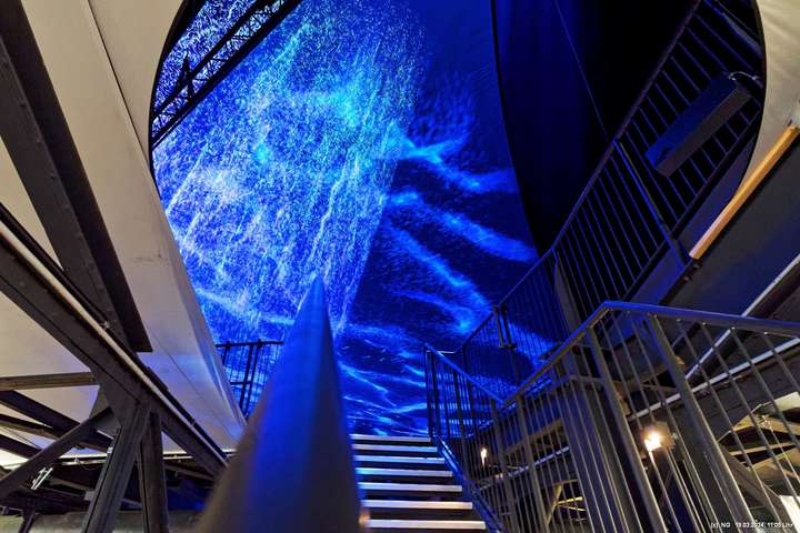 Es ist wieder gigantisch. In dem 120 m hohen, von innen völlig schwarzen Scheibengasbehälter hat man eine immersive Inszenierung installiert: