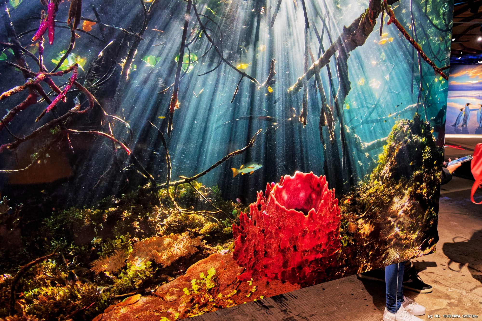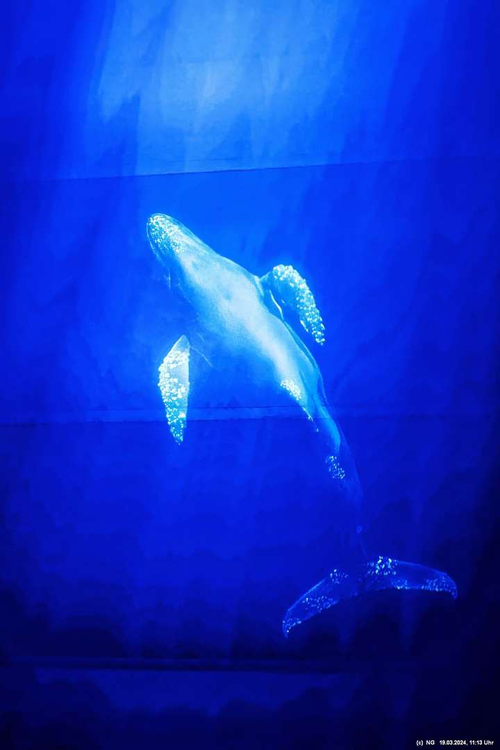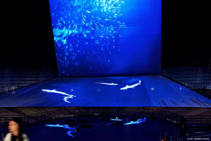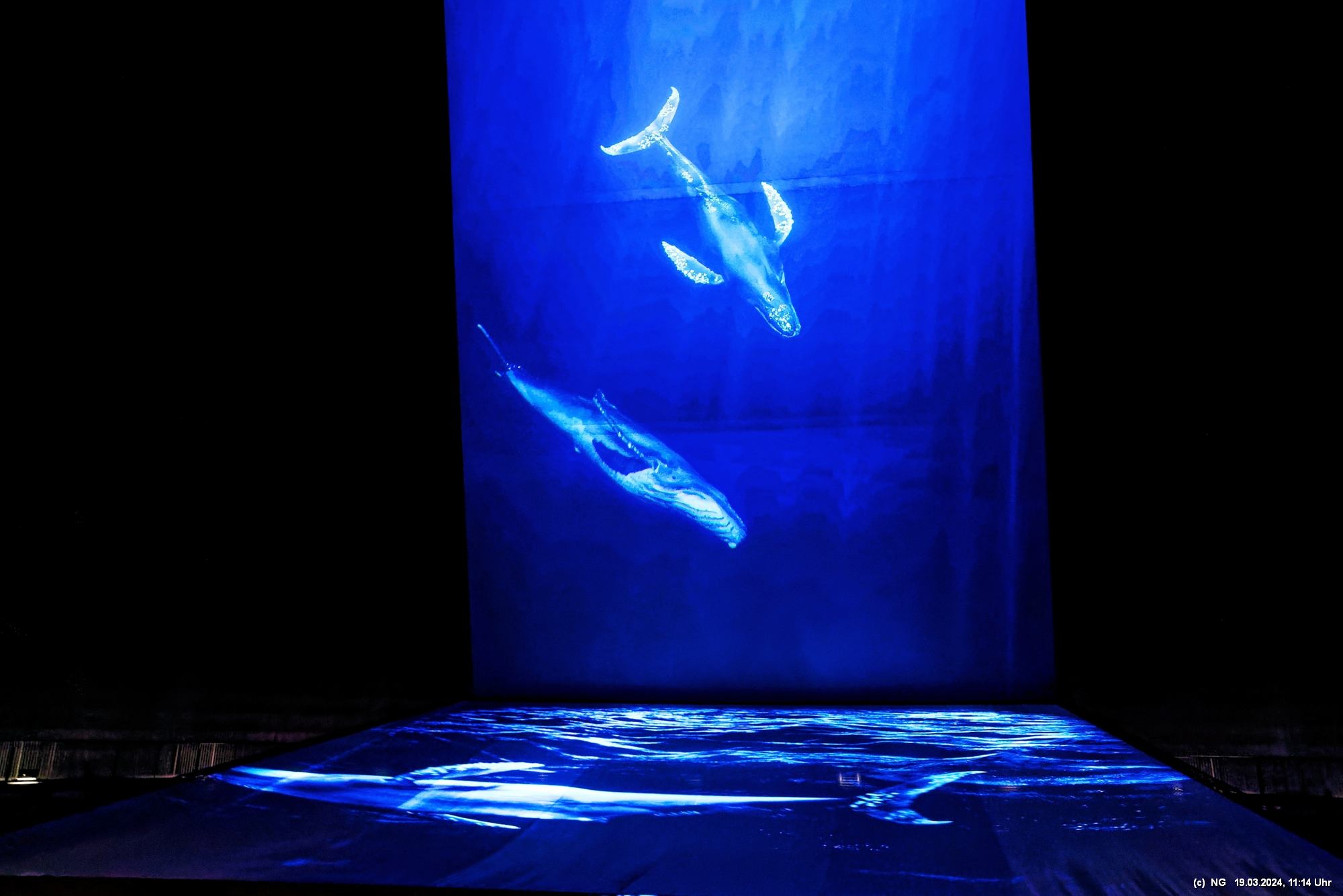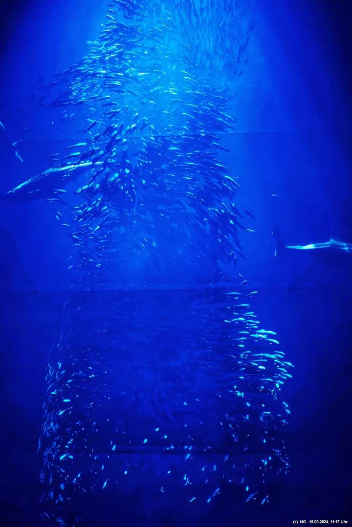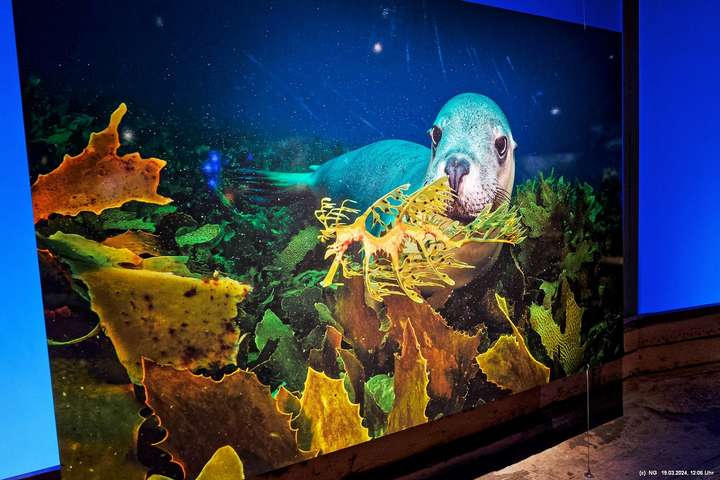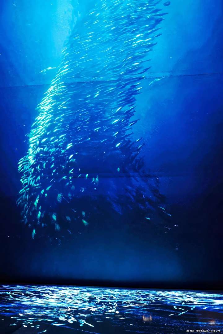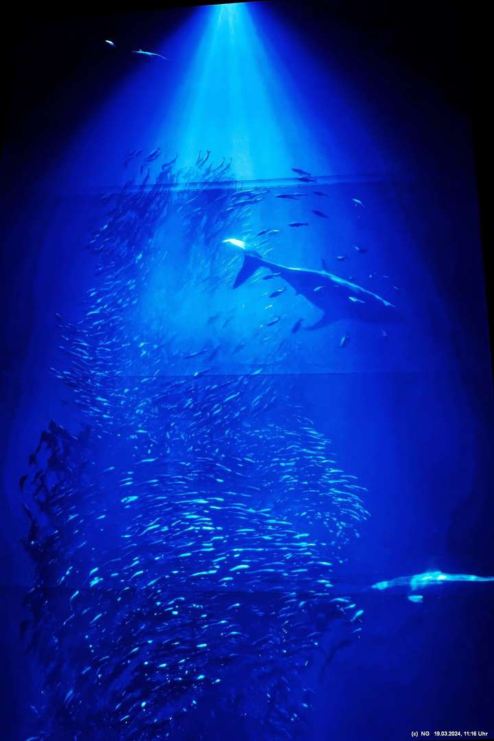 Auf einer 40 m hohen und 18 m breiten, im Luftraum frei hängenden Leinwand in L-Form, findet eine Projektion statt, die uns fast realistisch in die Unterwasserwelt des Ozeans führt. Die Show ist akustisch hinterlegt und hat uns sehr beeindruckt. Die vielen großen Fotos und Videos zeigen in höchster Qualität die schönen, aber auch die Schattenseiten des Meeres und ihrer Lebewesen, die durch Plastikmüll und Überfischung extrem gefährdet sind.