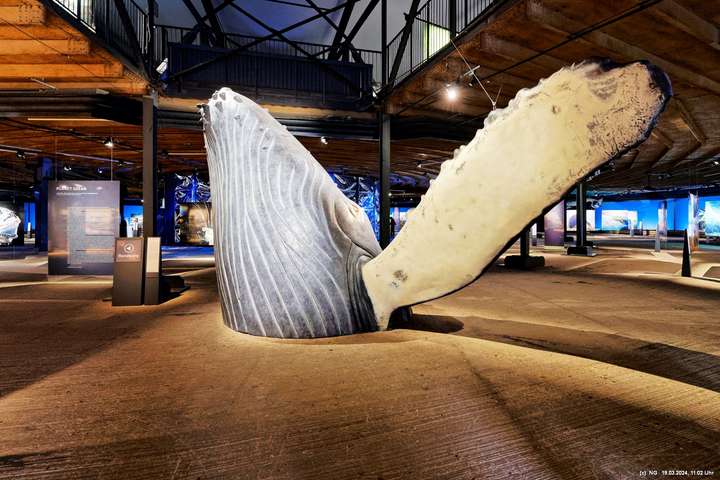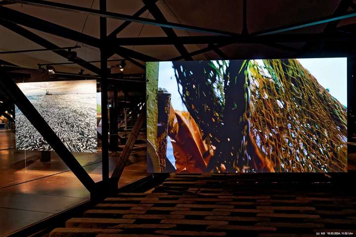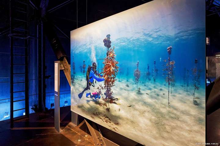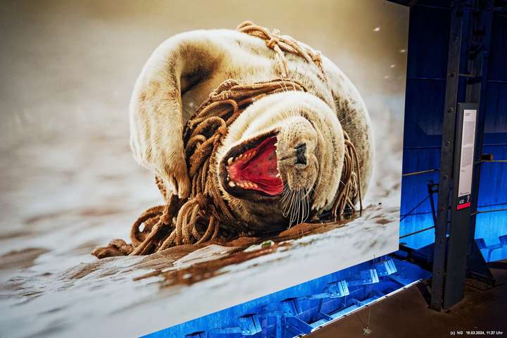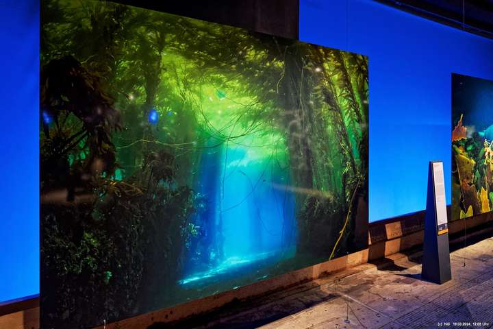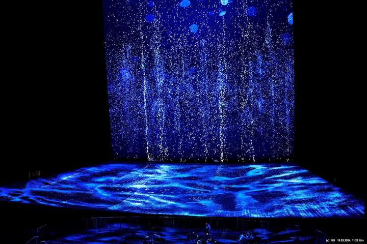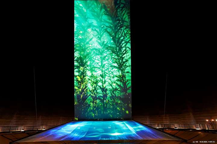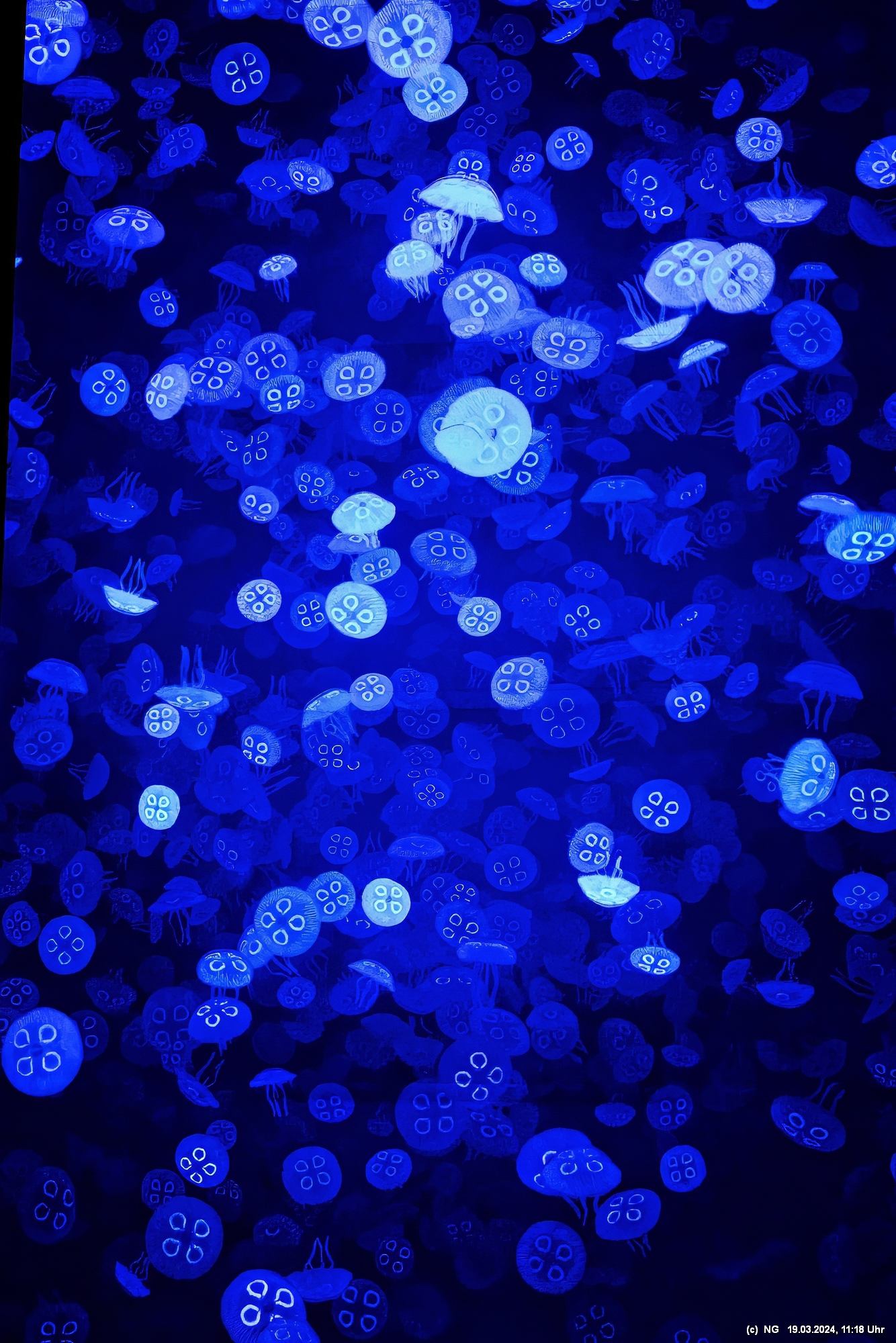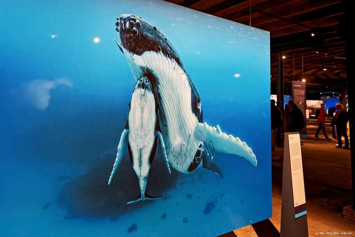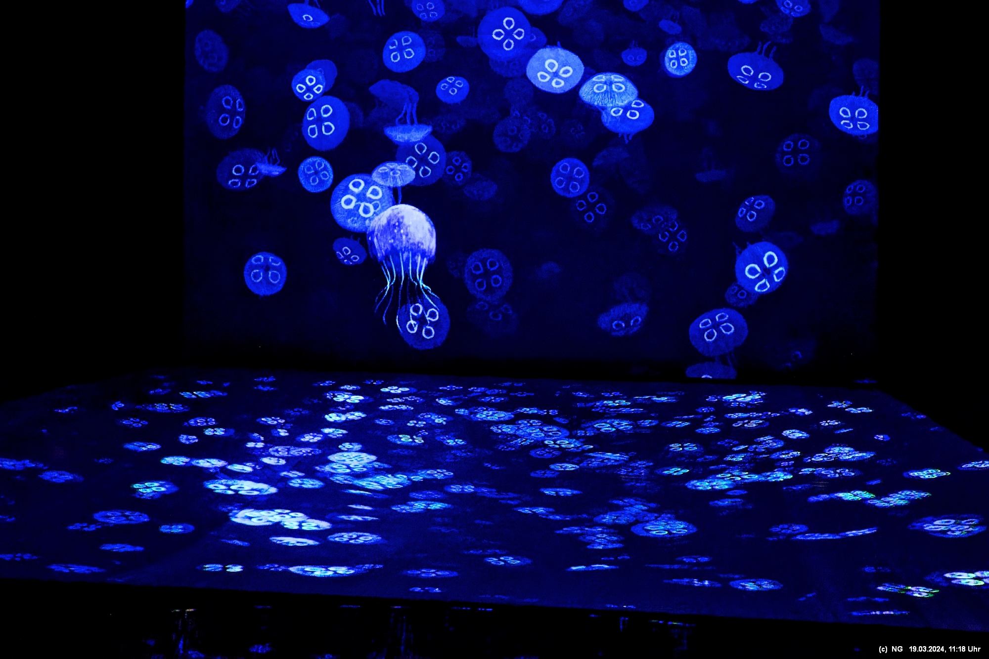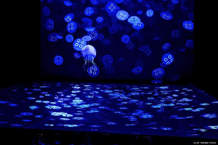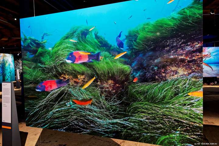 Auf einer 40 m hohen und 18 m breiten, im Luftraum frei hängenden Leinwand in L-Form, findet eine Projektion statt, die uns fast realistisch in die Unterwasserwelt des Ozeans führt. Die Show ist akustisch hinterlegt und hat uns sehr beeindruckt. Die vielen großen Fotos und Videos zeigen in höchster Qualität die schönen, aber auch die Schattenseiten des Meeres und ihrer Lebewesen, die durch Plastikmüll und Überfischung extrem gefährdet sind.