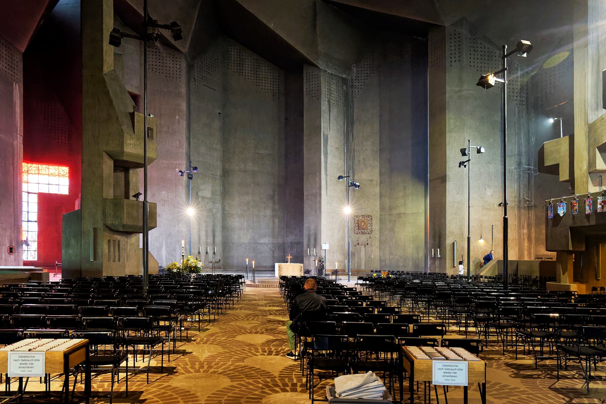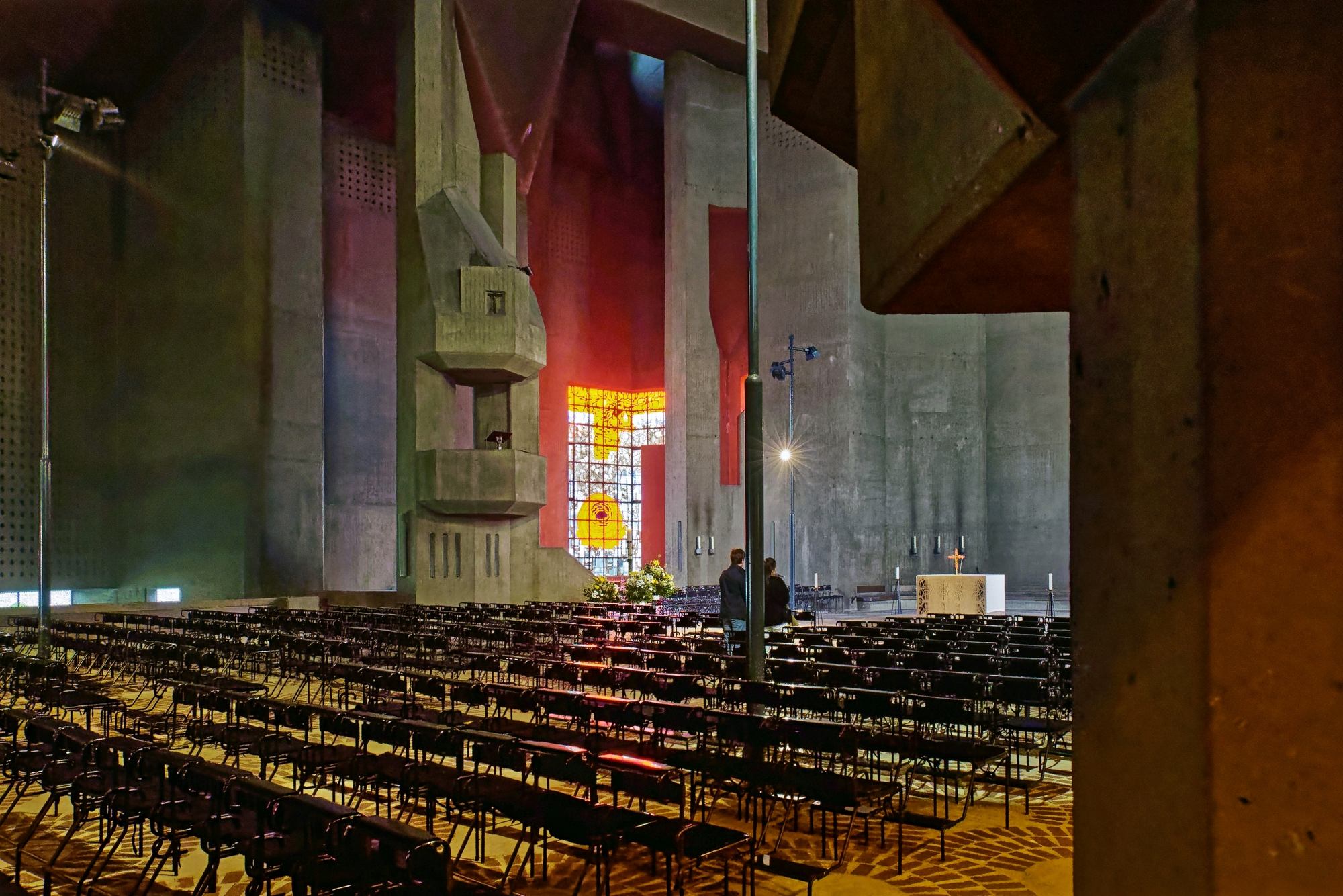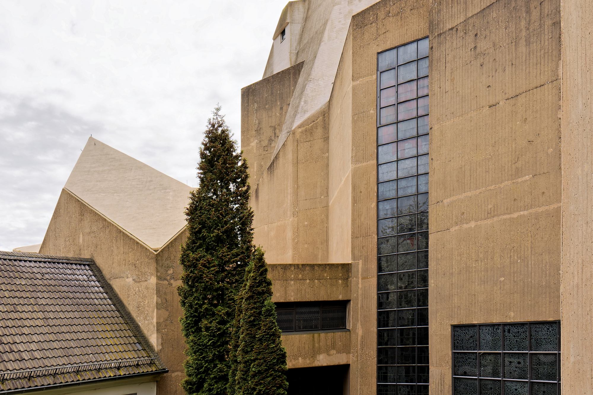 Die Konstruktion gefällt sicher nicht jedem und doch ist es ein Meisterwerk der Architektur und steht als Gesamtkunstwerk bereits unter Denkmalschutz. Der Beton zeigt die Form einer Zeltstadt und bietet innen einen Raum mit rund 3.000 Plätzen. Es ist nicht hell und so fühlt man sich auch wie in einem großen Zelt. Die Umgebung verschwindet und man beschäftigt sich nur noch mit den vielfältigen Eindrücken des herausragend gestaltenden Raums. Sehenswert sind auch die von Prof. Böhm entworfenen Fenster, besonders das berühmte Rosenfenster.
