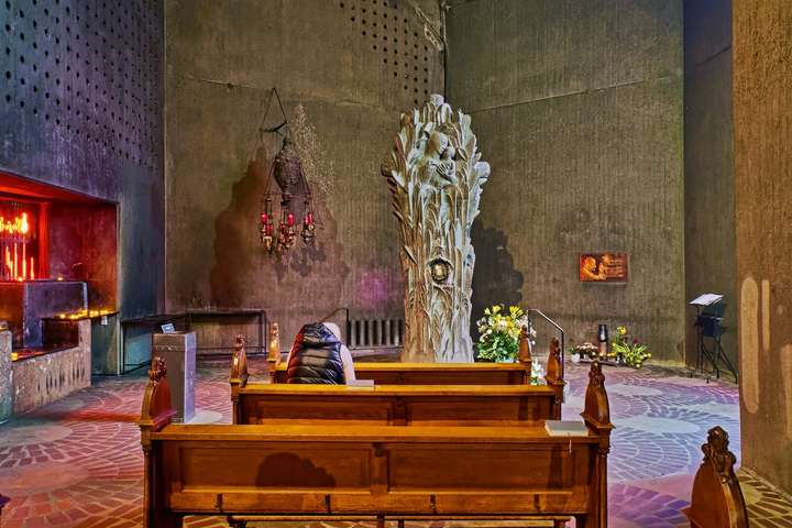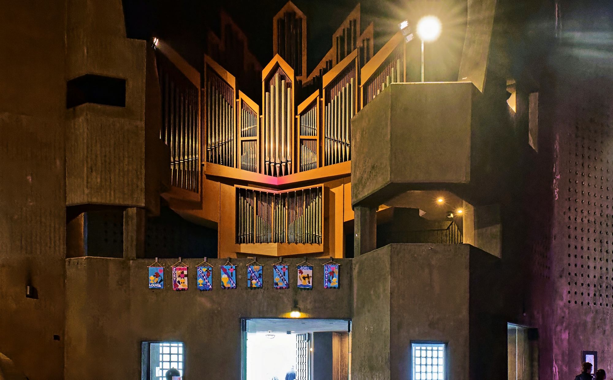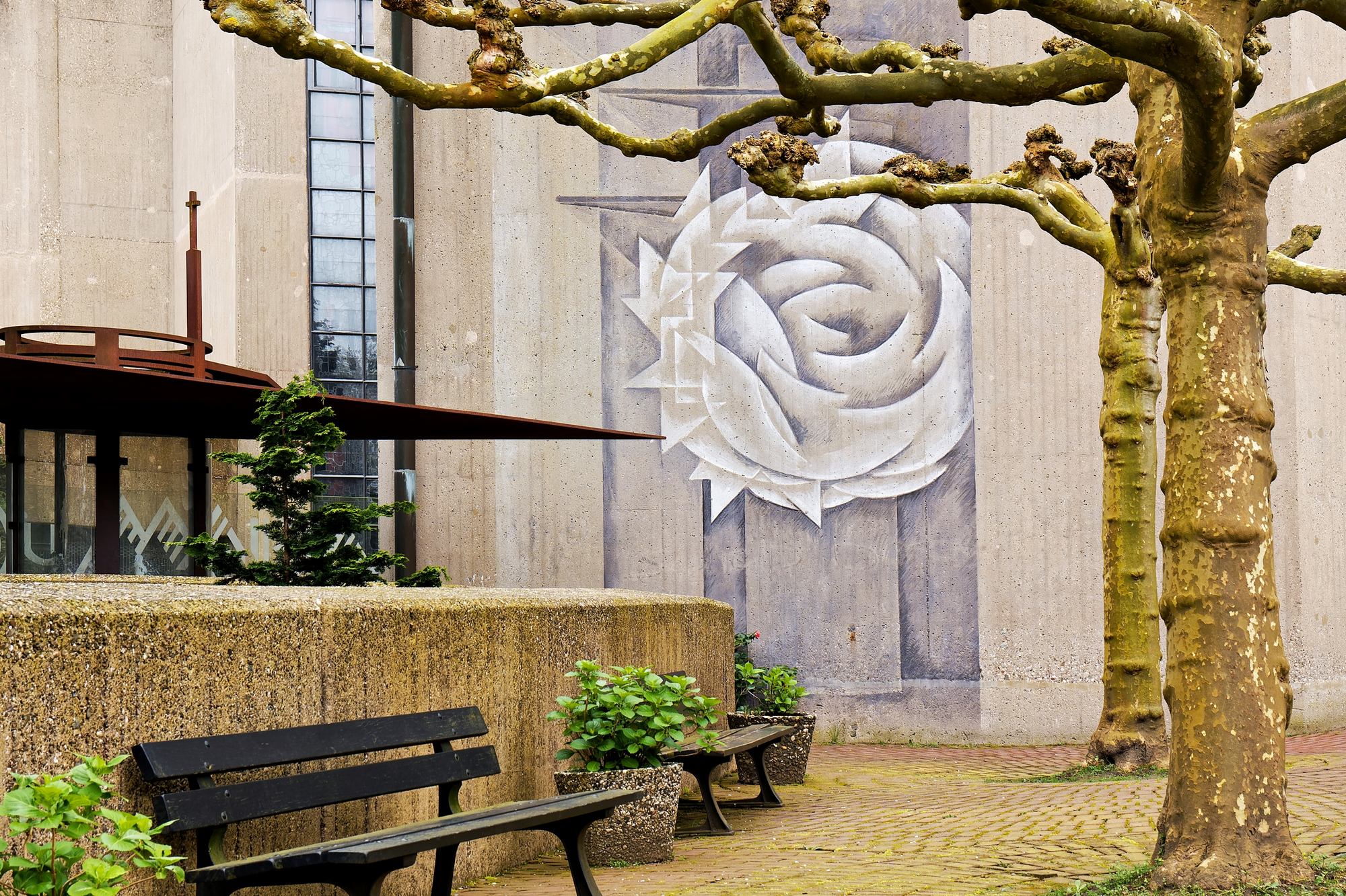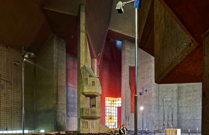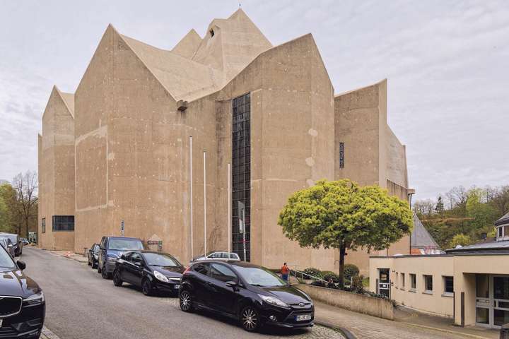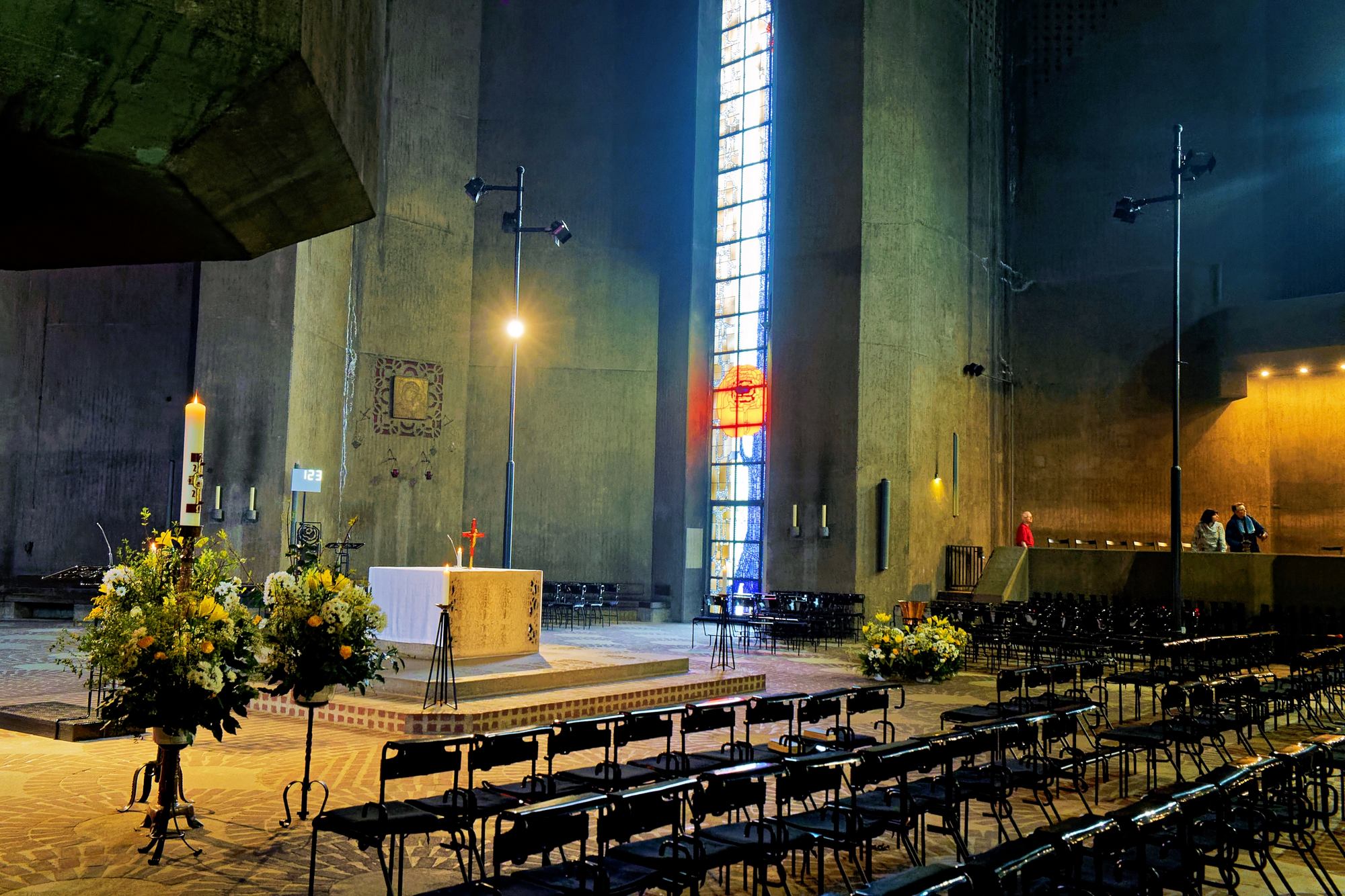 Die Konstruktion gefällt sicher nicht jedem und doch ist es ein Meisterwerk der Architektur und steht als Gesamtkunstwerk bereits unter Denkmalschutz. Der Beton zeigt die Form einer Zeltstadt und bietet innen einen Raum mit rund 3.000 Plätzen. Es ist nicht hell und so fühlt man sich auch wie in einem großen Zelt. Die Umgebung verschwindet und man beschäftigt sich nur noch mit den vielfältigen Eindrücken des herausragend gestaltenden Raums. Sehenswert sind auch die von Prof. Böhm entworfenen Fenster, besonders das berühmte Rosenfenster.