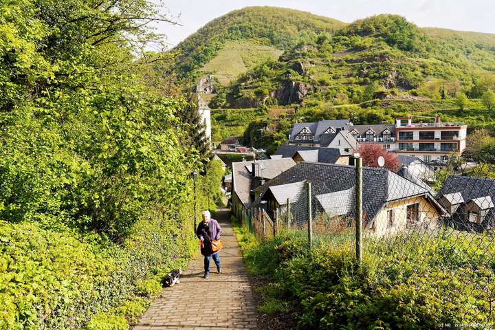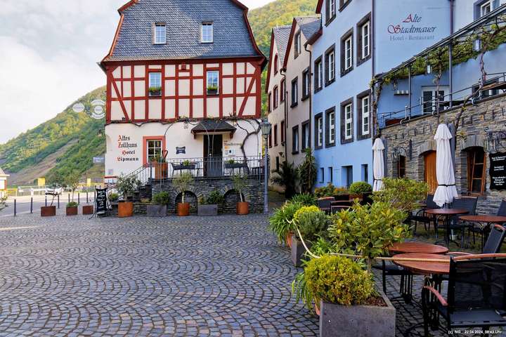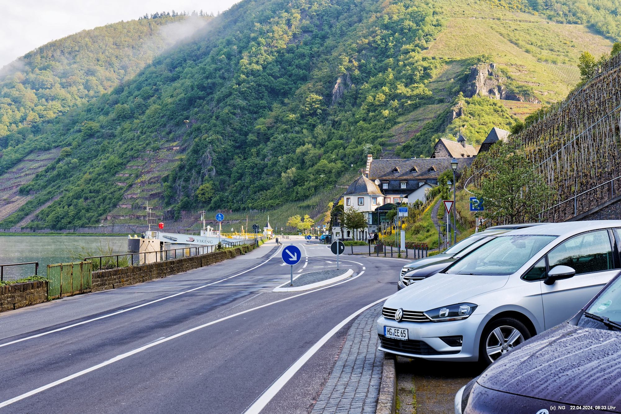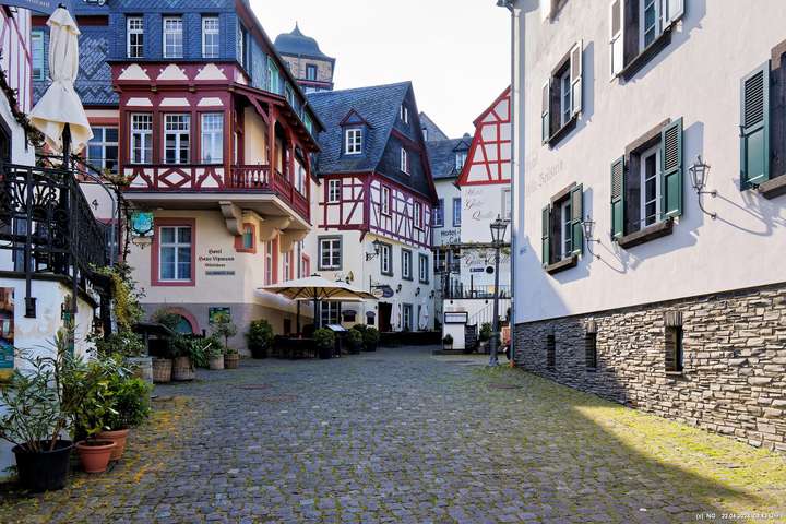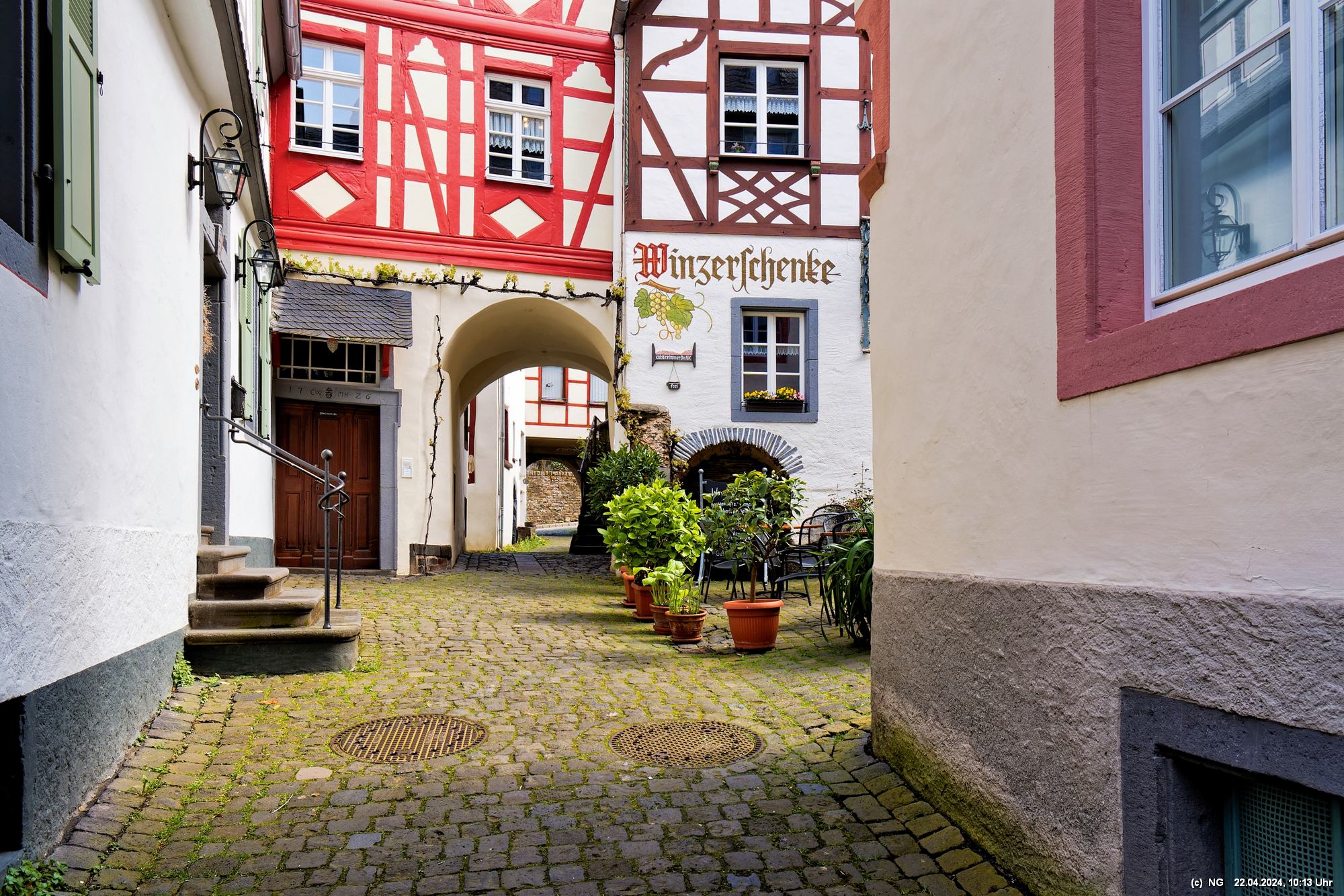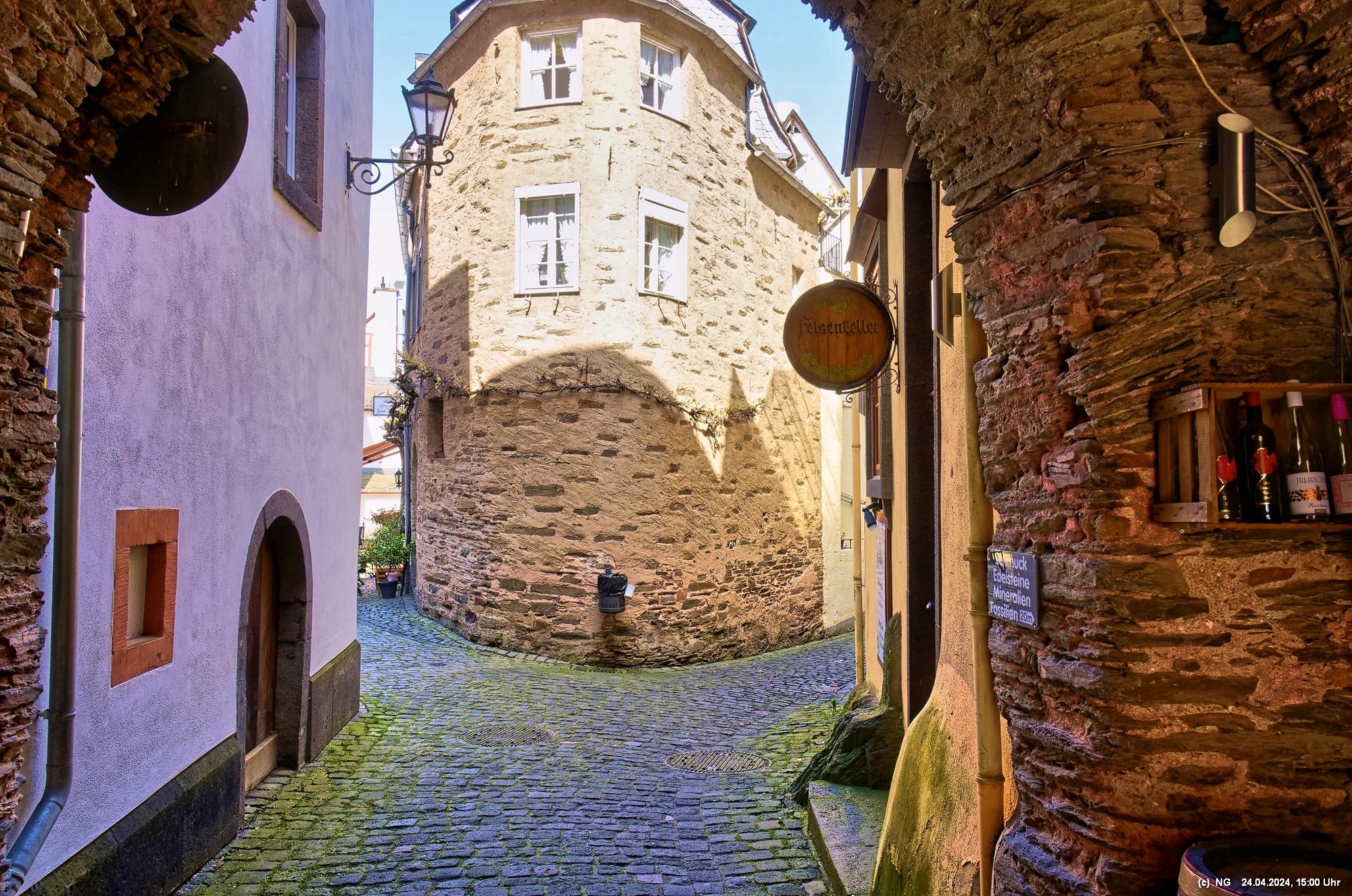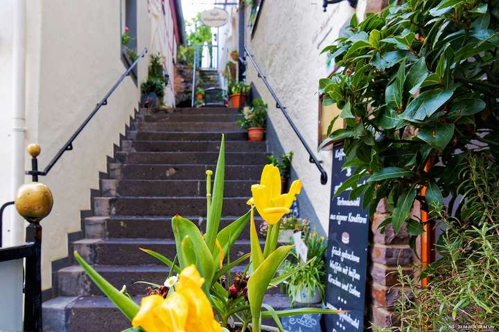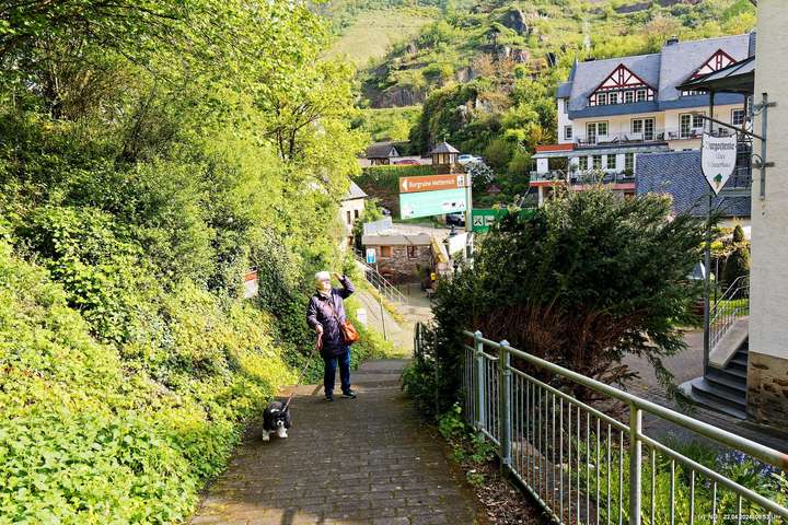 Schon die Lage ist außergewöhnlich. An einem Bachtal und umgeben von Weinbergen lockt es schon von Weitem. Der Ort ist wirklich märchenhaft und die Häuser sind gut gepflegt. Das zieht natürlich Unmengen von Touristen an, denen wir aber am Montag früh aus dem Wege gegangen sind. Hier wurden seinerzeit Filme gedreht mit Heinz Rühmann (Wenn wir alle Engel wären) und Curd Jürgens (Der Schinderhannes). Zu Allem kommt noch die Burg Metternich, die hoch - aber gut erreichbar über dem Ort thront.