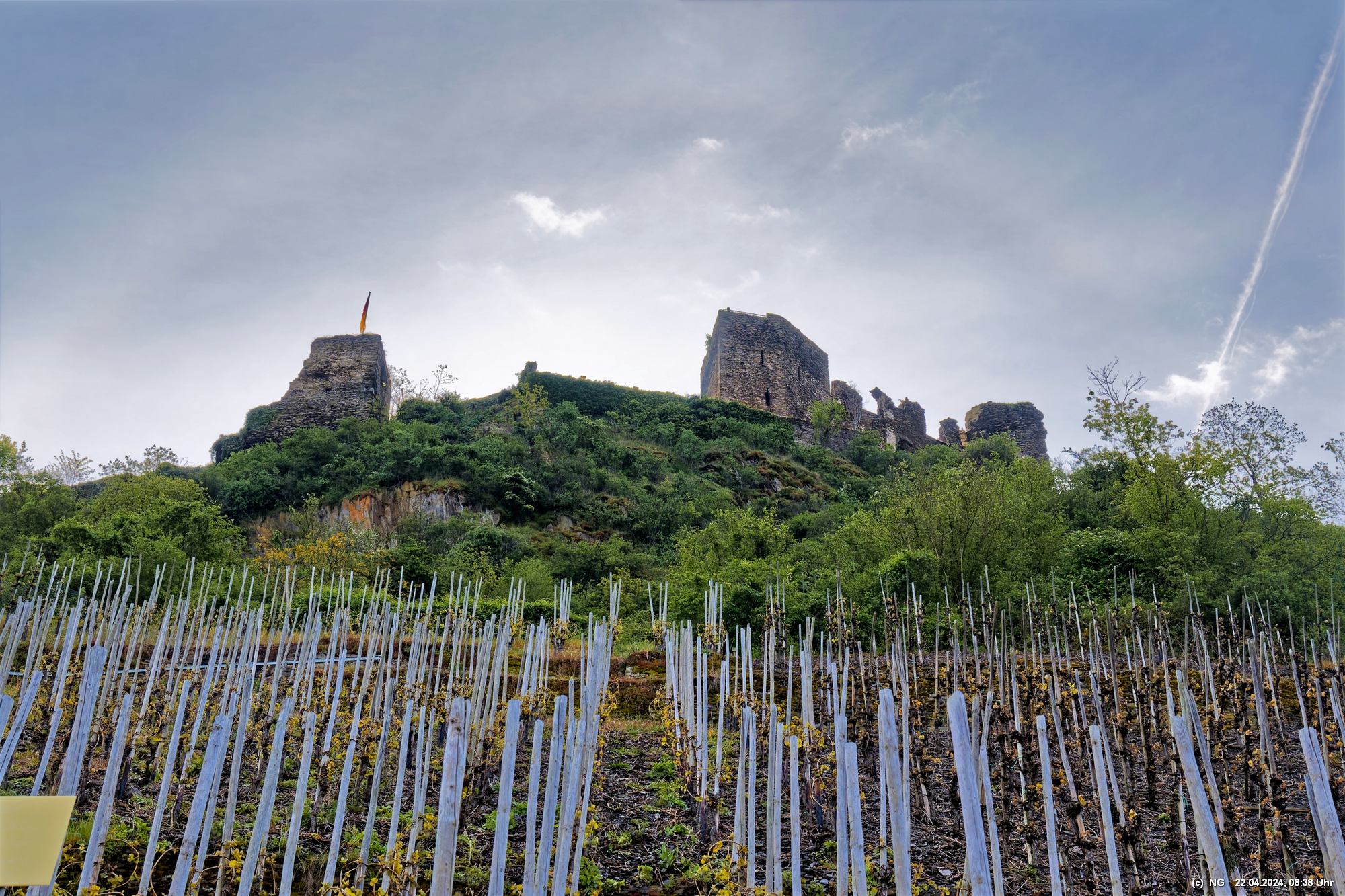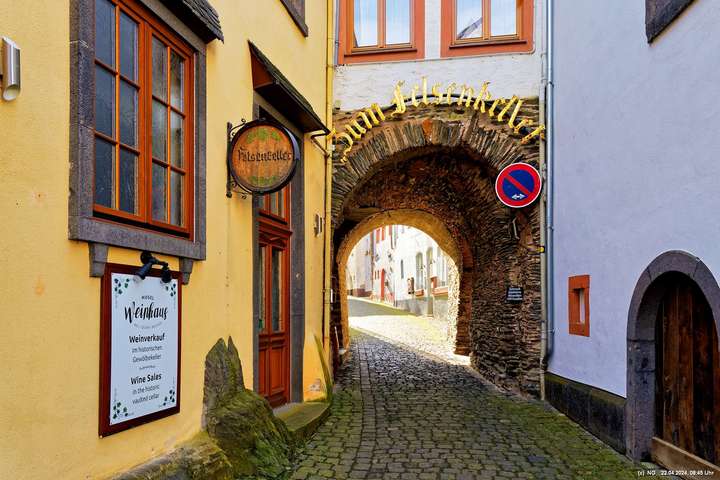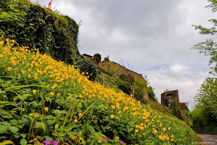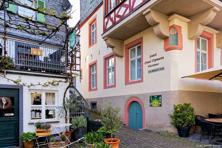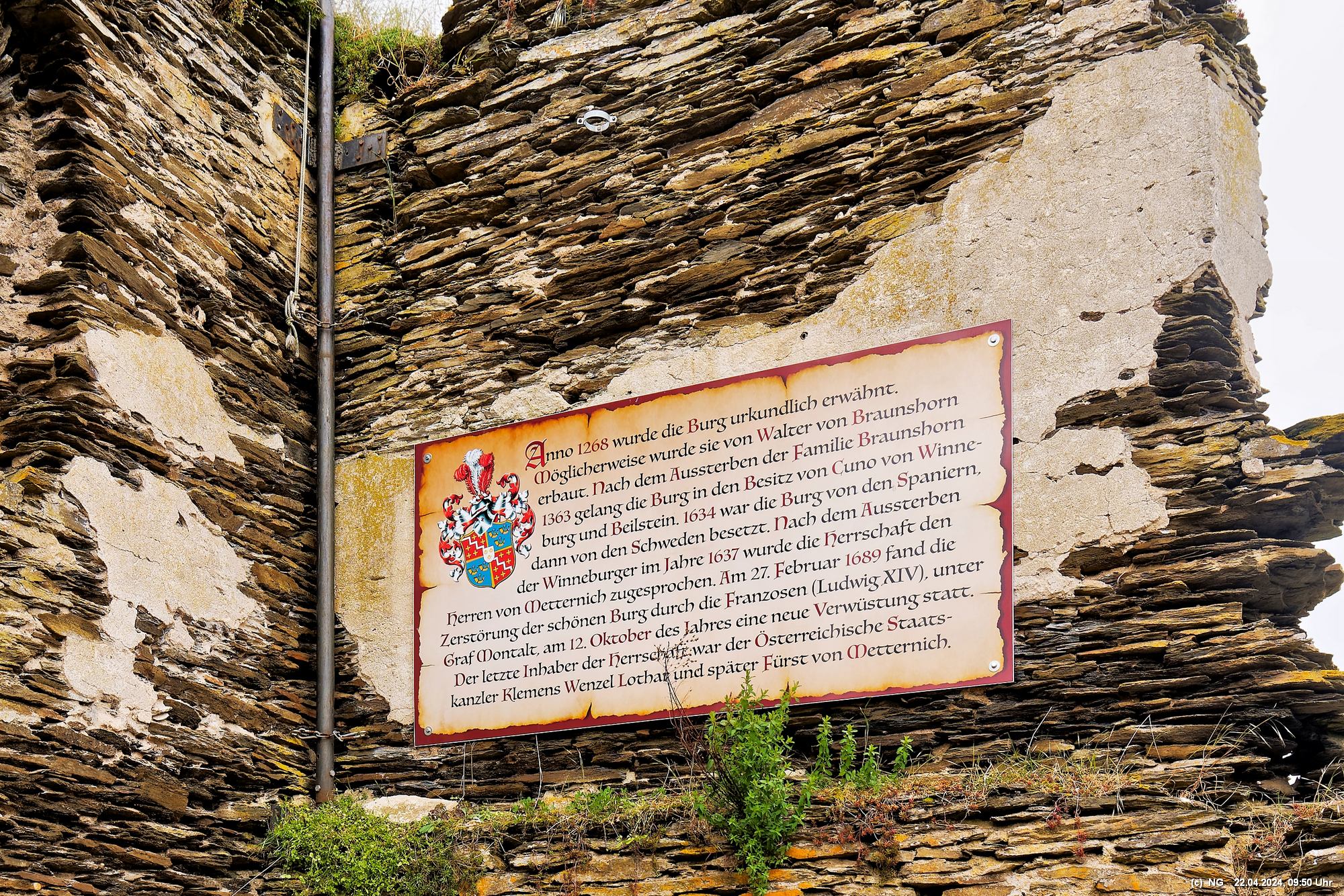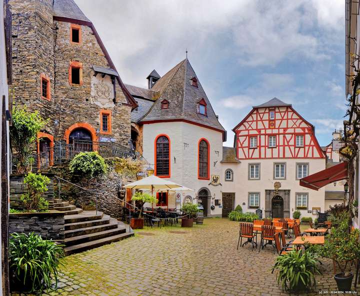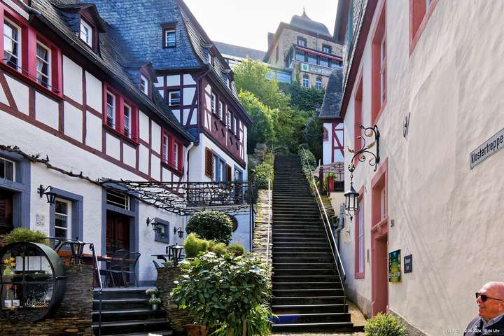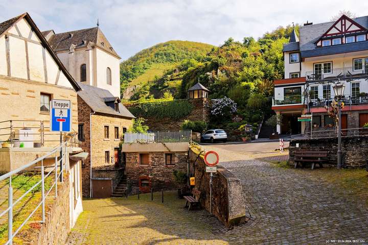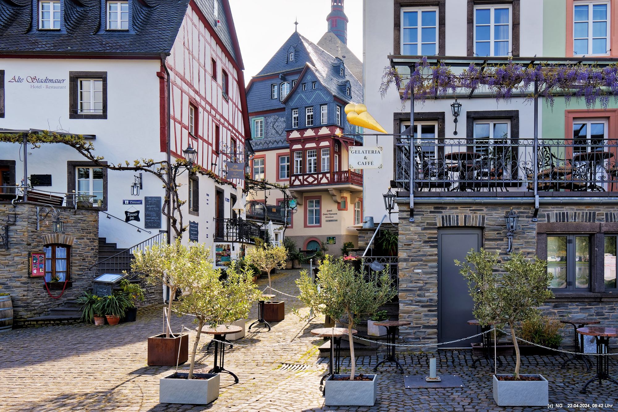 Schon die Lage ist außergewöhnlich. An einem Bachtal und umgeben von Weinbergen lockt es schon von Weitem. Der Ort ist wirklich märchenhaft und die Häuser sind gut gepflegt. Das zieht natürlich Unmengen von Touristen an, denen wir aber am Montag früh aus dem Wege gegangen sind. Hier wurden seinerzeit Filme gedreht mit Heinz Rühmann (Wenn wir alle Engel wären) und Curd Jürgens (Der Schinderhannes). Zu Allem kommt noch die Burg Metternich, die hoch - aber gut erreichbar über dem Ort thront.
