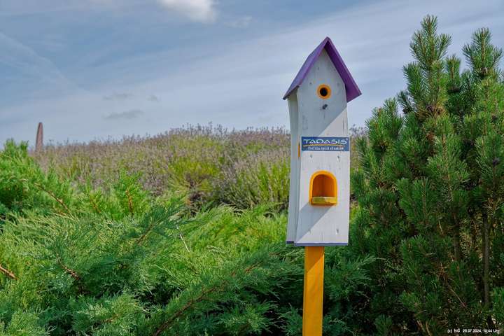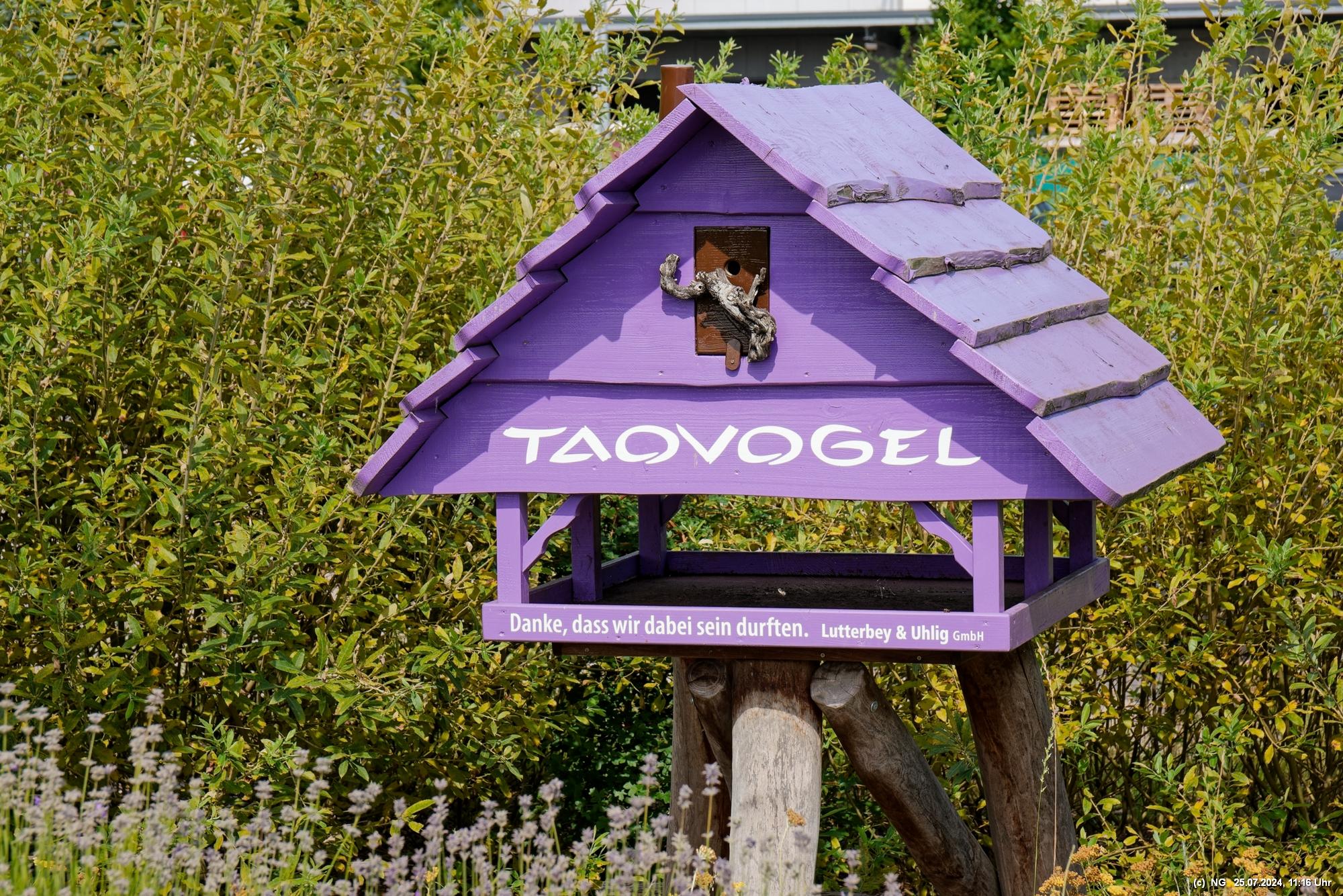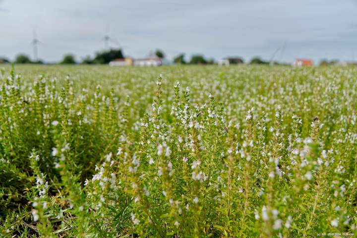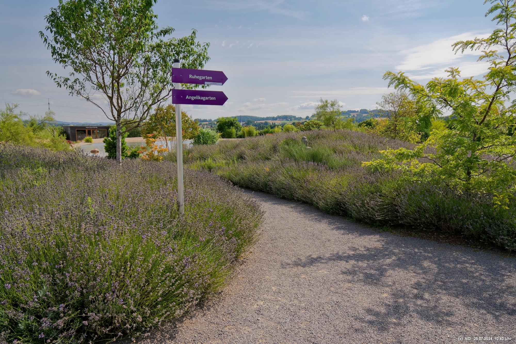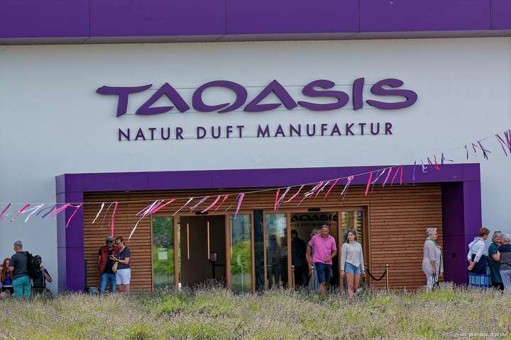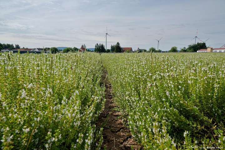 Es gab so viel Regen in der letzten Zeit und so haben wir es an einem störungsfreien Tag gerade noch geschafft, am Ende der Blüte der meisten Sorten und unmittelbar vor der Ernte das 5 ha große Feld zu besuchen. Es duftet zwar immer noch stark, aber die Hochblüte war eben vorbei. Vielleicht schaffen wir es im nächten Jahr bei voller Blüte. Aber dennoch war es prächtig, die gut gepflegte Anlage mit dem Aromapark zu besuchen. Da unsere Hunde nicht mit in den Park durften, haben wir uns abgewechselt und die beiden konnten im Cafe ausruhen.