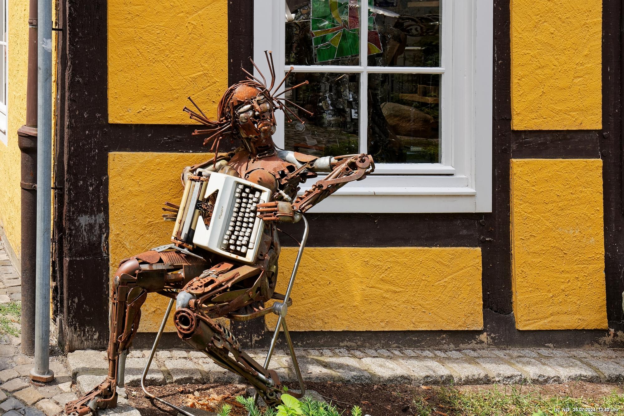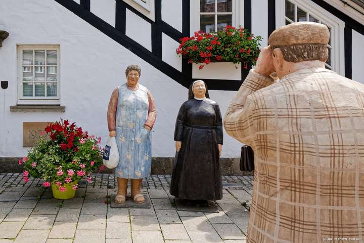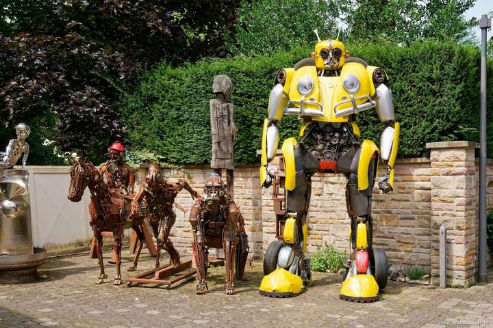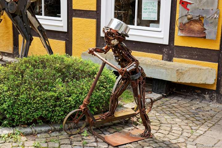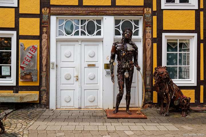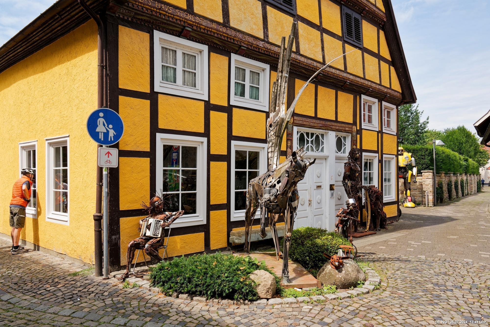 Rietberg liegt im Nordosten von NRW und gehört zum Kreis Gütersloh. Auf dem Rückweg von Lage wollten wir uns die historische Altstadt mit vielen Häusern aus dem 16. und 17. Jahrhundert ansehen. Wir sind vom großen Parkplatz entlang der Ems zum Kern der Altstadt gelaufen. Da unsere Füße schon etwas müde waren, haben wir den großen Rundweg nicht gemacht. Doch das, was wir gesehen haben, hat uns sehr gefallen. Auch die vor dem gut renovierten Haus platzierten Exponate eines Künstlers haben es uns angetan - erstaunlich diese Fantasie.
