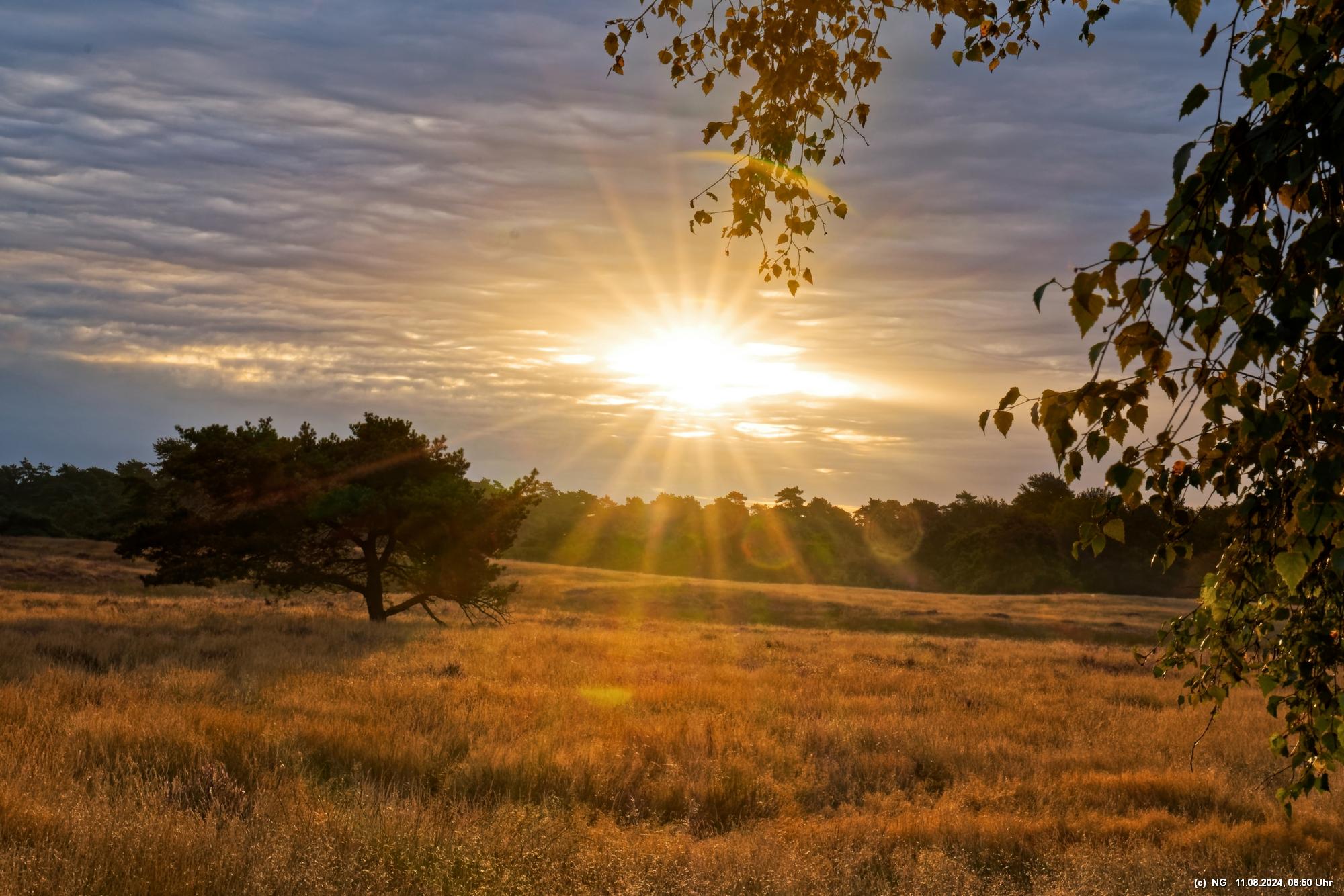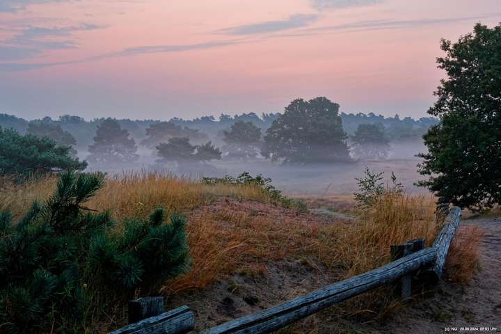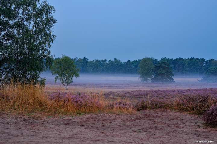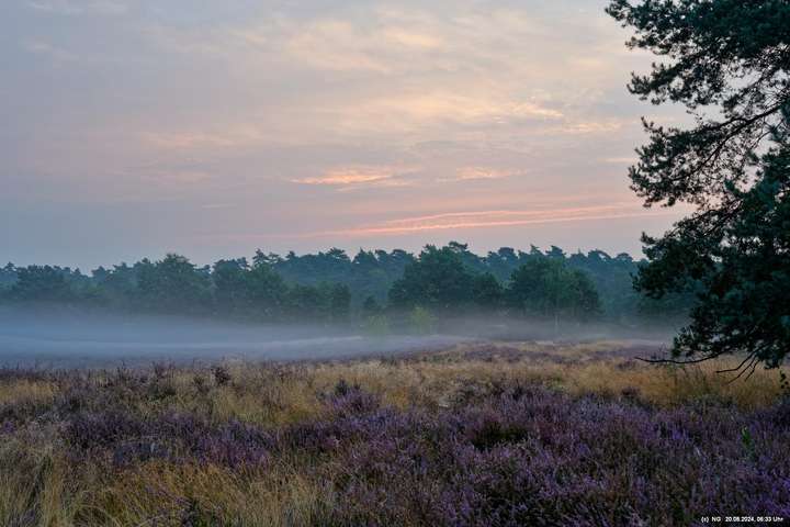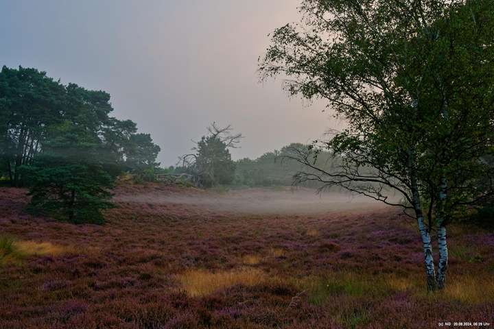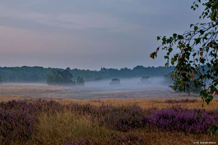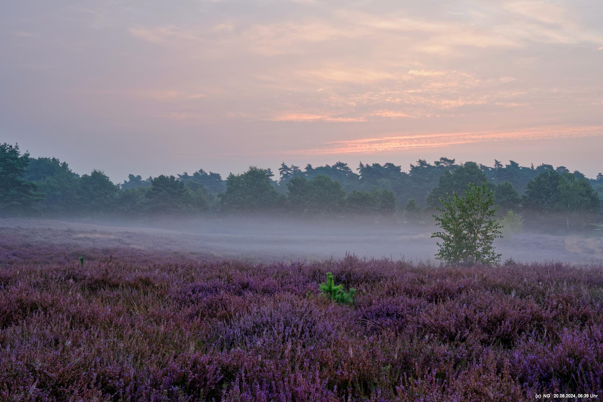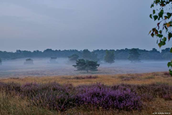 Durch die feuchte, warme Witterung blüht die Heide in diesem Jahr sehr intensiv und sieht wunderschön aus. Allerdings ist damit die Aussicht auf Bodennebel sehr gering. Das hat sich jetzt geändert. Taupunkt und Nachttemperaturen sinken. Hier Fotos von 2 Sonnenaufgängen: Ein schöner Sonnenaufgang, aber ohne Bodennebel und ein eher schlichter Sonnenaufgang, aber mit Bodennebel und Tautropfen an den Spinnenweben. Alles zum genießen!