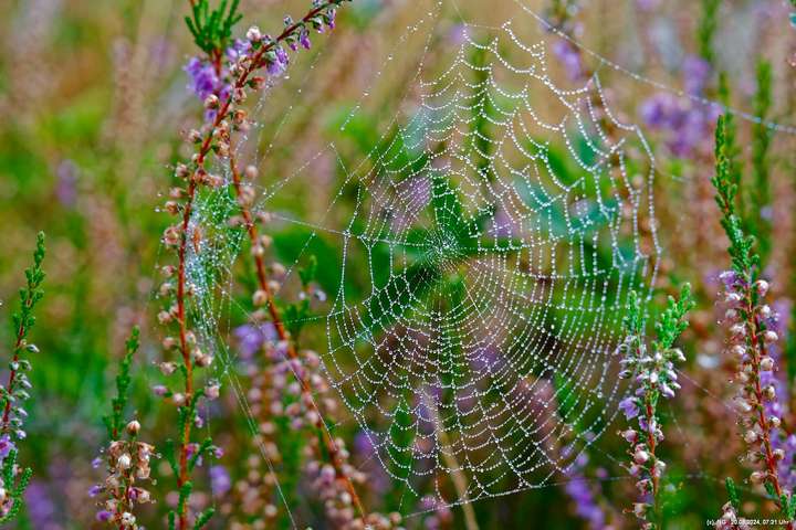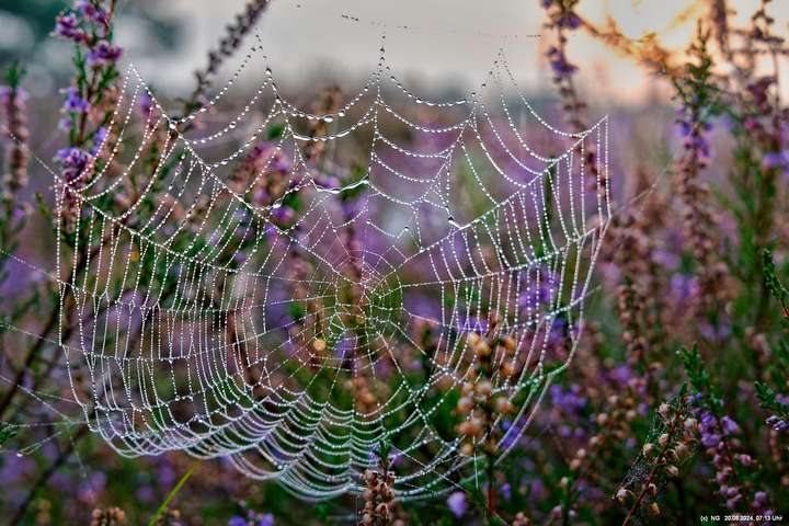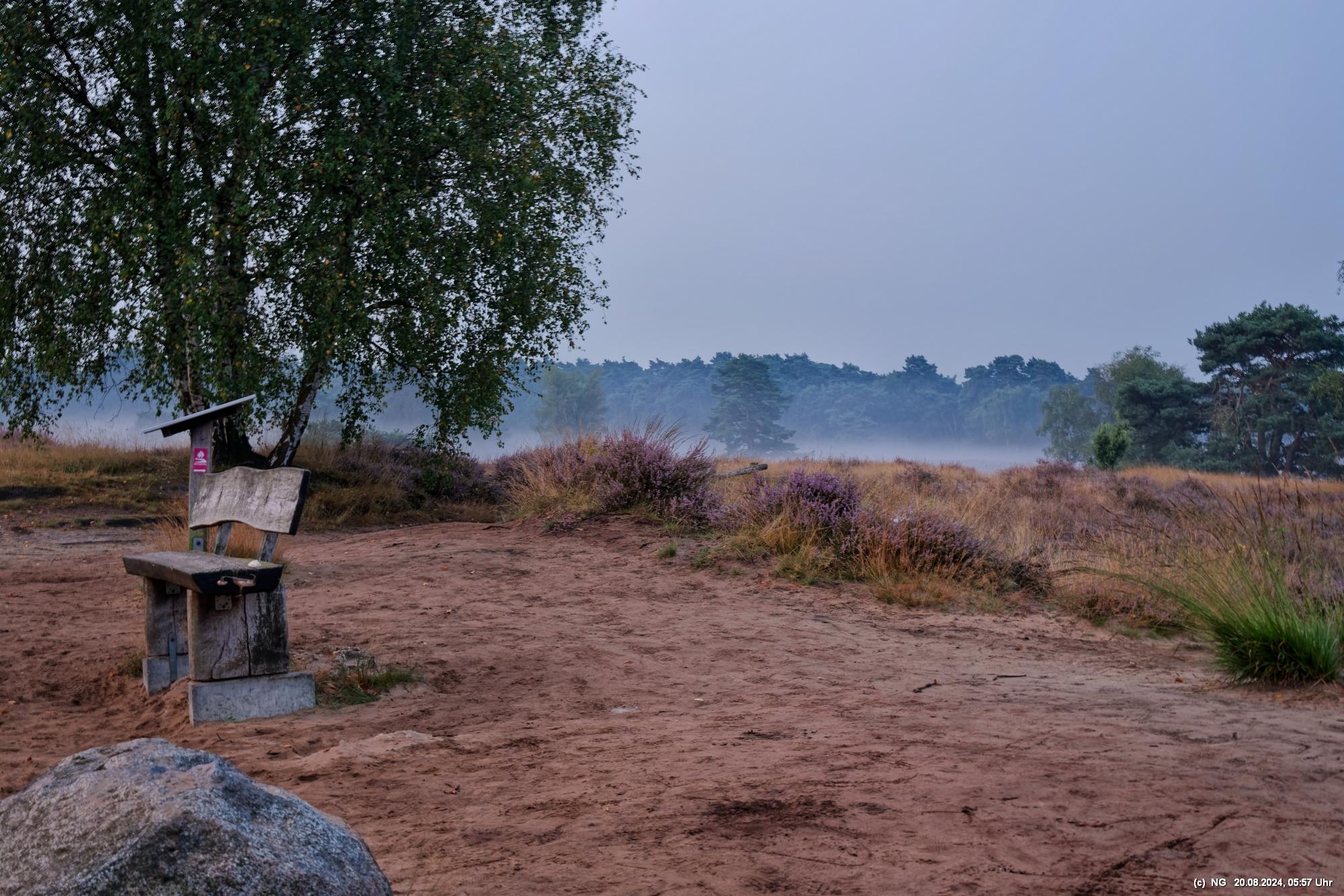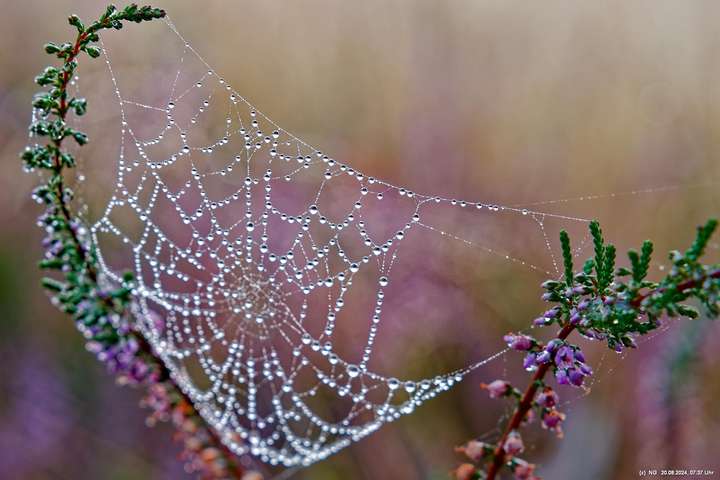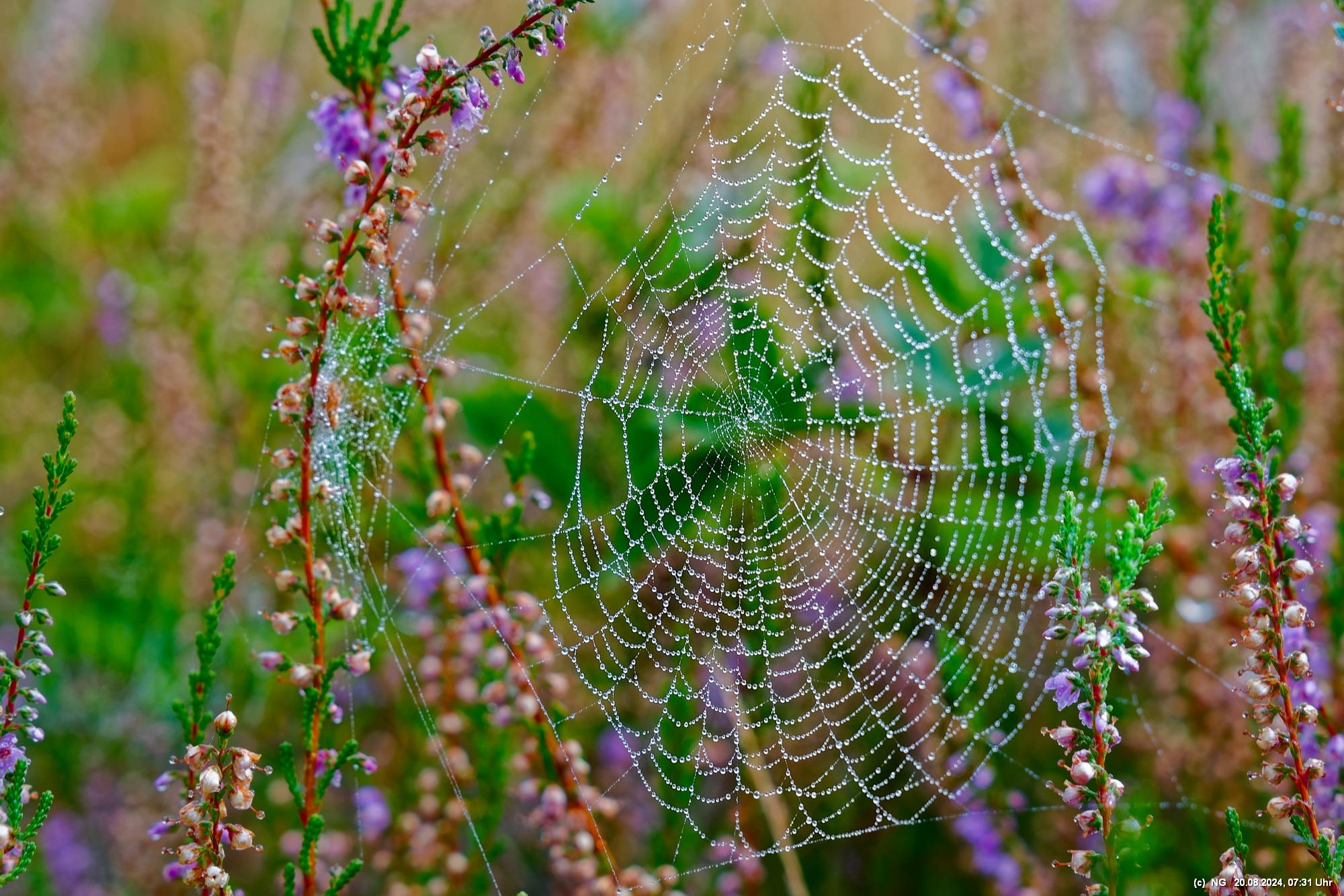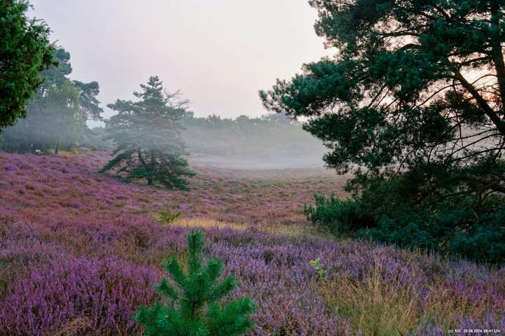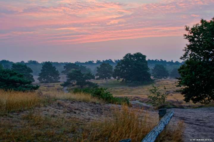 Durch die feuchte, warme Witterung blüht die Heide in diesem Jahr sehr intensiv und sieht wunderschön aus. Allerdings ist damit die Aussicht auf Bodennebel sehr gering. Das hat sich jetzt geändert. Taupunkt und Nachttemperaturen sinken. Hier Fotos von 2 Sonnenaufgängen: Ein schöner Sonnenaufgang, aber ohne Bodennebel und ein eher schlichter Sonnenaufgang, aber mit Bodennebel und Tautropfen an den Spinnenweben. Alles zum genießen!