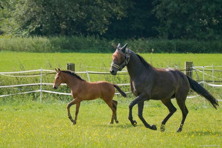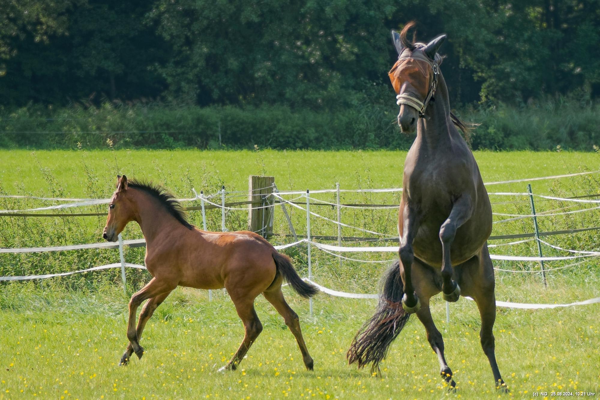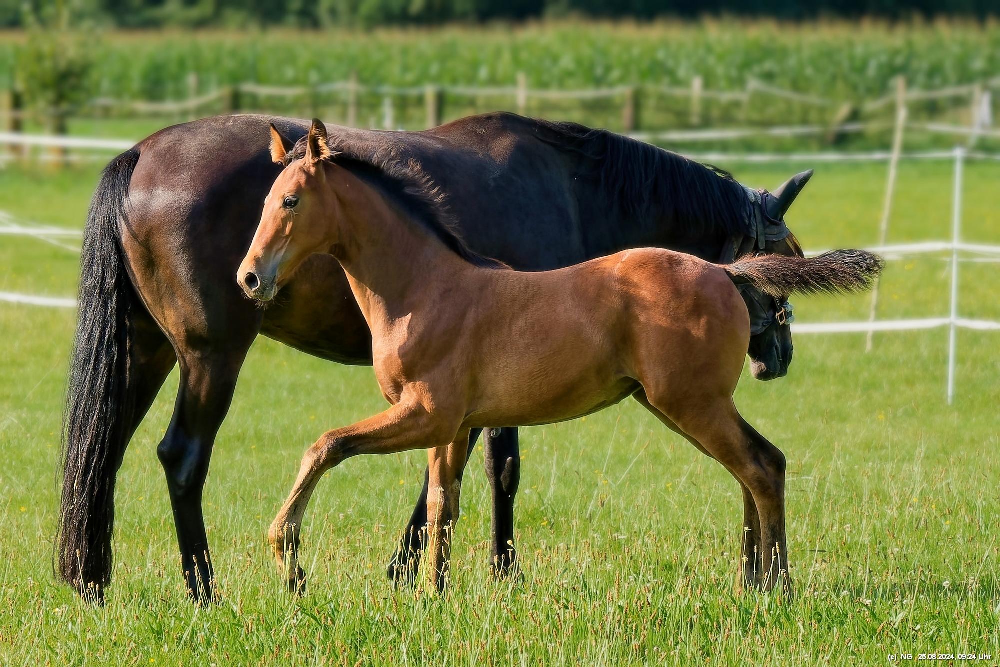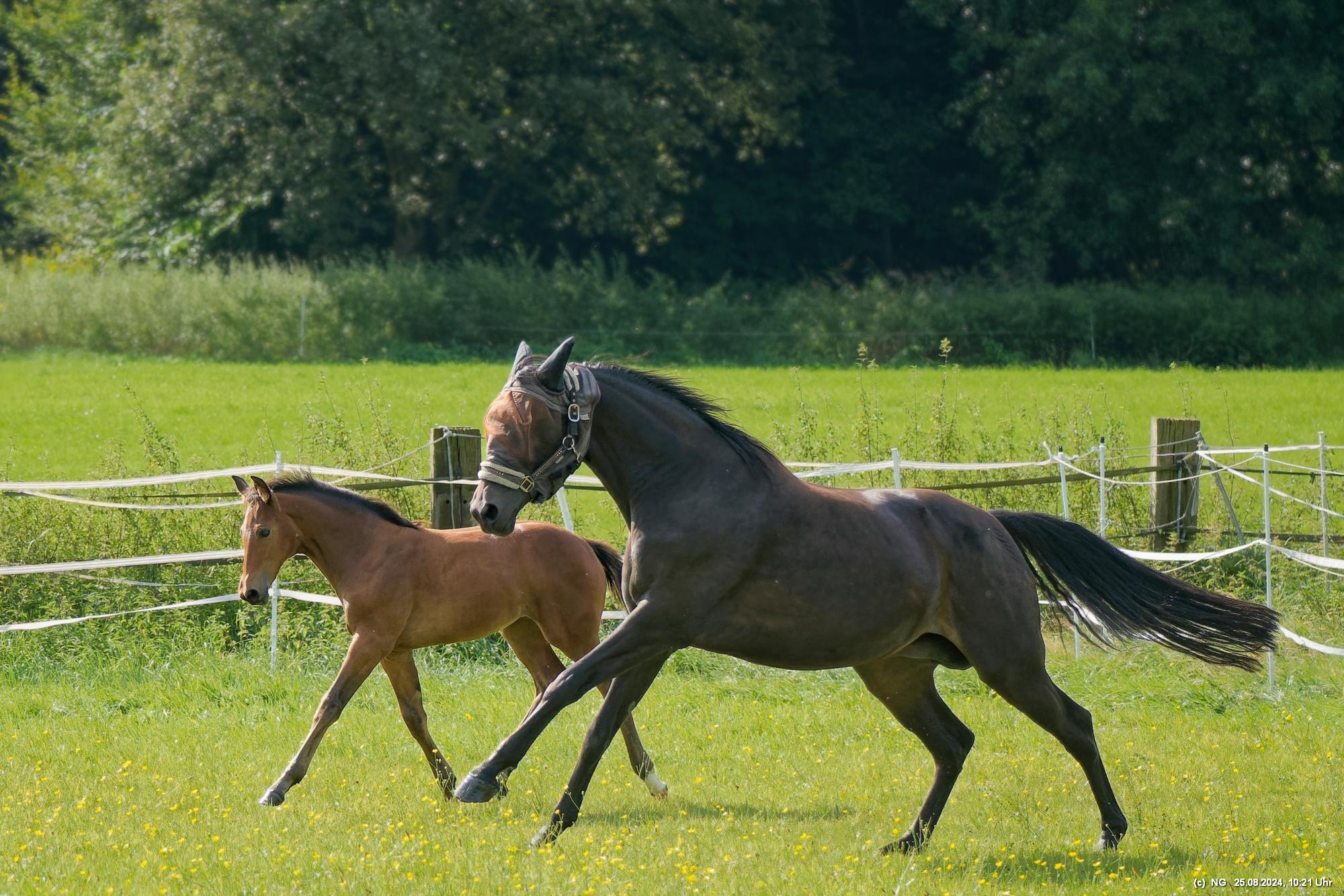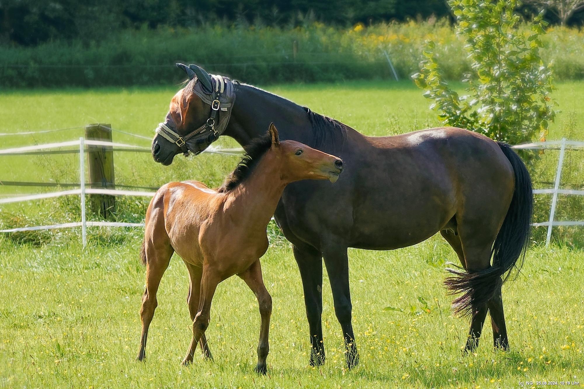 Schon rund 3 Monate ist sie alt und zeigt, welches Temperament in ihr steckt. EsCarlotta - M. Im Namen steckt die Abstammung von "Escolar", ein berühmter Name für den Ausnahmehengst mit einer Kadernominierung für Olympia. Der Vater der Mutterstute "Franziskus" hat in der Dressur bei Olympia 2024 in Paris teilgenommen. Es macht Spaß, Mutter und Tochter zuzusehen und das, obwohl wir bisher mit Pferden nichts zu tun hatten. Leider waren die Lichter der Sonne oft zu hart, aber das war uns egal.