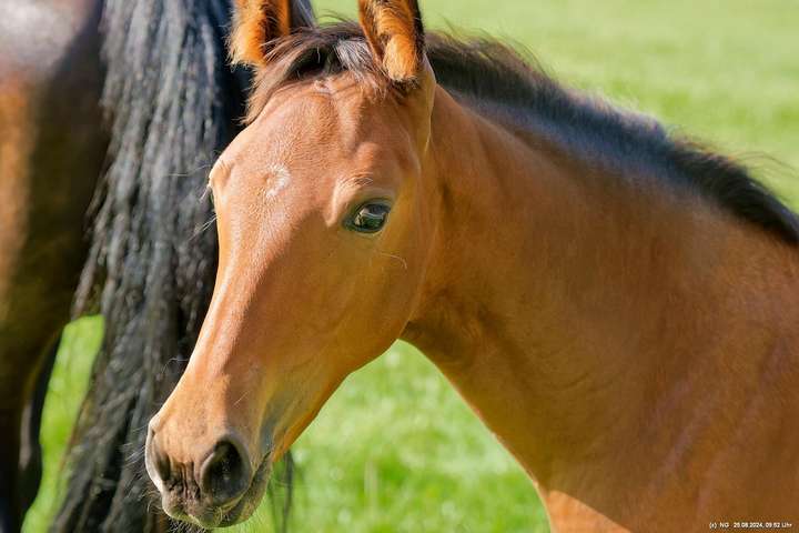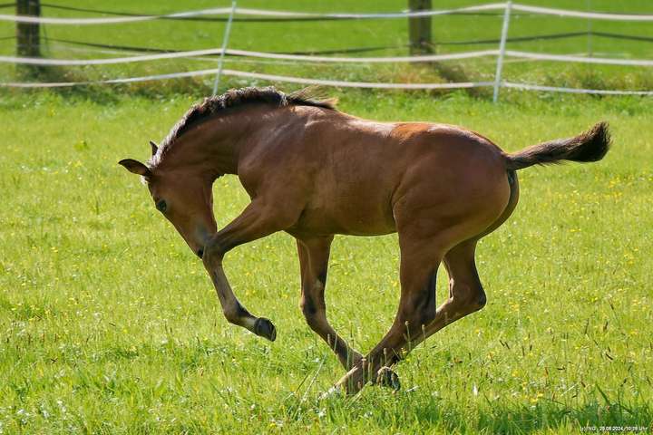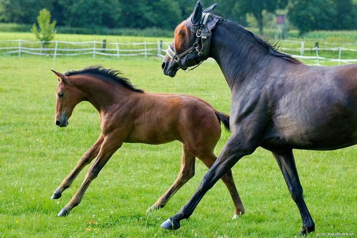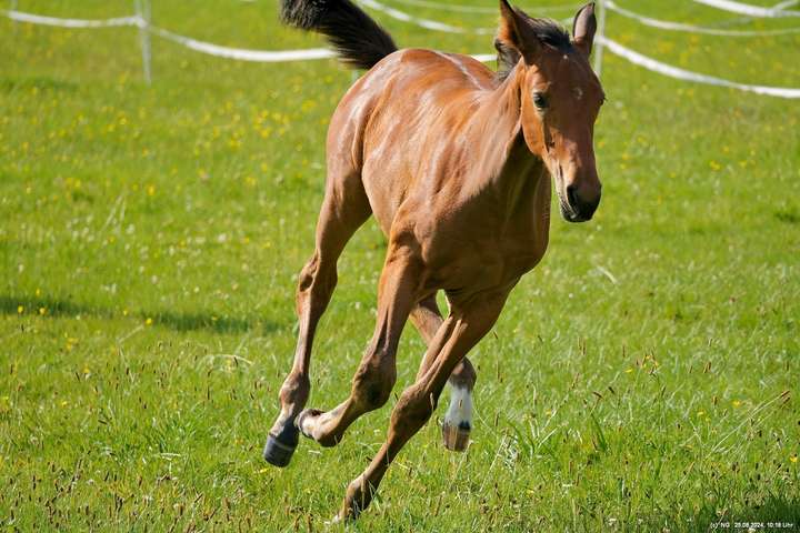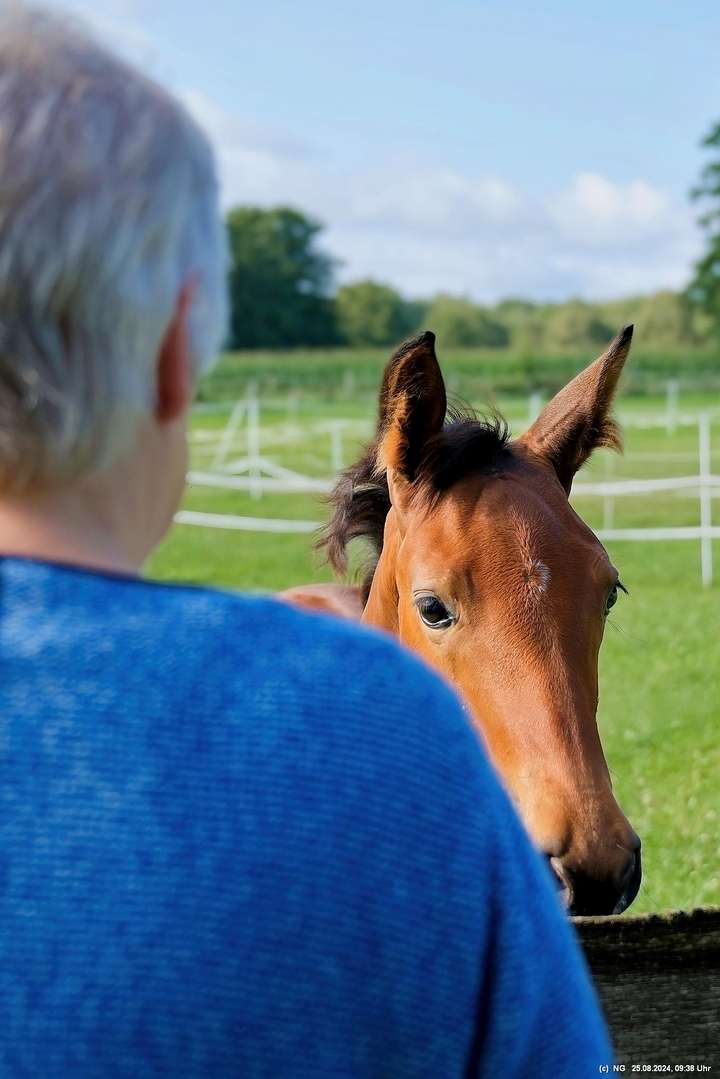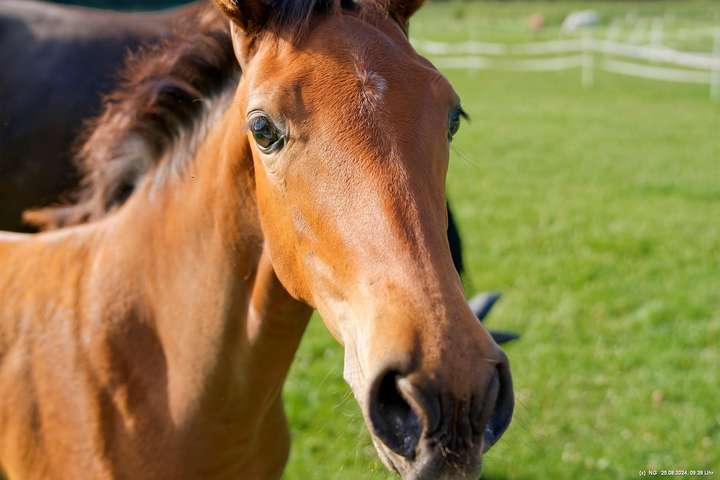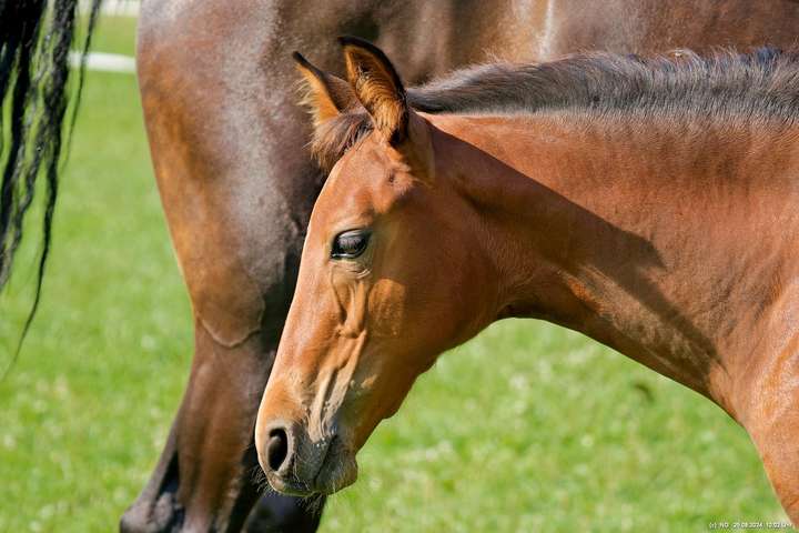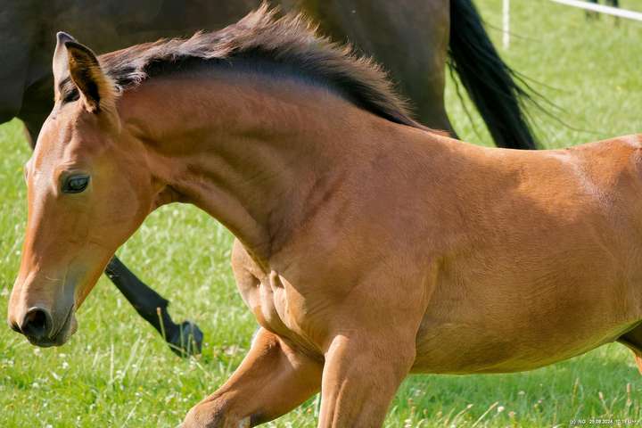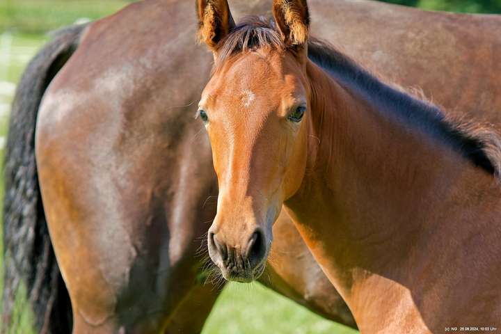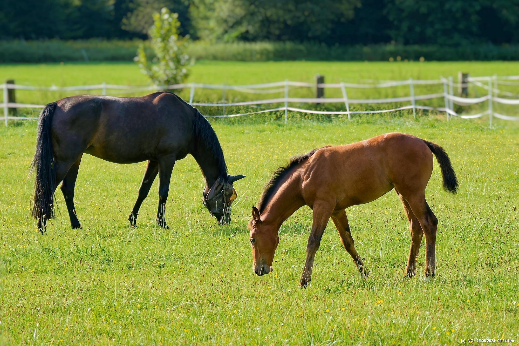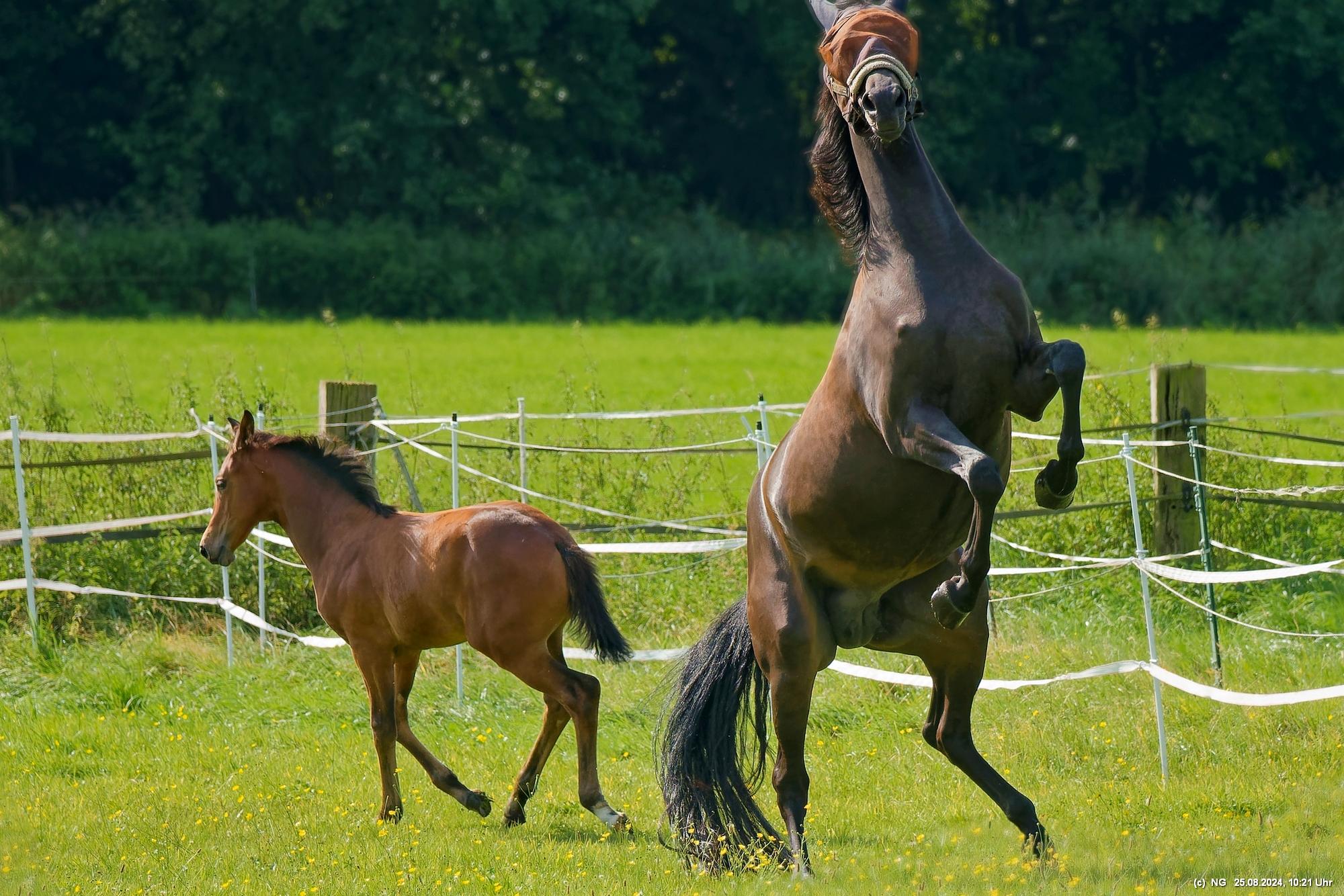 Schon rund 3 Monate ist sie alt und zeigt, welches Temperament in ihr steckt. EsCarlotta - M. Im Namen steckt die Abstammung von "Escolar", ein berühmter Name für den Ausnahmehengst mit einer Kadernominierung für Olympia. Der Vater der Mutterstute "Franziskus" hat in der Dressur bei Olympia 2024 in Paris teilgenommen. Es macht Spaß, Mutter und Tochter zuzusehen und das, obwohl wir bisher mit Pferden nichts zu tun hatten. Leider waren die Lichter der Sonne oft zu hart, aber das war uns egal.