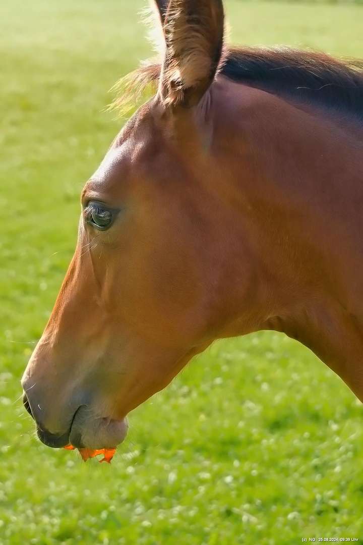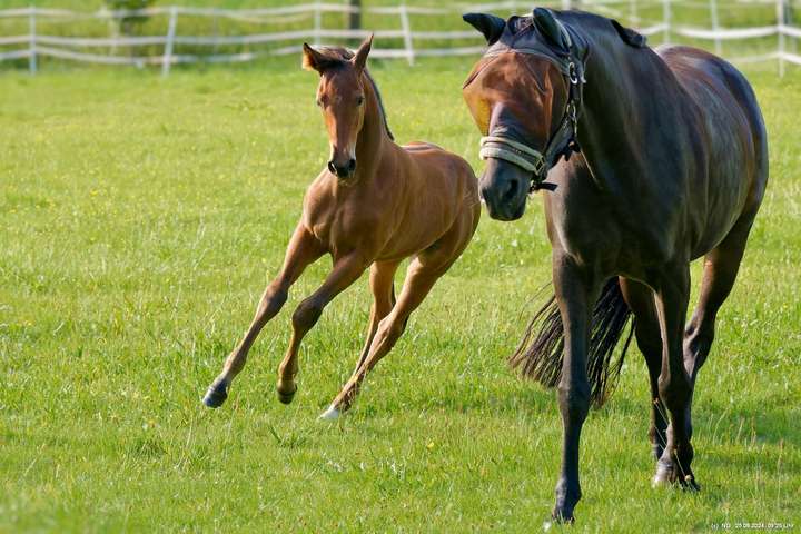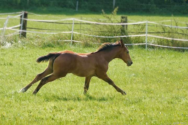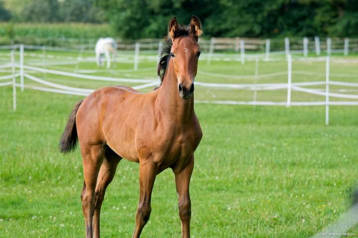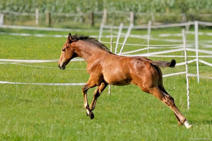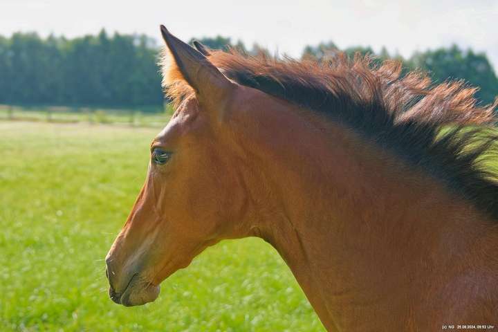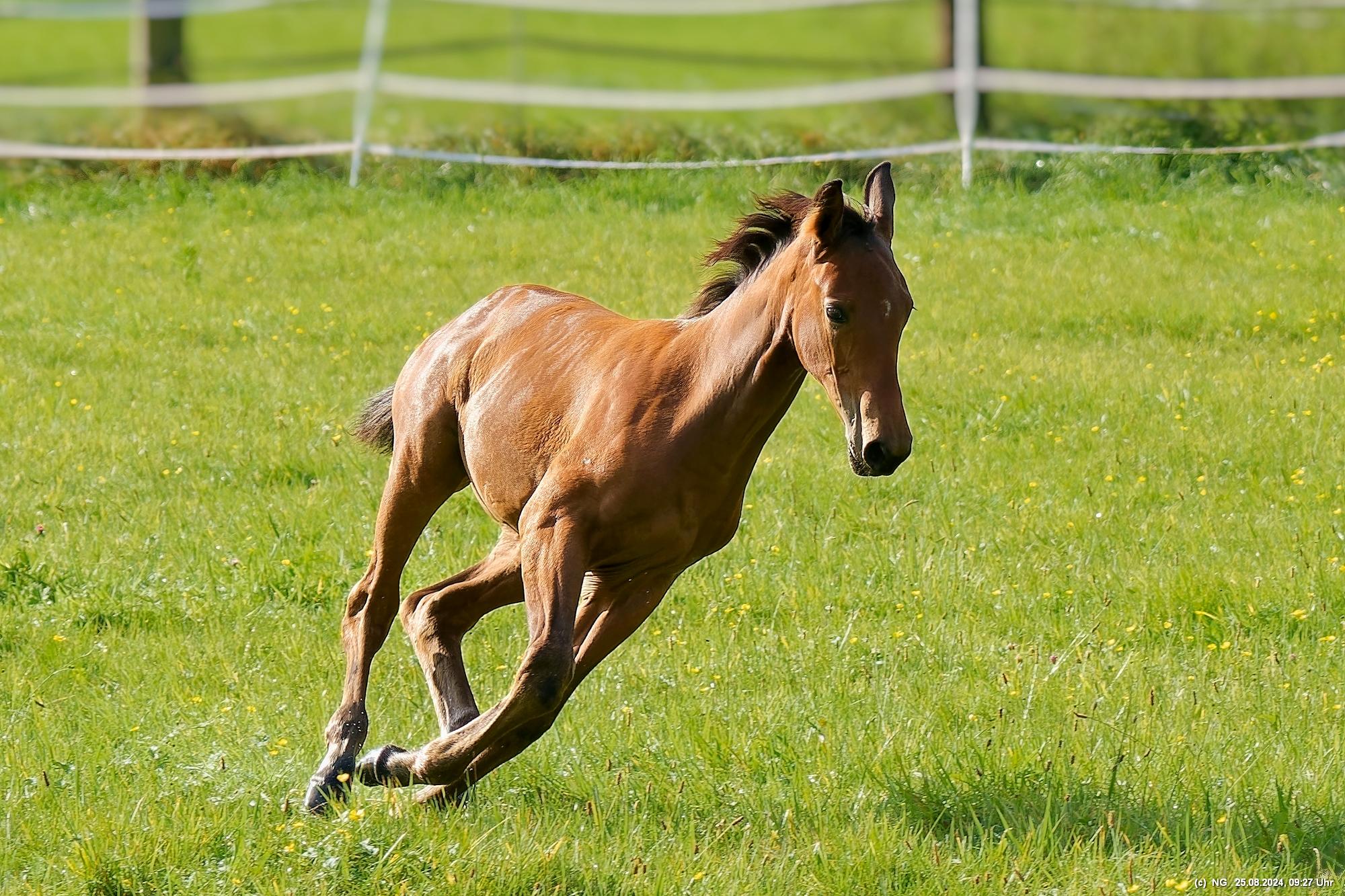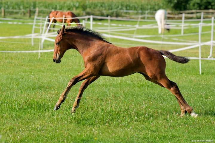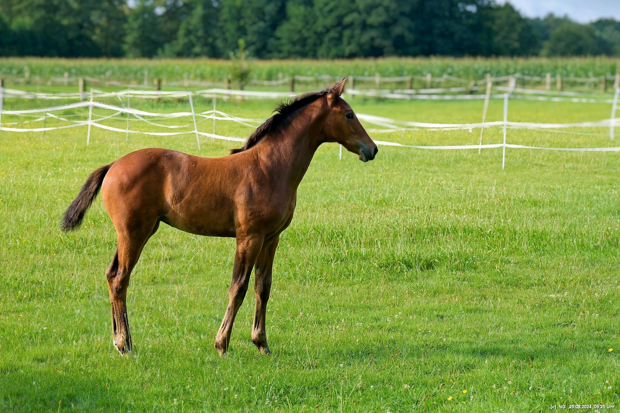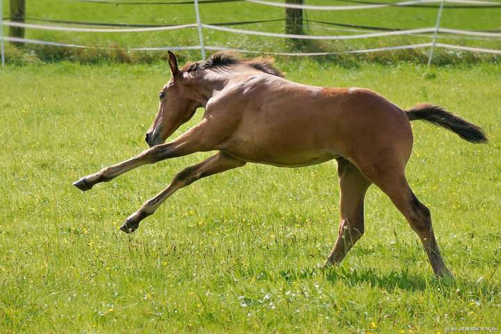 Schon rund 3 Monate ist sie alt und zeigt, welches Temperament in ihr steckt. EsCarlotta - M. Im Namen steckt die Abstammung von "Escolar", ein berühmter Name für den Ausnahmehengst mit einer Kadernominierung für Olympia. Der Vater der Mutterstute "Franziskus" hat in der Dressur bei Olympia 2024 in Paris teilgenommen. Es macht Spaß, Mutter und Tochter zuzusehen und das, obwohl wir bisher mit Pferden nichts zu tun hatten. Leider waren die Lichter der Sonne oft zu hart, aber das war uns egal.