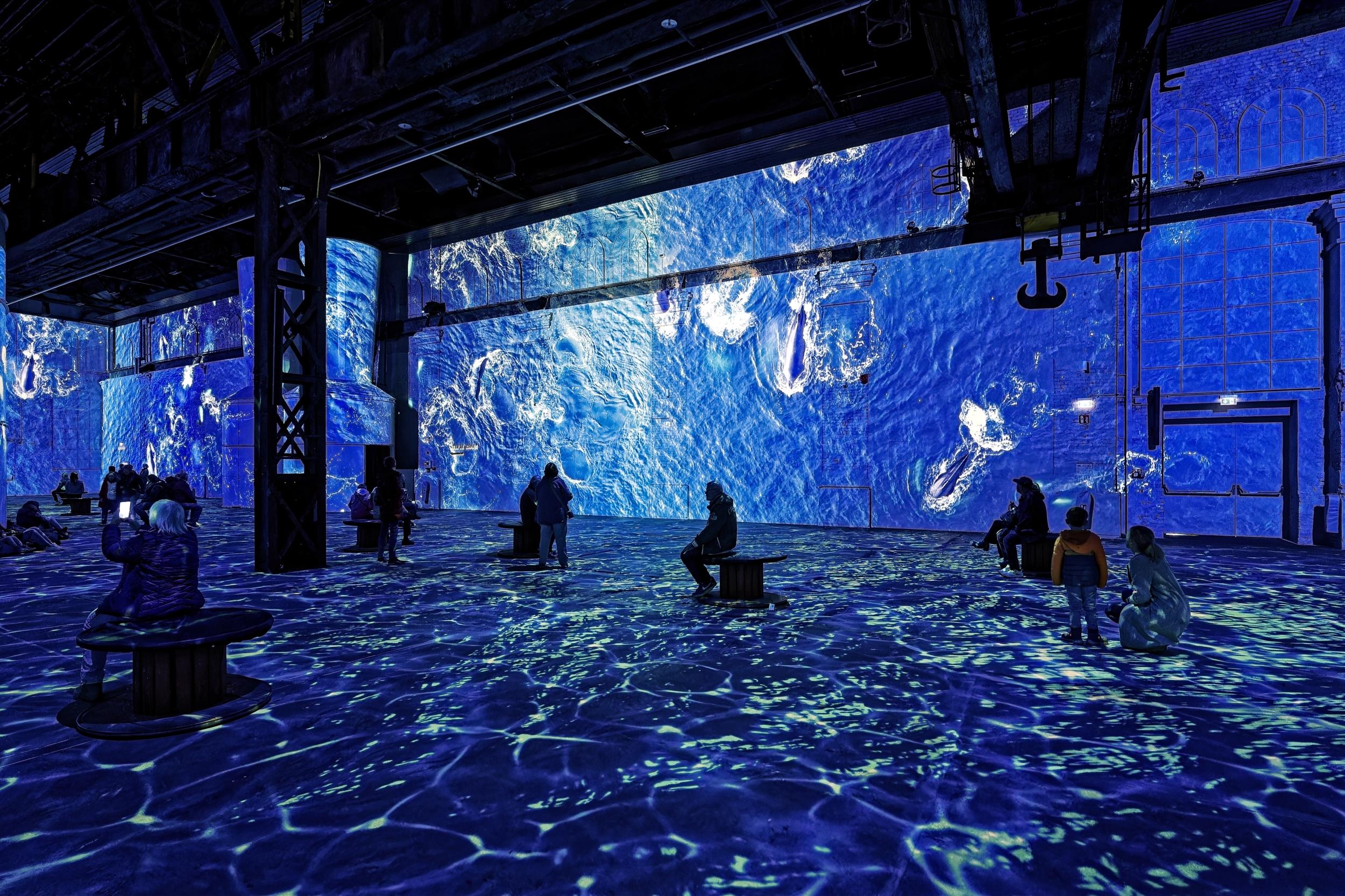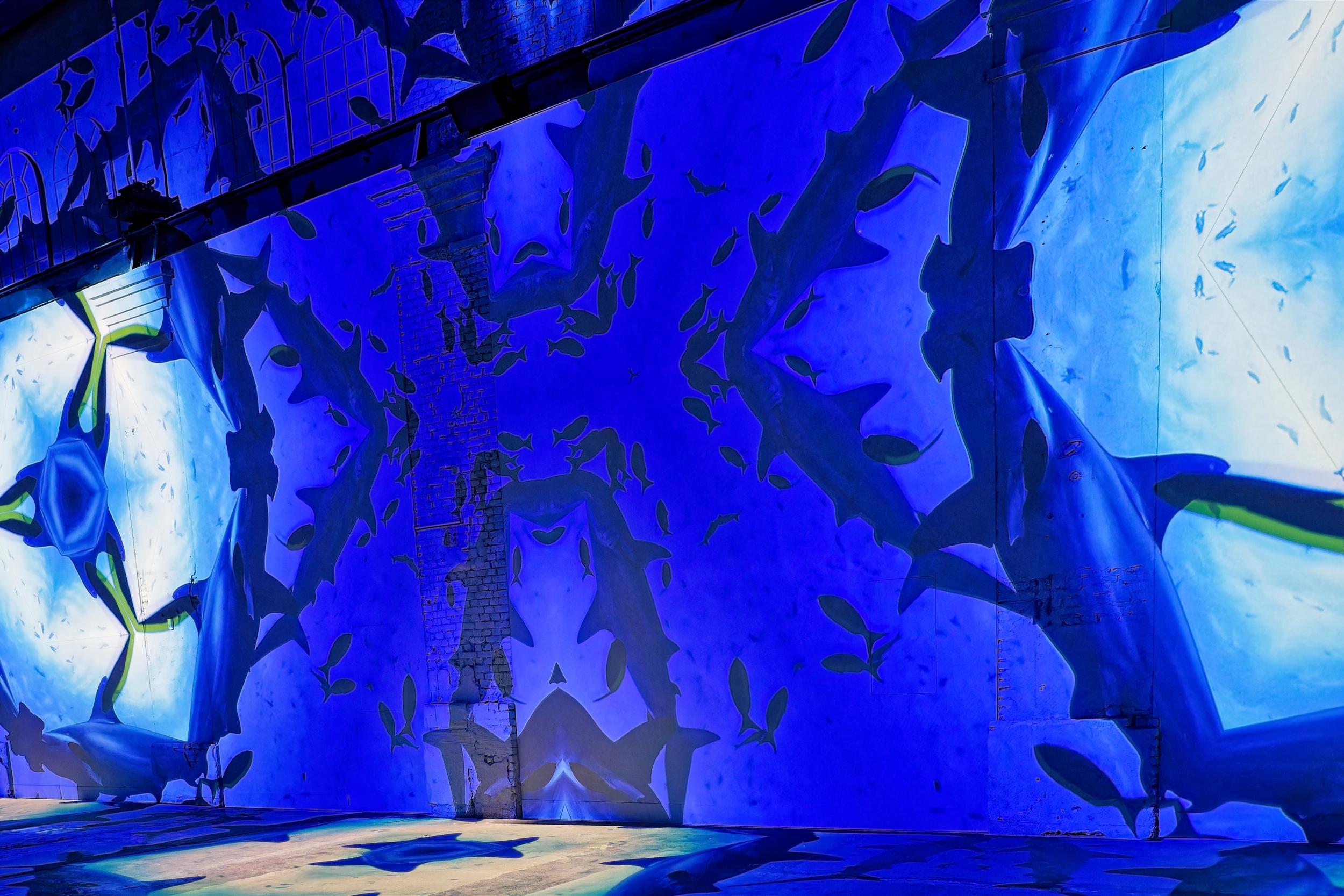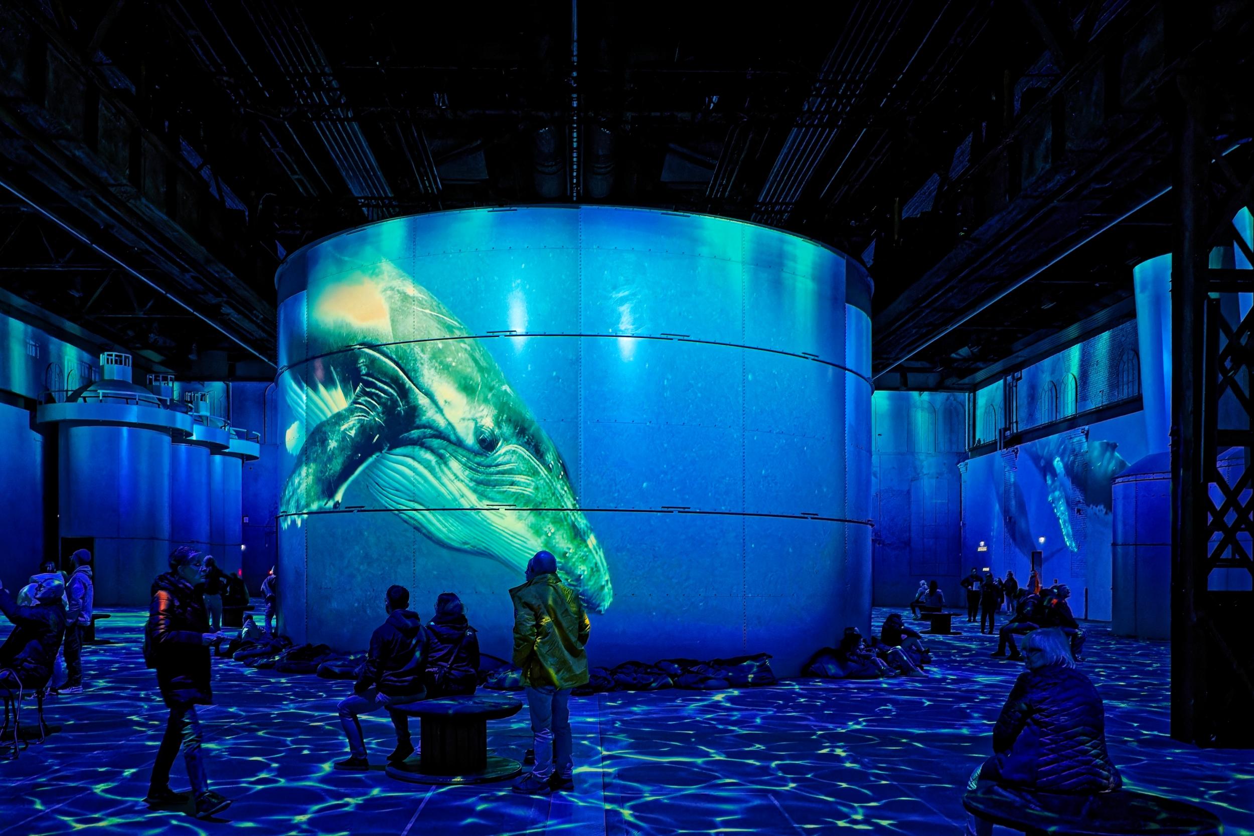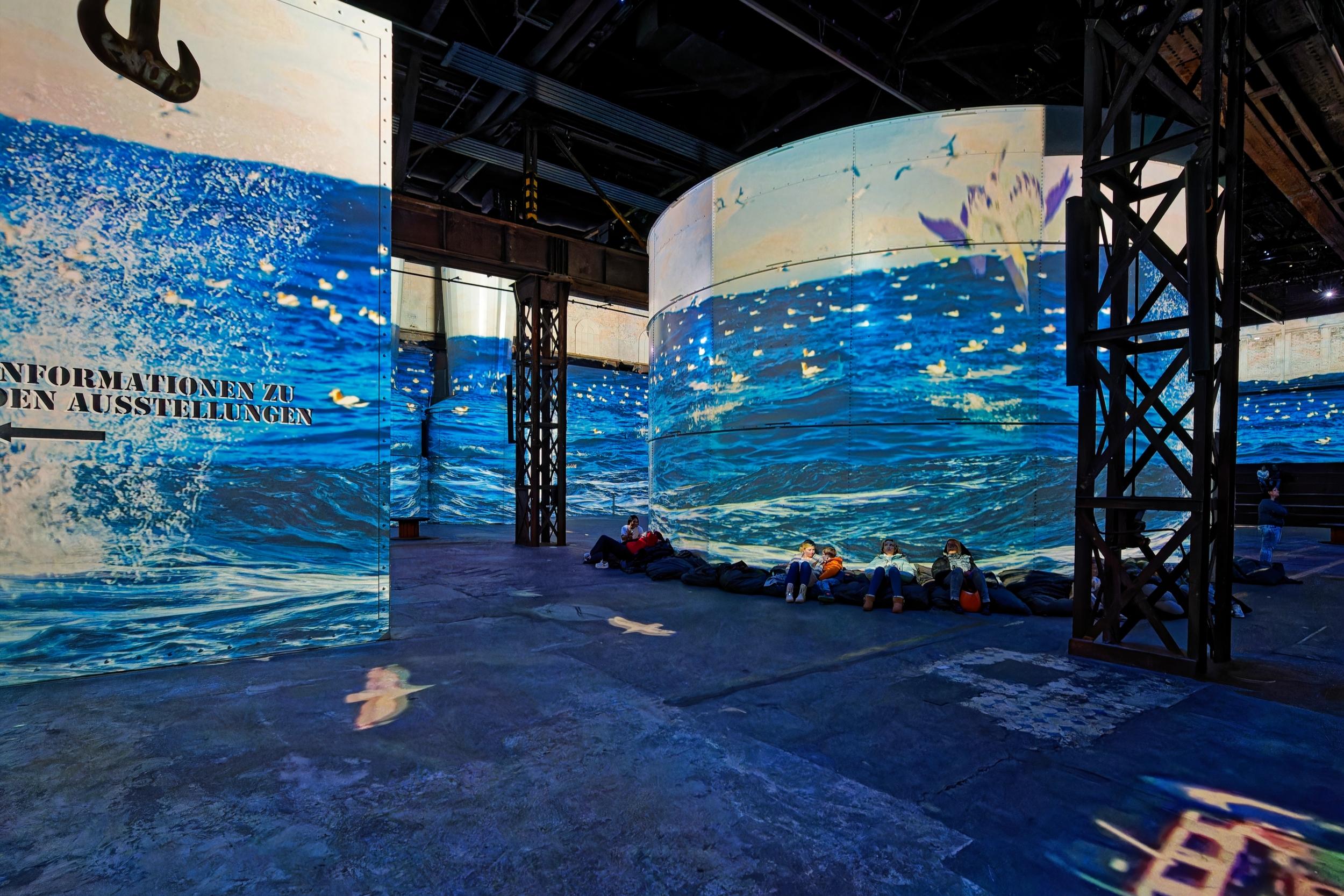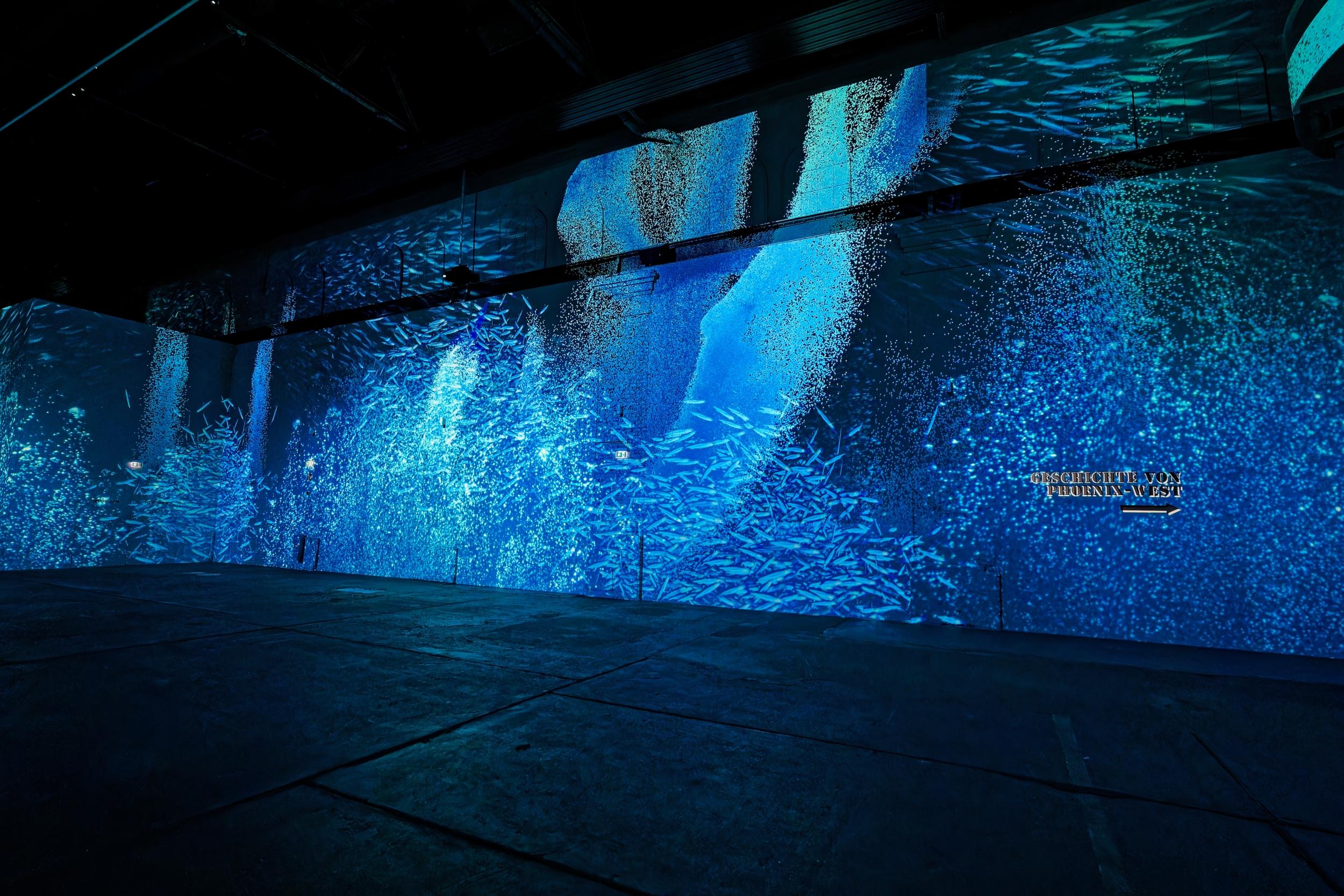 Gezeigt werden bewegte Bilder, musikalisch hinterlegt. Aber, das wäre ja noch nichts Besonderes. Besonders ist, das der gesamte Boden zu den 5.600 m² Projektionsfläche gehört und man also mittendrin steht und dass die Umgebung dieser ehemaligen Industriehalle die Bewegungen mitzumachen scheint. Wir waren wieder einmal fasziniert!