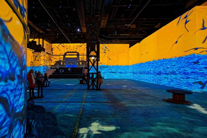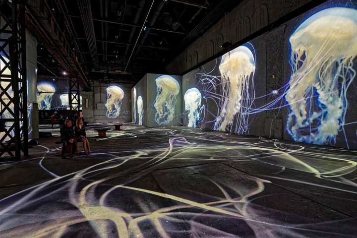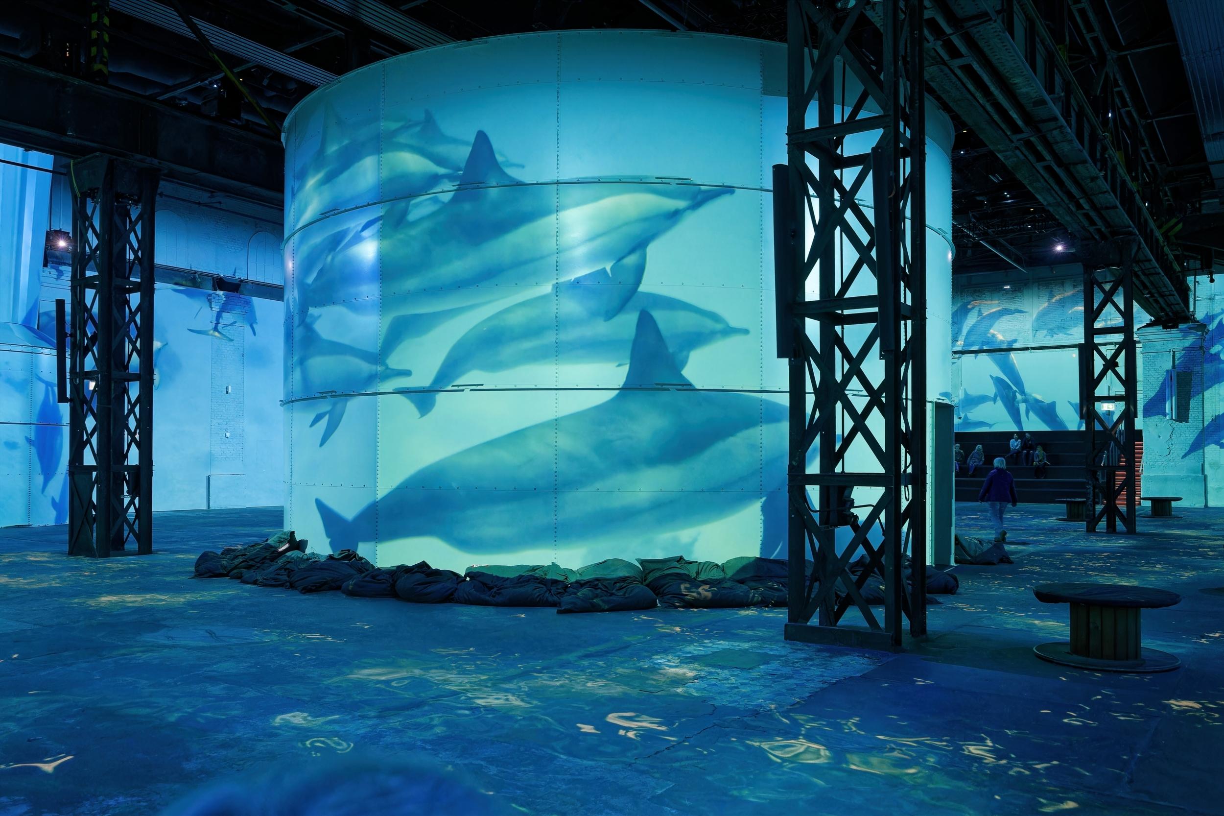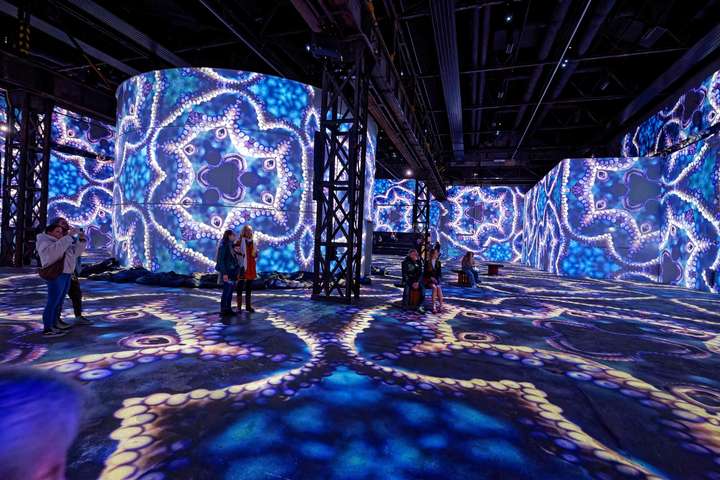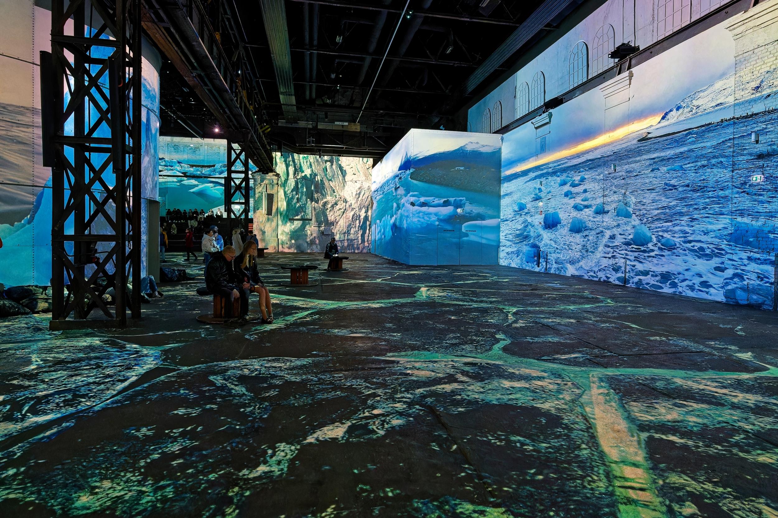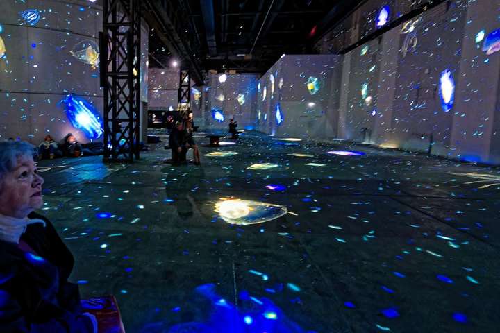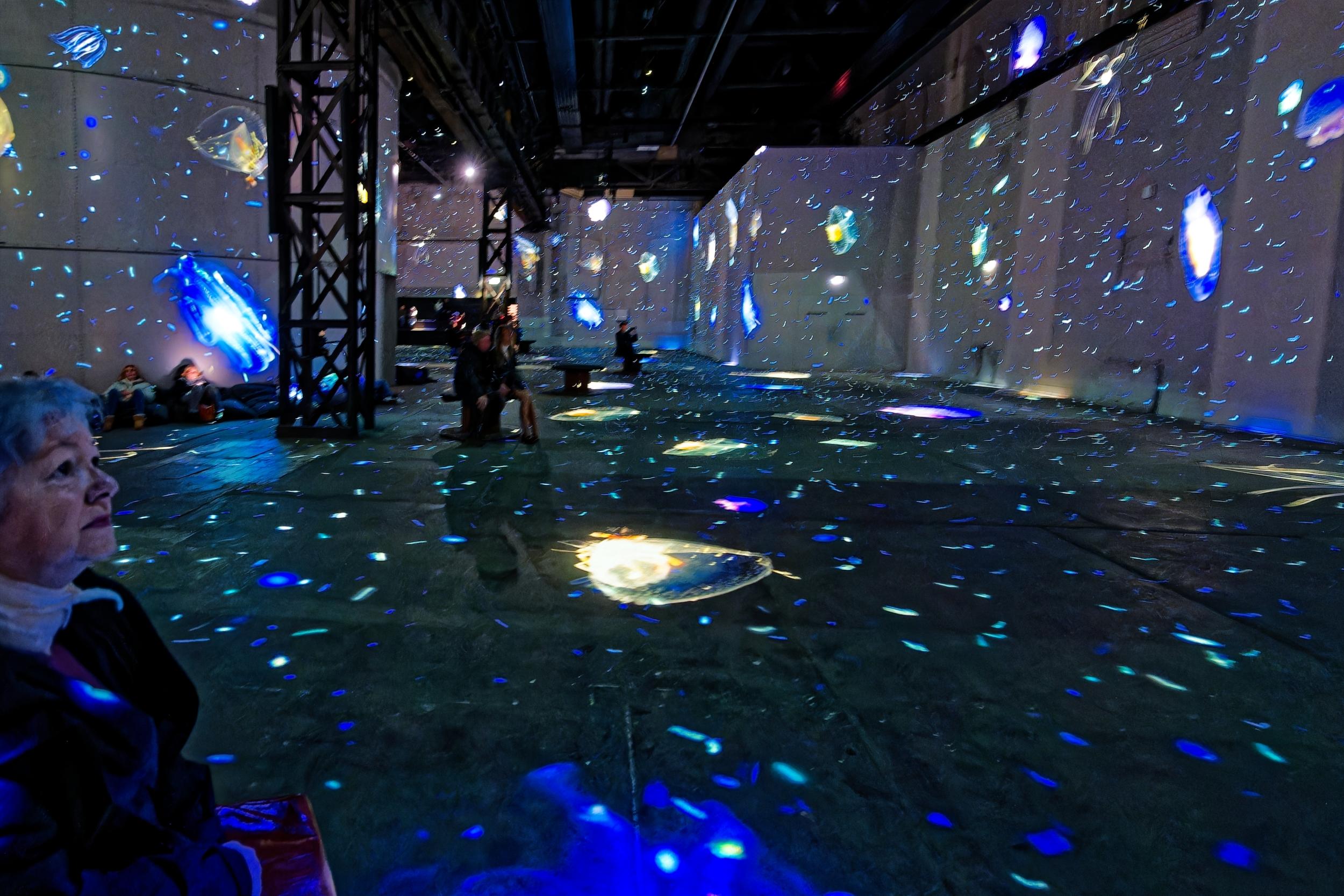 Gezeigt werden bewegte Bilder, musikalisch hinterlegt. Aber, das wäre ja noch nichts Besonderes. Besonders ist, das der gesamte Boden zu den 5.600 m² Projektionsfläche gehört und man also mittendrin steht und dass die Umgebung dieser ehemaligen Industriehalle die Bewegungen mitzumachen scheint. Wir waren wieder einmal fasziniert!