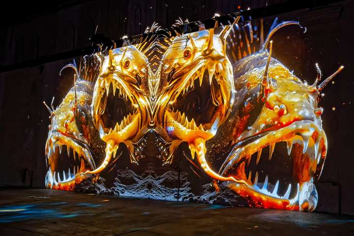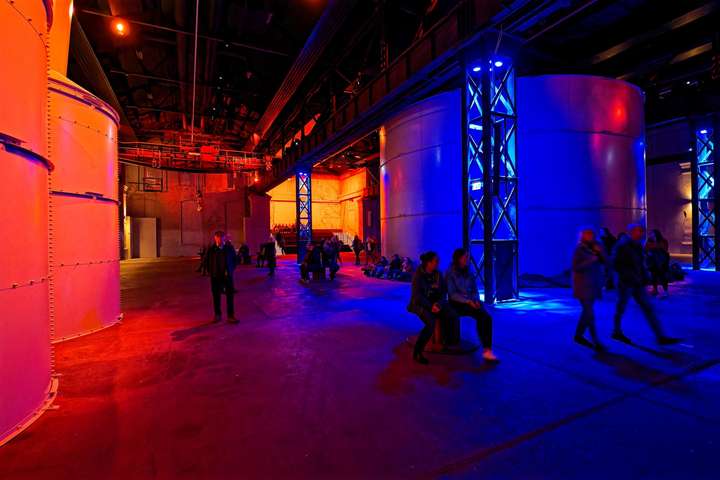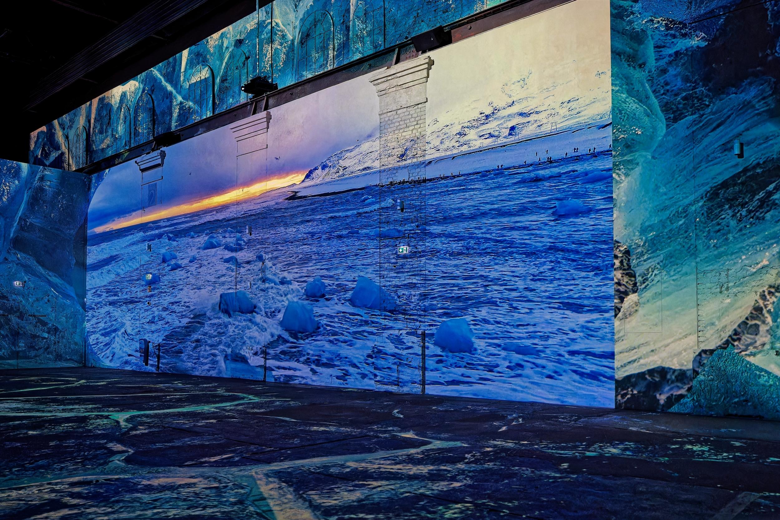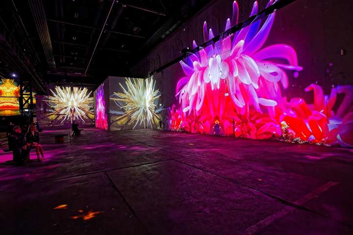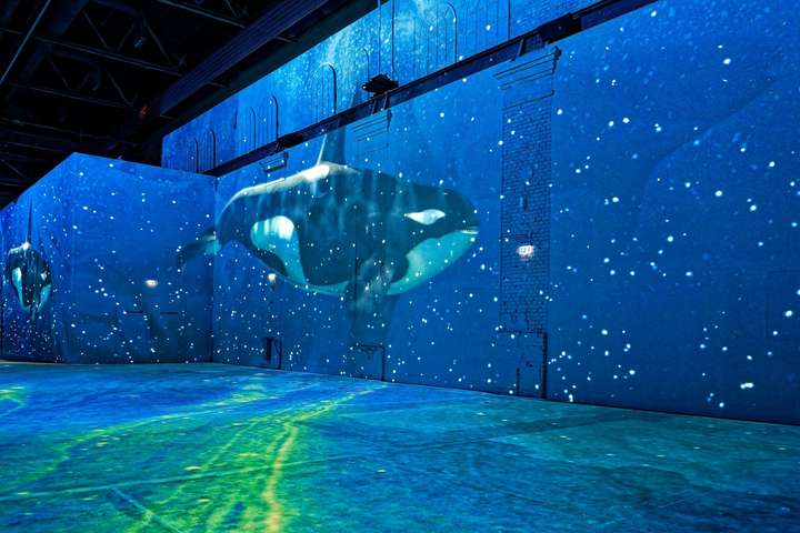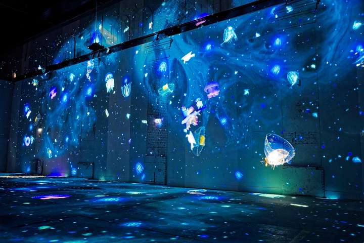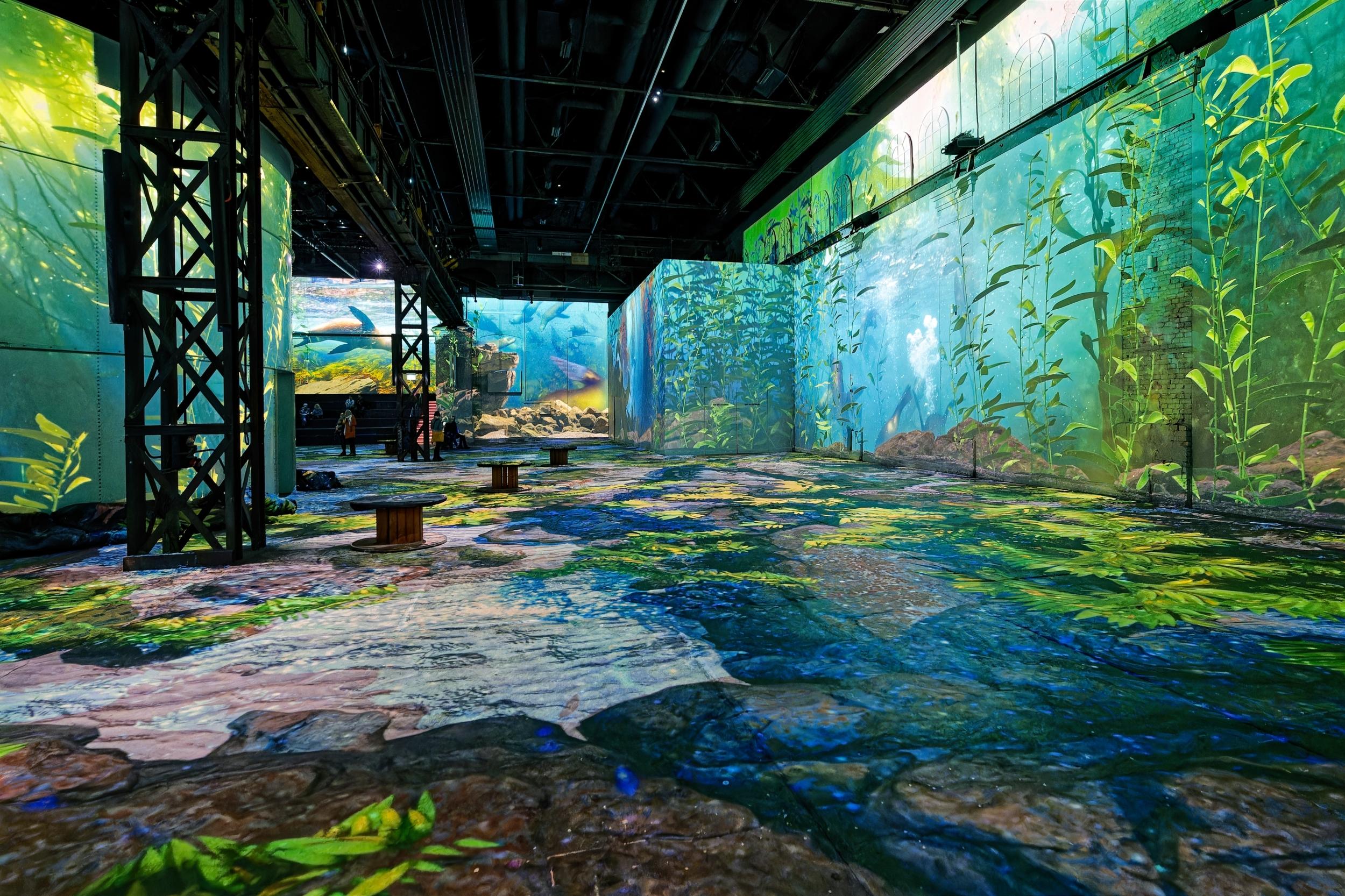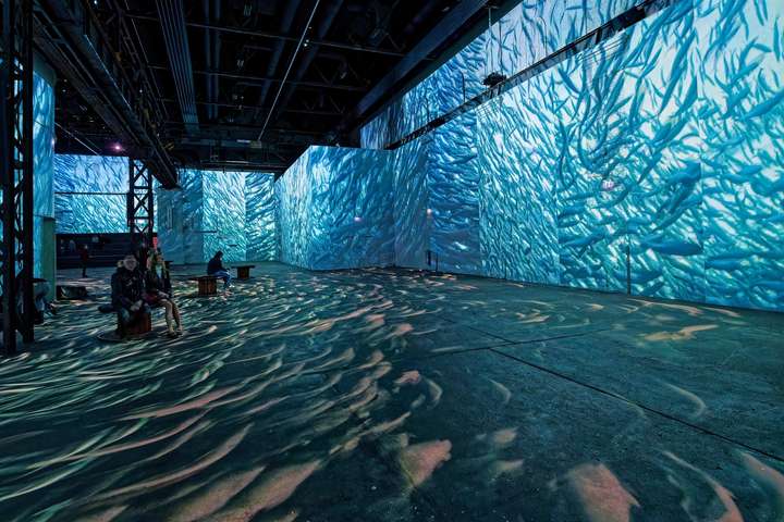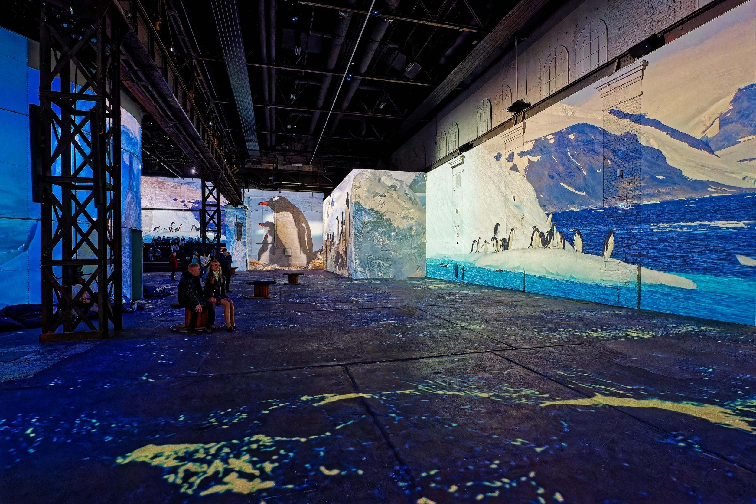 Gezeigt werden bewegte Bilder, musikalisch hinterlegt. Aber, das wäre ja noch nichts Besonderes. Besonders ist, das der gesamte Boden zu den 5.600 m² Projektionsfläche gehört und man also mittendrin steht und dass die Umgebung dieser ehemaligen Industriehalle die Bewegungen mitzumachen scheint. Wir waren wieder einmal fasziniert!