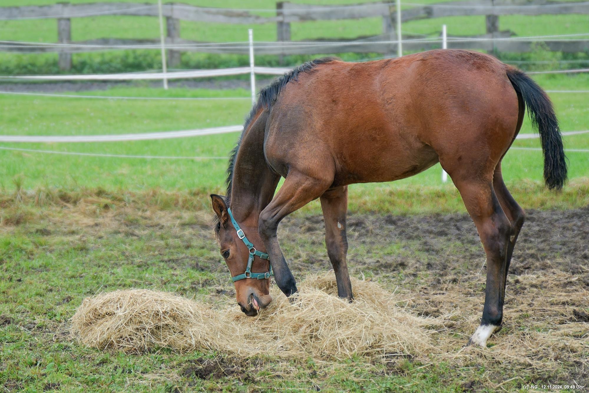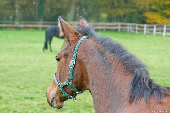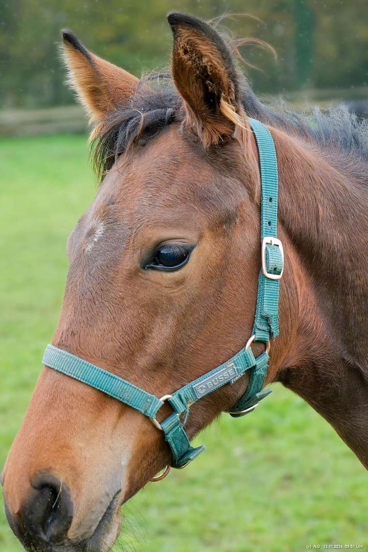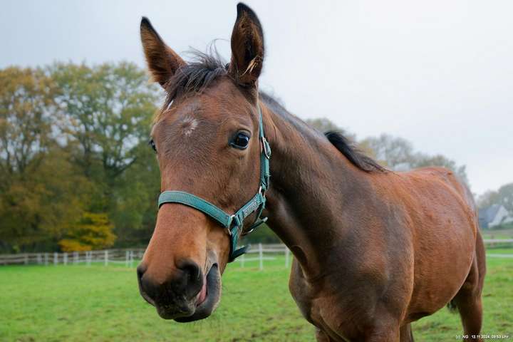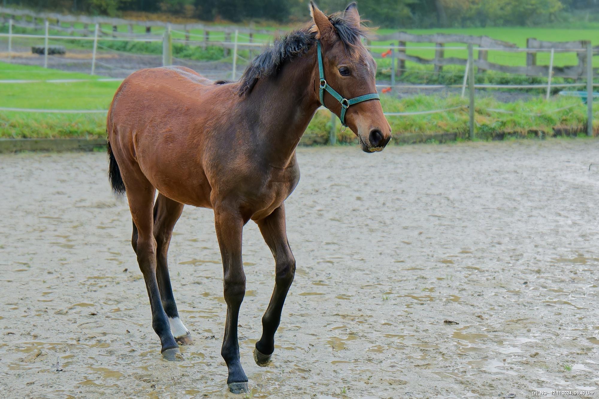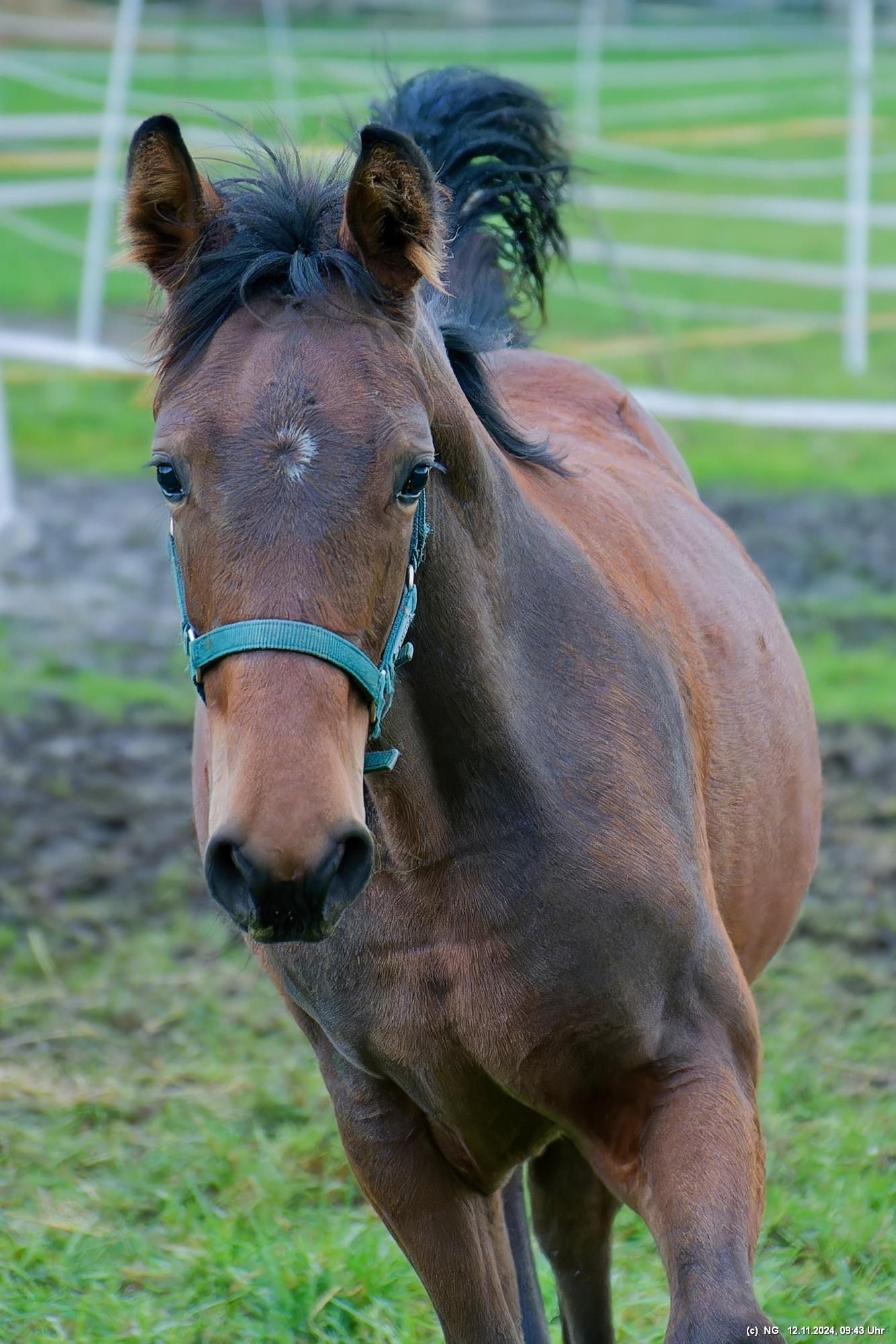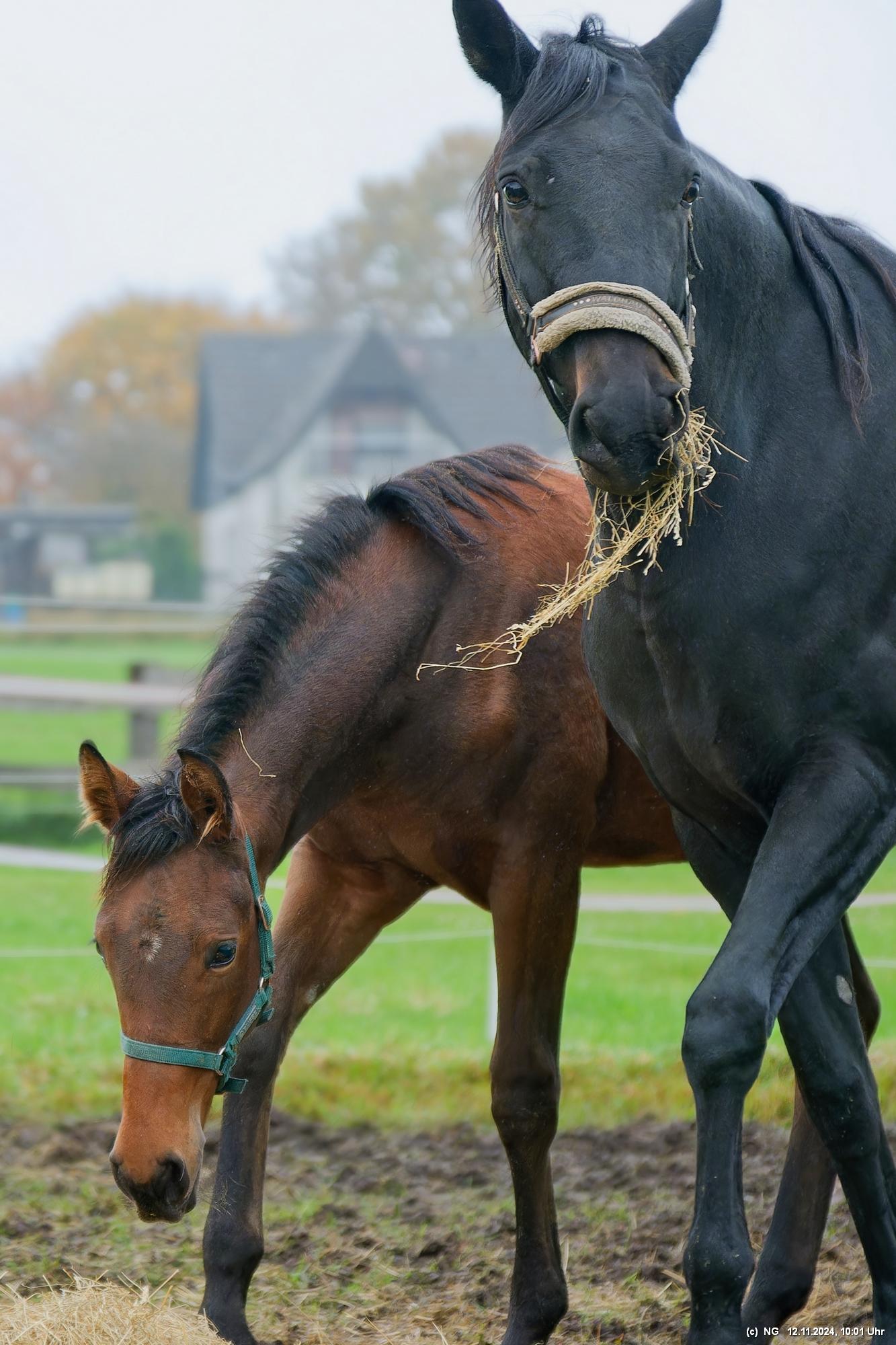 "EsCarlotta - M". Im Namen steckt die Abstammung von "Escolar", ein berühmter Name für den Ausnahmehengst mit einer Kadernominierung für Olympia in der Dressur. Der Vater der Mutterstute "Franziskus" hat bei Olympia 2024 in Paris teilgenommen. Ich bin ja nun nicht wirklich ein Pferdekenner, aber der von der jungen Dame gesuchte enge Kontakt (vornehmlich wohl zu meiner gelben Jacke) hat mich gerührt und gefreut. Leider ist der enge Kontakt zur Linse für Fotos nicht wirklich gut und die trübe Suppe (genannt: Wetter) schien anfangs nicht hilfreich zu sein, aber zwischendurch ergaben sich immer wieder einige Möglichkeiten. Dafür gab es keine störenden Kontraste. Wir bleiben am Ball - ähm - am Pferd!
