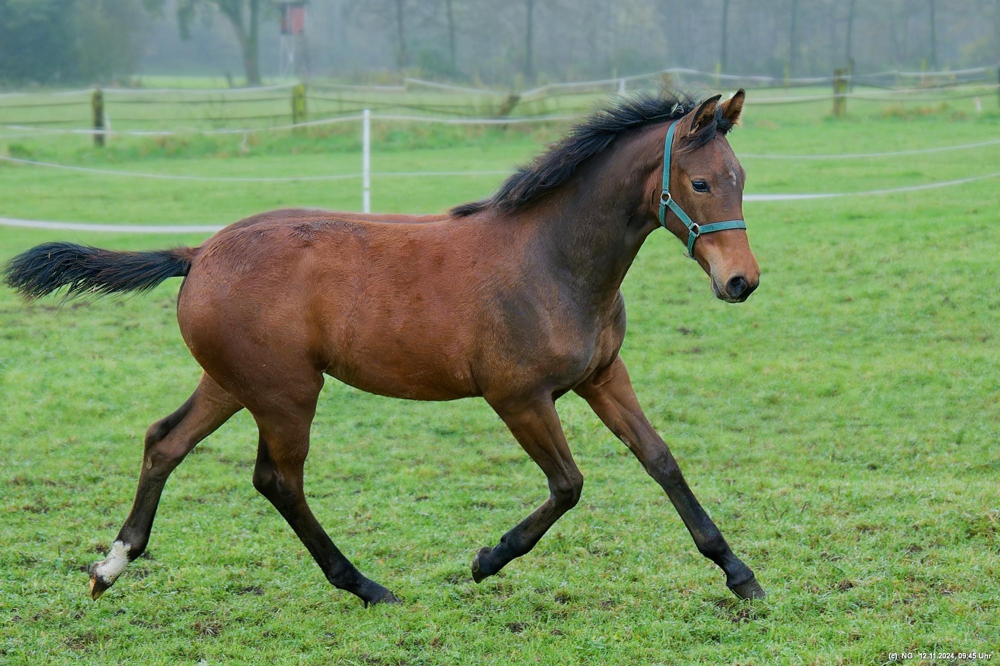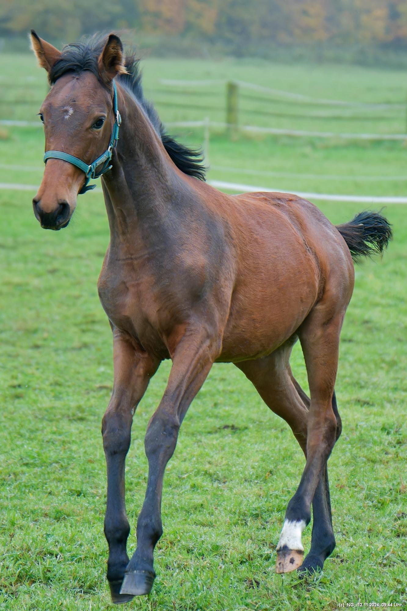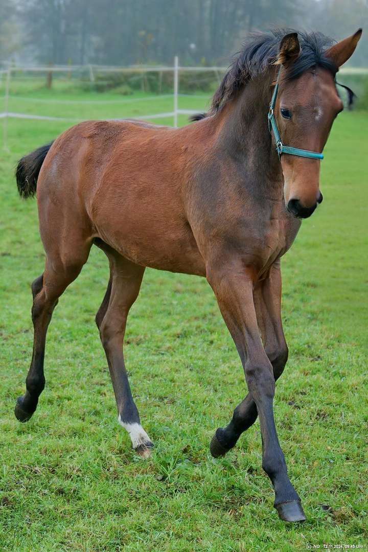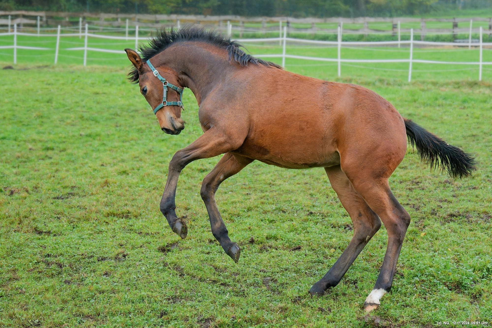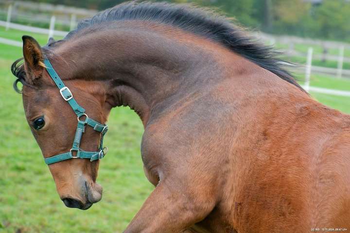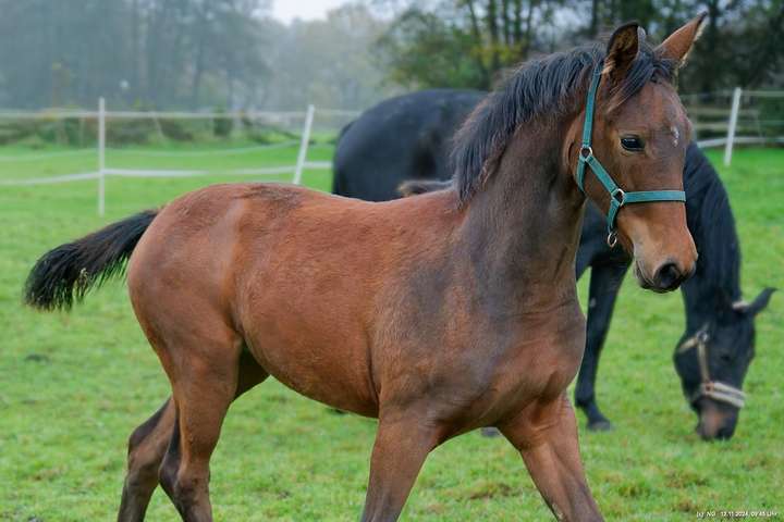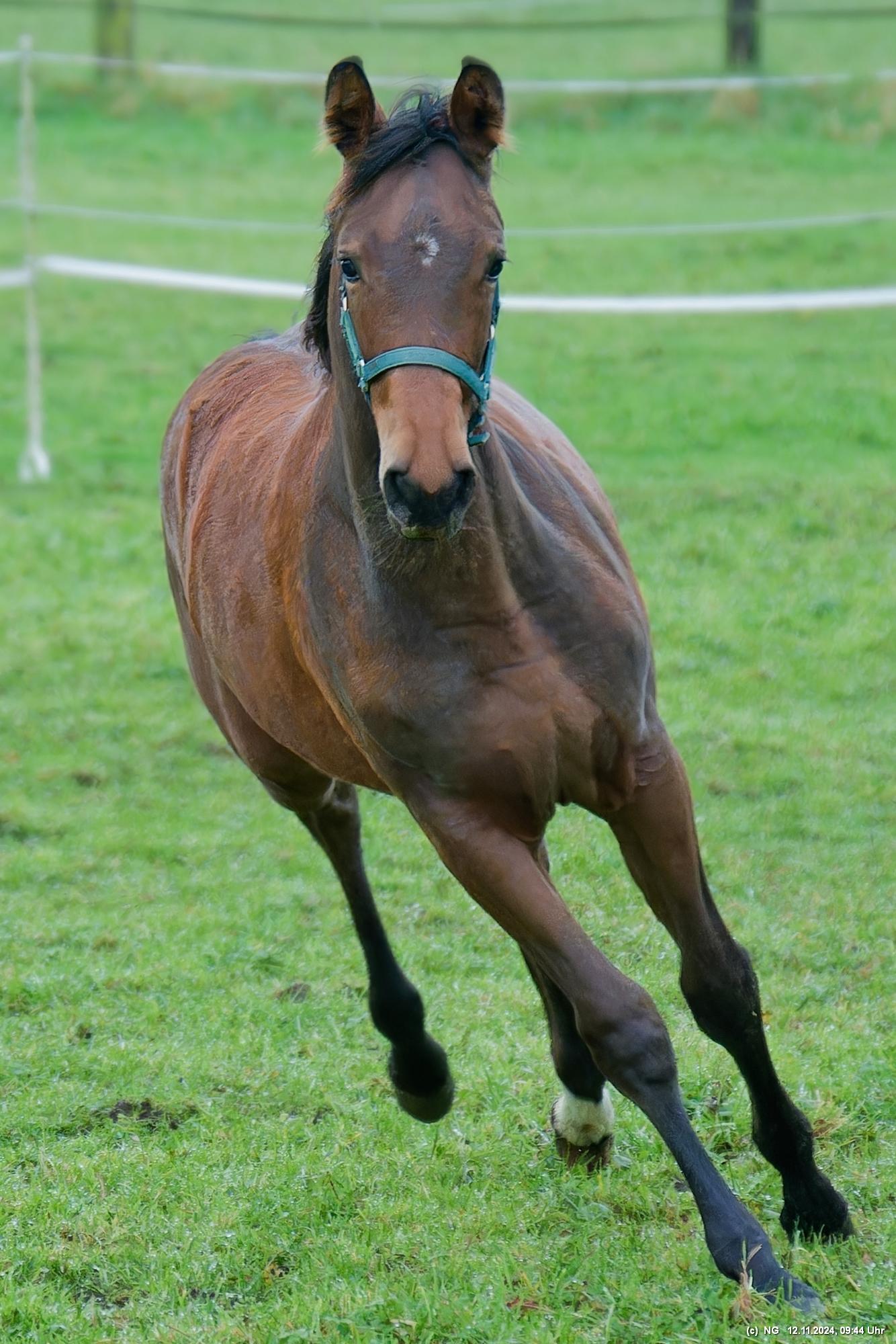 "EsCarlotta - M". Im Namen steckt die Abstammung von "Escolar", ein berühmter Name für den Ausnahmehengst mit einer Kadernominierung für Olympia in der Dressur. Der Vater der Mutterstute "Franziskus" hat bei Olympia 2024 in Paris teilgenommen. Ich bin ja nun nicht wirklich ein Pferdekenner, aber der von der jungen Dame gesuchte enge Kontakt (vornehmlich wohl zu meiner gelben Jacke) hat mich gerührt und gefreut. Leider ist der enge Kontakt zur Linse für Fotos nicht wirklich gut und die trübe Suppe (genannt: Wetter) schien anfangs nicht hilfreich zu sein, aber zwischendurch ergaben sich immer wieder einige Möglichkeiten. Dafür gab es keine störenden Kontraste. Wir bleiben am Ball - ähm - am Pferd!