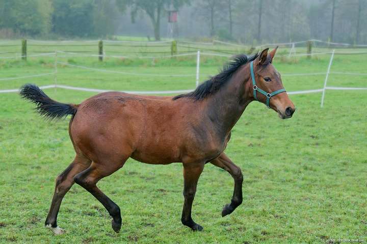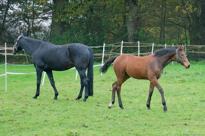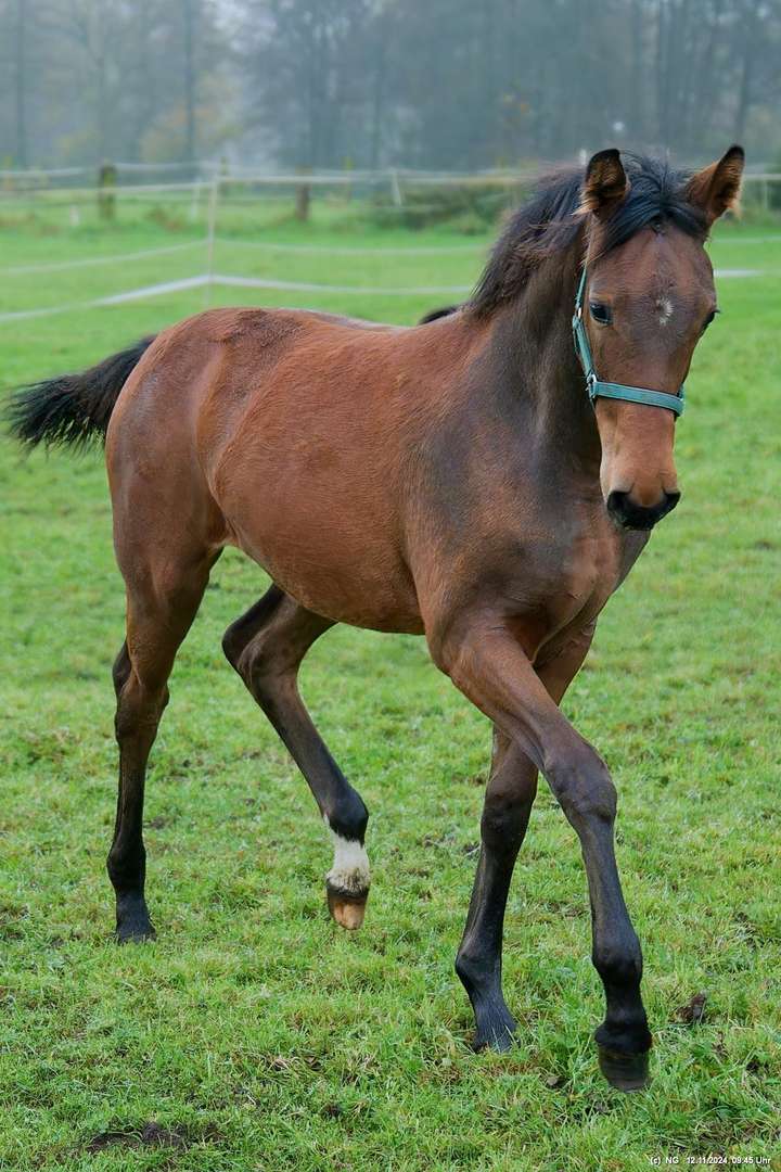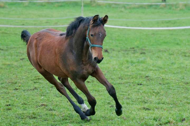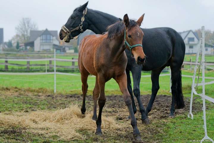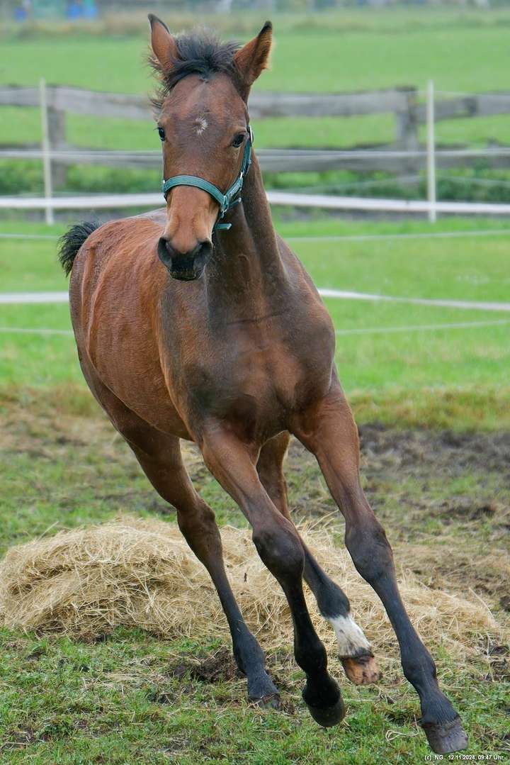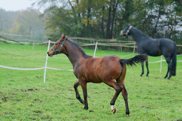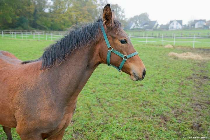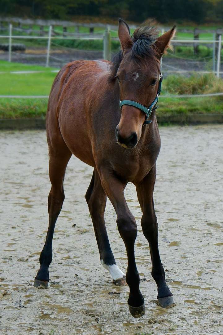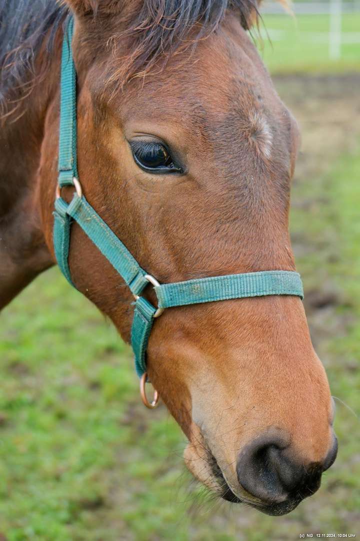 "EsCarlotta - M". Im Namen steckt die Abstammung von "Escolar", ein berühmter Name für den Ausnahmehengst mit einer Kadernominierung für Olympia in der Dressur. Der Vater der Mutterstute "Franziskus" hat bei Olympia 2024 in Paris teilgenommen. Ich bin ja nun nicht wirklich ein Pferdekenner, aber der von der jungen Dame gesuchte enge Kontakt (vornehmlich wohl zu meiner gelben Jacke) hat mich gerührt und gefreut. Leider ist der enge Kontakt zur Linse für Fotos nicht wirklich gut und die trübe Suppe (genannt: Wetter) schien anfangs nicht hilfreich zu sein, aber zwischendurch ergaben sich immer wieder einige Möglichkeiten. Dafür gab es keine störenden Kontraste. Wir bleiben am Ball - ähm - am Pferd!
