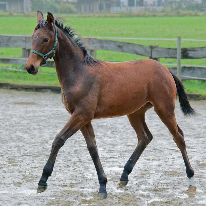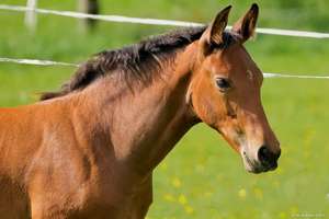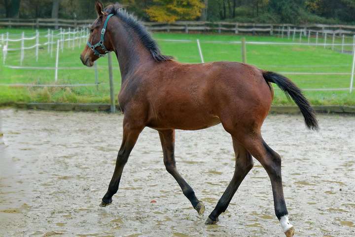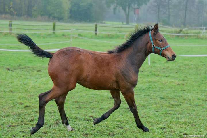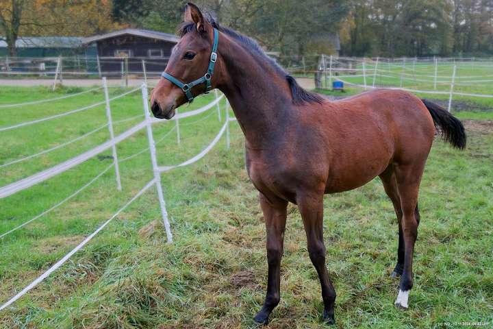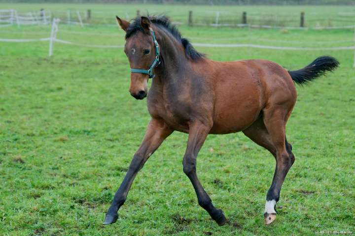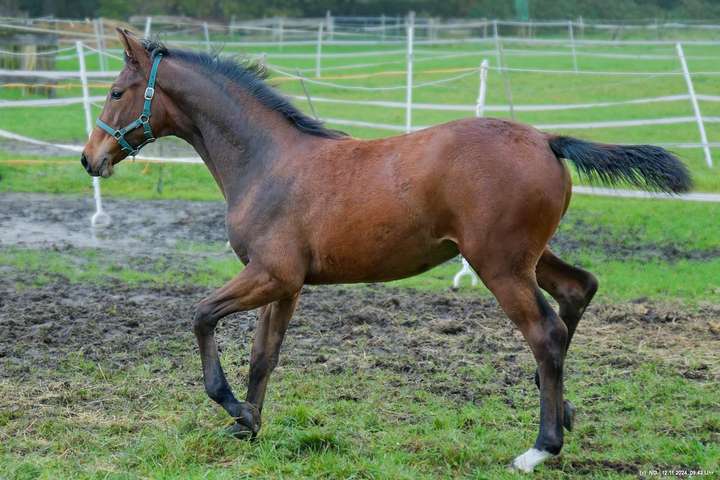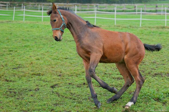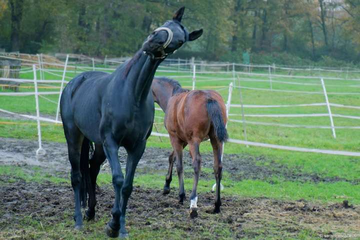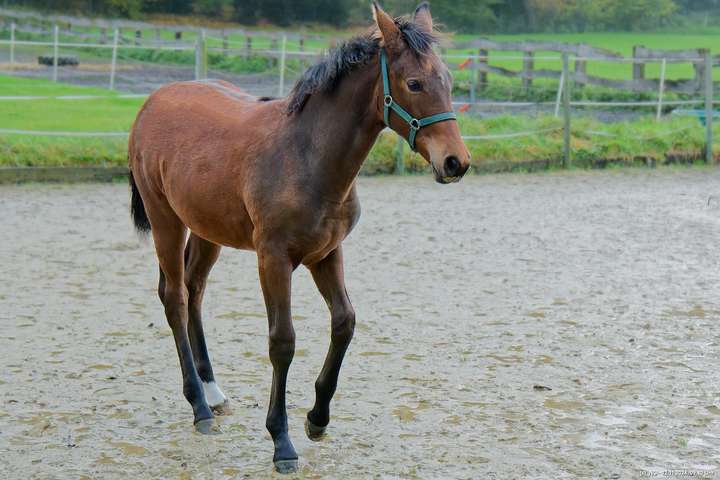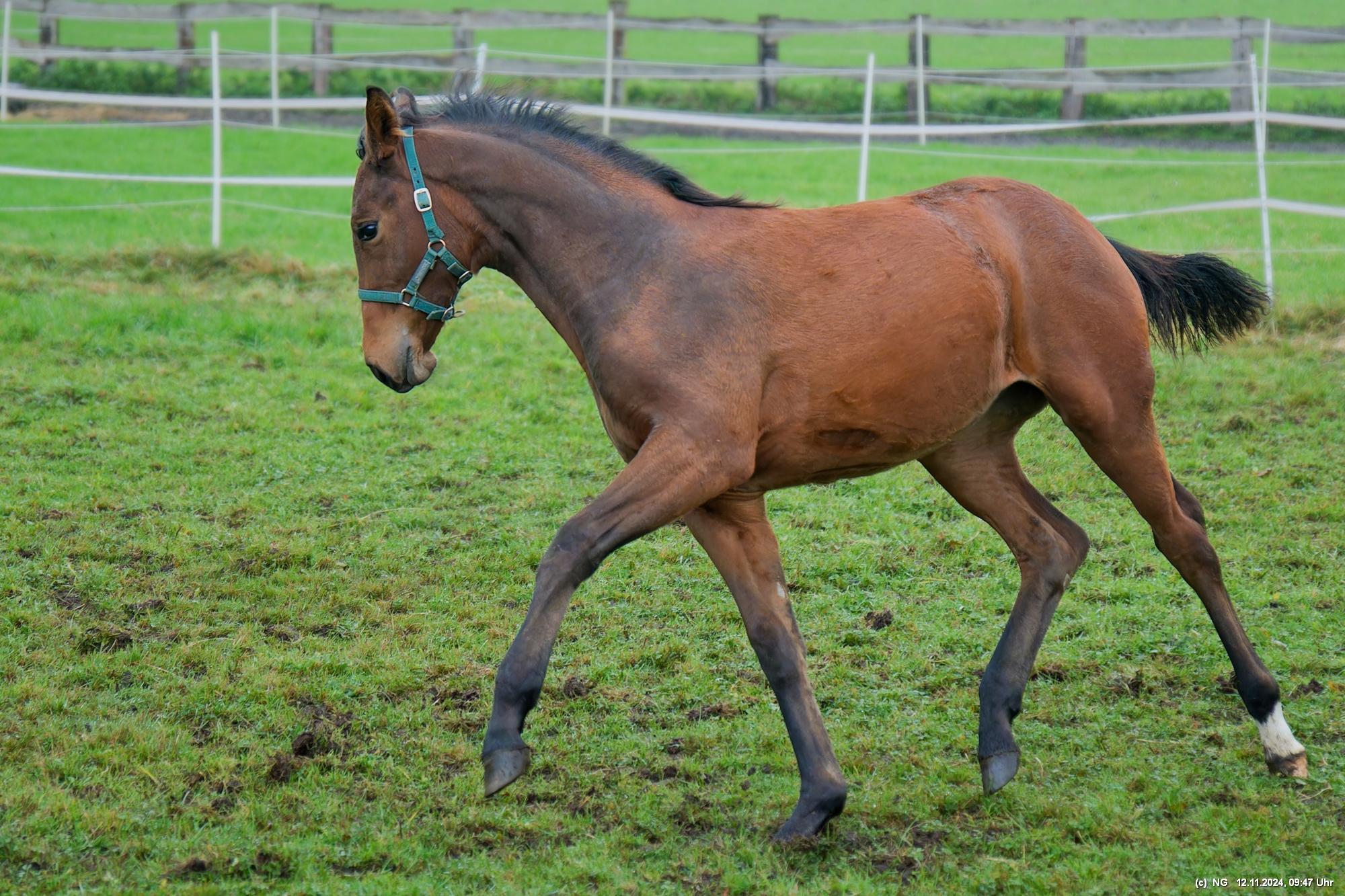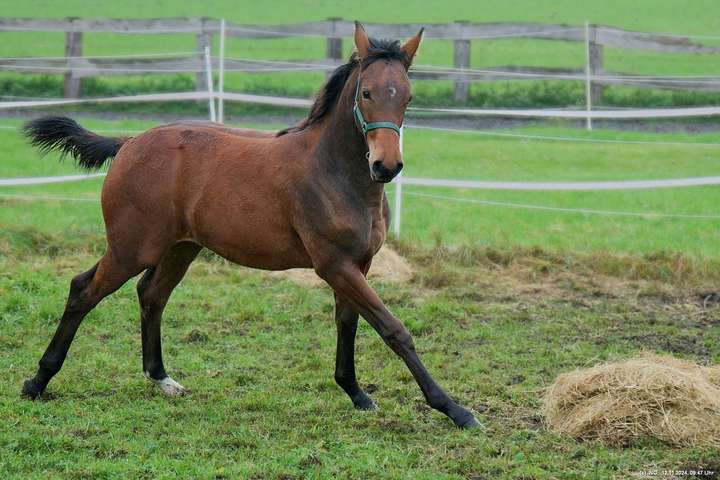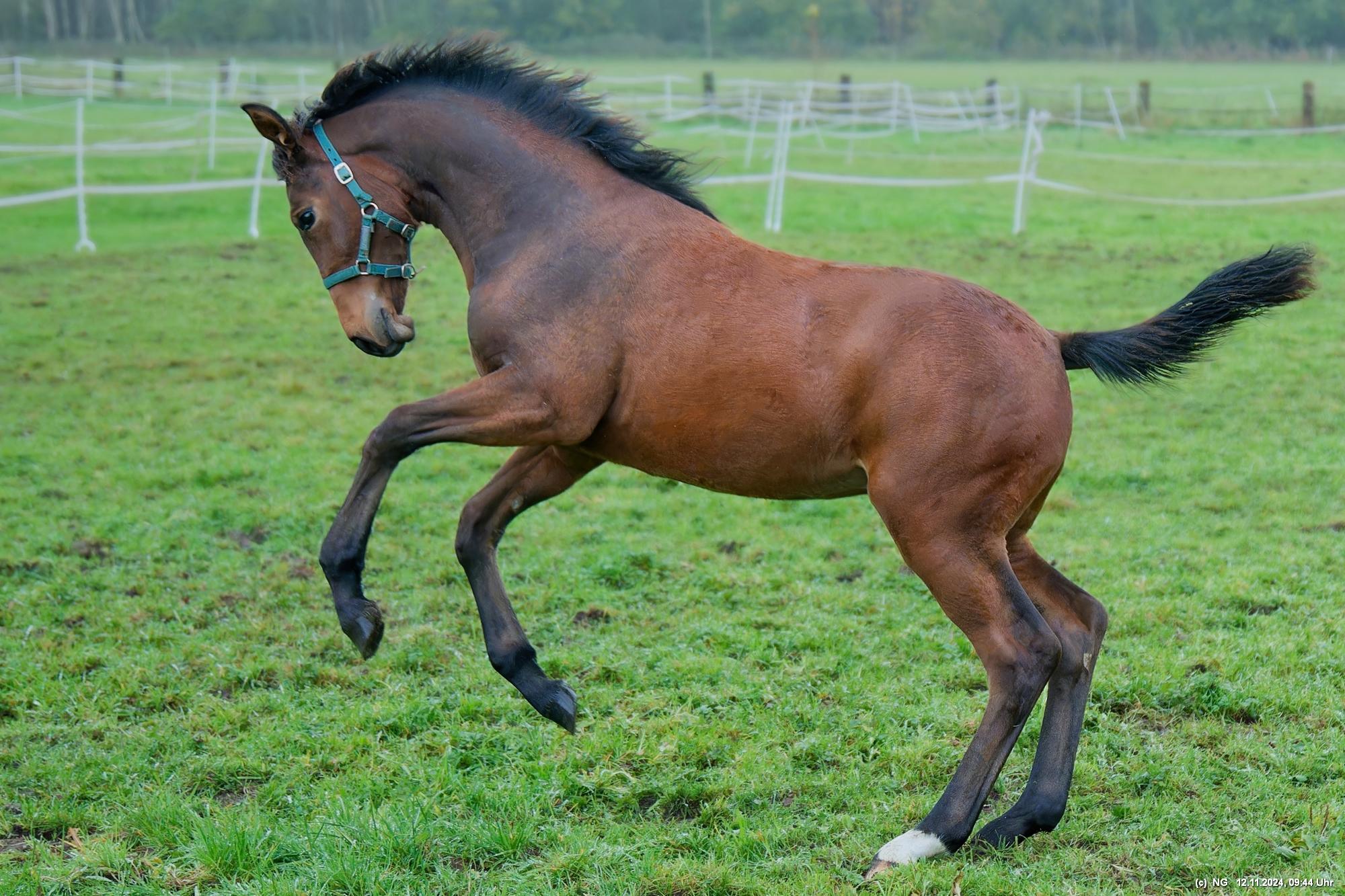 "EsCarlotta - M". Im Namen steckt die Abstammung von "Escolar", ein berühmter Name für den Ausnahmehengst mit einer Kadernominierung für Olympia in der Dressur. Der Vater der Mutterstute "Franziskus" hat bei Olympia 2024 in Paris teilgenommen. Ich bin ja nun nicht wirklich ein Pferdekenner, aber der von der jungen Dame gesuchte enge Kontakt (vornehmlich wohl zu meiner gelben Jacke) hat mich gerührt und gefreut. Leider ist der enge Kontakt zur Linse für Fotos nicht wirklich gut und die trübe Suppe (genannt: Wetter) schien anfangs nicht hilfreich zu sein, aber zwischendurch ergaben sich immer wieder einige Möglichkeiten. Dafür gab es keine störenden Kontraste. Wir bleiben am Ball - ähm - am Pferd!