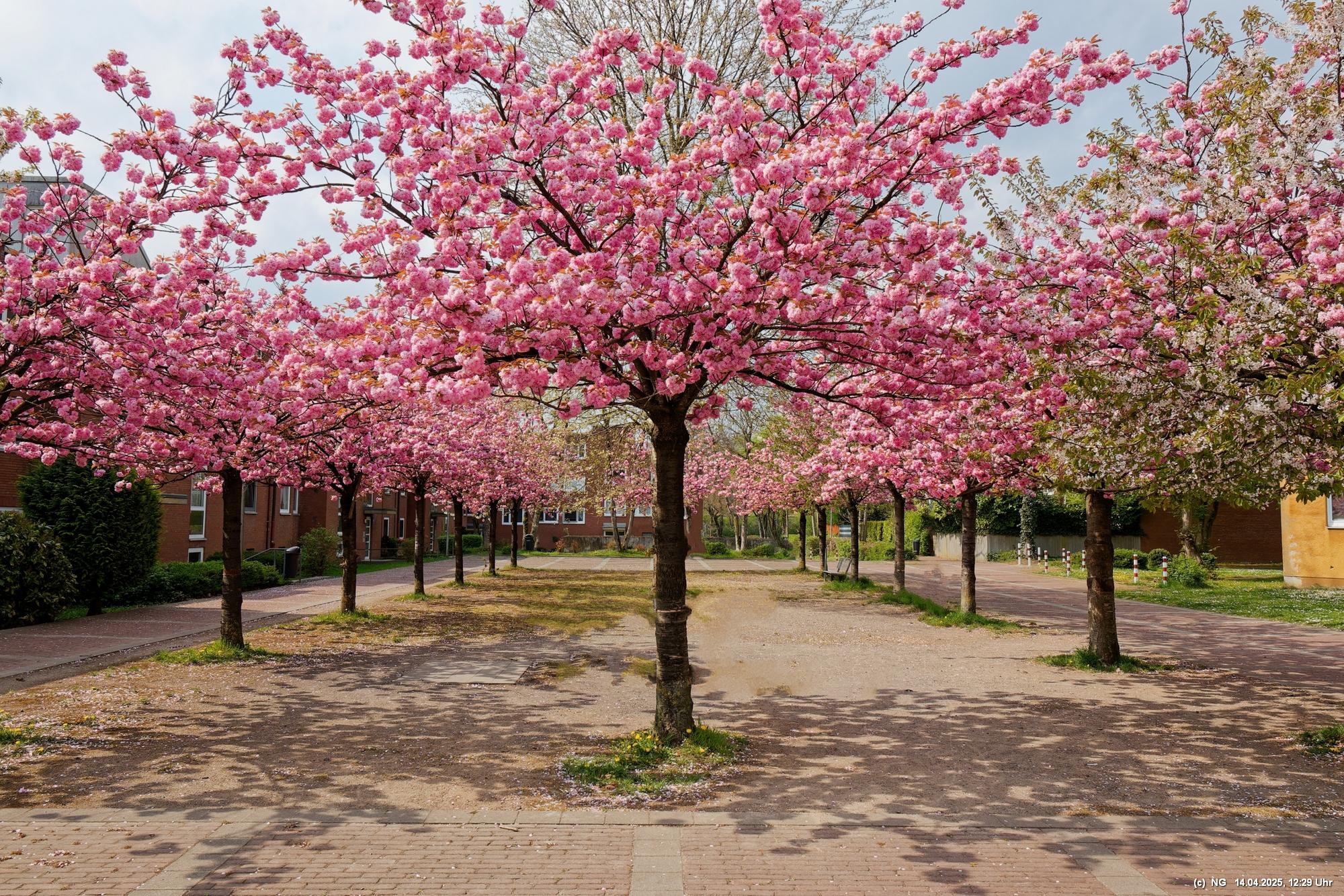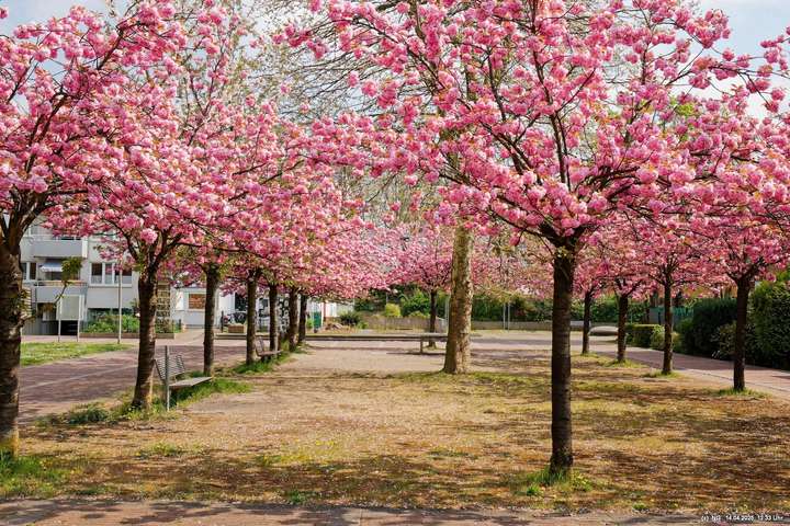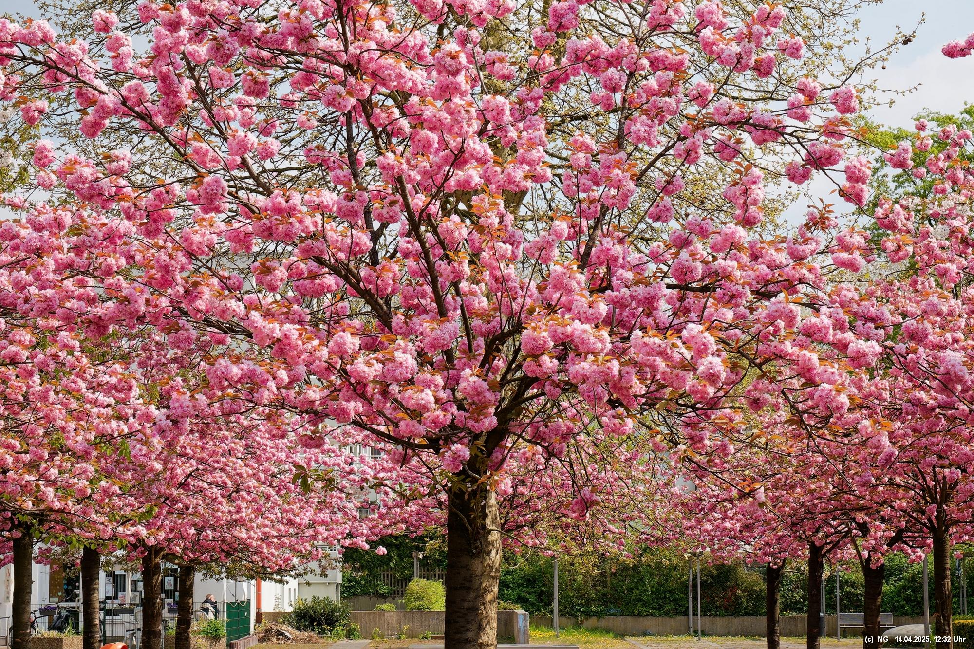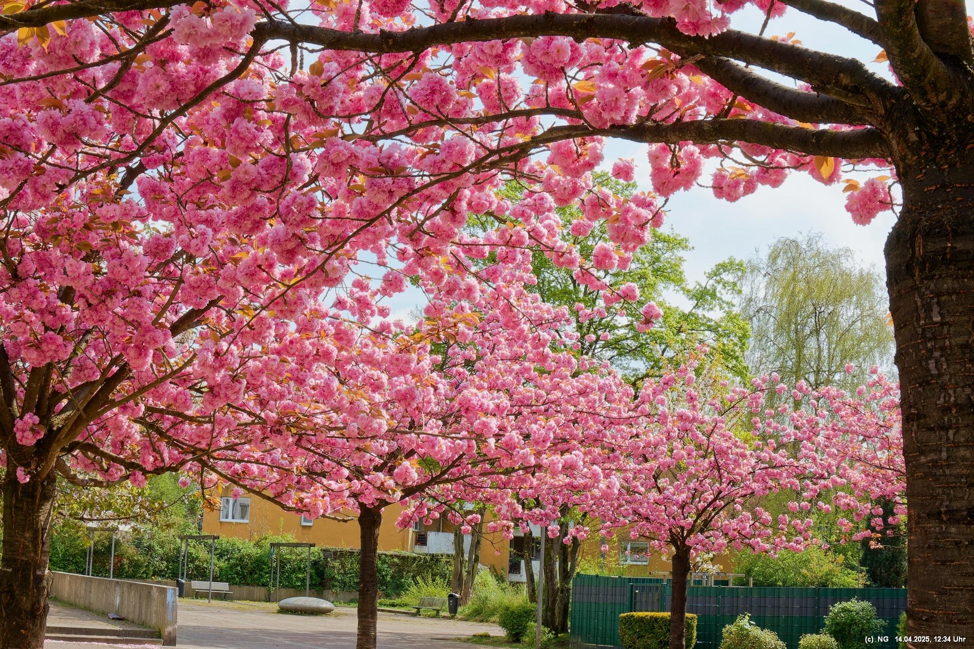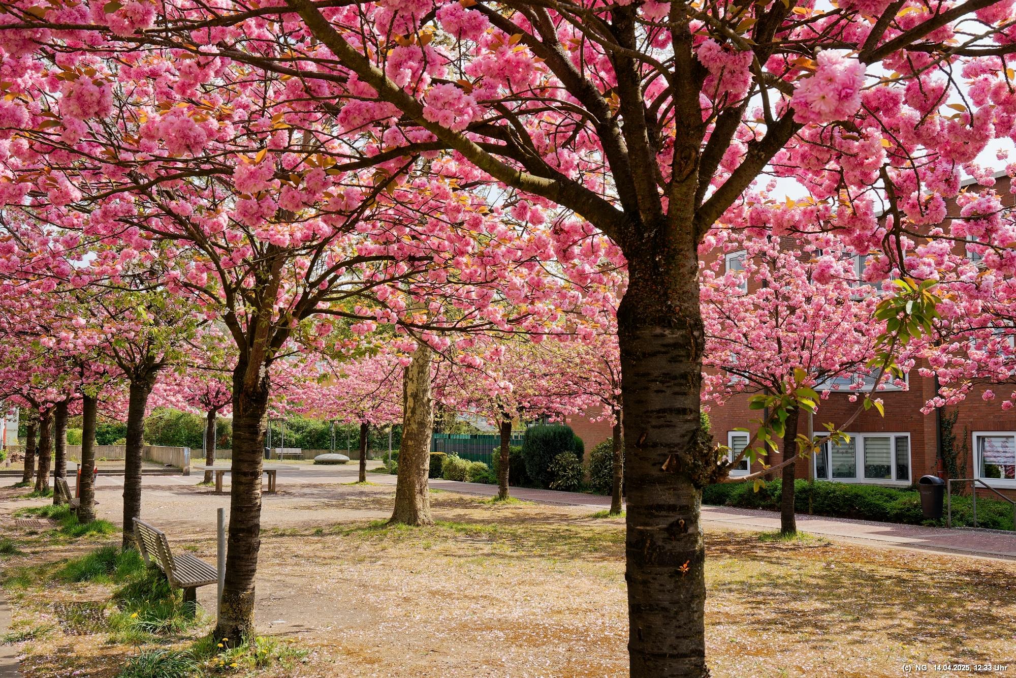 In Dorsten-Barkenberg gibt es ein wenig abseits der Straße und kaum erkennbar den Surickplatz. Dort stehen, abseits des Straßenverkehrs, 16 prächtige, 15 Jahre alte Zierkirschenbäume in voller Blüte. Die Fläche ist nicht groß, aber man sieht kaum Menschen - schon gar keine Fremden. Niemand also stört also die Ansicht und der Fotograf ist begeistert - und das in der Mittagszeit.