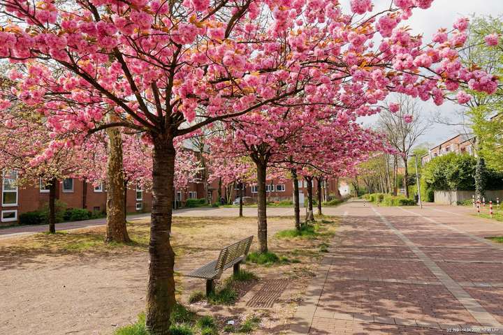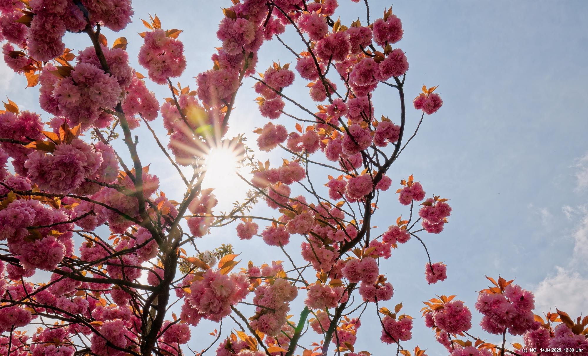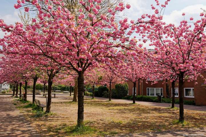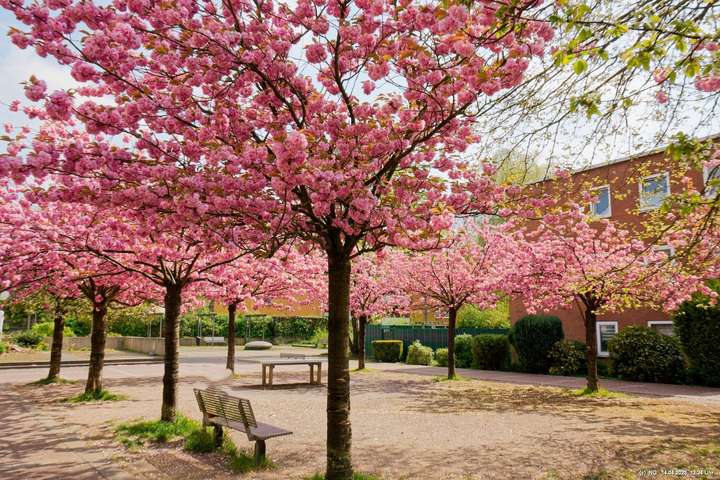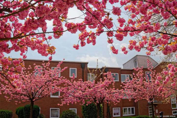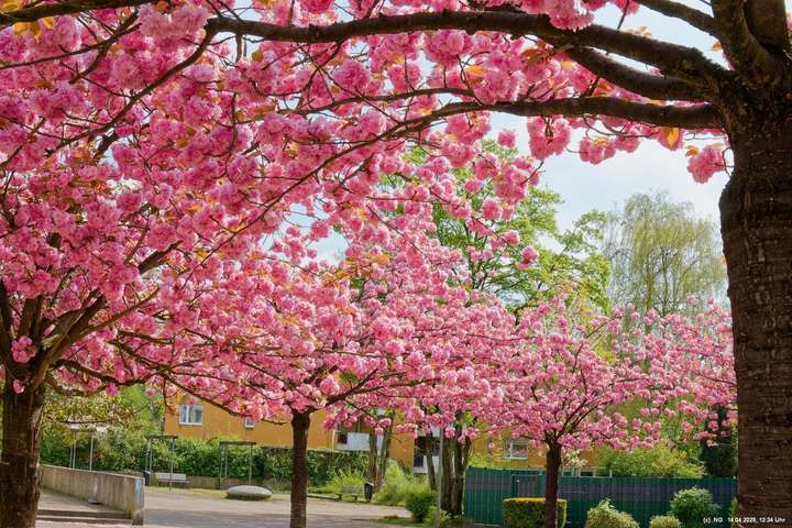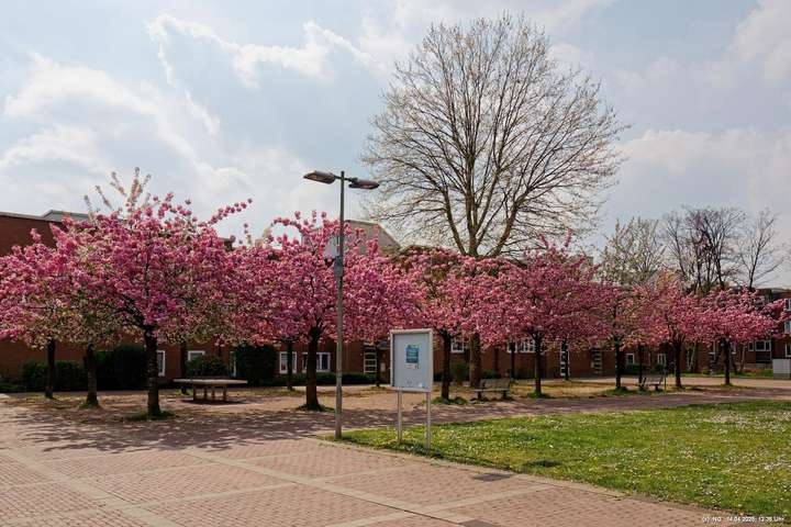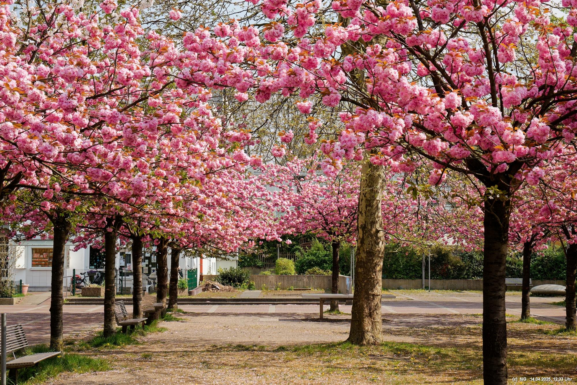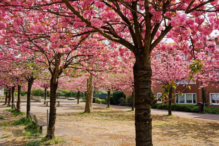 In Dorsten-Barkenberg gibt es ein wenig abseits der Straße und kaum erkennbar den Surickplatz. Dort stehen, abseits des Straßenverkehrs, 16 prächtige, 15 Jahre alte Zierkirschenbäume in voller Blüte. Die Fläche ist nicht groß, aber man sieht kaum Menschen - schon gar keine Fremden. Niemand also stört also die Ansicht und der Fotograf ist begeistert - und das in der Mittagszeit.