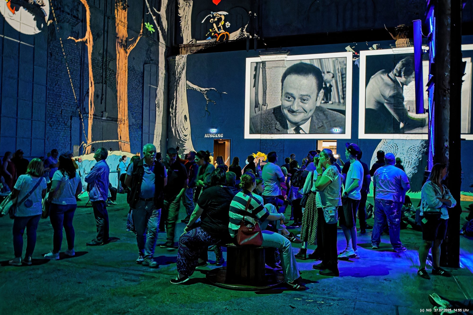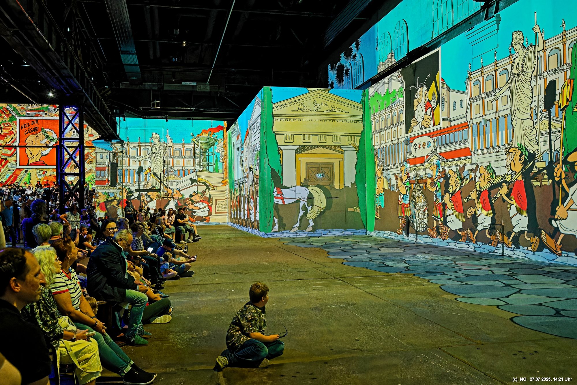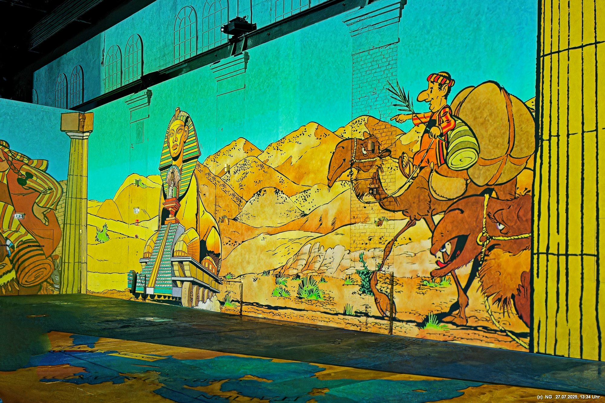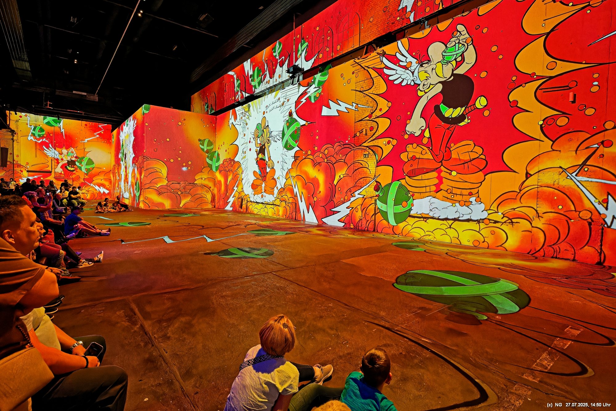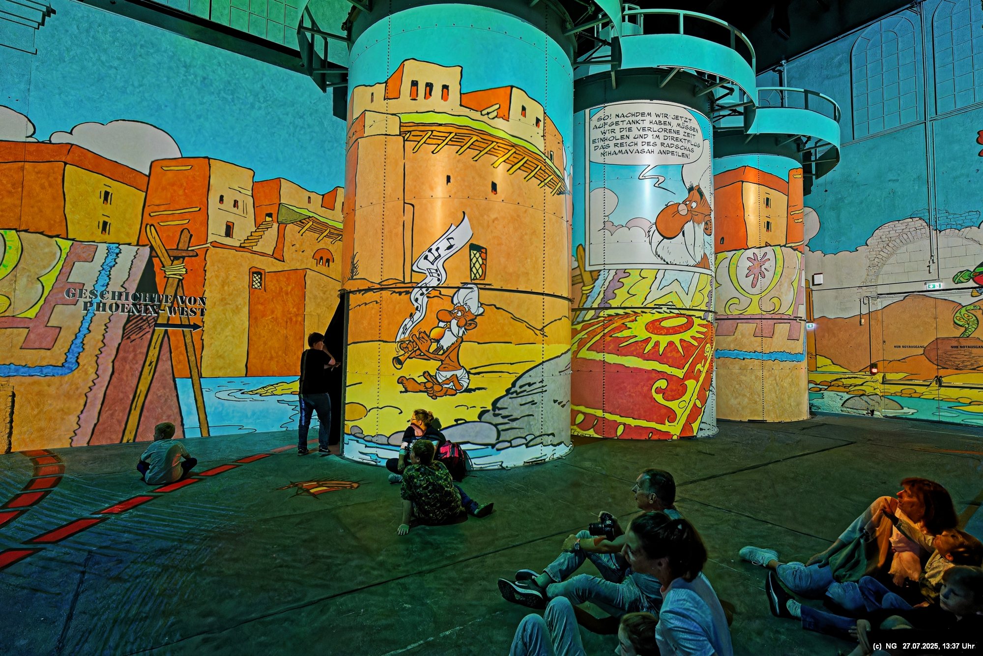 Die Hütte war richtig voll. Klar, es war Sonntag und auch noch Nachmittag. Wer nicht schon im Urlaub war, hatte dort die Möglichkeit, sich köstlich zu unterhalten. Bei den Erwachsenen kam dann die Erinnerung an diese famosen Zeichengeschichten. Es war kurzweilig. Die Bilder rauschten in 45 Minuten vorbei über die 5.600 m² Projektionsfläche, zu der auch der Boden gehört. Wenn noch Platz war, stand man dann mittendrin in der Projektion. So wollte der fliegende Teppich vor uns landen. Technisch war das perfekt gemacht. Wir waren in der Umgebung dieser ehemaligen Industriehalle wieder einmal fasziniert!