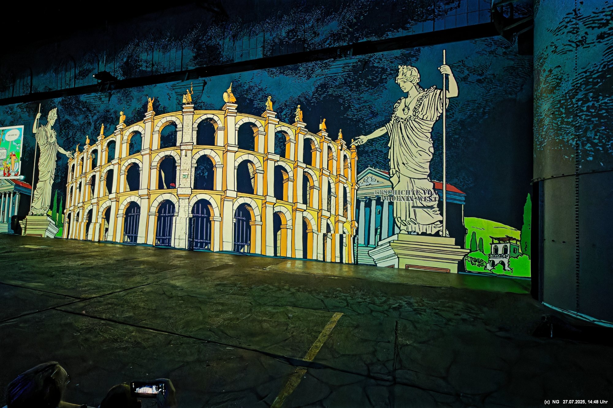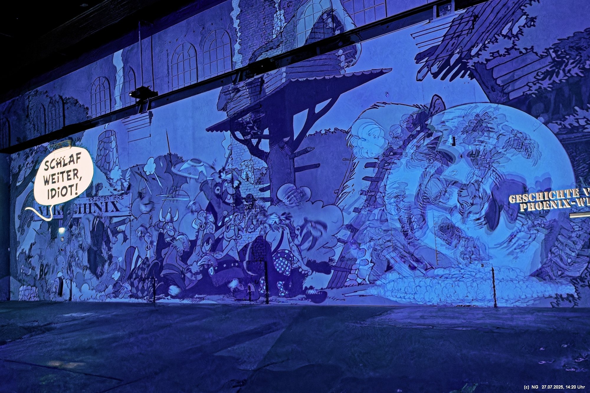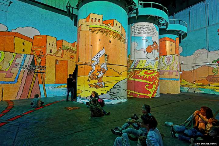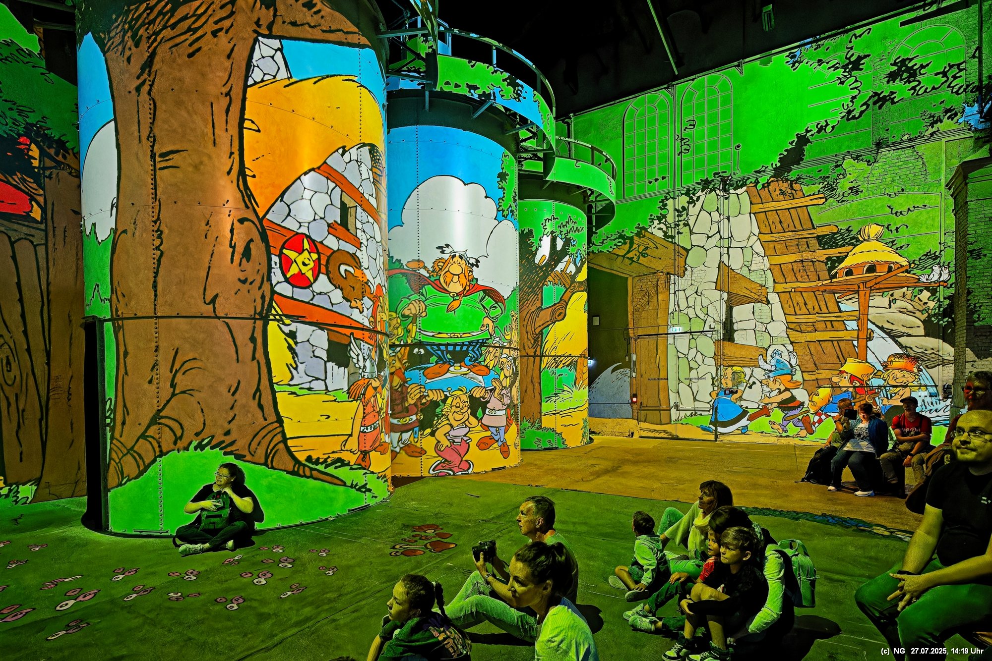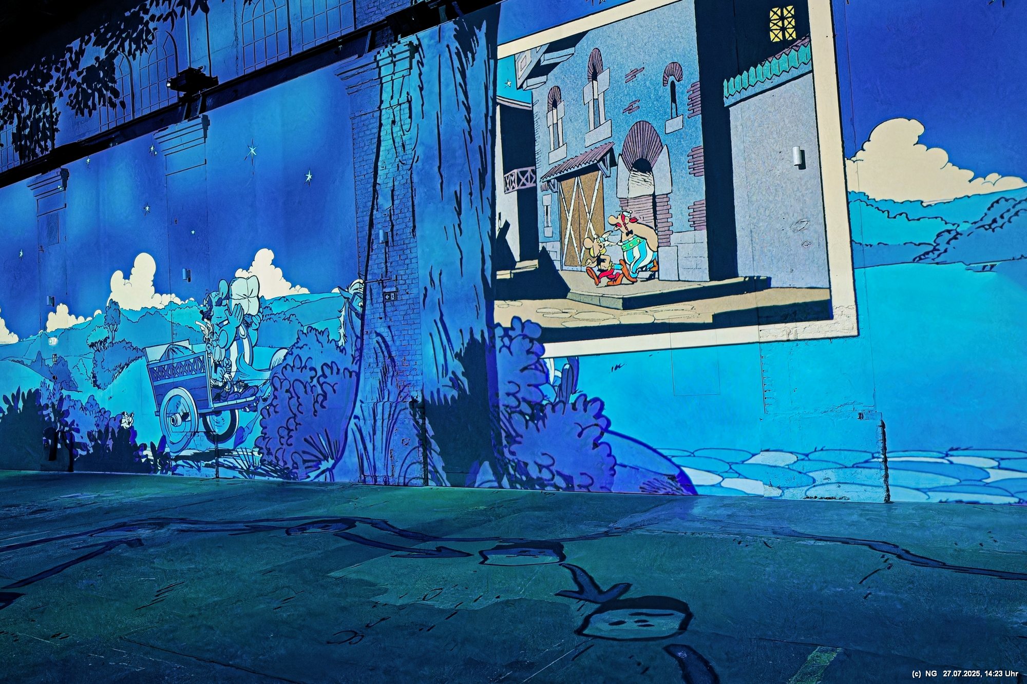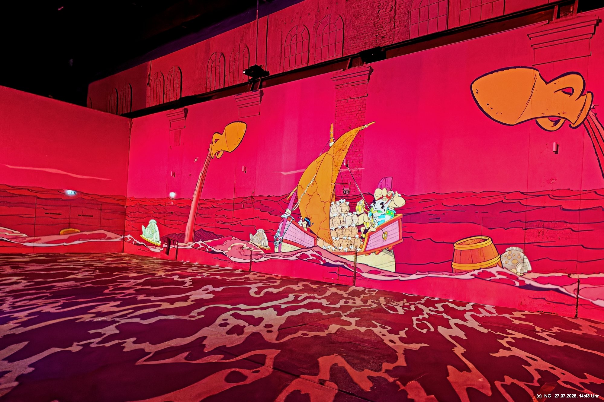 Die Hütte war richtig voll. Klar, es war Sonntag und auch noch Nachmittag. Wer nicht schon im Urlaub war, hatte dort die Möglichkeit, sich köstlich zu unterhalten. Bei den Erwachsenen kam dann die Erinnerung an diese famosen Zeichengeschichten. Es war kurzweilig. Die Bilder rauschten in 45 Minuten vorbei über die 5.600 m² Projektionsfläche, zu der auch der Boden gehört. Wenn noch Platz war, stand man dann mittendrin in der Projektion. So wollte der fliegende Teppich vor uns landen. Technisch war das perfekt gemacht. Wir waren in der Umgebung dieser ehemaligen Industriehalle wieder einmal fasziniert!