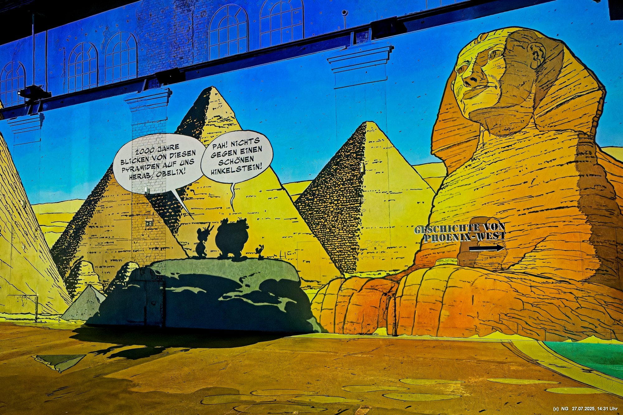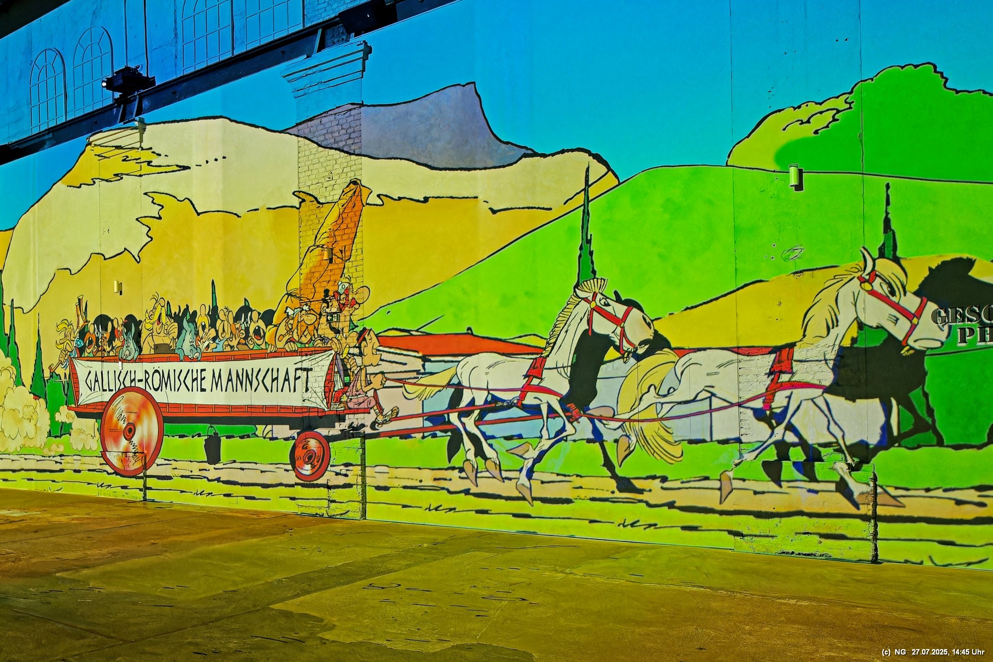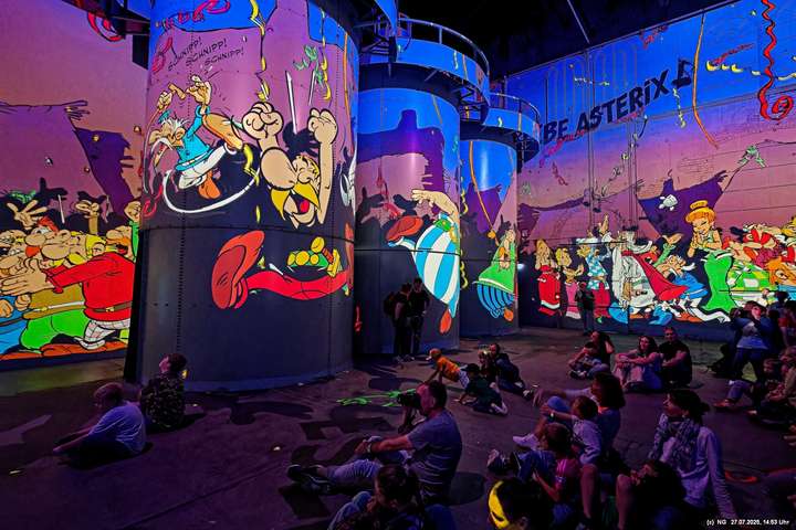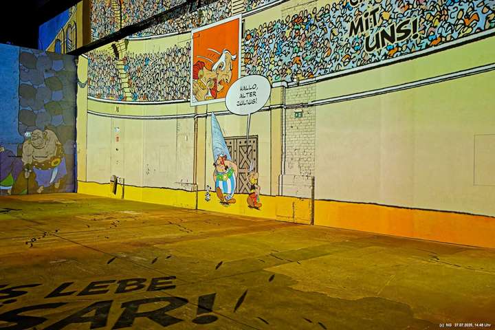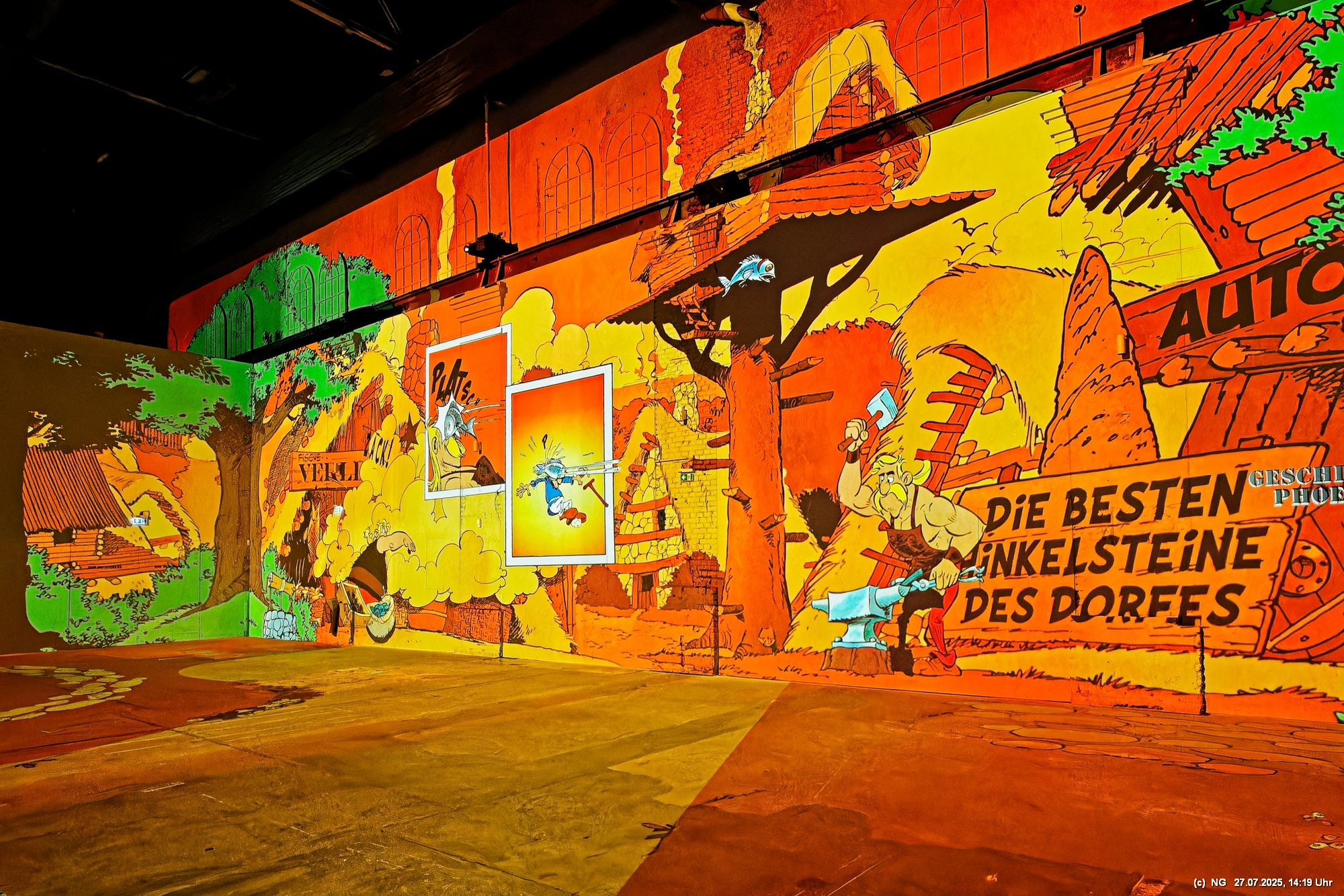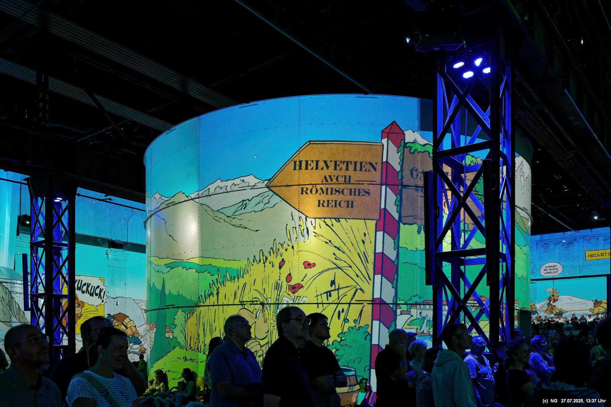Die Hütte war richtig voll. Klar, es war Sonntag und auch noch Nachmittag. Wer nicht schon im Urlaub war, hatte dort die Möglichkeit, sich köstlich zu unterhalten. Bei den Erwachsenen kam dann die Erinnerung an diese famosen Zeichengeschichten. Es war kurzweilig. Die Bilder rauschten in 45 Minuten vorbei über die 5.600 m² Projektionsfläche, zu der auch der Boden gehört. Wenn noch Platz war, stand man dann mittendrin in der Projektion. So wollte der fliegende Teppich vor uns landen. Technisch war das perfekt gemacht. Wir waren in der Umgebung dieser ehemaligen Industriehalle wieder einmal fasziniert!
