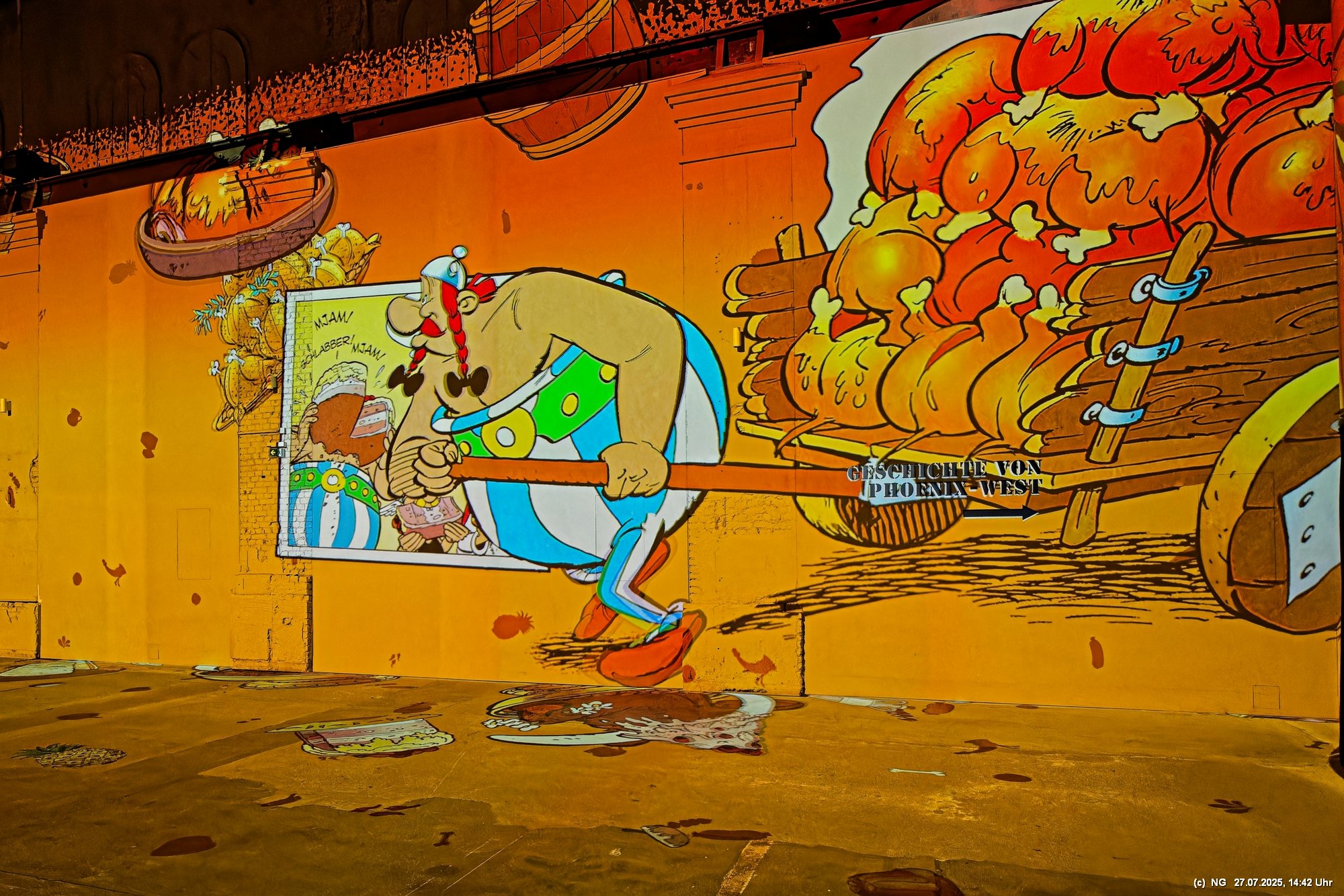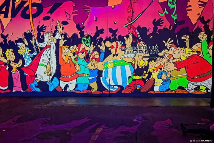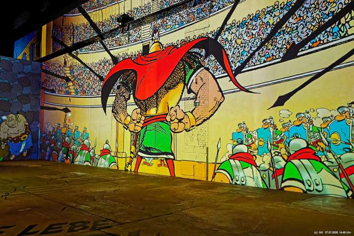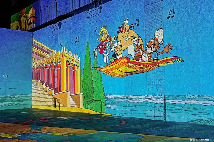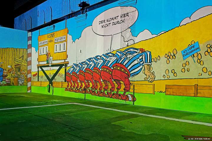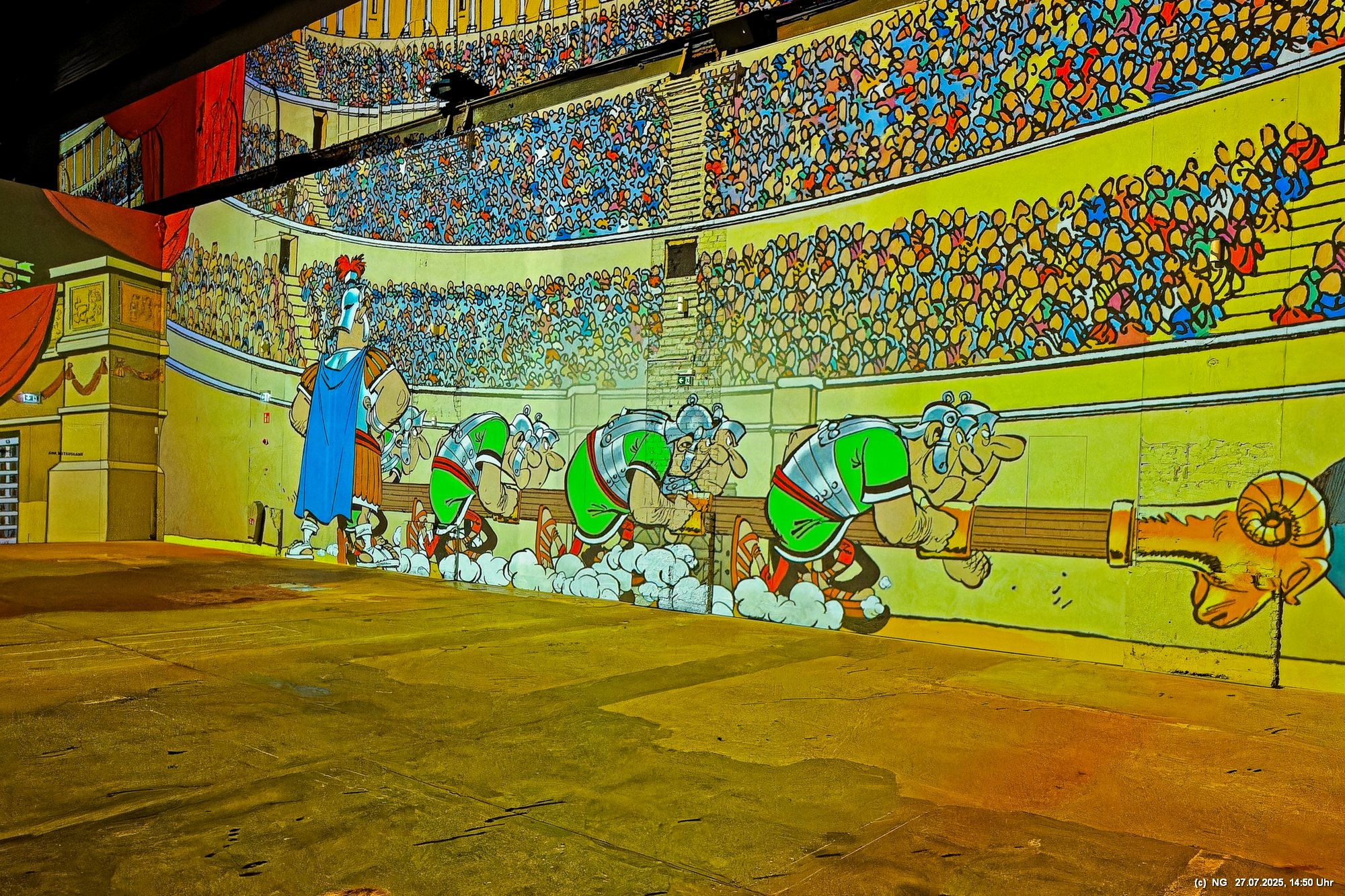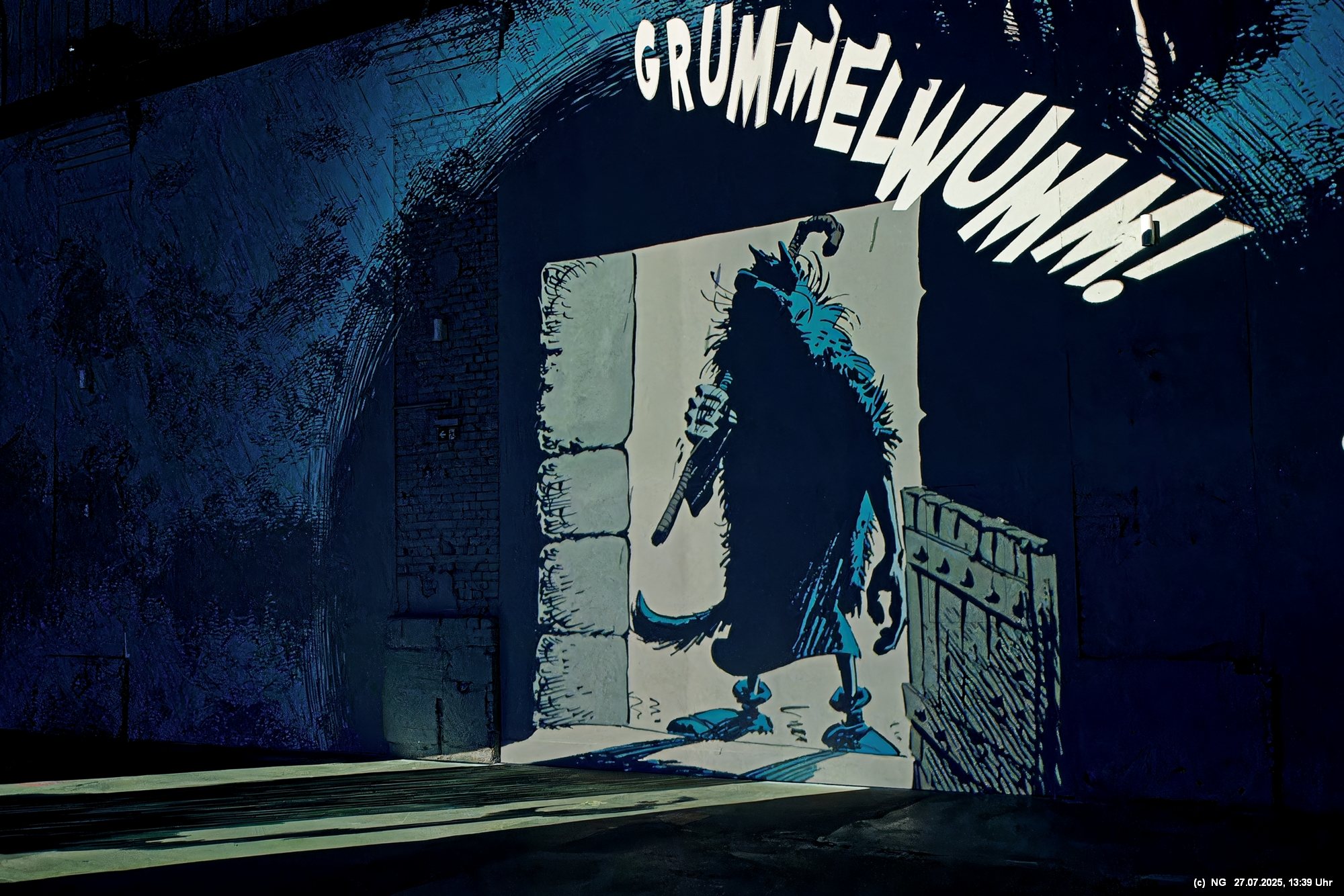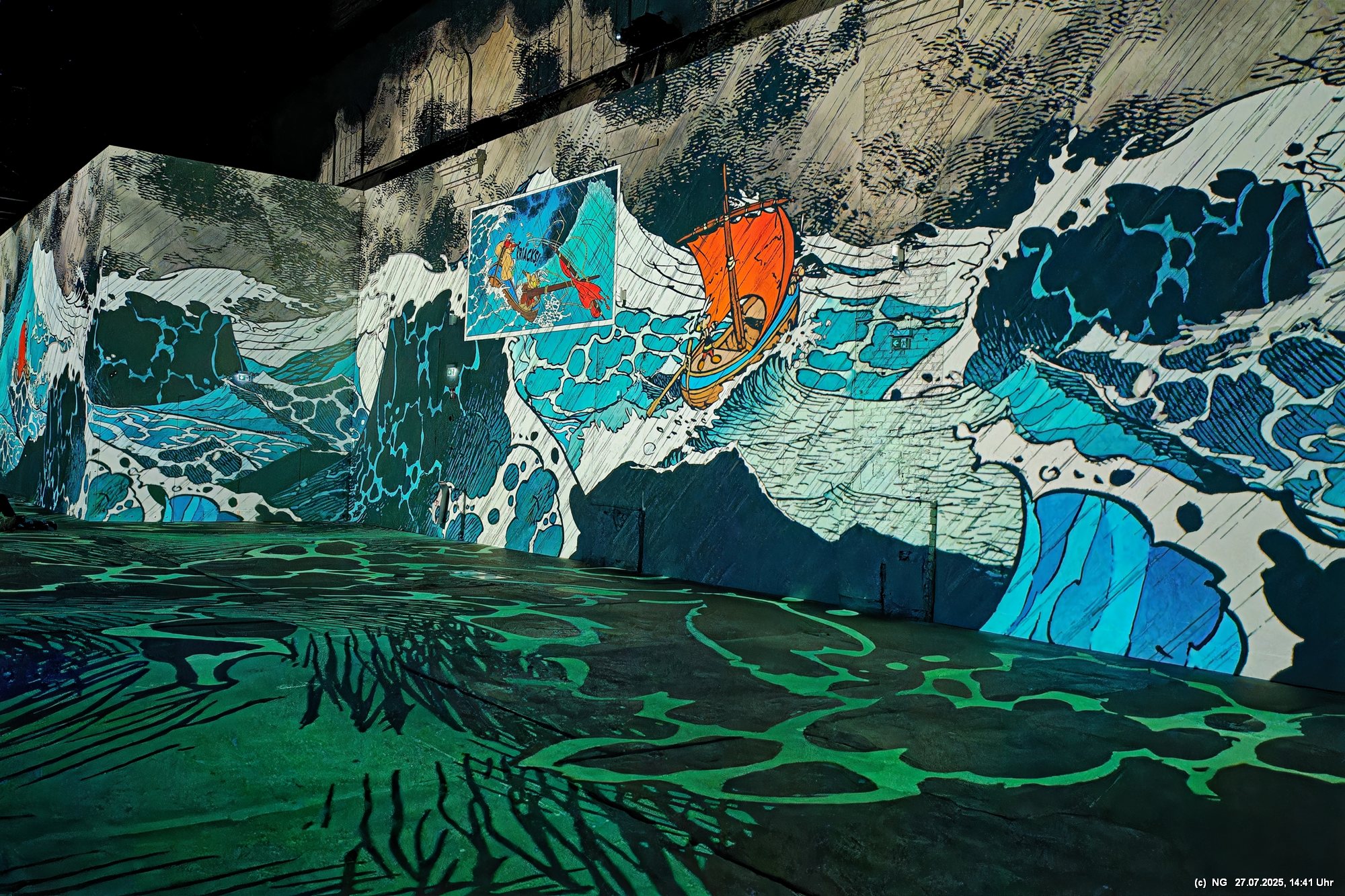 Die Hütte war richtig voll. Klar, es war Sonntag und auch noch Nachmittag. Wer nicht schon im Urlaub war, hatte dort die Möglichkeit, sich köstlich zu unterhalten. Bei den Erwachsenen kam dann die Erinnerung an diese famosen Zeichengeschichten. Es war kurzweilig. Die Bilder rauschten in 45 Minuten vorbei über die 5.600 m² Projektionsfläche, zu der auch der Boden gehört. Wenn noch Platz war, stand man dann mittendrin in der Projektion. So wollte der fliegende Teppich vor uns landen. Technisch war das perfekt gemacht. Wir waren in der Umgebung dieser ehemaligen Industriehalle wieder einmal fasziniert!