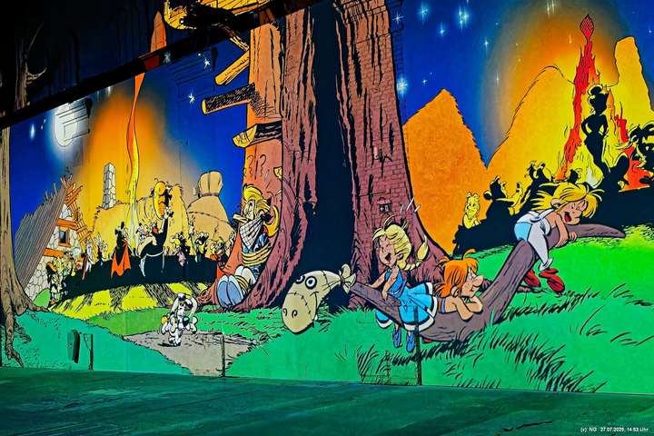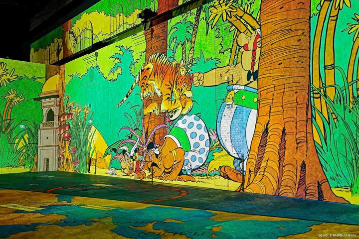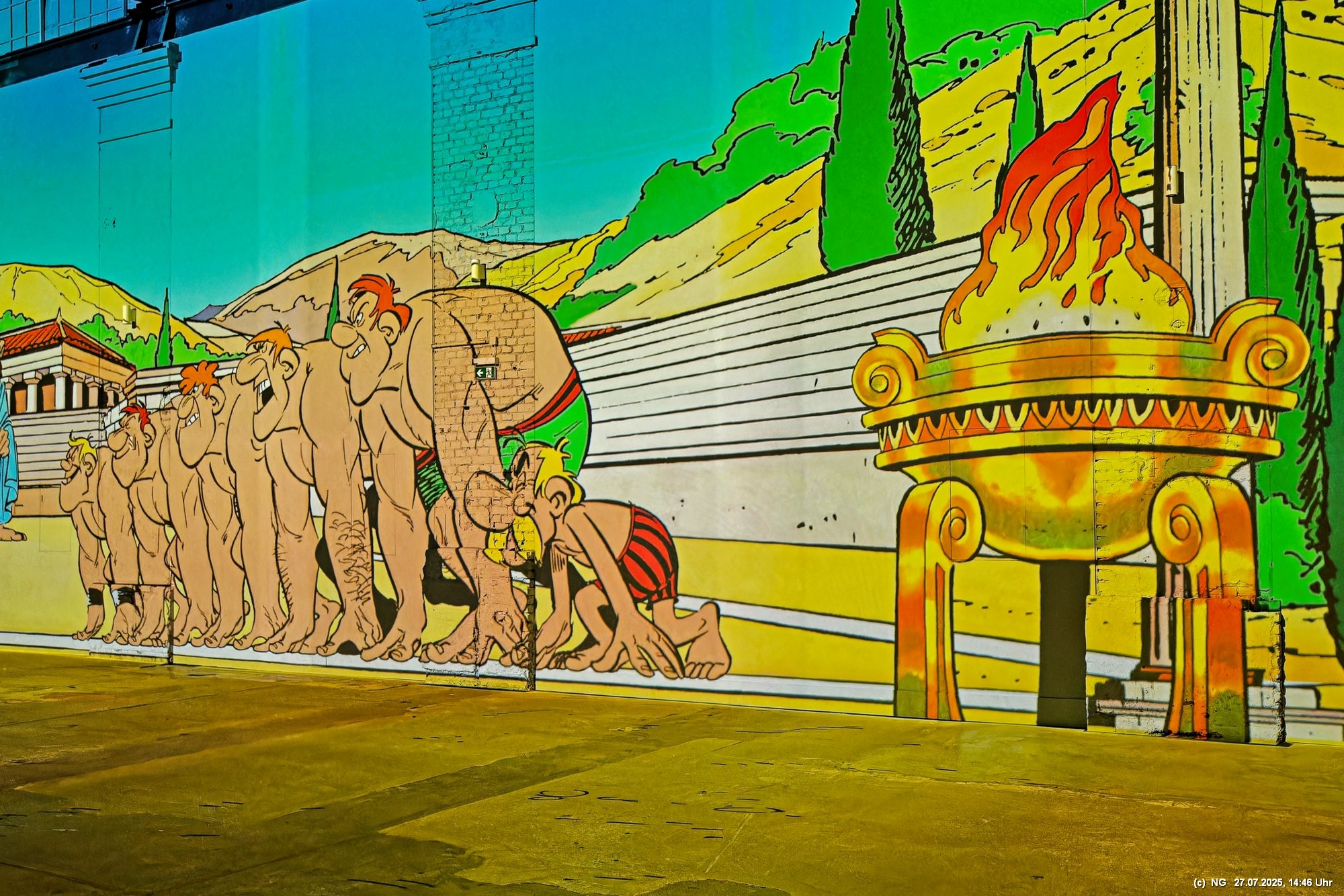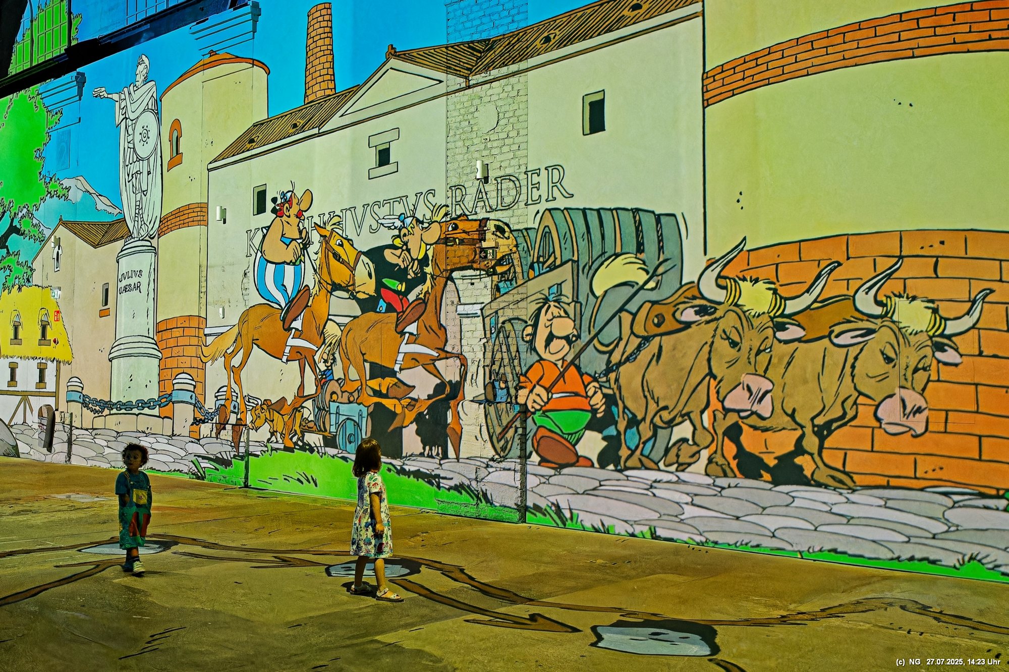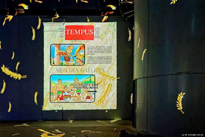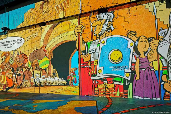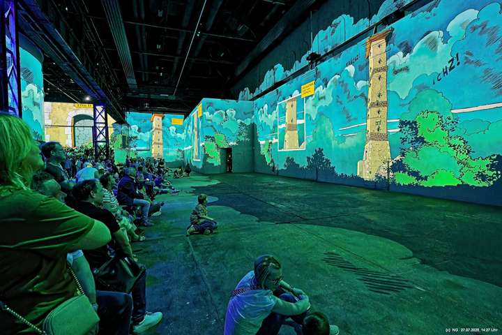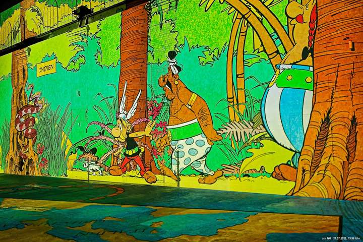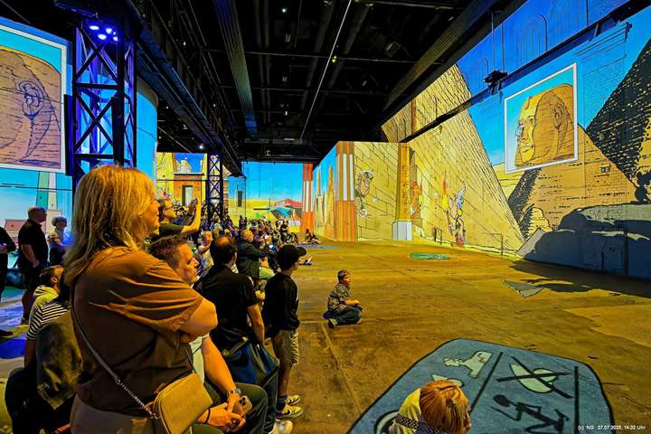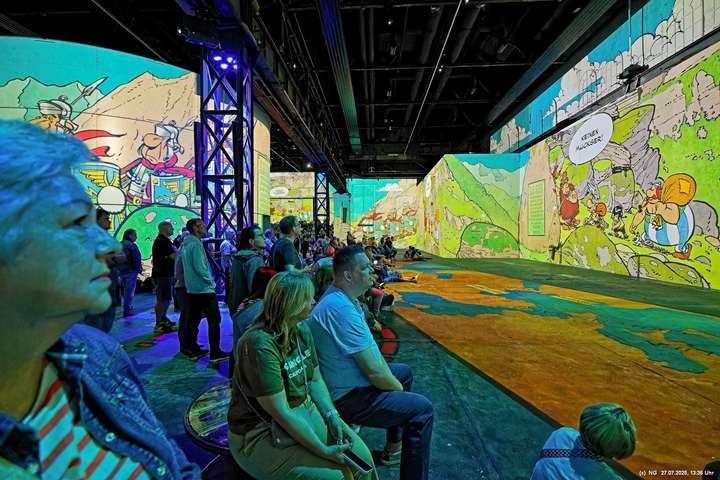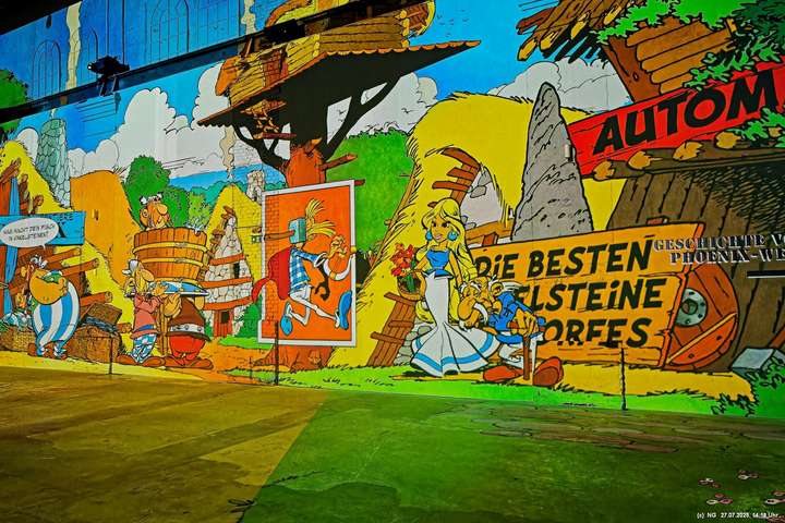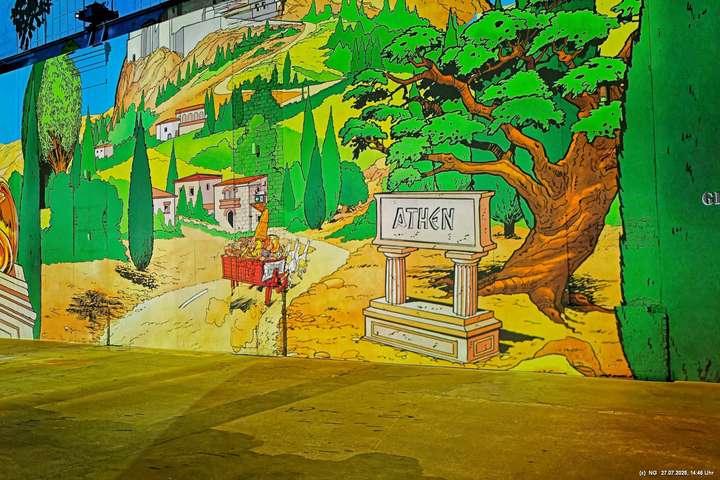 Die Hütte war richtig voll. Klar, es war Sonntag und auch noch Nachmittag. Wer nicht schon im Urlaub war, hatte dort die Möglichkeit, sich köstlich zu unterhalten. Bei den Erwachsenen kam dann die Erinnerung an diese famosen Zeichengeschichten. Es war kurzweilig. Die Bilder rauschten in 45 Minuten vorbei über die 5.600 m² Projektionsfläche, zu der auch der Boden gehört. Wenn noch Platz war, stand man dann mittendrin in der Projektion. So wollte der fliegende Teppich vor uns landen. Technisch war das perfekt gemacht. Wir waren in der Umgebung dieser ehemaligen Industriehalle wieder einmal fasziniert!
