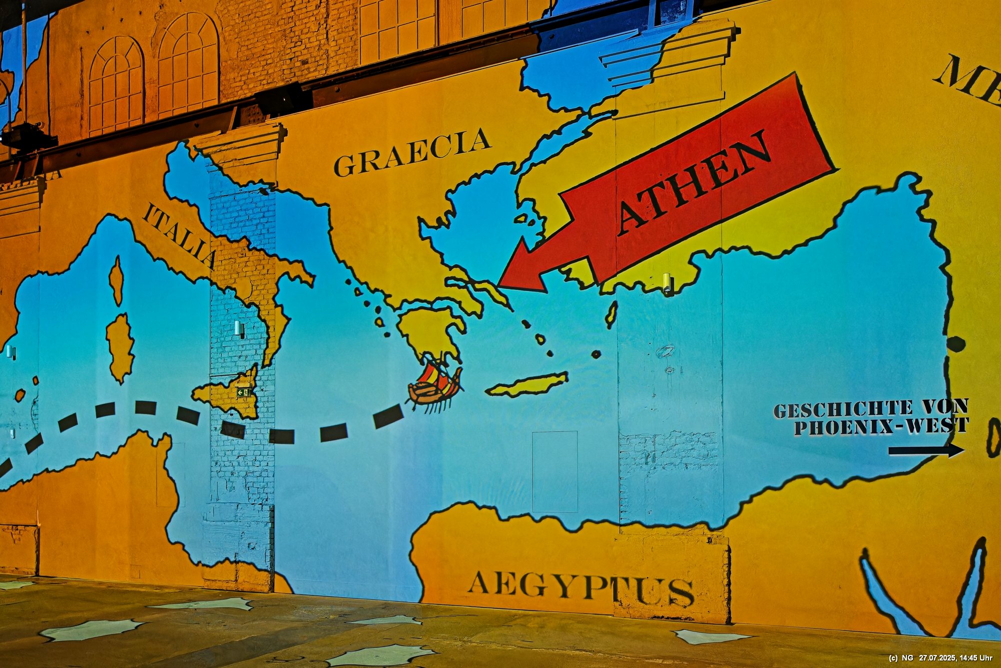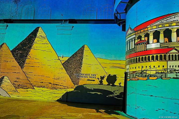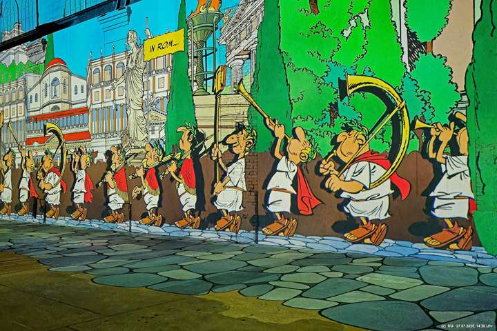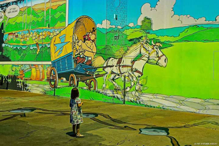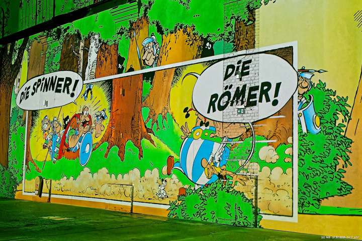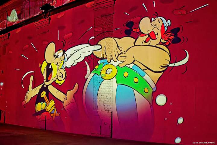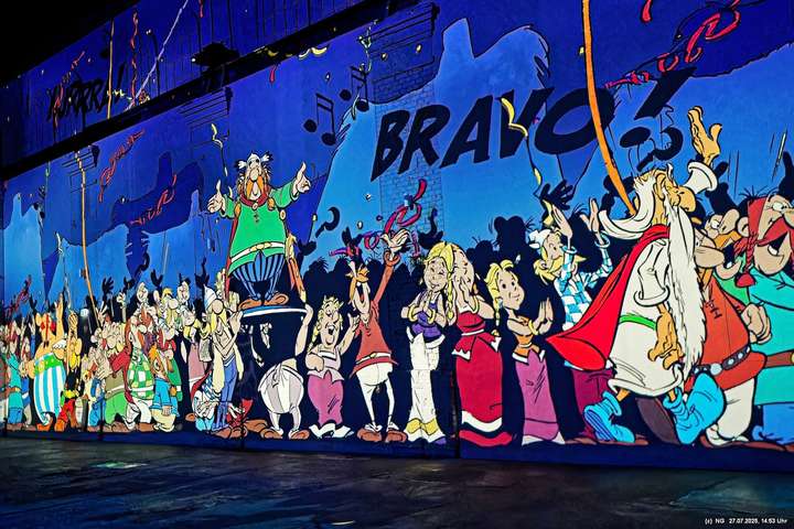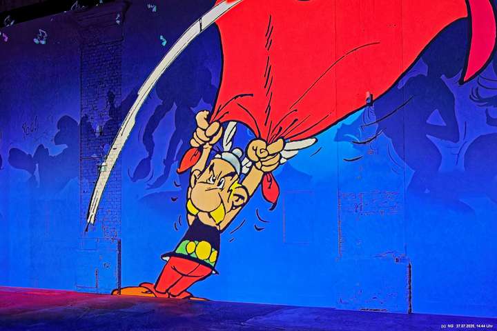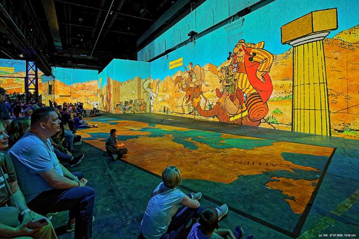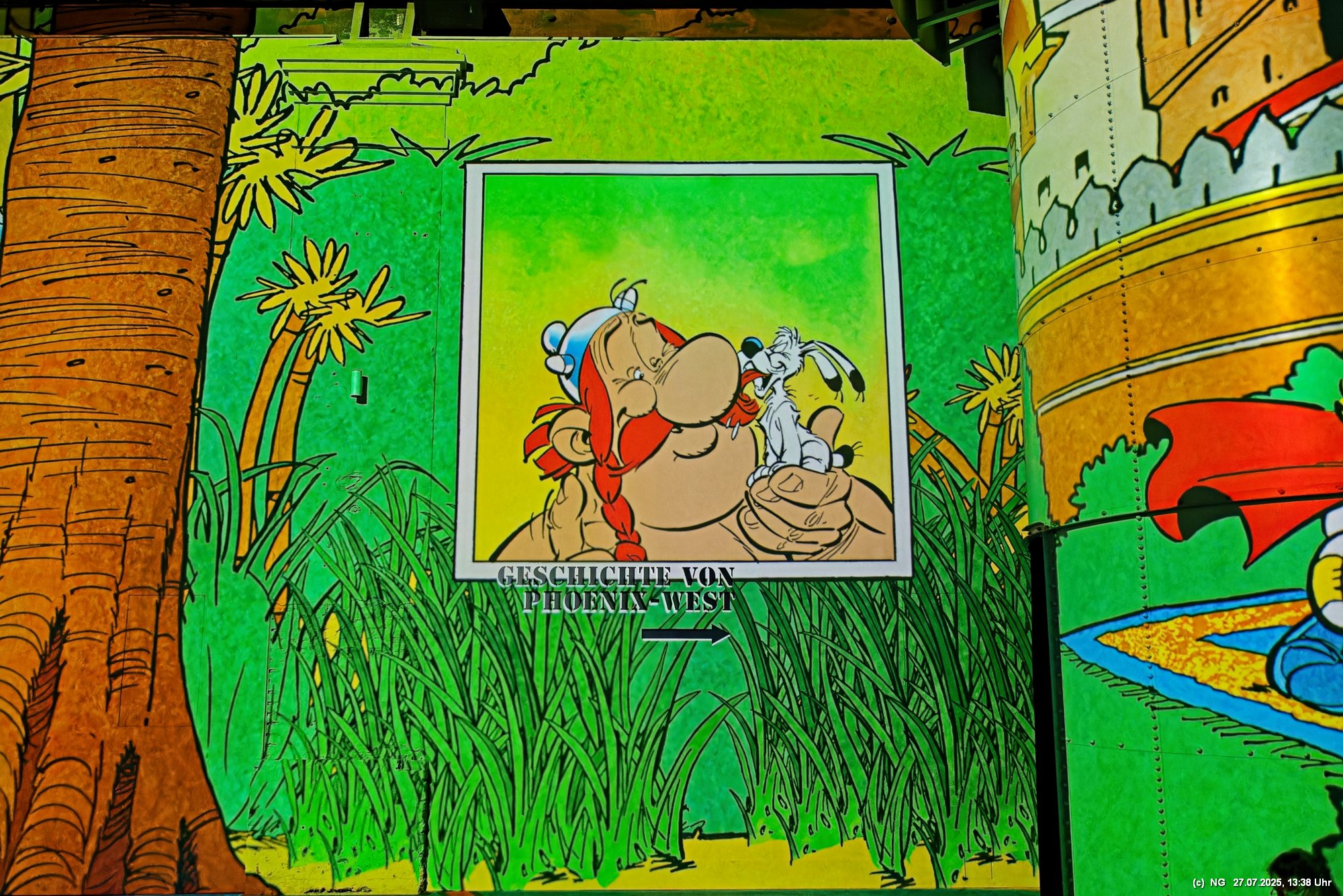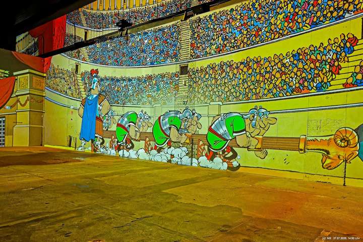 Die Hütte war richtig voll. Klar, es war Sonntag und auch noch Nachmittag. Wer nicht schon im Urlaub war, hatte dort die Möglichkeit, sich köstlich zu unterhalten. Bei den Erwachsenen kam dann die Erinnerung an diese famosen Zeichengeschichten. Es war kurzweilig. Die Bilder rauschten in 45 Minuten vorbei über die 5.600 m² Projektionsfläche, zu der auch der Boden gehört. Wenn noch Platz war, stand man dann mittendrin in der Projektion. So wollte der fliegende Teppich vor uns landen. Technisch war das perfekt gemacht. Wir waren in der Umgebung dieser ehemaligen Industriehalle wieder einmal fasziniert!