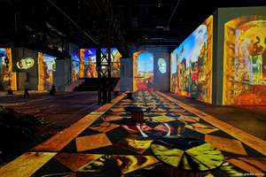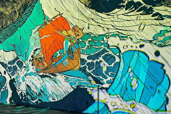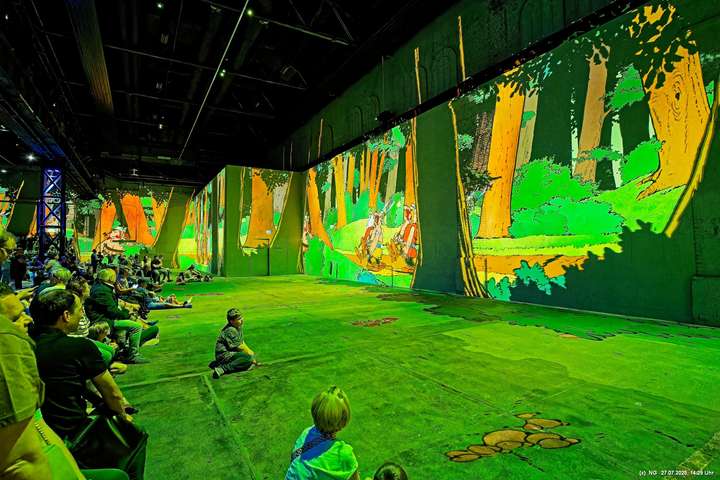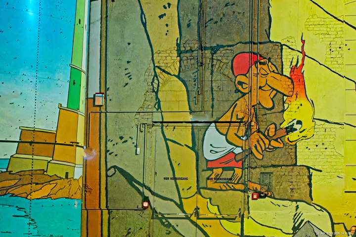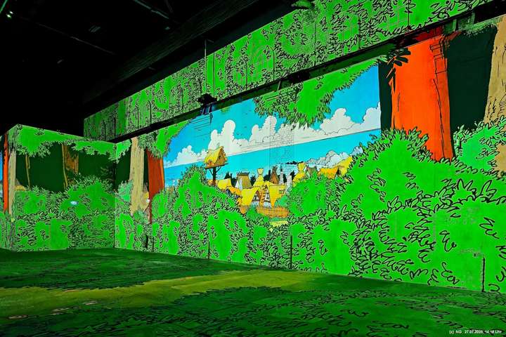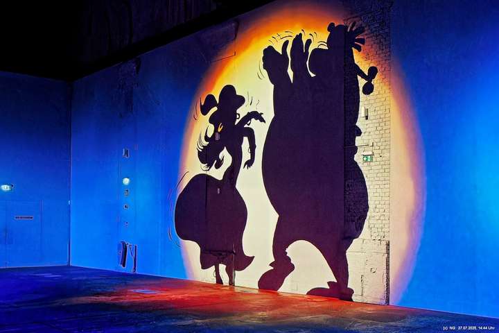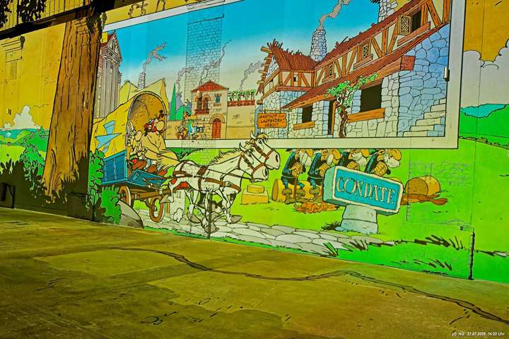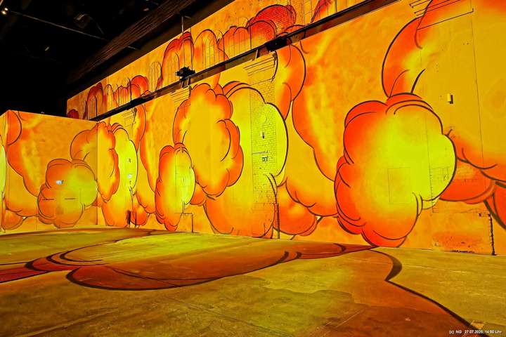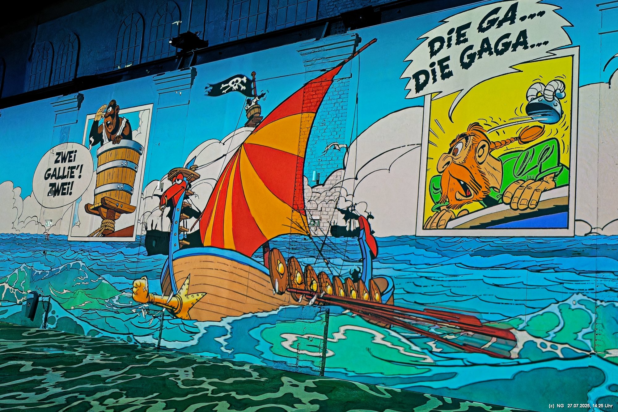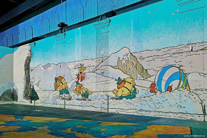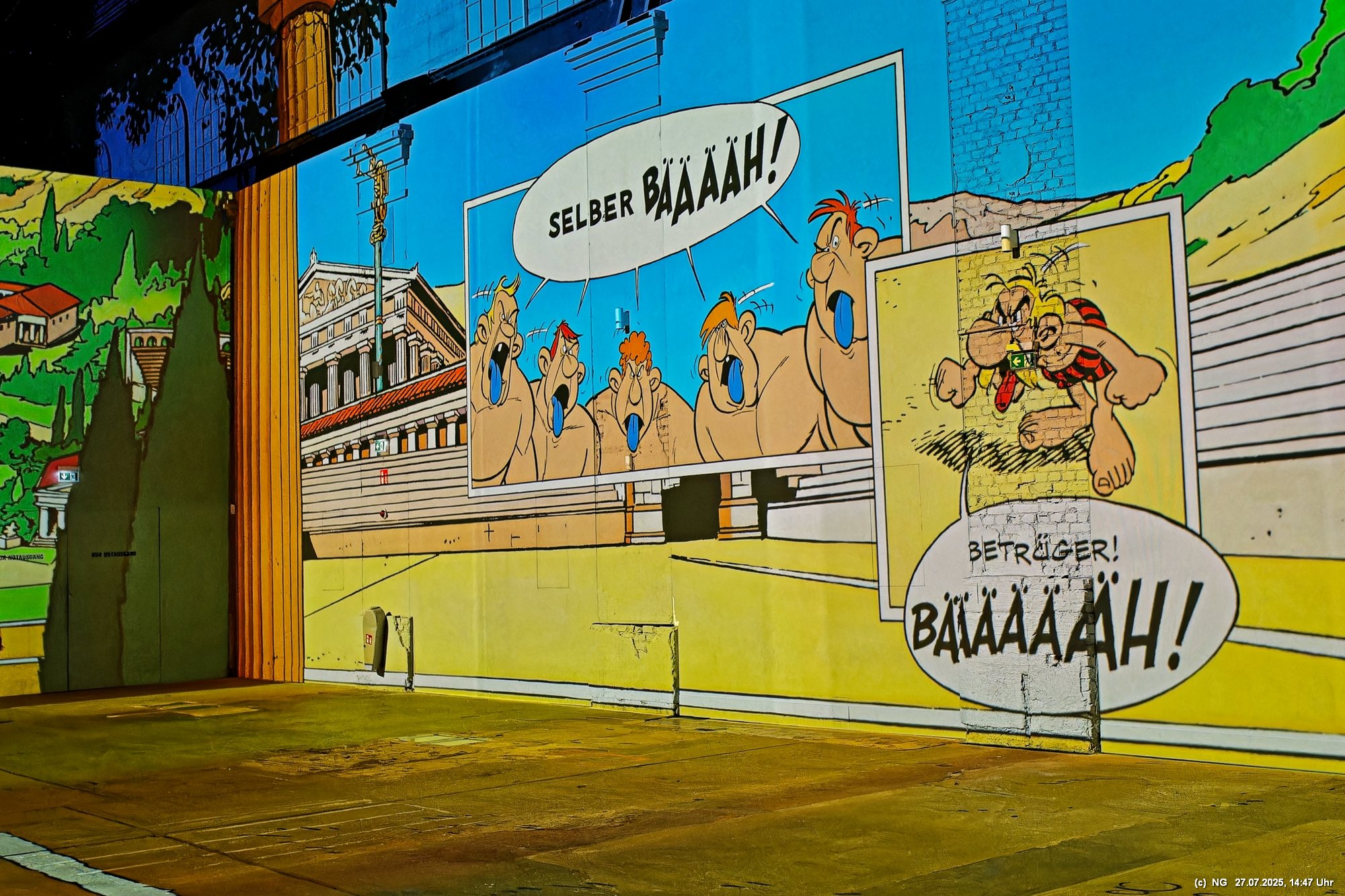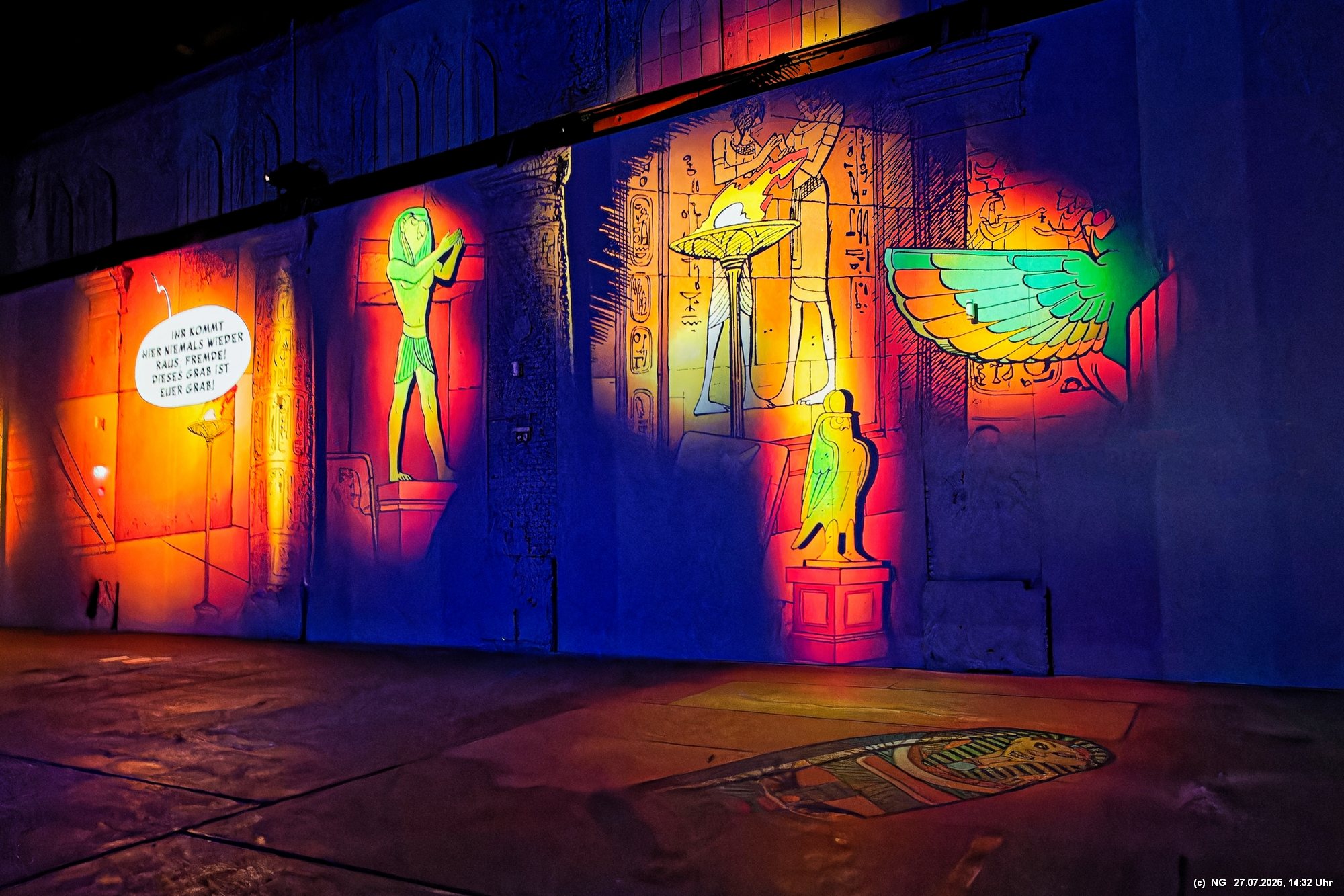 Die Hütte war richtig voll. Klar, es war Sonntag und auch noch Nachmittag. Wer nicht schon im Urlaub war, hatte dort die Möglichkeit, sich köstlich zu unterhalten. Bei den Erwachsenen kam dann die Erinnerung an diese famosen Zeichengeschichten. Es war kurzweilig. Die Bilder rauschten in 45 Minuten vorbei über die 5.600 m² Projektionsfläche, zu der auch der Boden gehört. Wenn noch Platz war, stand man dann mittendrin in der Projektion. So wollte der fliegende Teppich vor uns landen. Technisch war das perfekt gemacht. Wir waren in der Umgebung dieser ehemaligen Industriehalle wieder einmal fasziniert!